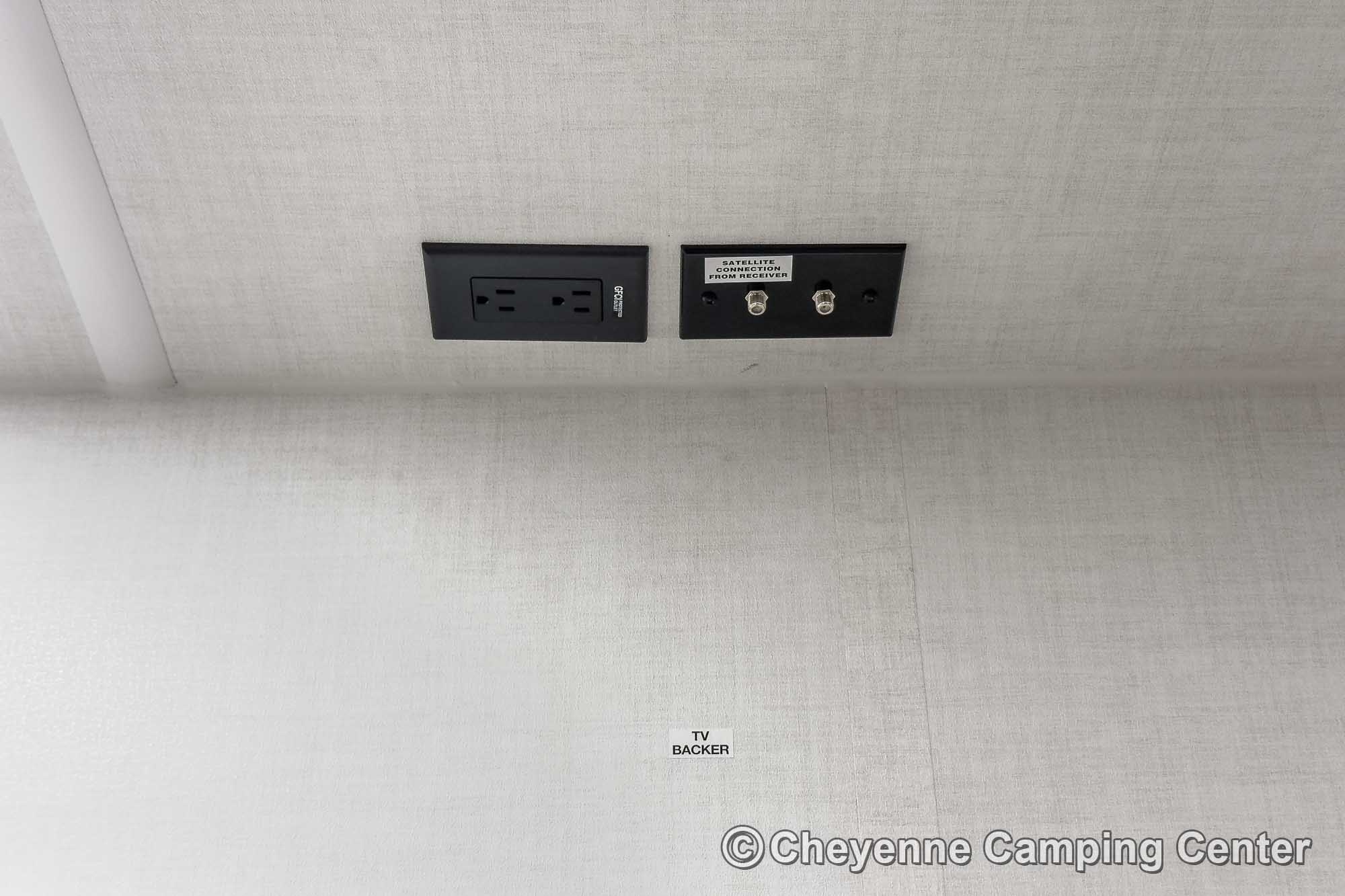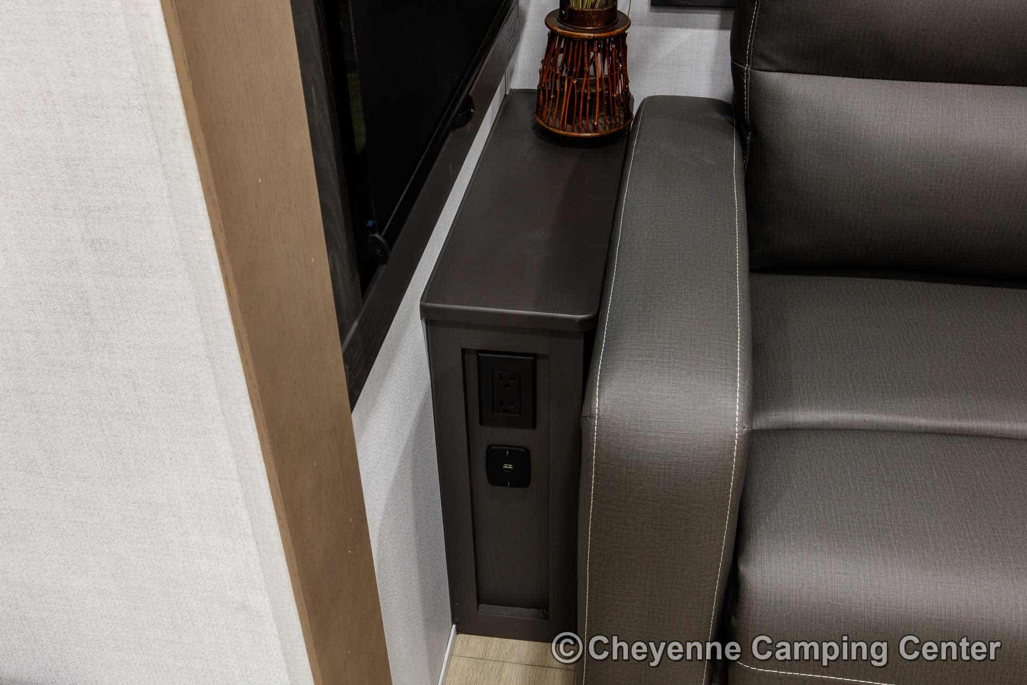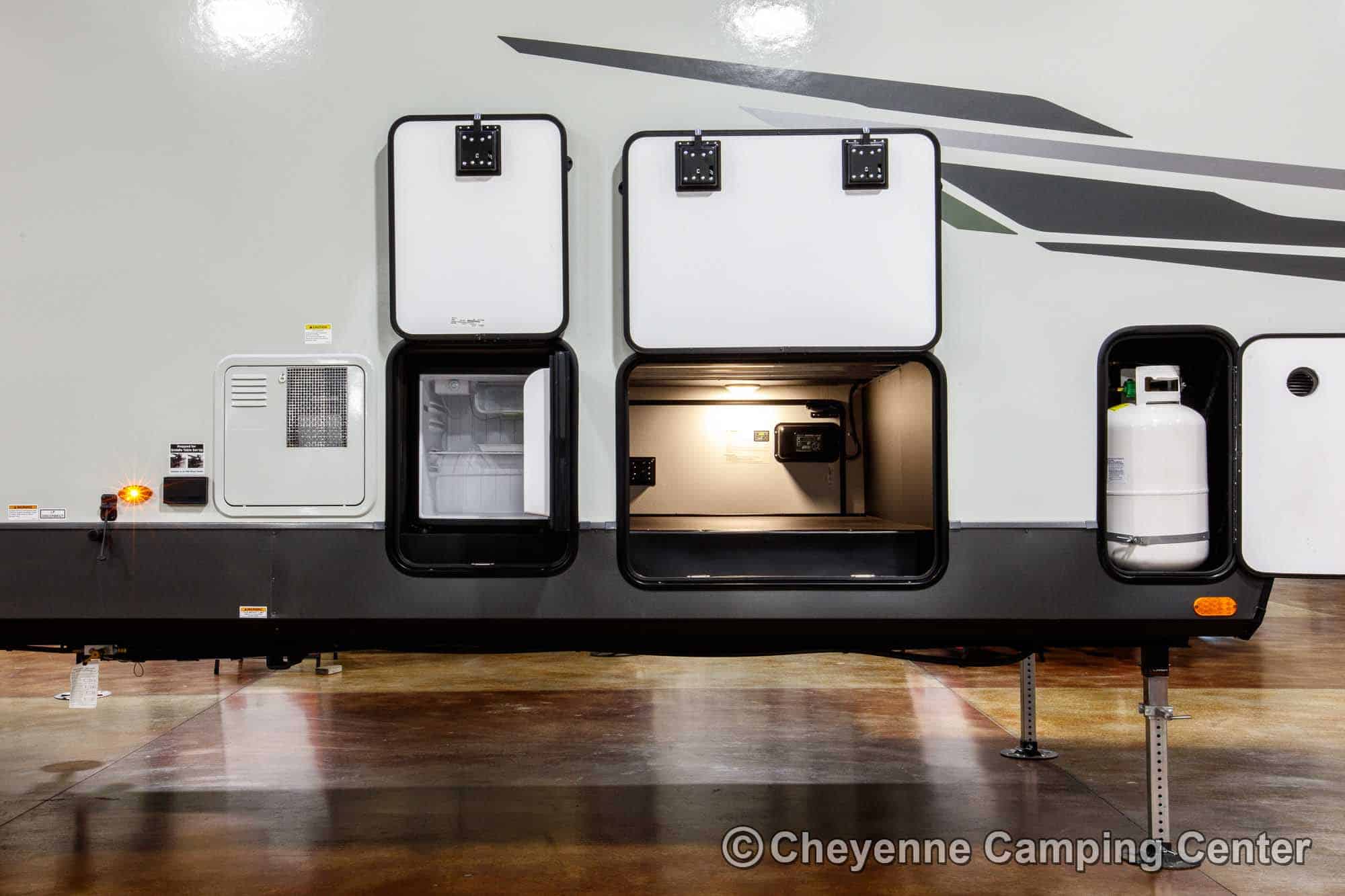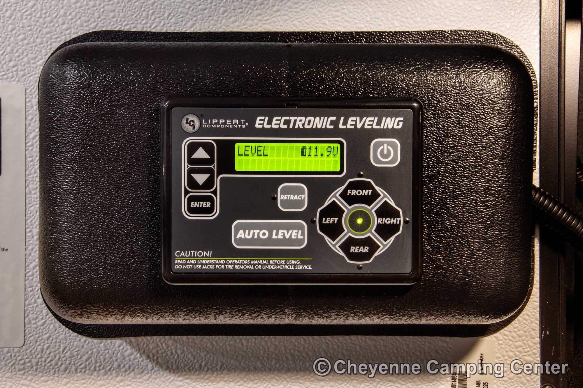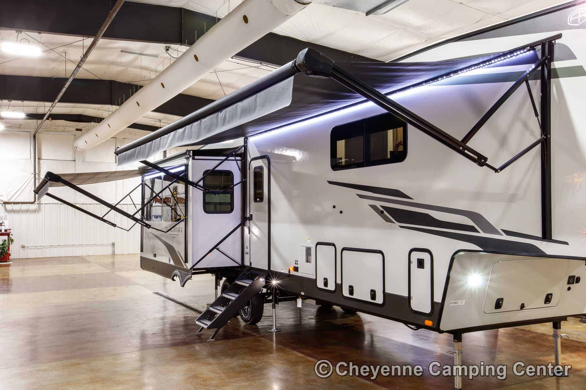 Exterior Features: Enjoy two power awnings with LED lighting, slide toppers, a 200-watt solar panel, large storage compartments, and an outdoor refrigerator. Convenience and safety come standard with auto leveling, a roof ladder, a CURT ROTAFLEX pinbox, CURT slipper roller axles, anti-lock brakes, Goodyear Endurance tires, a TPMS tire pressure monitoring system, and a rear towing hitch.