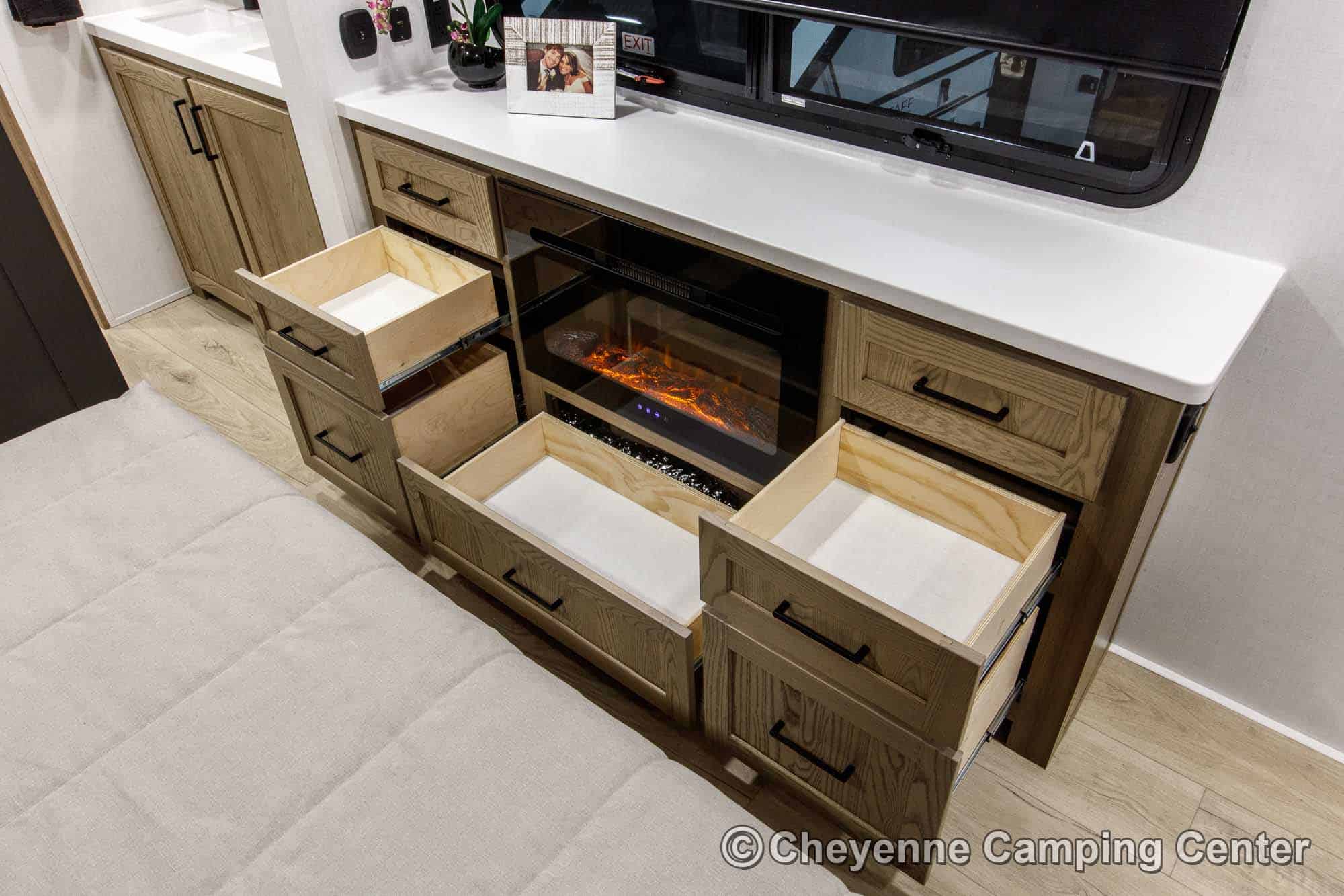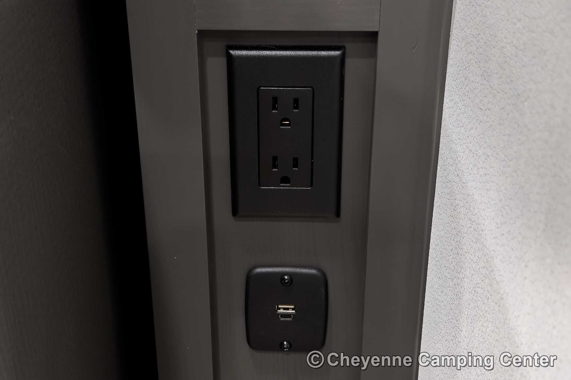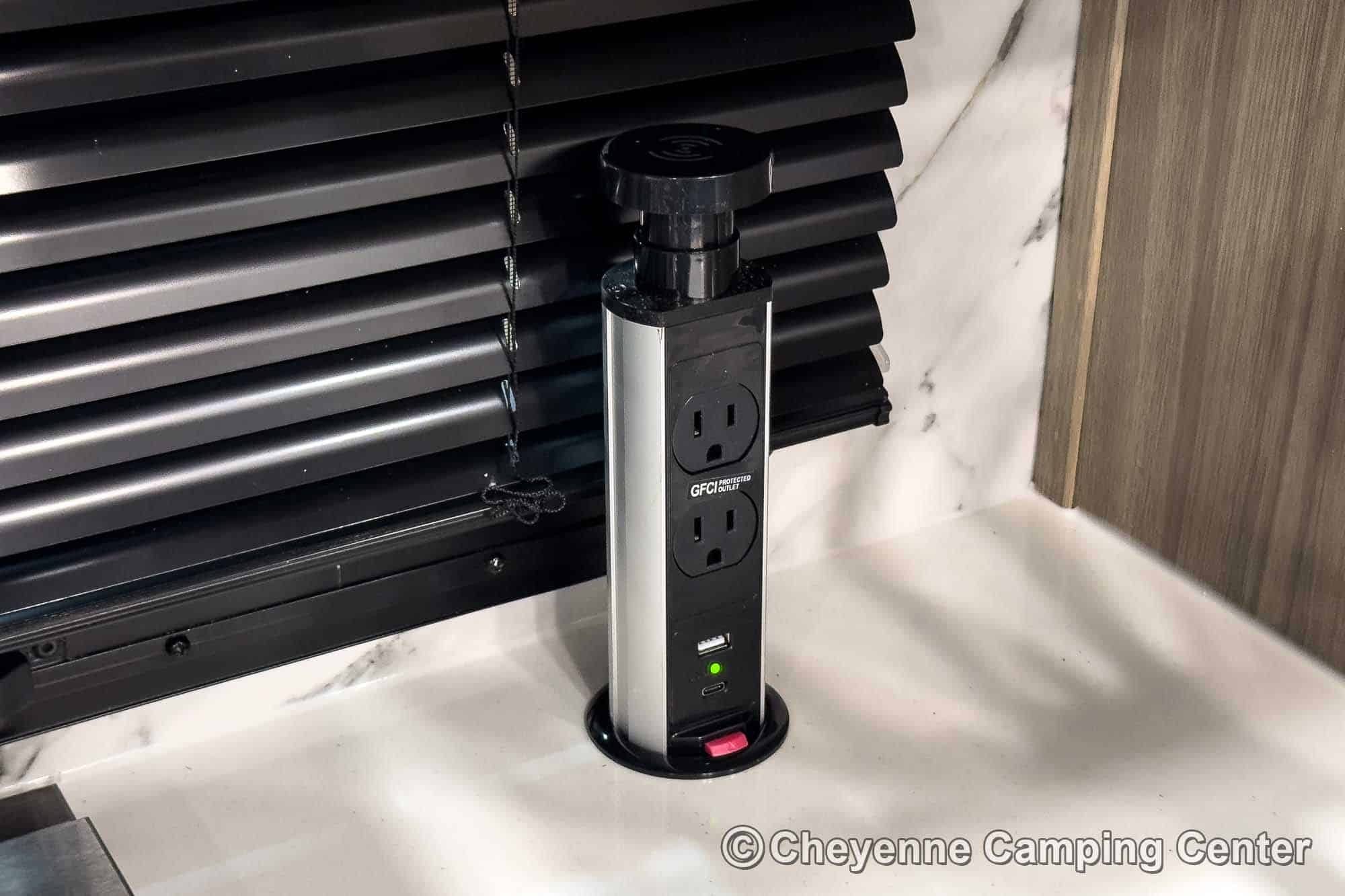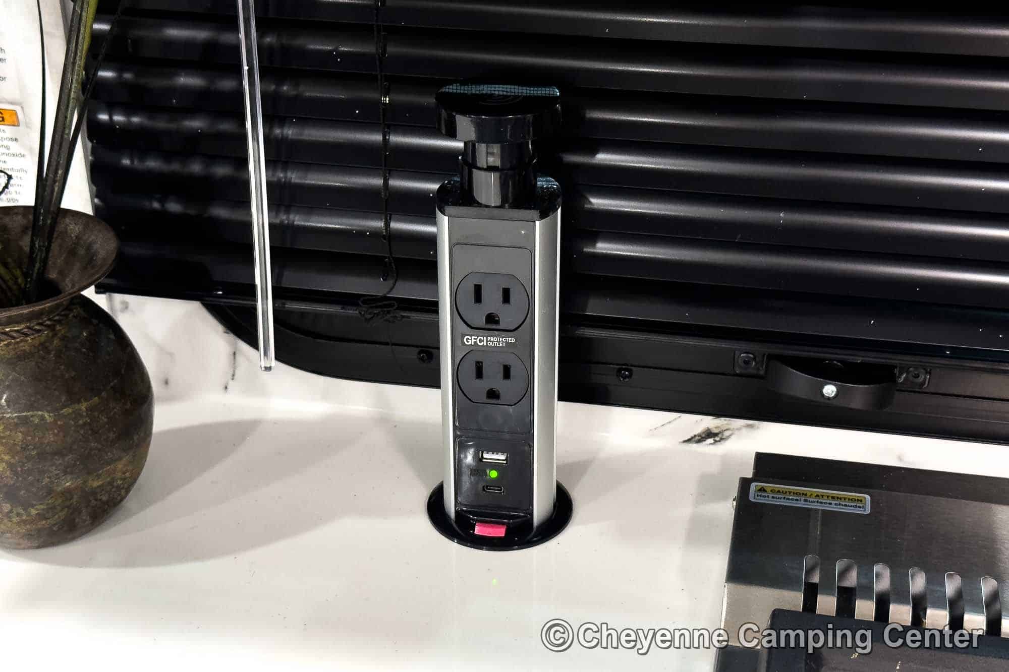 Exterior Features: Enjoy two power awnings with LED lighting, slide toppers, a 200-watt solar panel, large storage compartments, and an outdoor refrigerator. Convenience and safety come standard with auto leveling, a roof ladder, a CURT ROTAFLEX pinbox, CURT slipper roller axles, anti-lock brakes, Goodyear Endurance tires, a TPMS tire pressure monitoring system, and a rear towing hitch.