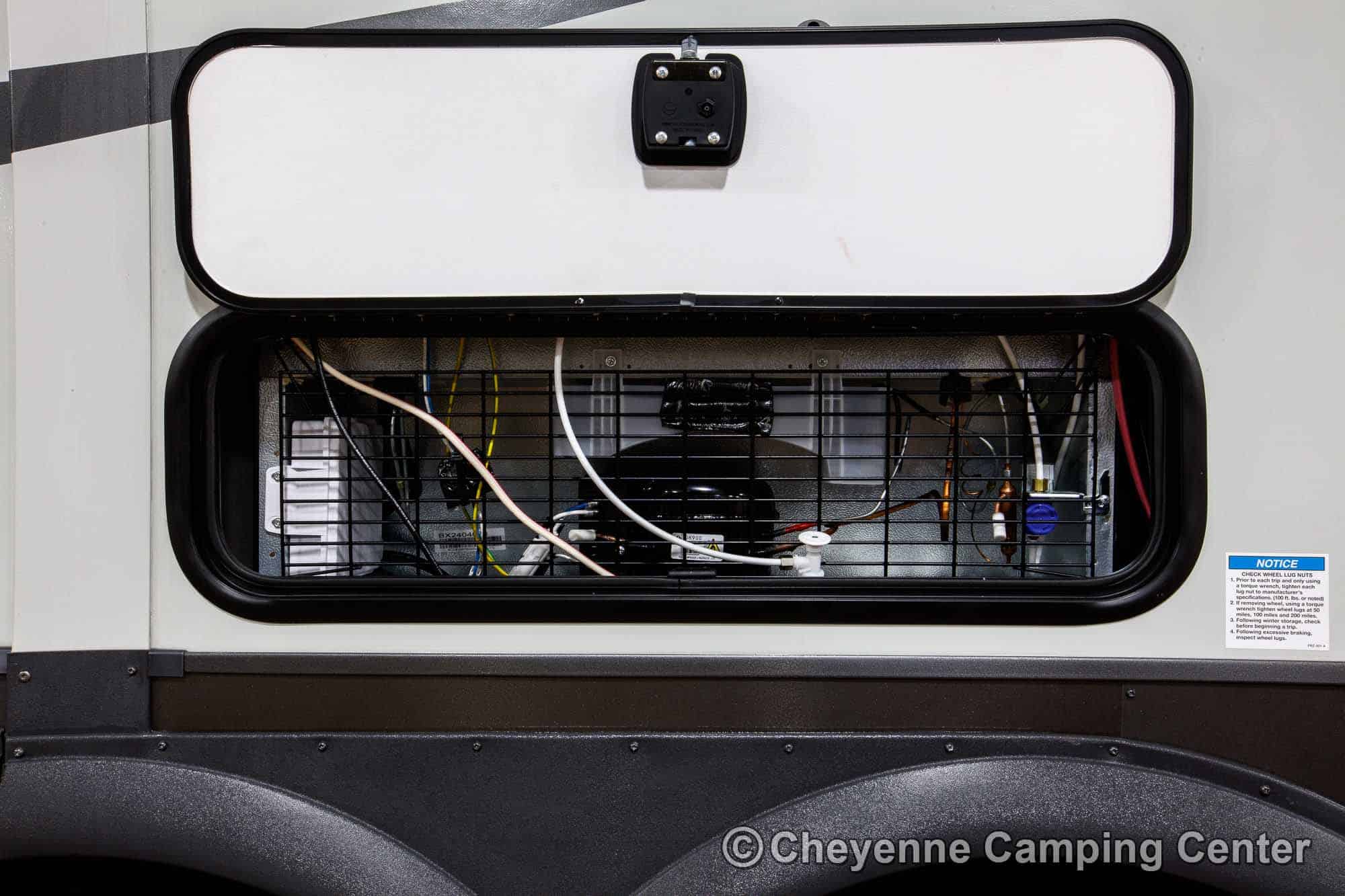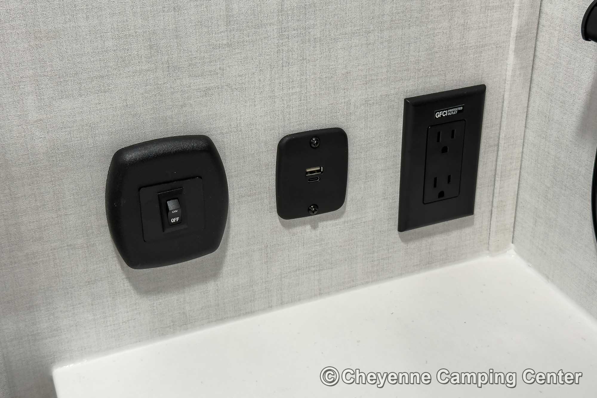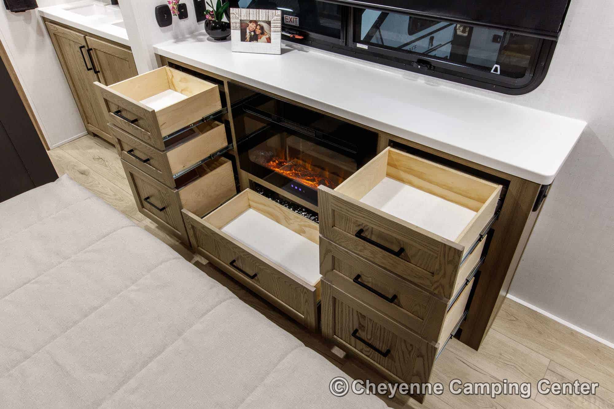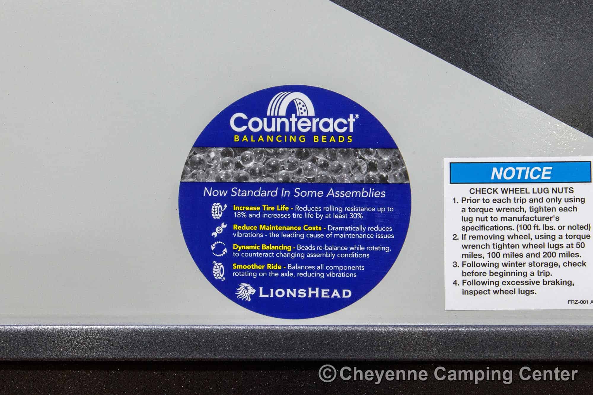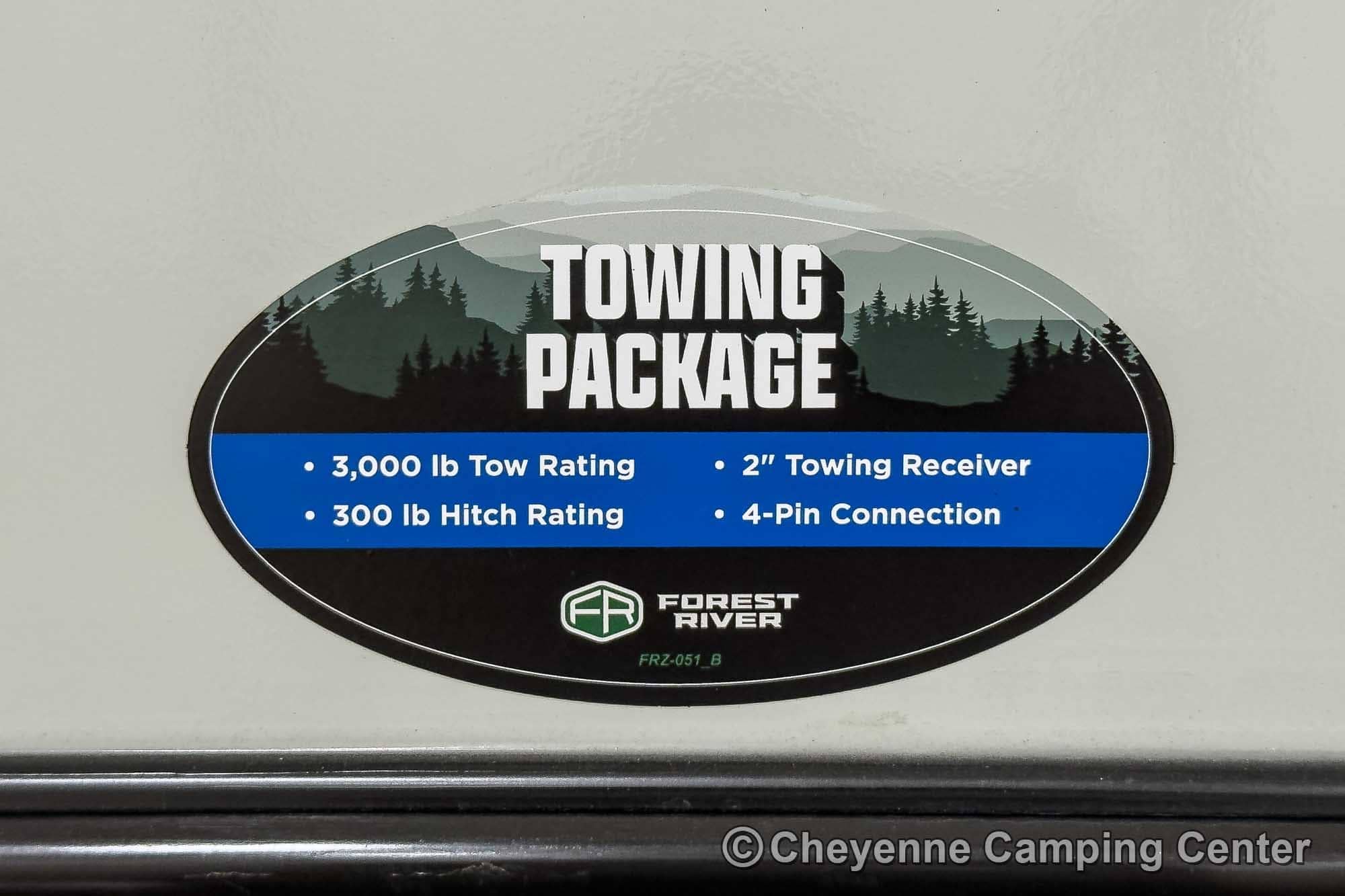 Exterior Features: Enjoy two power awnings with LED lighting, slide toppers, a 200-watt solar panel, large storage compartments, and an outdoor refrigerator. Convenience and safety come standard with auto leveling, a roof ladder, a CURT ROTAFLEX pinbox, CURT slipper roller axles, anti-lock brakes, Goodyear Endurance tires, a TPMS tire pressure monitoring system, and a rear towing hitch.