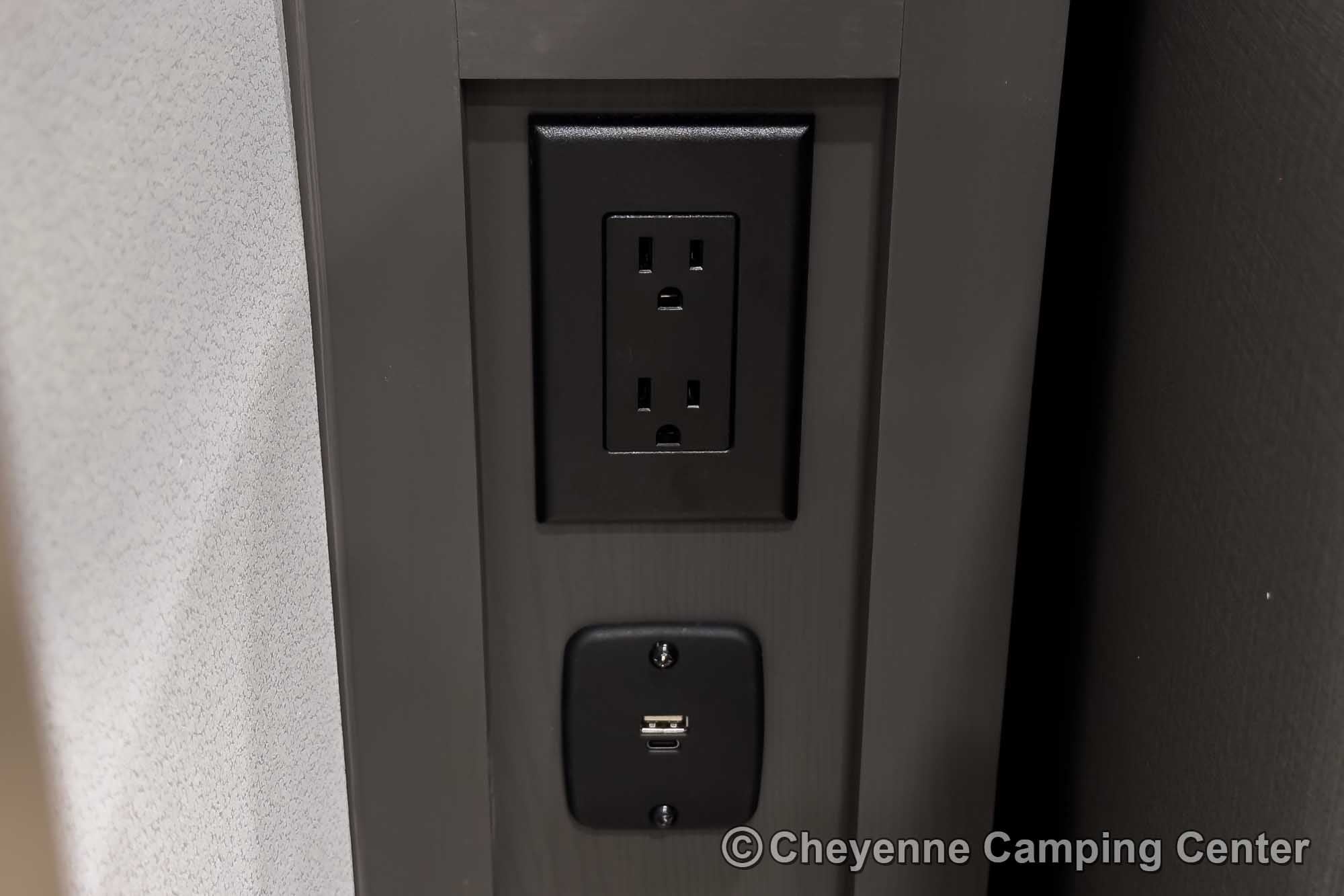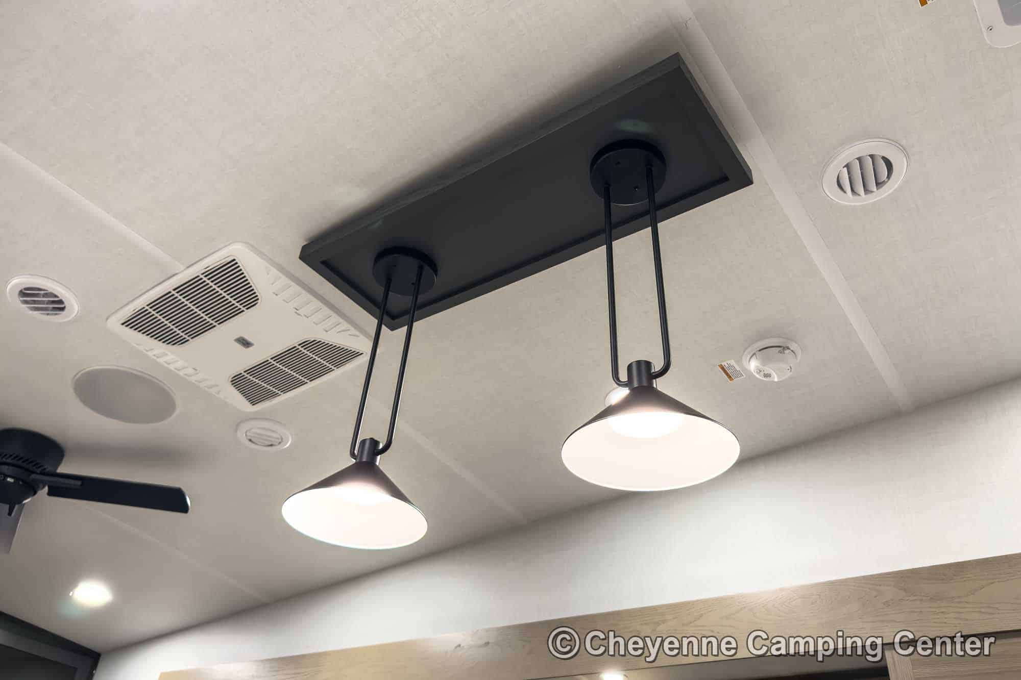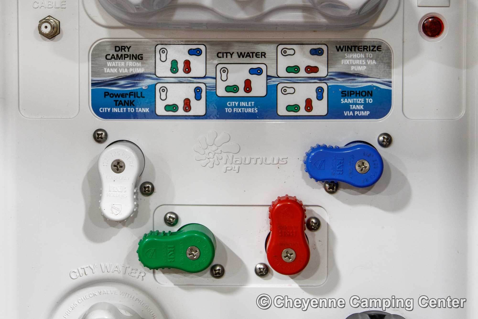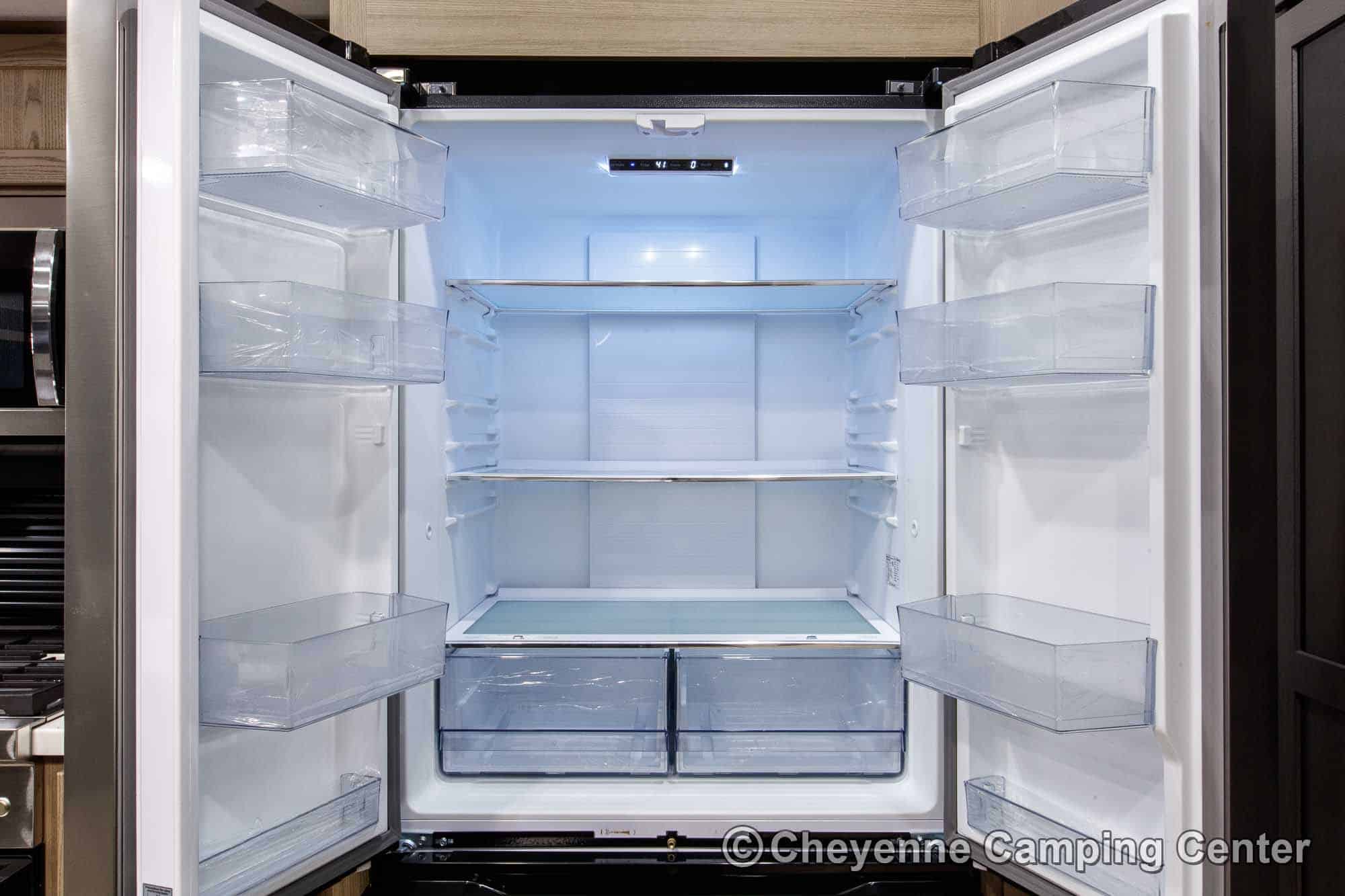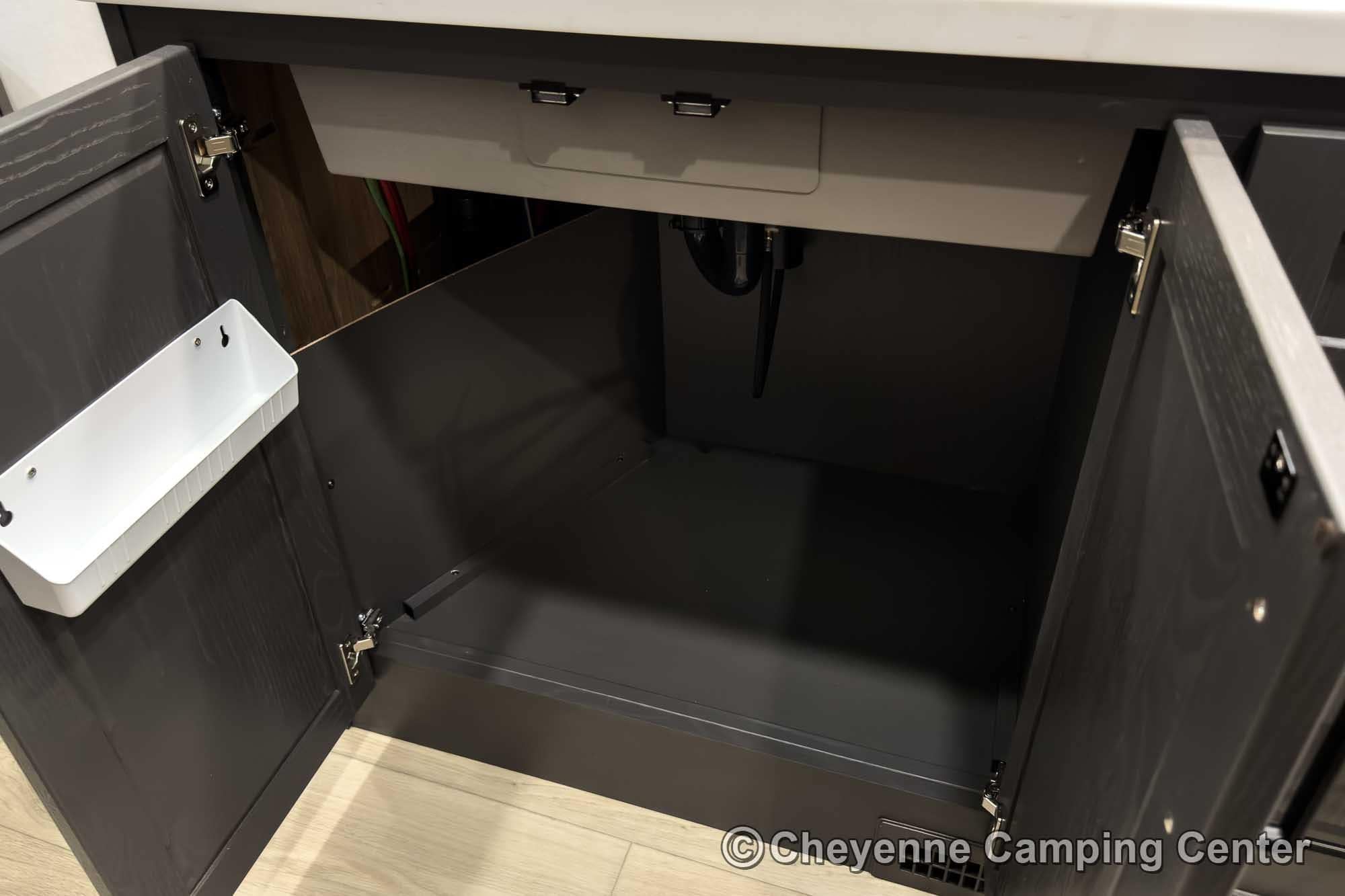 Exterior Features: Enjoy two power awnings with LED lighting, slide toppers, a 200-watt solar panel, large storage compartments, and an outdoor refrigerator. Convenience and safety come standard with auto leveling, a roof ladder, a CURT ROTAFLEX pinbox, CURT slipper roller axles, anti-lock brakes, Goodyear Endurance tires, a TPMS tire pressure monitoring system, and a rear towing hitch.