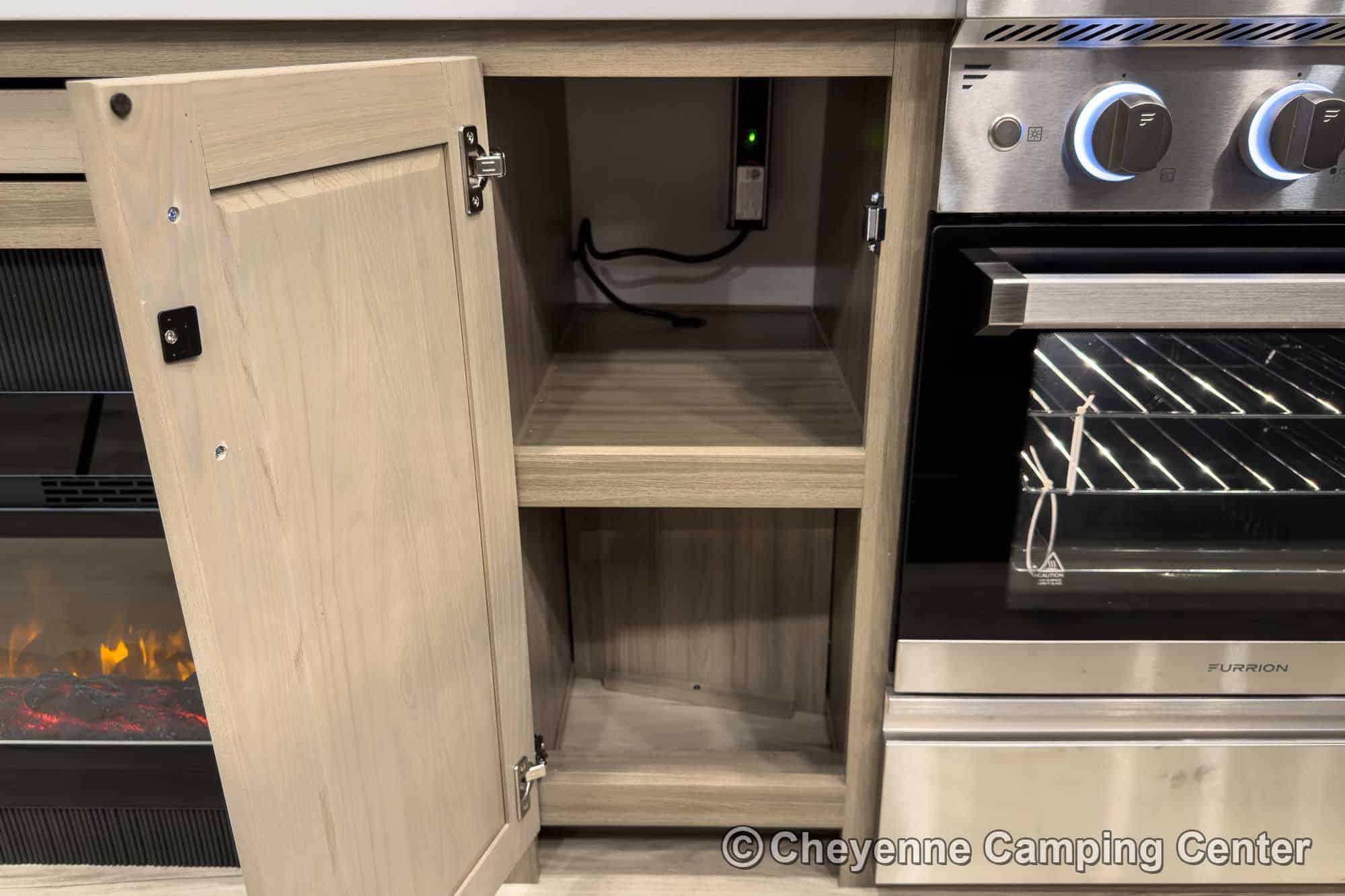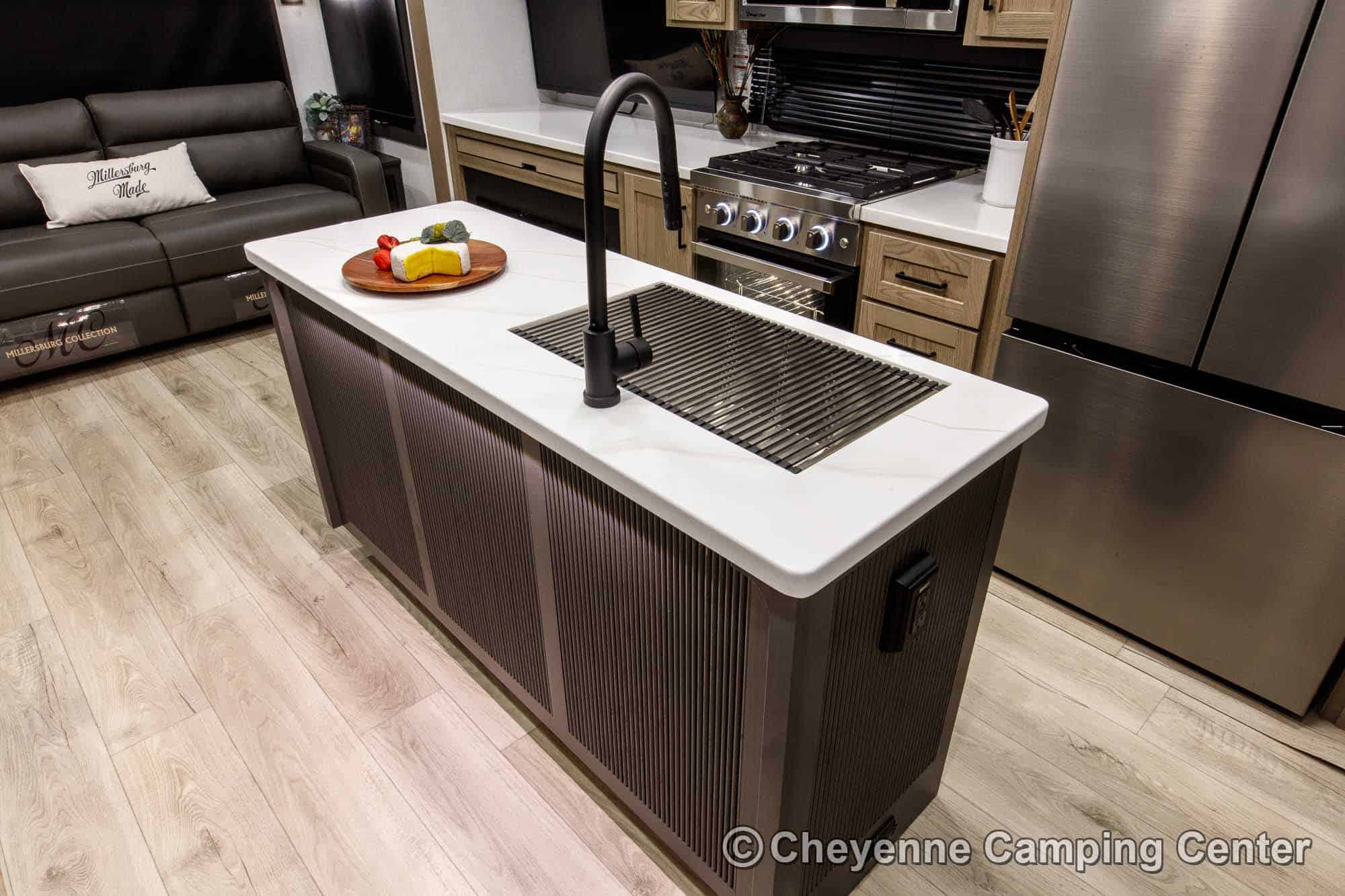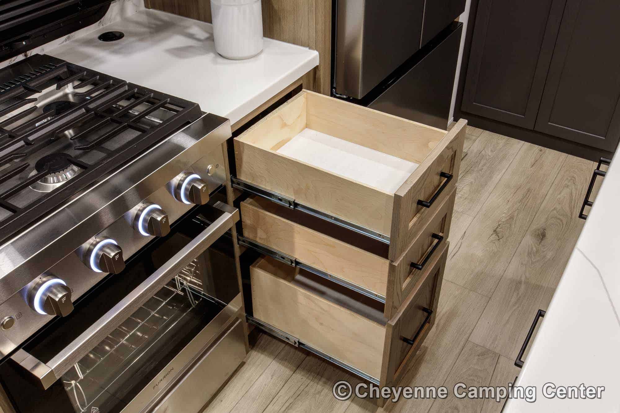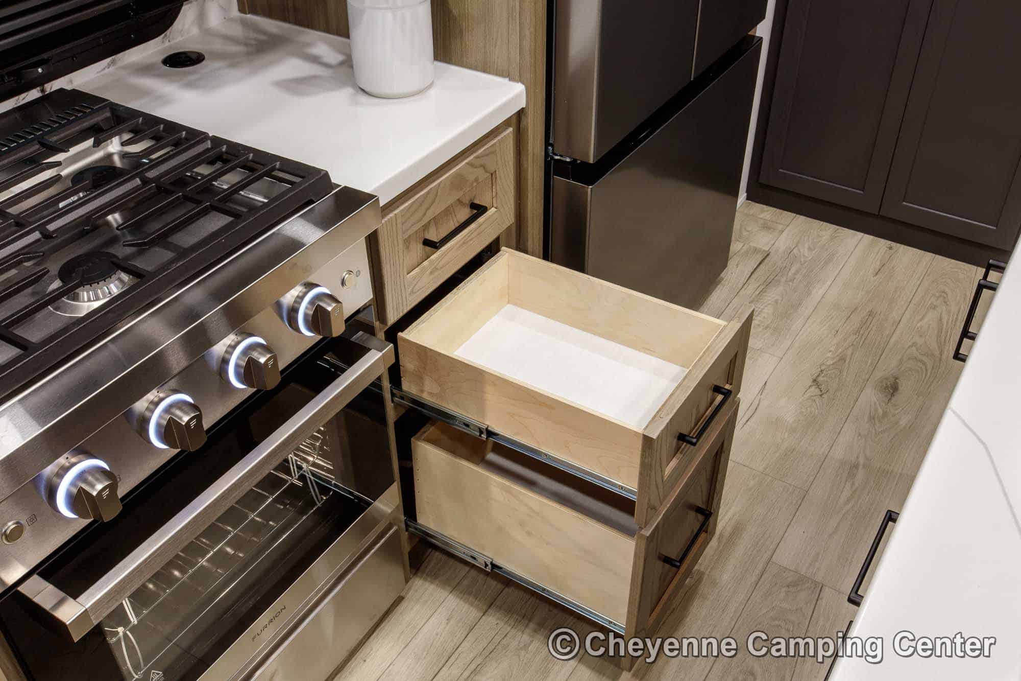 Exterior Features: Enjoy two power awnings with LED lighting, slide toppers, a 200-watt solar panel, large storage compartments, and an outdoor refrigerator. Convenience and safety come standard with auto leveling, a roof ladder, a CURT ROTAFLEX pinbox, CURT slipper roller axles, anti-lock brakes, Goodyear Endurance tires, a TPMS tire pressure monitoring system, and a rear towing hitch.
