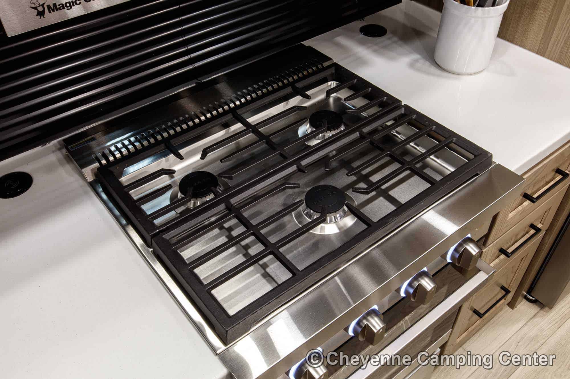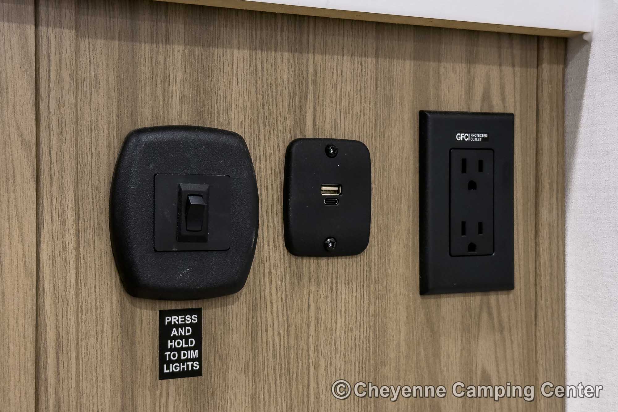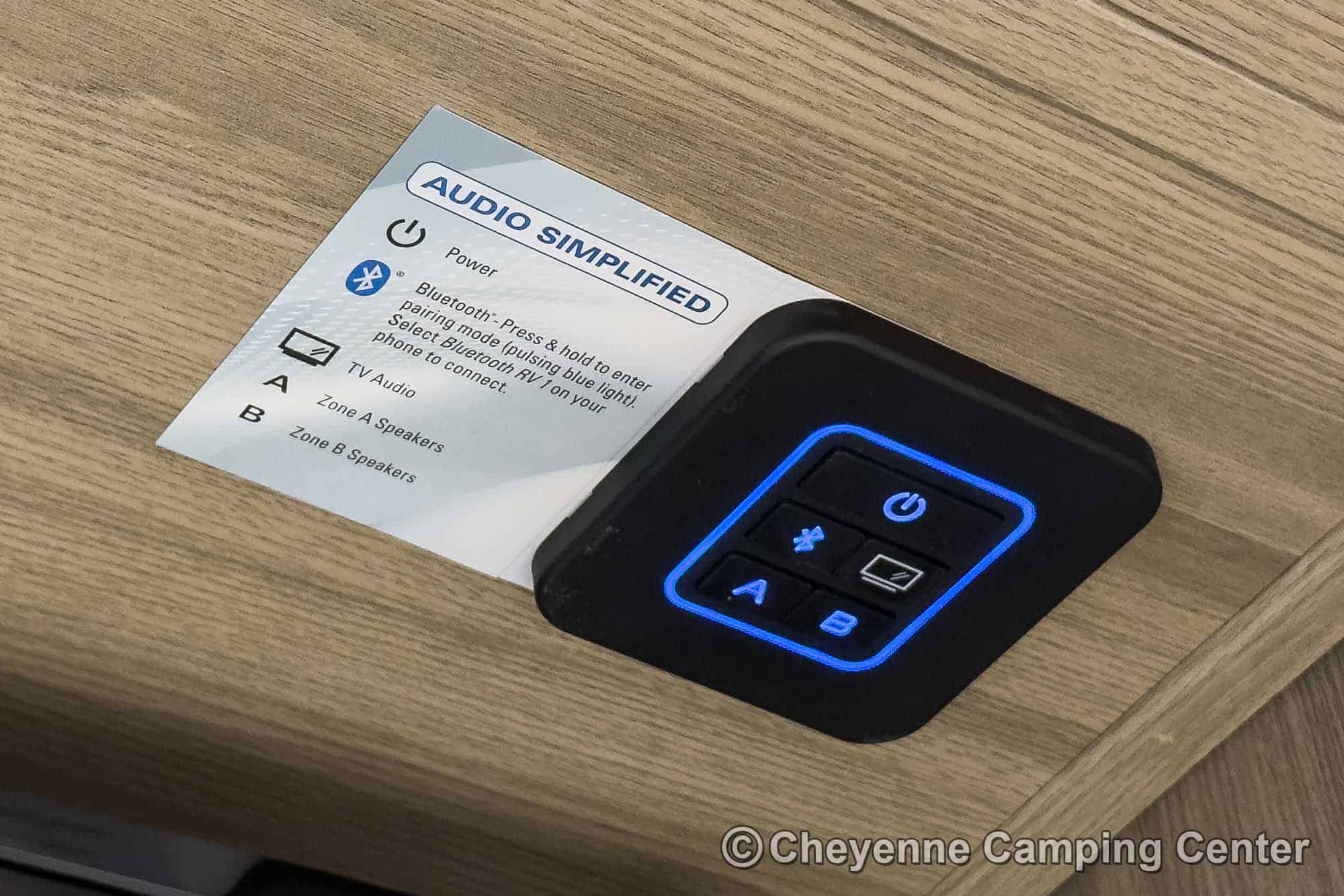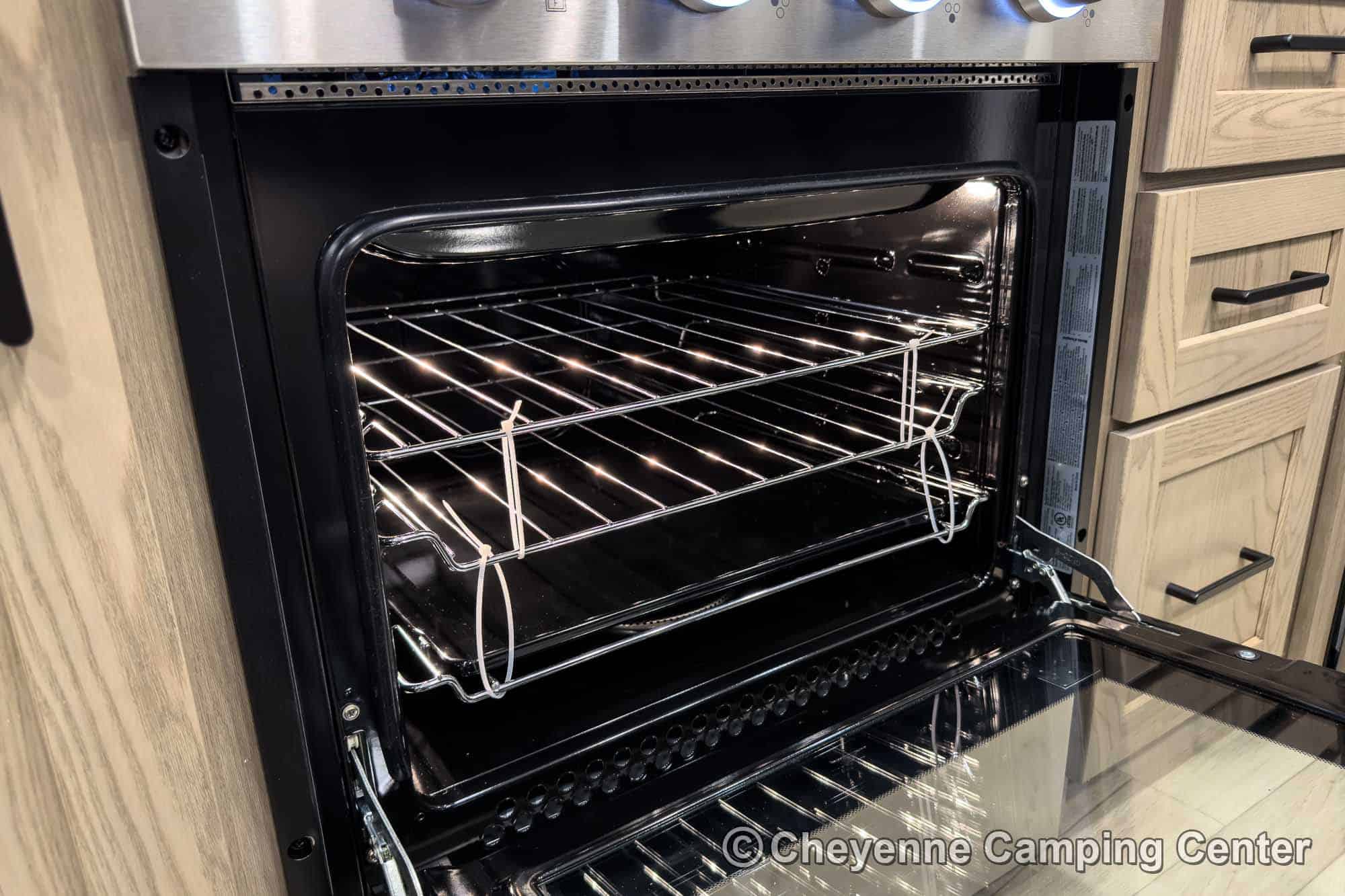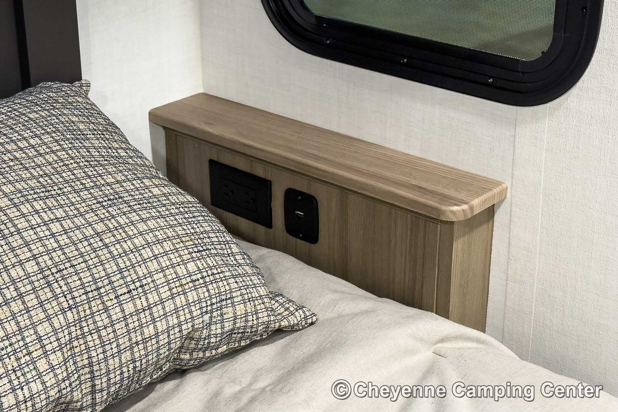 Exterior Features: Enjoy two power awnings with LED lighting, slide toppers, a 200-watt solar panel, large storage compartments, and an outdoor refrigerator. Convenience and safety come standard with auto leveling, a roof ladder, a CURT ROTAFLEX pinbox, CURT slipper roller axles, anti-lock brakes, Goodyear Endurance tires, a TPMS tire pressure monitoring system, and a rear towing hitch.
