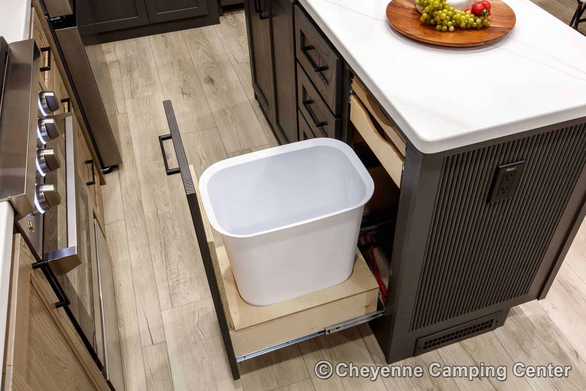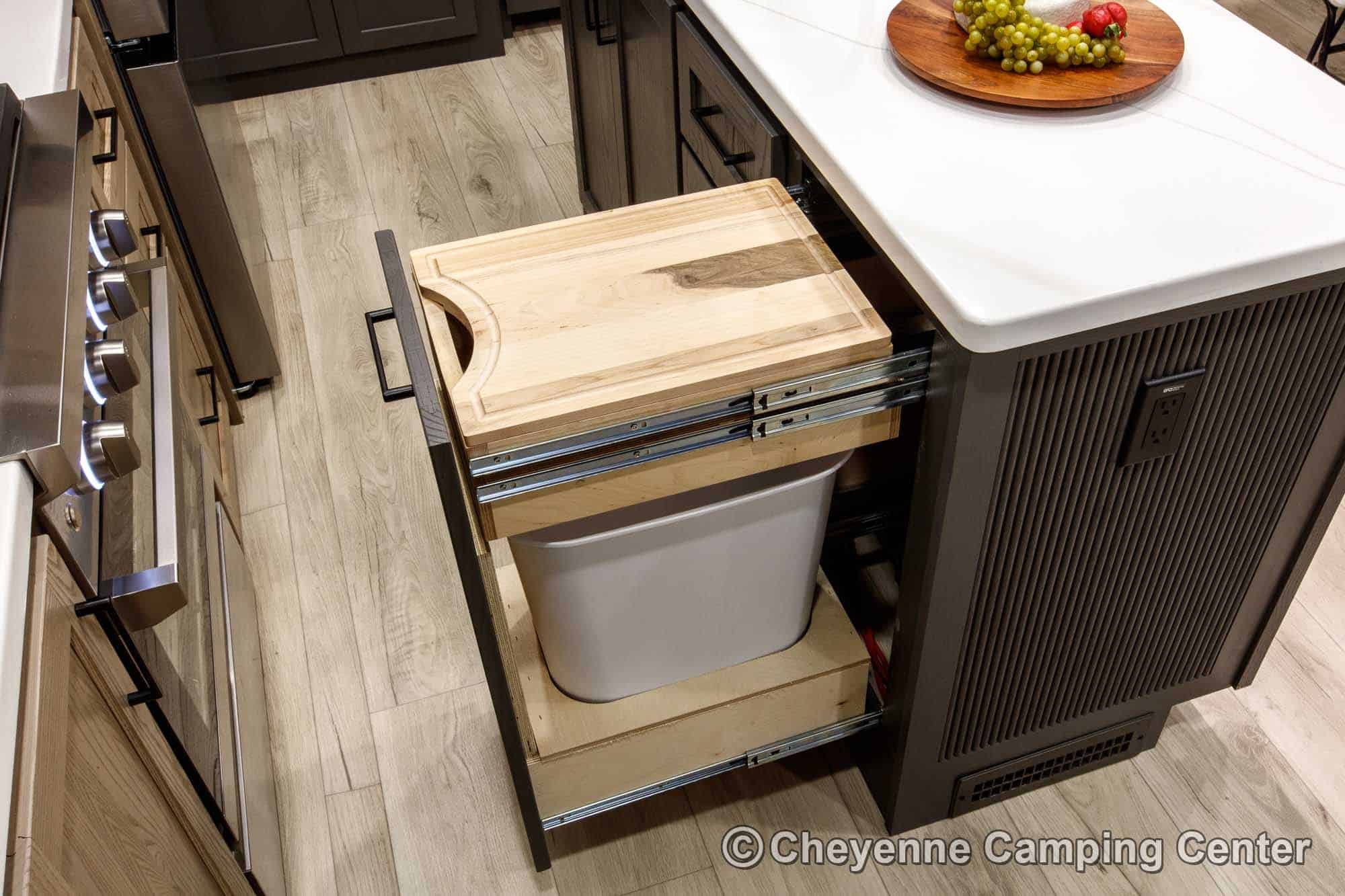 Chef-Ready Kitchen: The gourmet kitchen features an island with an under-mount sink, solid-surface countertops, a residential-style refrigerator, dedicated garbage can storage, a large pantry, ample drawers and cabinets, and a residential-style gas range and oven.