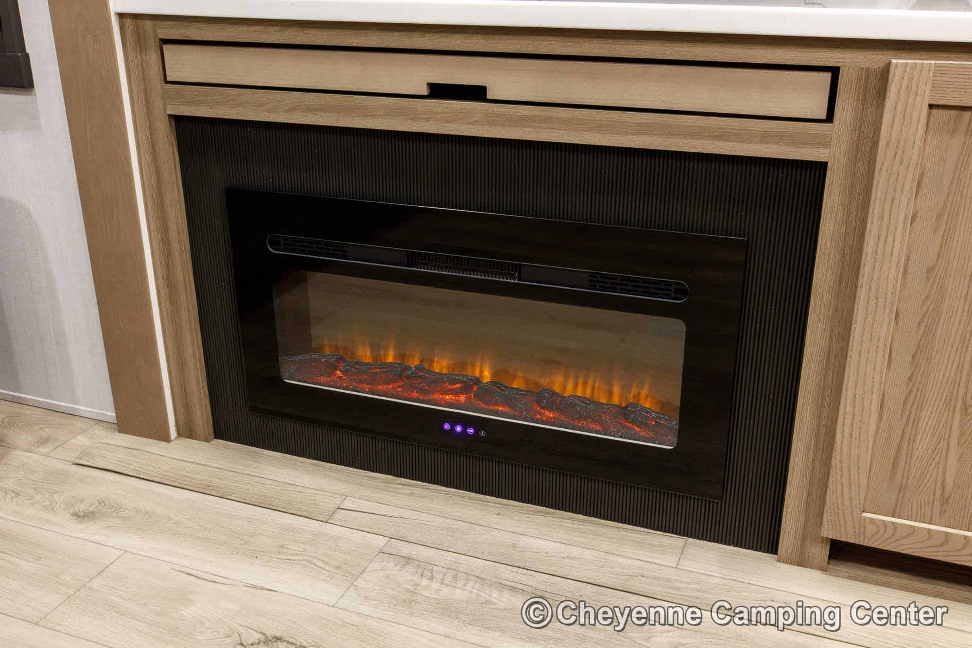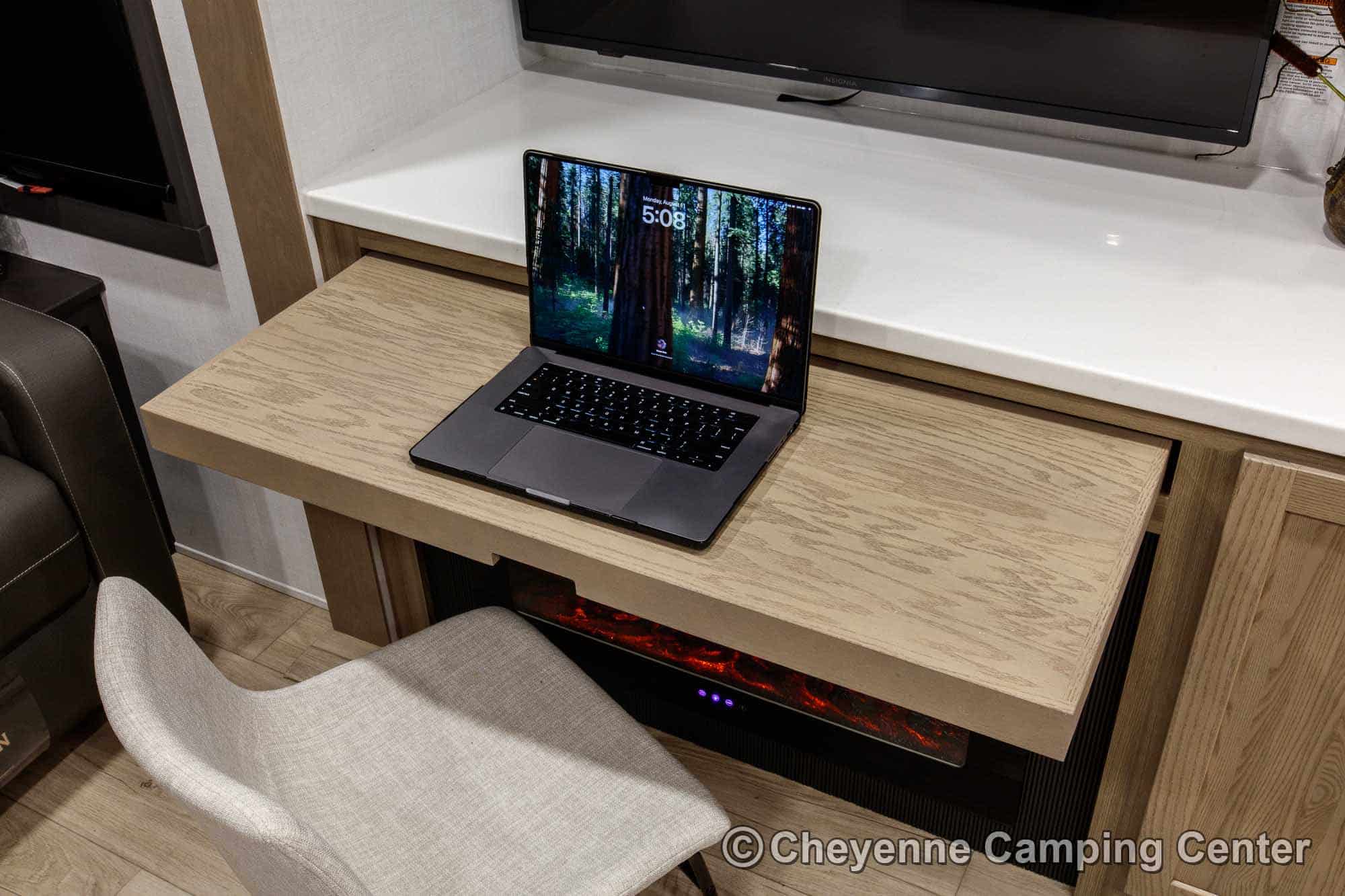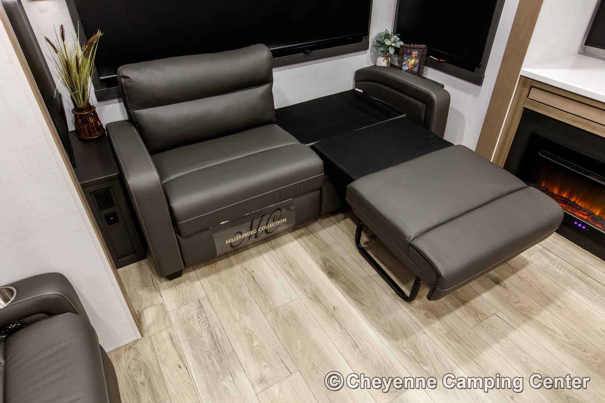 Inviting Living Area: Relax in Comfort with power theater seating, a split sofa sleeper, a ceiling fan, and a free-standing dinette. The entertainment center has a large smart TV, Bluetooth receiver, fireplace, pullout desk, and generous storage.
