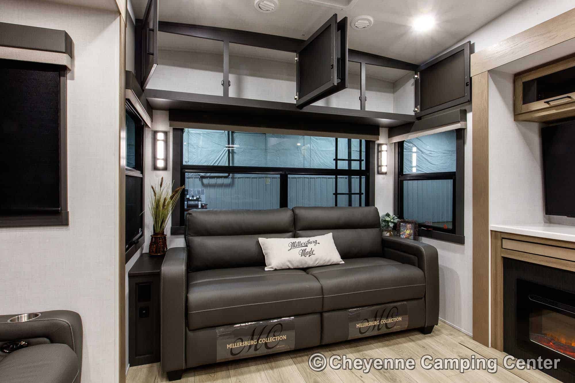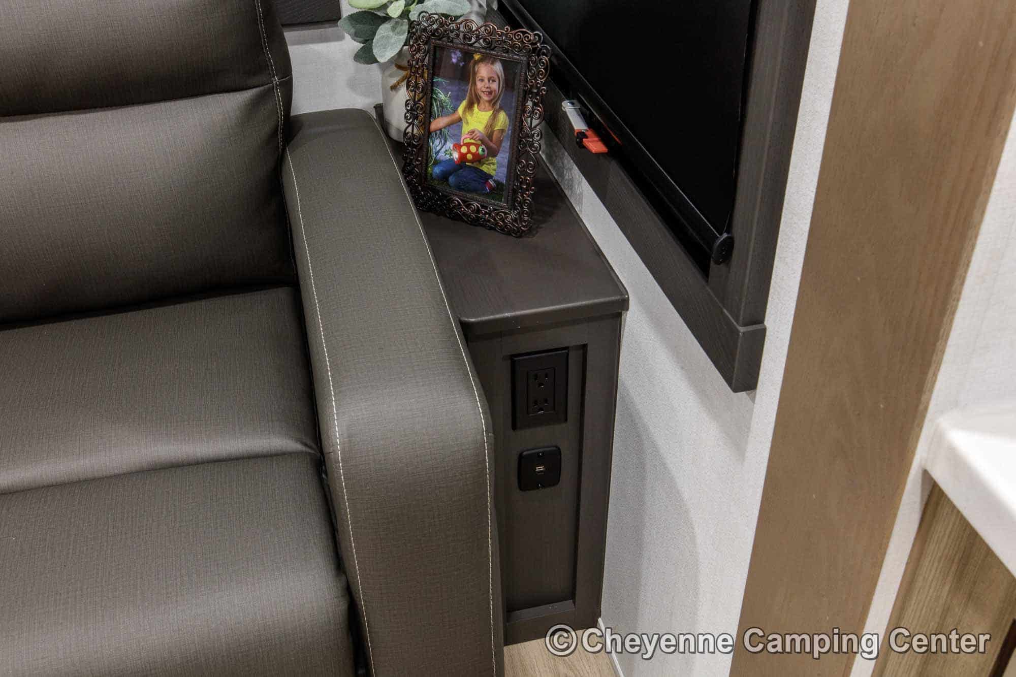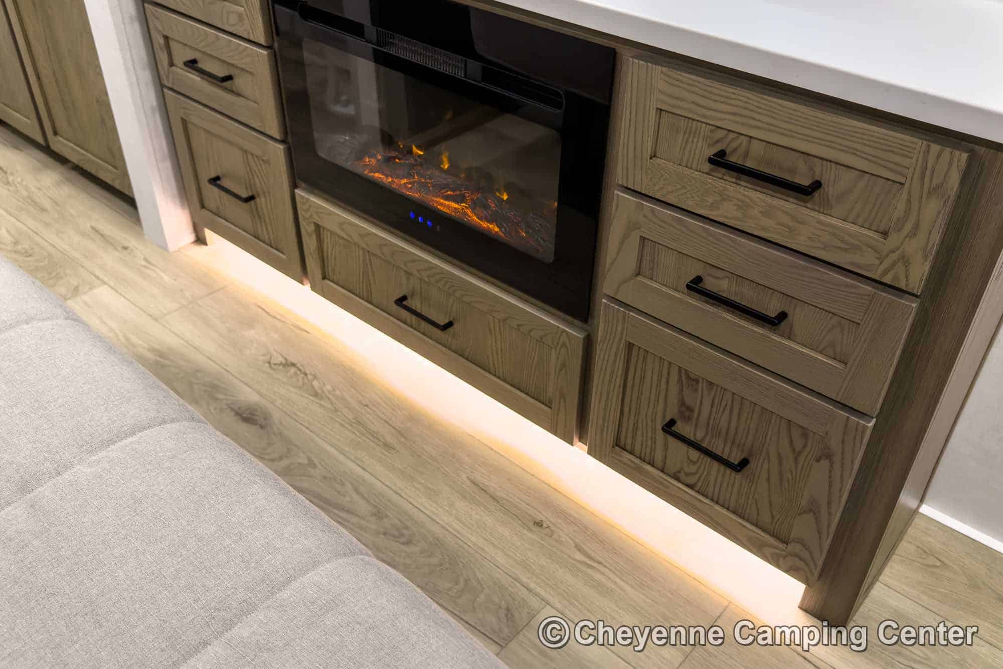 Inviting Living Area: Relax in Comfort with power theater seating, a split sofa sleeper, a ceiling fan, and a free-standing dinette. The entertainment center has a large smart TV, Bluetooth receiver, fireplace, pullout desk, and generous storage.