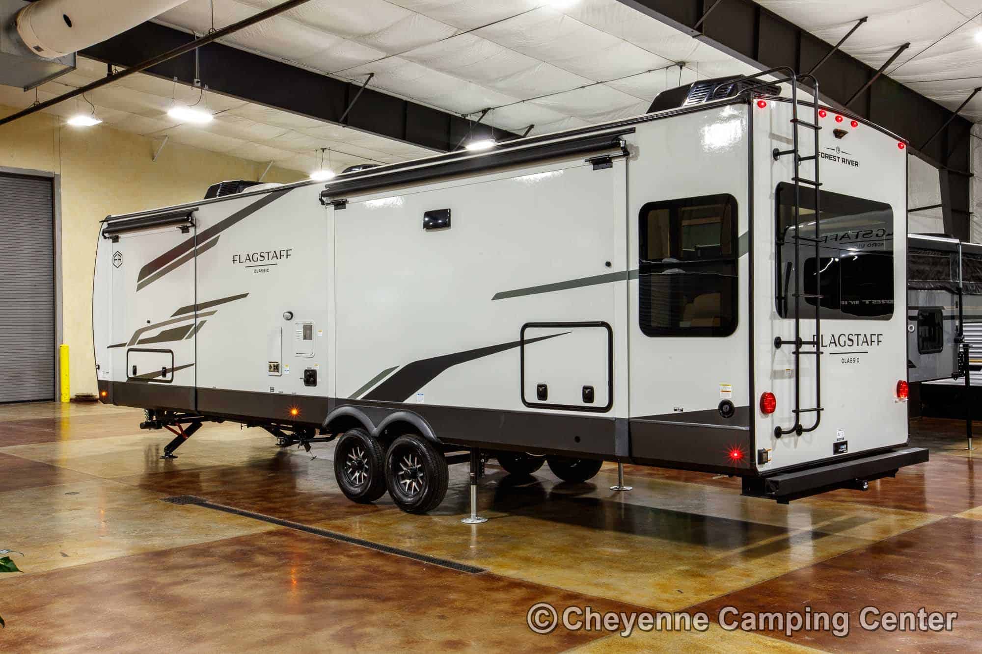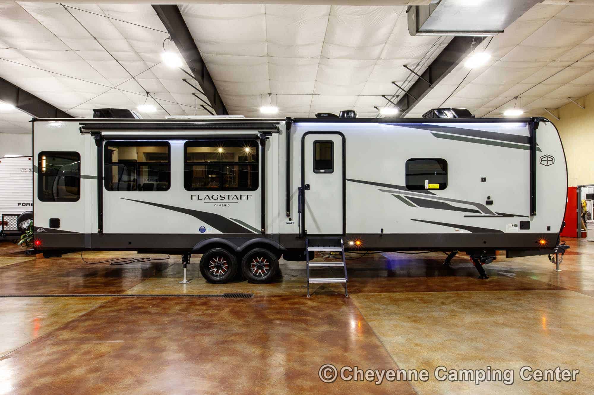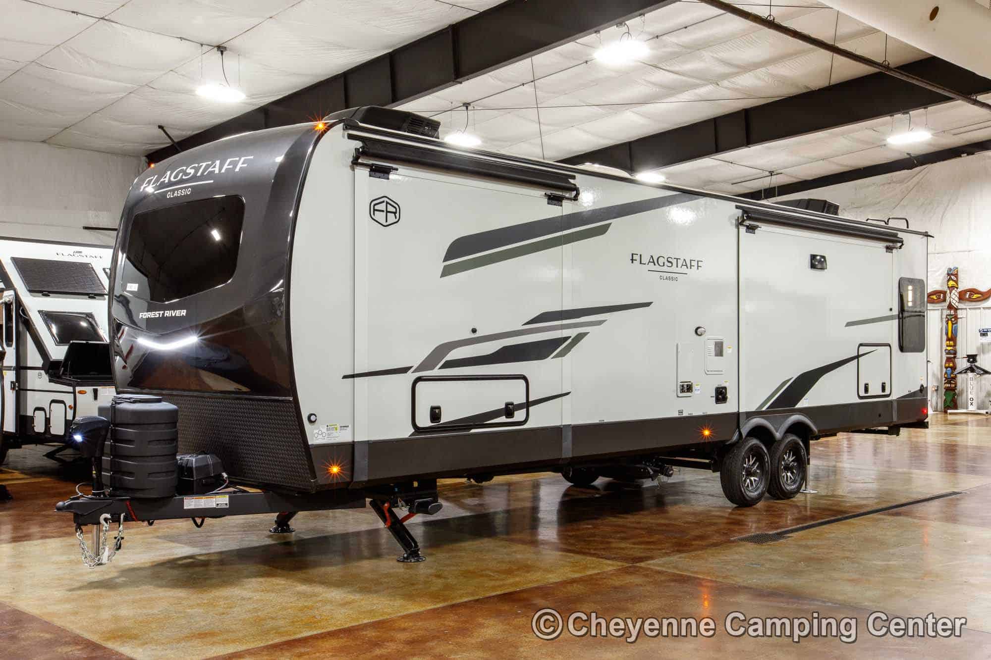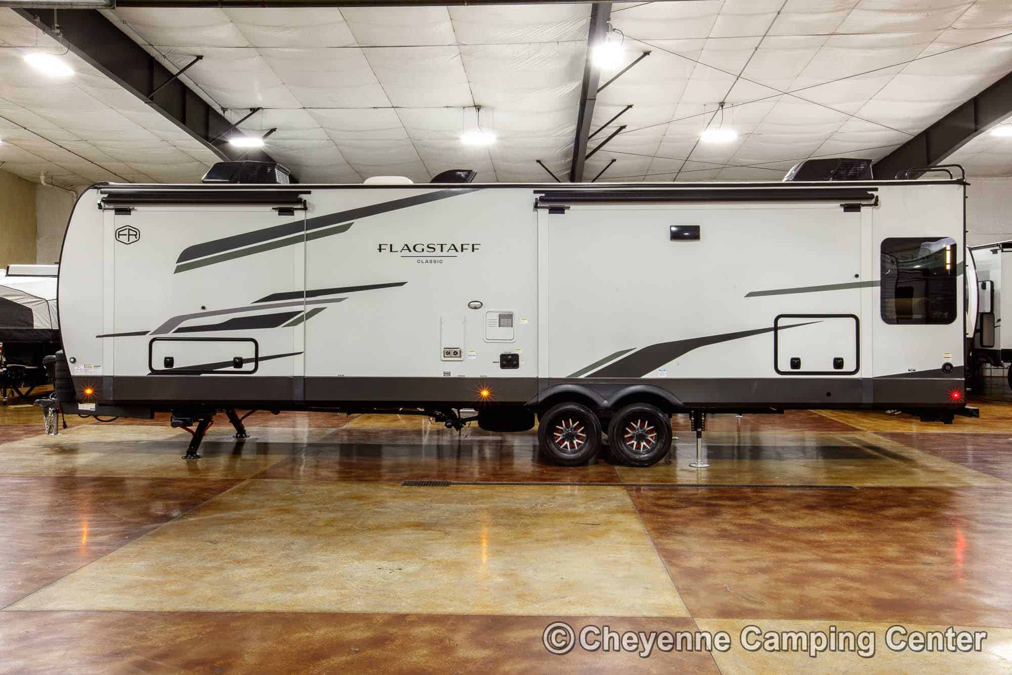 The Flagstaff Classic 832IKRL couples travel trailer for sale at Cheyenne Camping Center also features LED interior lighting, day/night roller shades, slide toppers, exterior storage compartments, Safe-T-Rail telescoping hand rail, integral window shade in entry door, water heater bypass, exterior winterizing fixture, one year manufacturer’s warranty, one year complimentary 24/7 roadside assistance and much more!