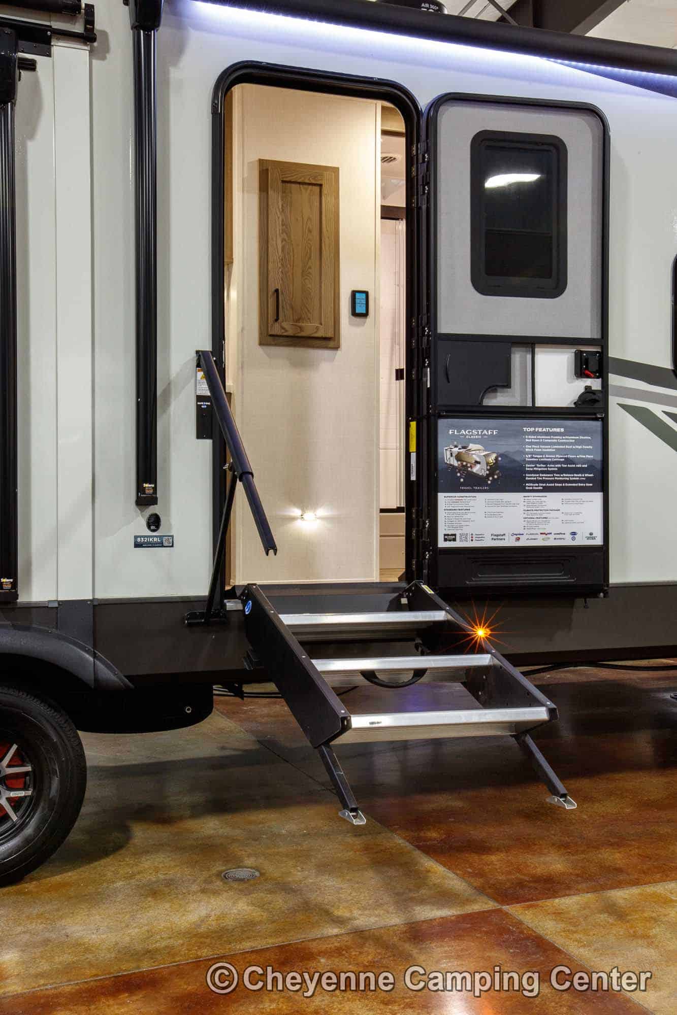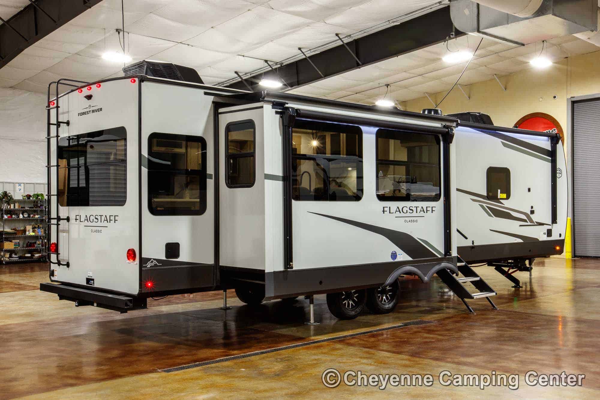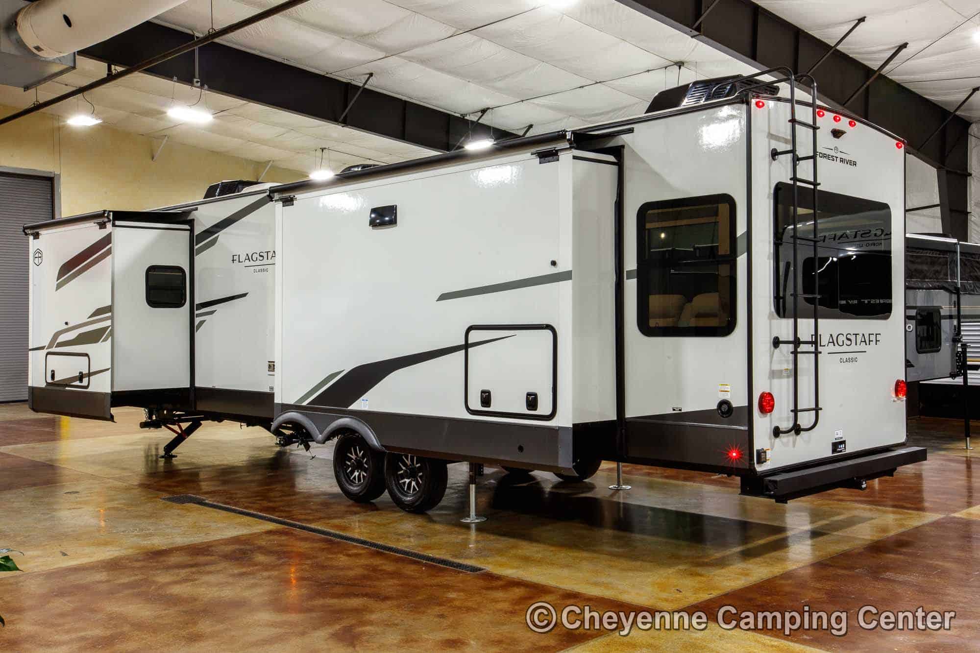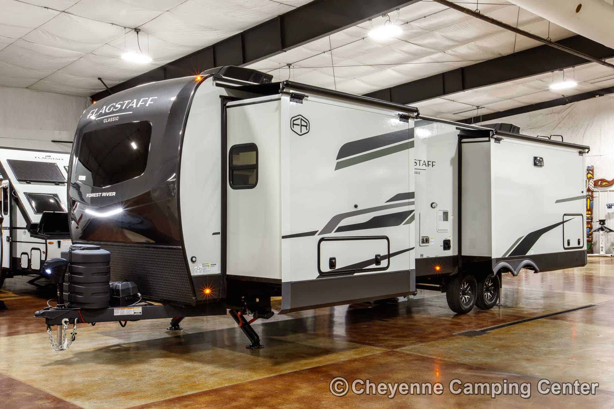The Flagstaff Classic 832IKRL couples travel trailer for sale at Cheyenne Camping Center also features LED interior lighting, day/night roller shades, slide toppers, exterior storage compartments, Safe-T-Rail telescoping hand rail, integral window shade in entry door, water heater bypass, exterior winterizing fixture, one year manufacturer’s warranty, one year complimentary 24/7 roadside assistance and much more!