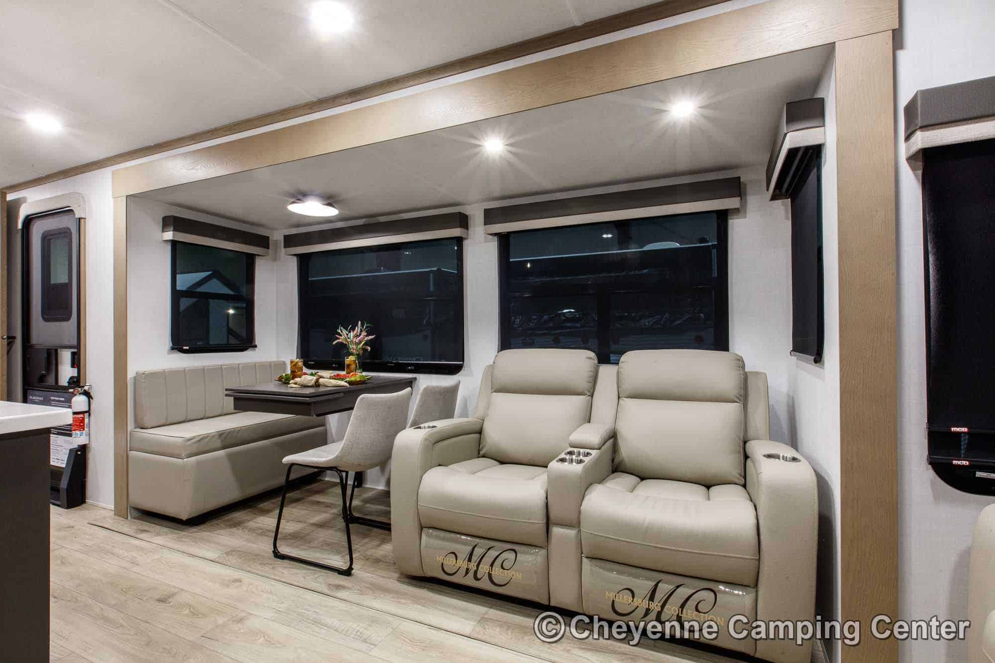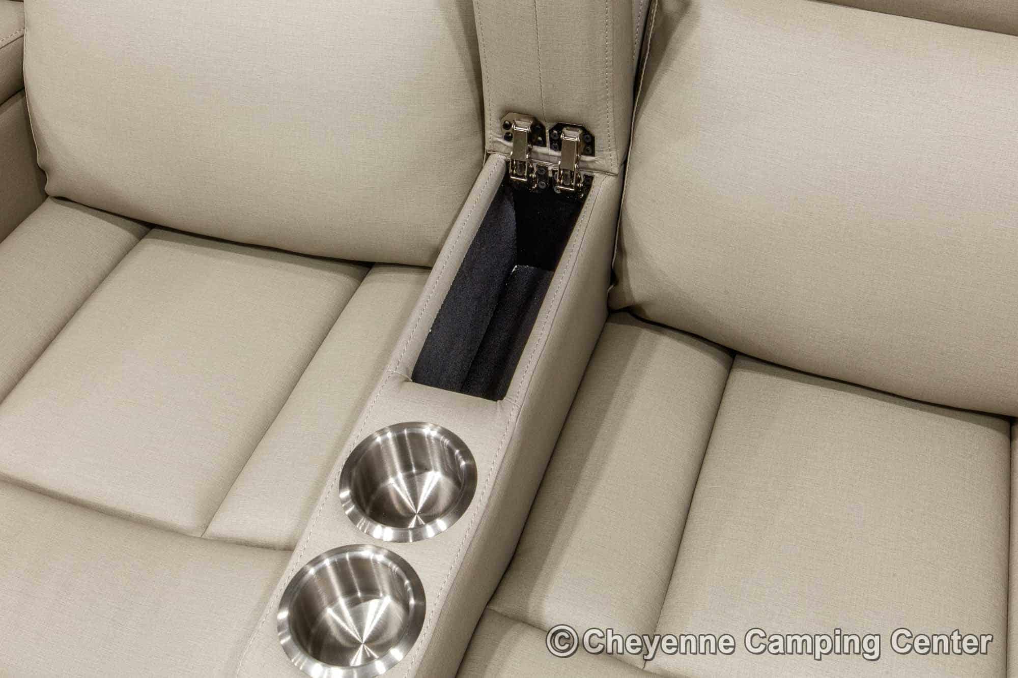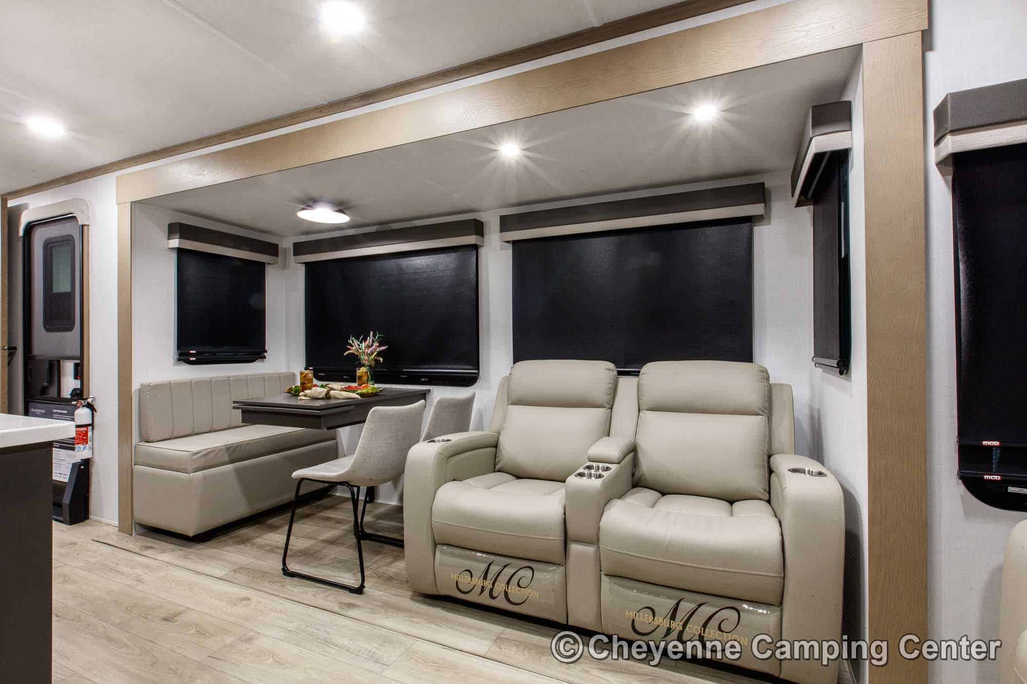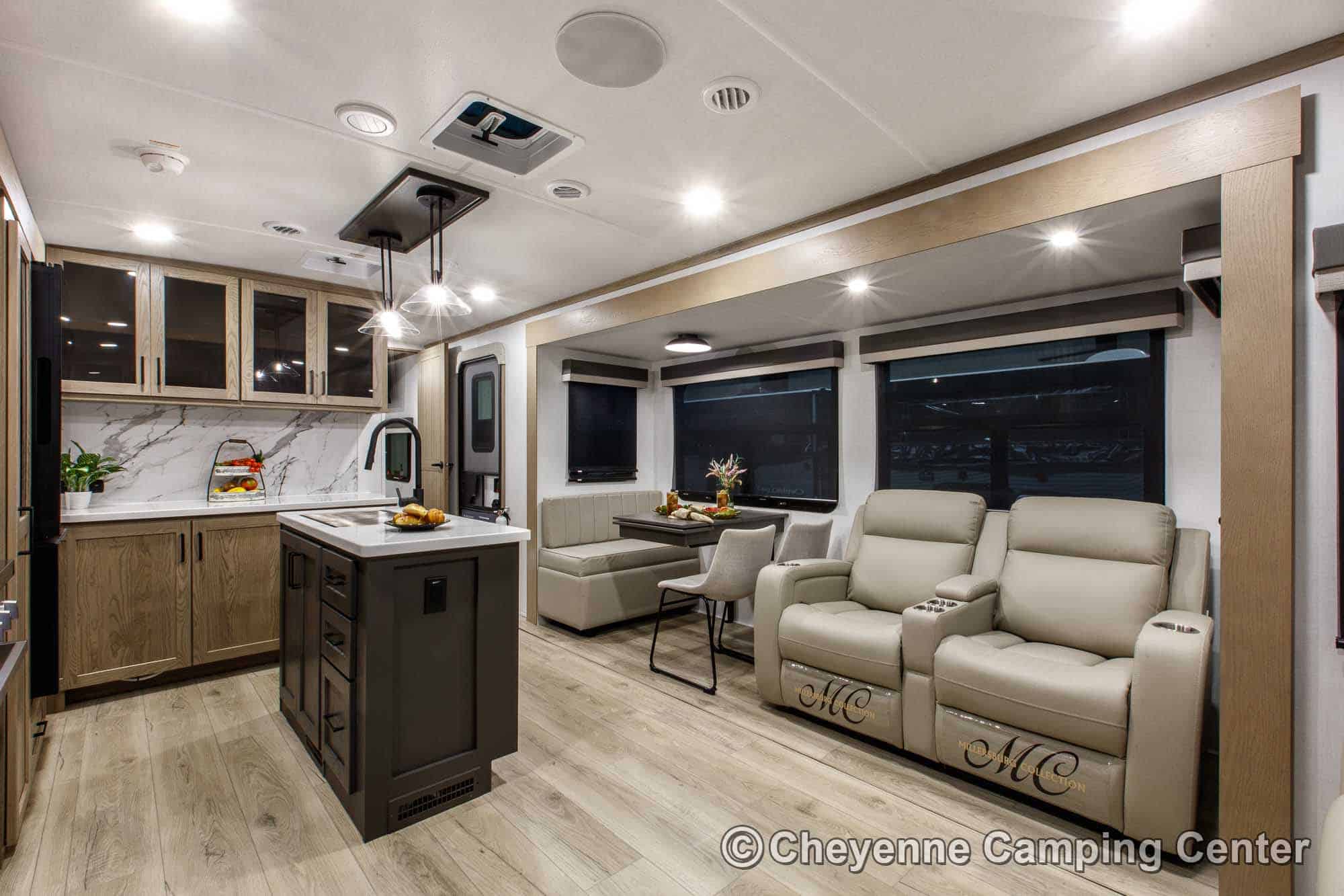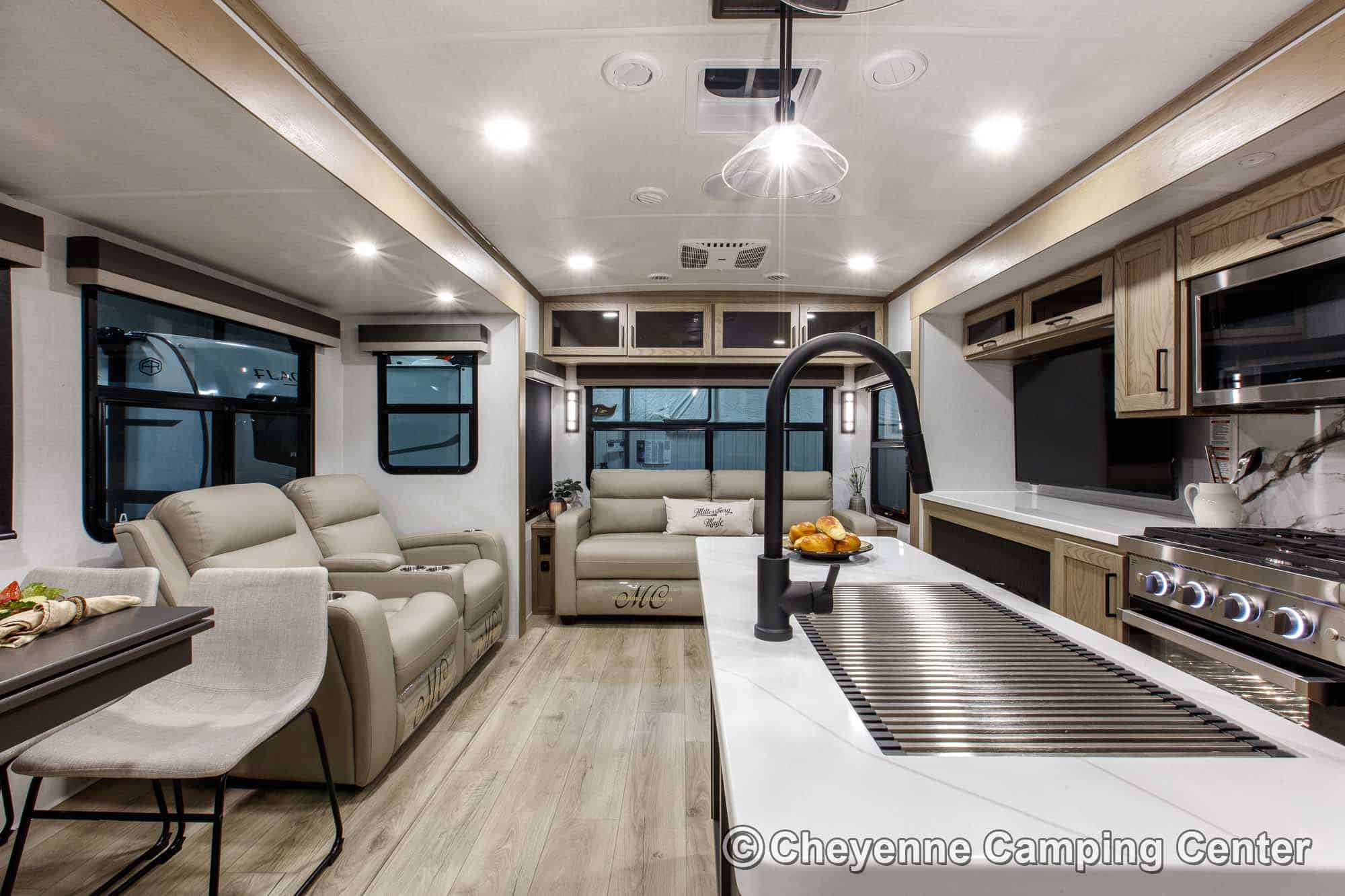 The first thing you’ll notice upon entering the Flagstaff Classic 832IKRL is the wonderful island kitchen and rear living room. The kitchen features solid surface countertops, a gas range with 21″ oven, microwave, 10 cu. ft. refrigerator, large single bowl under-mount sink, and ample storage including overhead and under counter cabinets, drawers and pantry. The rear living room features a split tri-fold sofa sleeper, reclining theater seating and entertainment center including a 50″ Smart TV with integral stereo and electric fireplace.