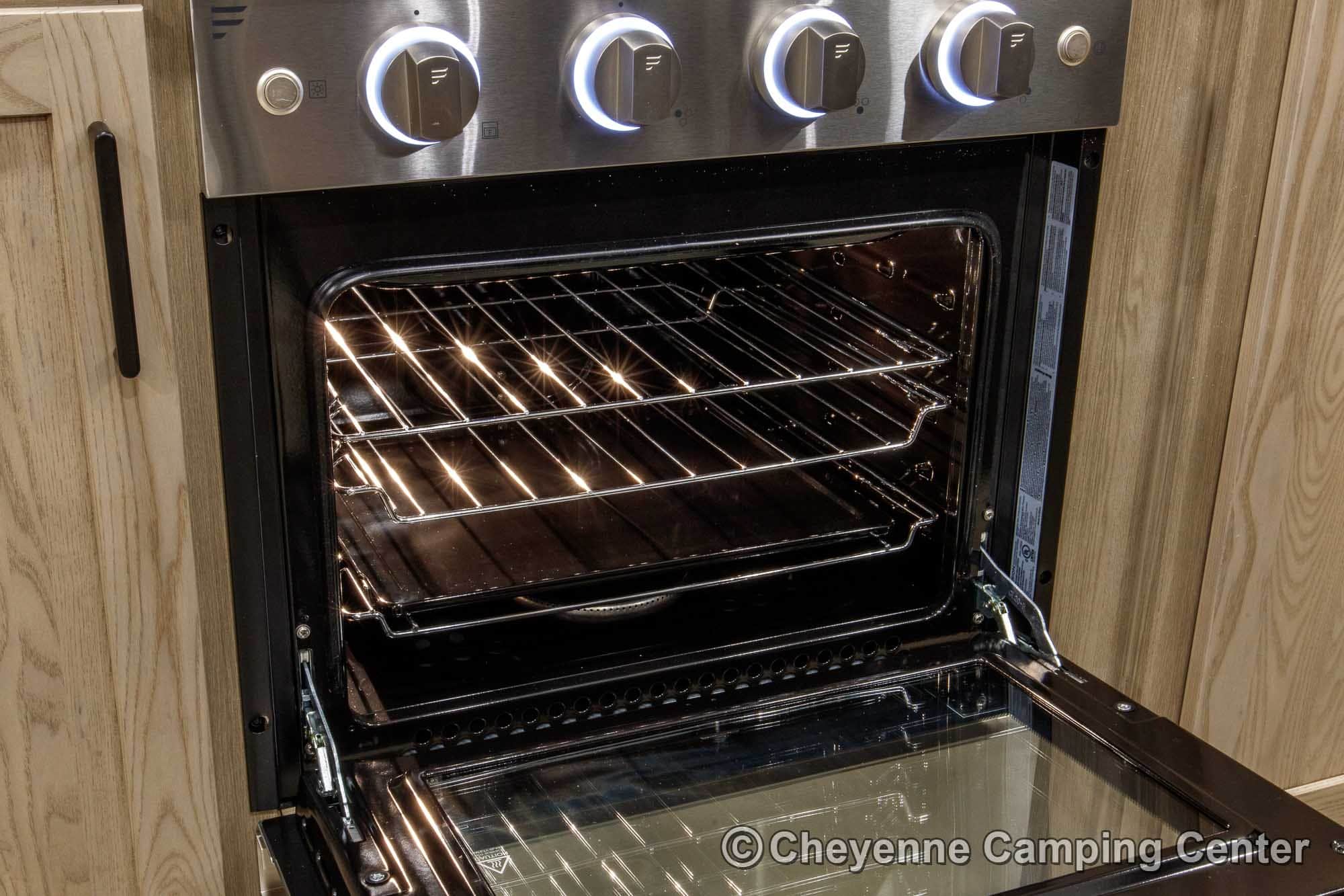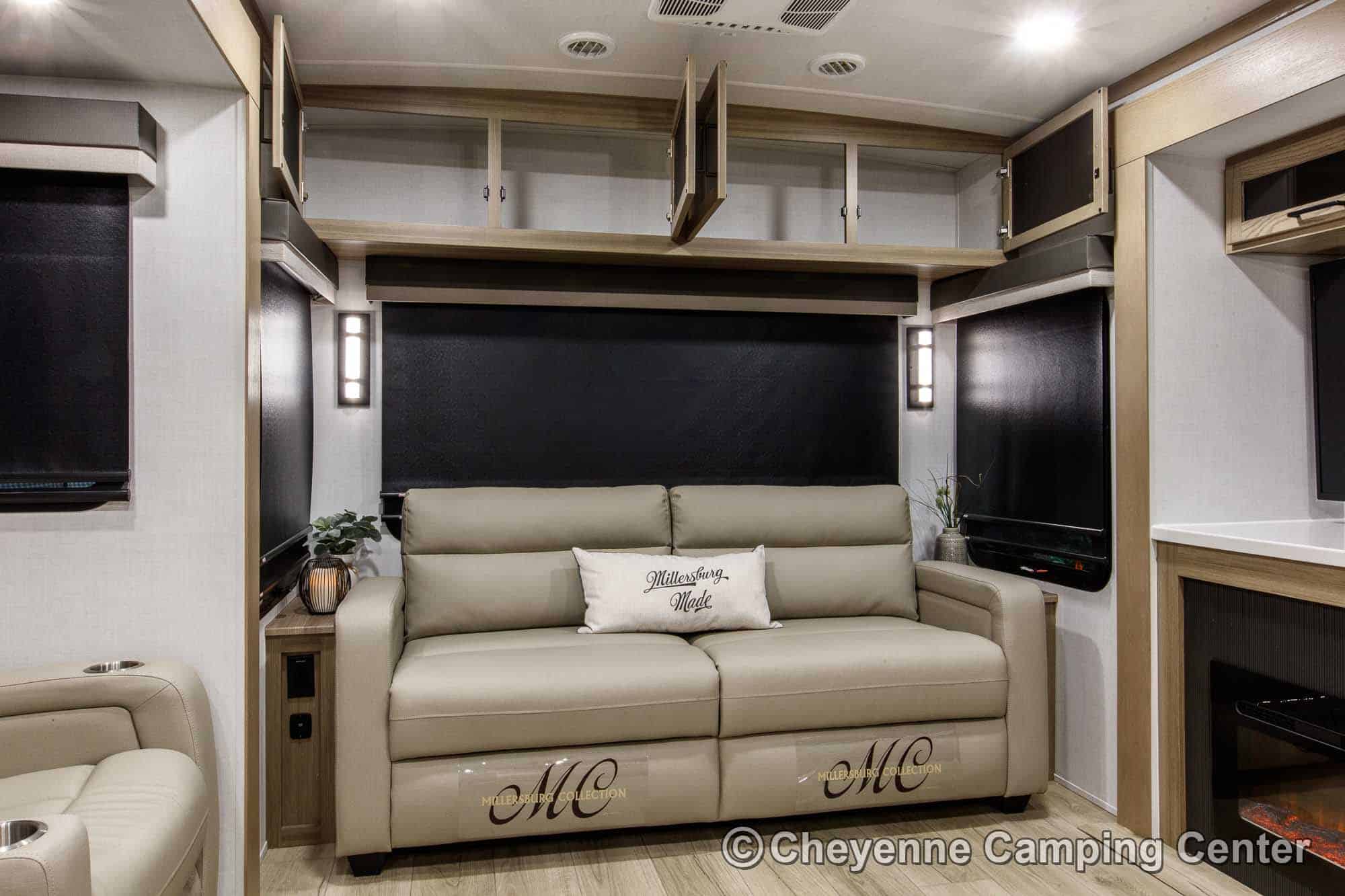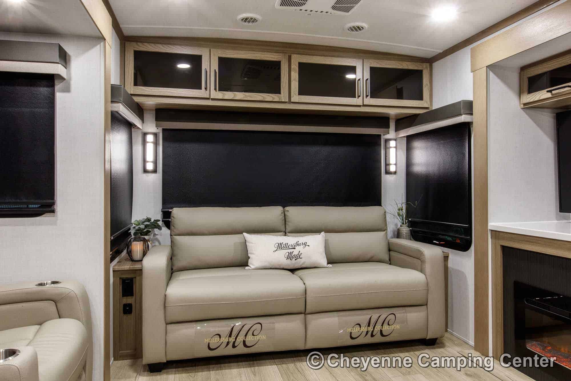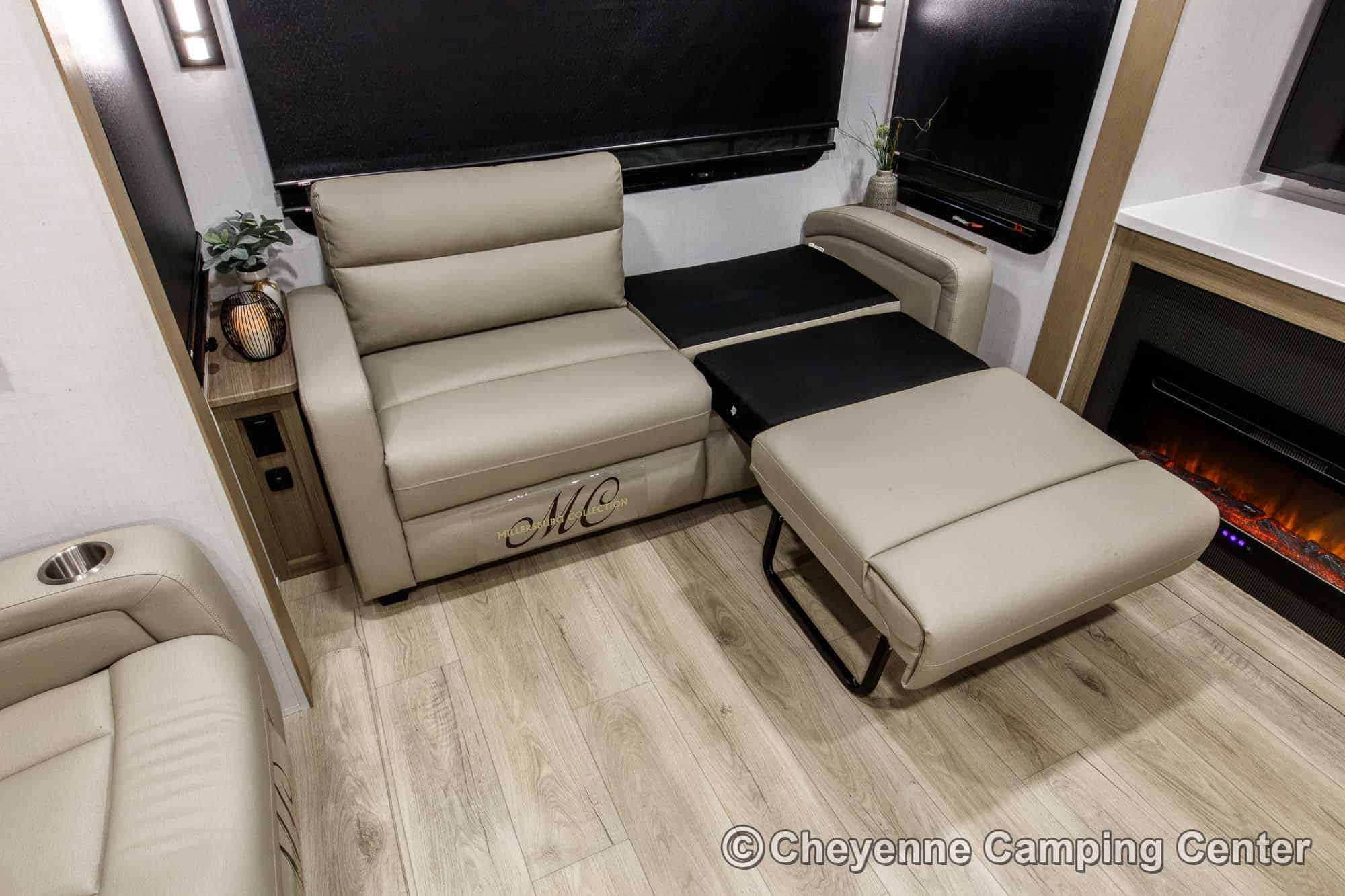 The first thing you’ll notice upon entering the Flagstaff Classic 832IKRL is the wonderful island kitchen and rear living room. The kitchen features solid surface countertops, a gas range with 21″ oven, microwave, 10 cu. ft. refrigerator, large single bowl under-mount sink, and ample storage including overhead and under counter cabinets, drawers and pantry. The rear living room features a split tri-fold sofa sleeper, reclining theater seating and entertainment center including a 50″ Smart TV with integral stereo and electric fireplace.