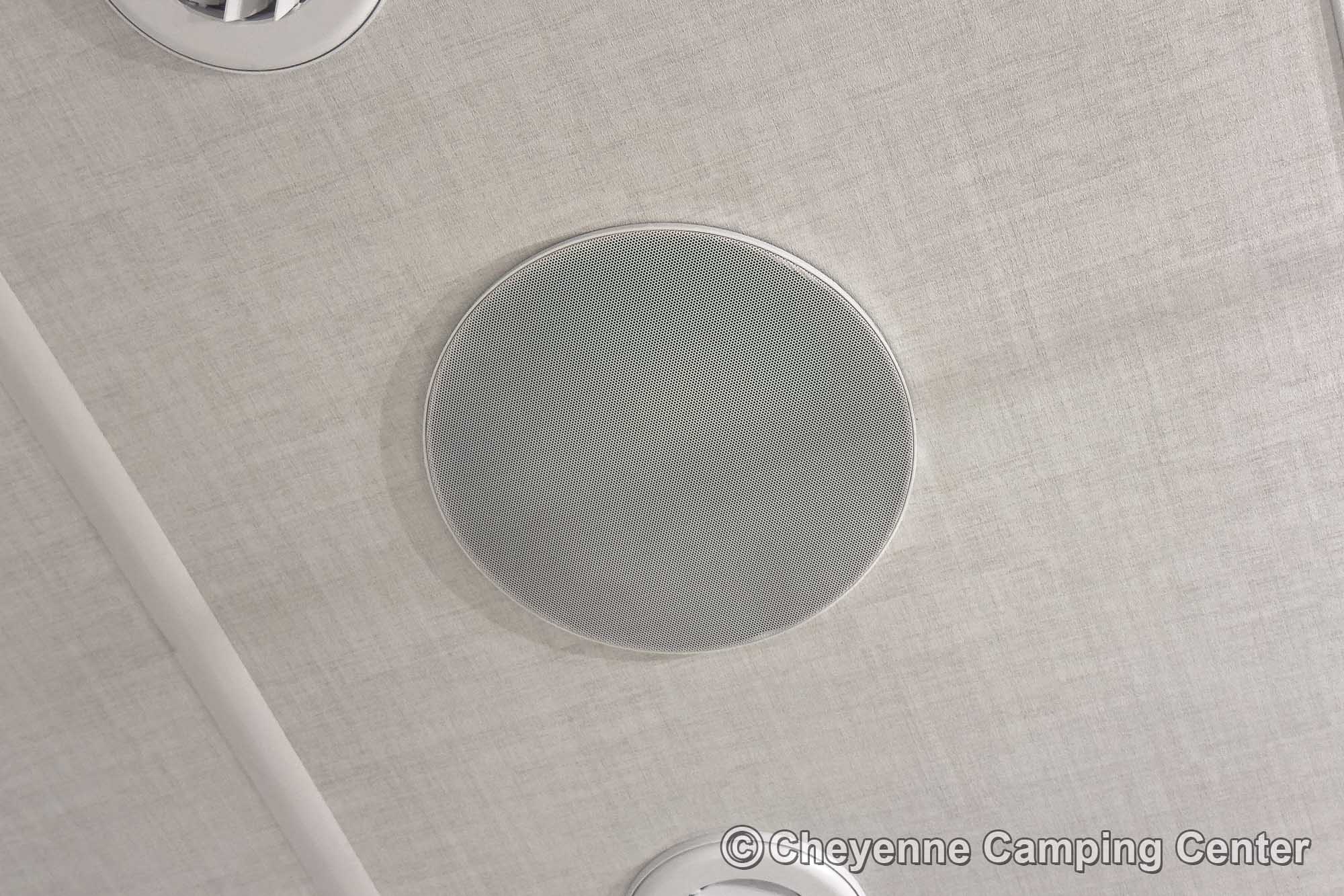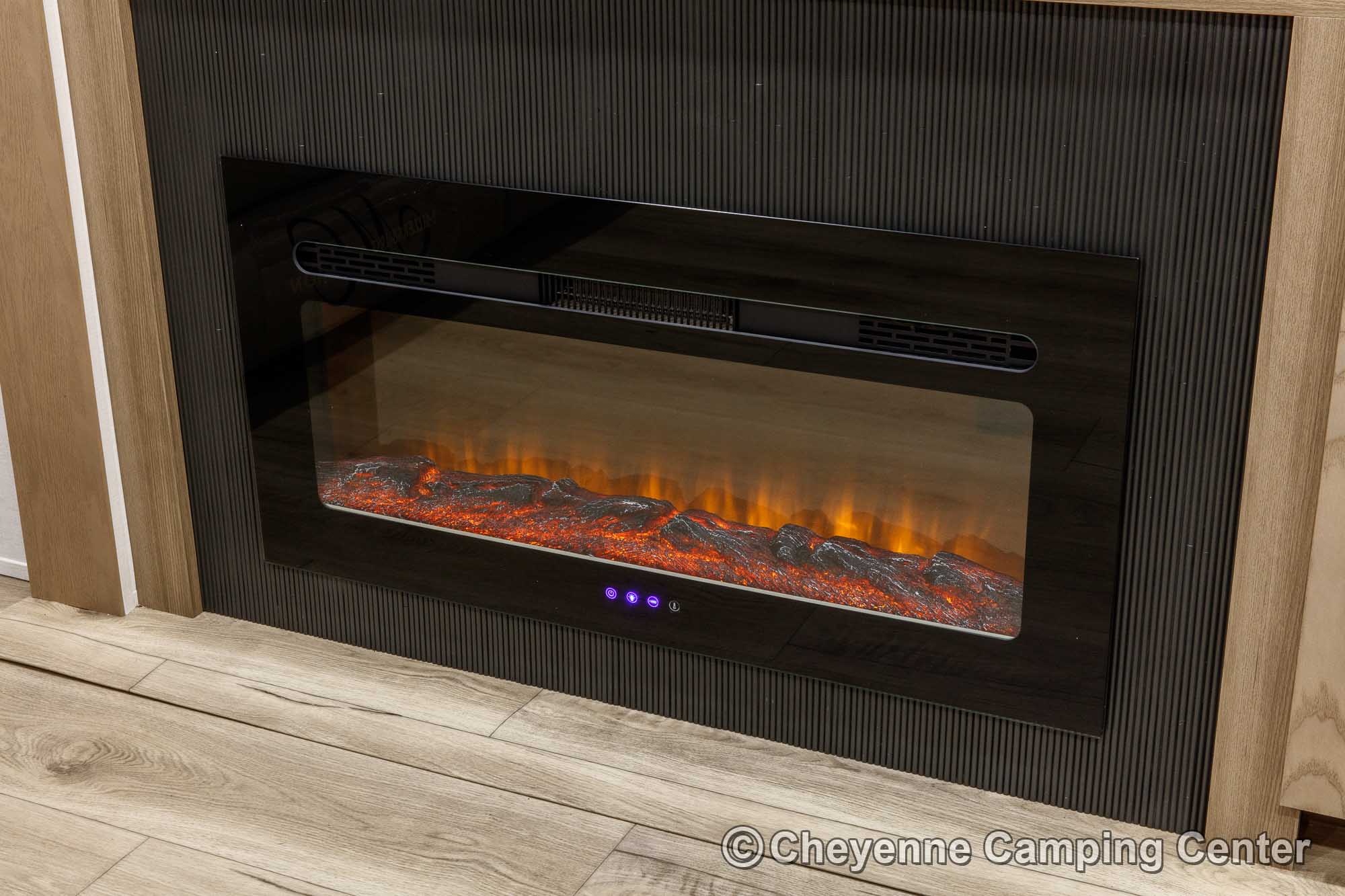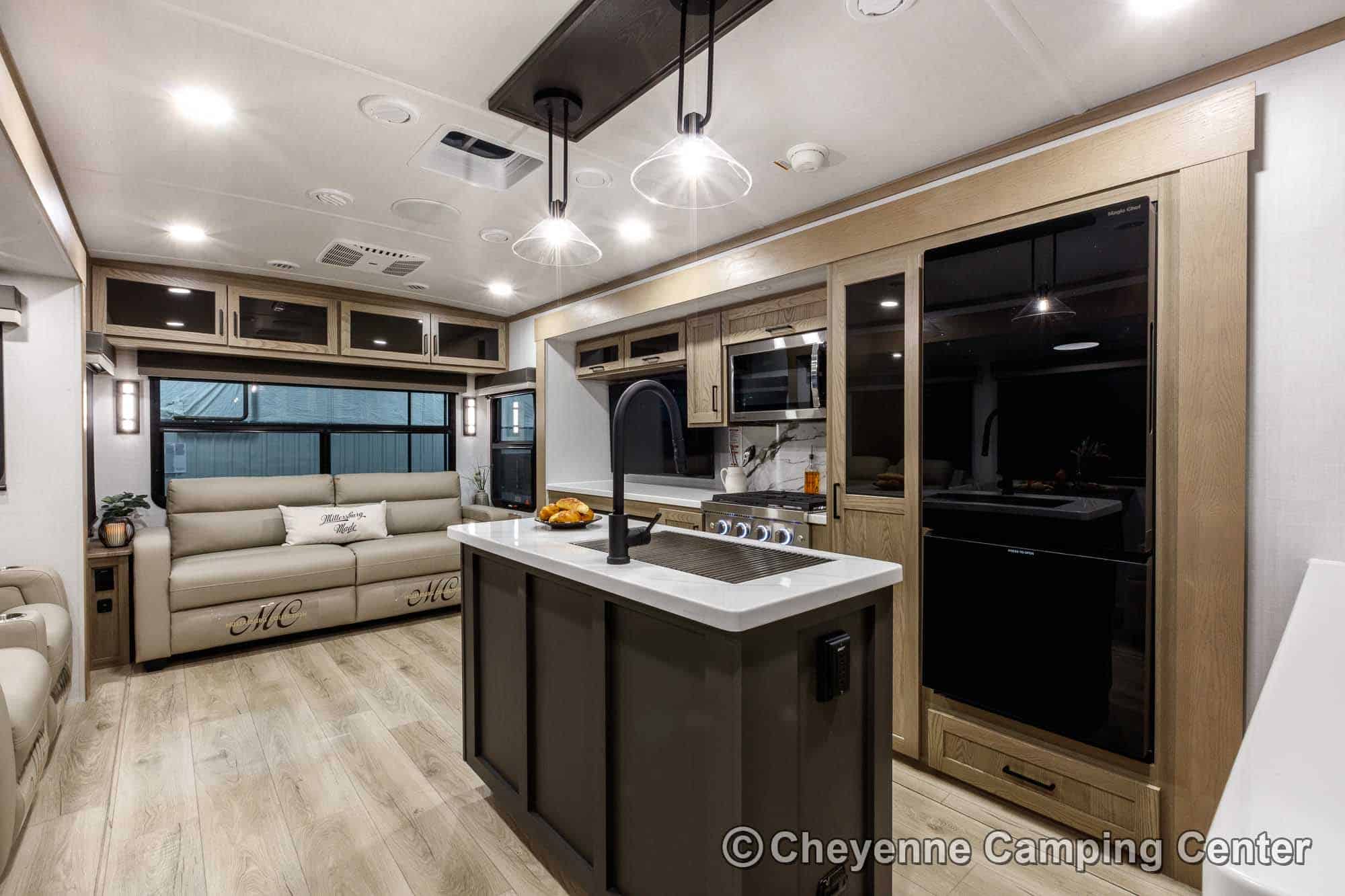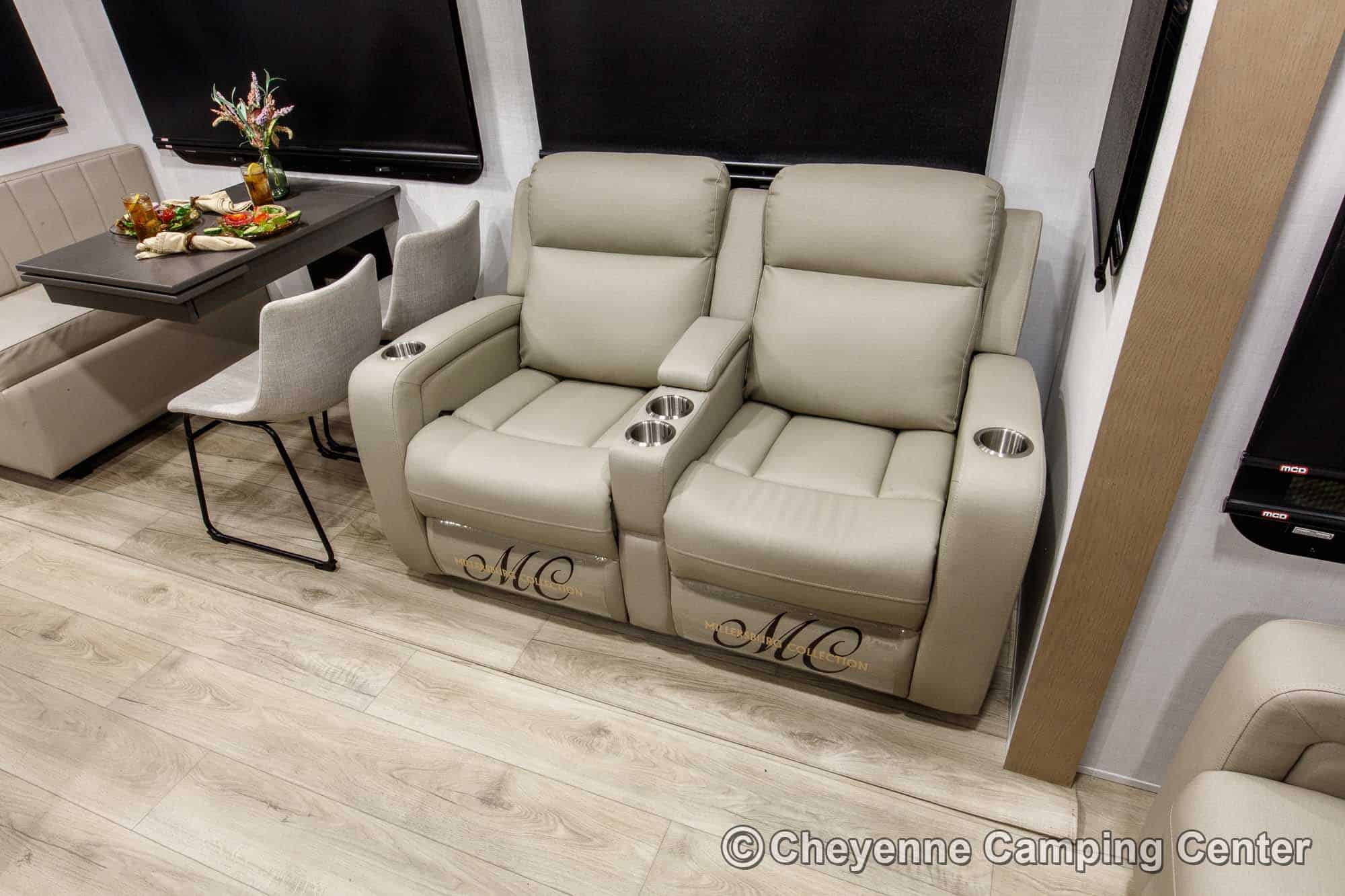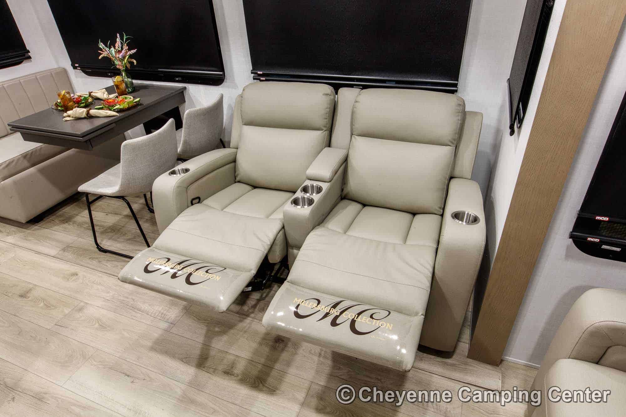 The first thing you’ll notice upon entering the Flagstaff Classic 832IKRL is the wonderful island kitchen and rear living room. The kitchen features solid surface countertops, a gas range with 21″ oven, microwave, 10 cu. ft. refrigerator, large single bowl under-mount sink, and ample storage including overhead and under counter cabinets, drawers and pantry. The rear living room features a split tri-fold sofa sleeper, reclining theater seating and entertainment center including a 50″ Smart TV with integral stereo and electric fireplace.
