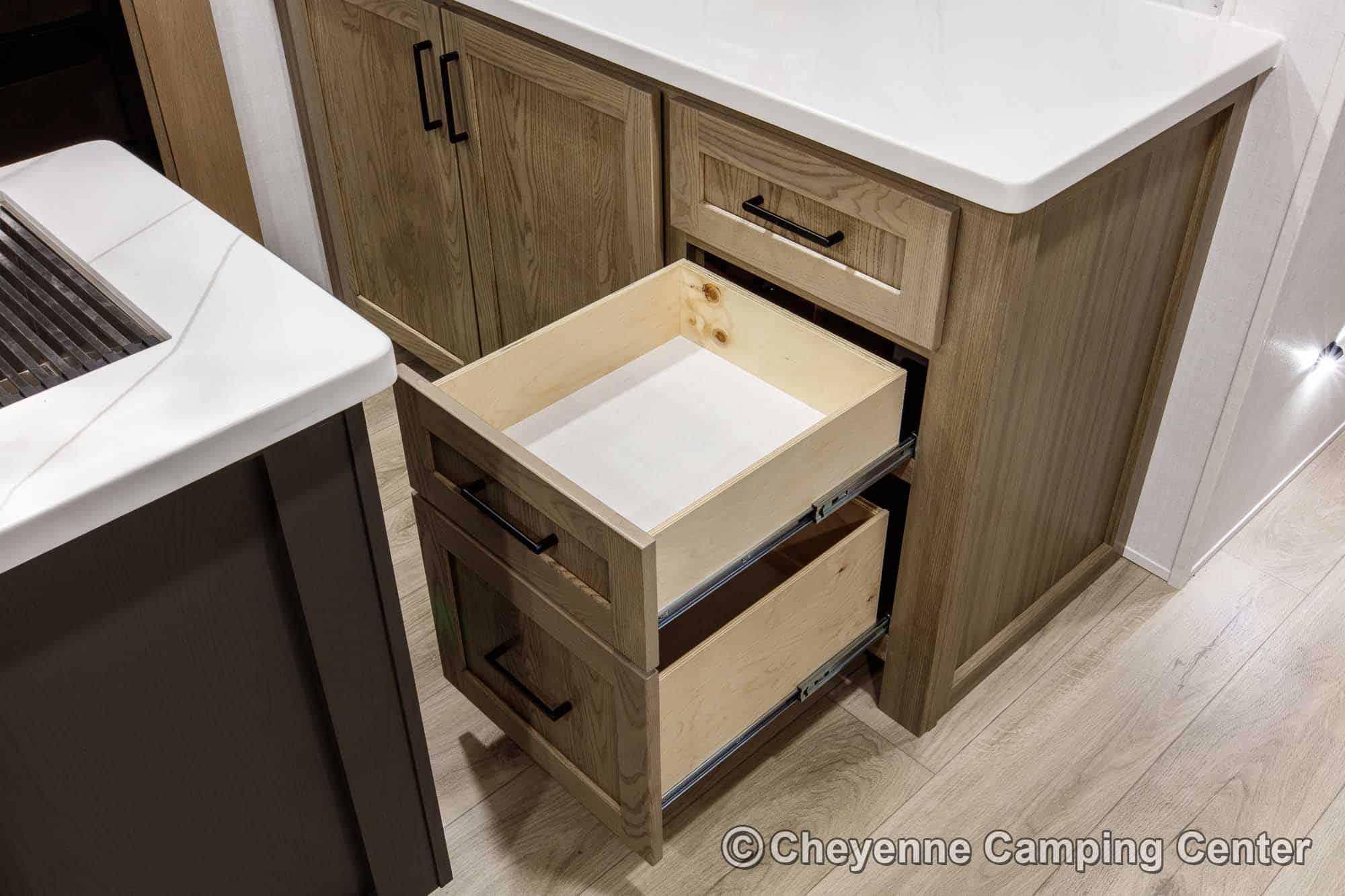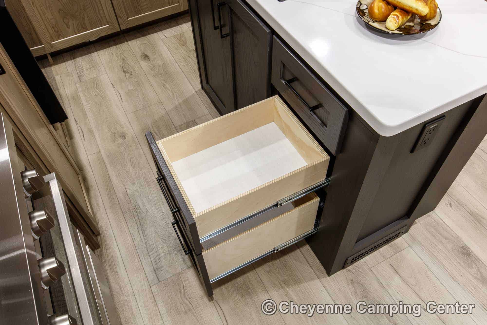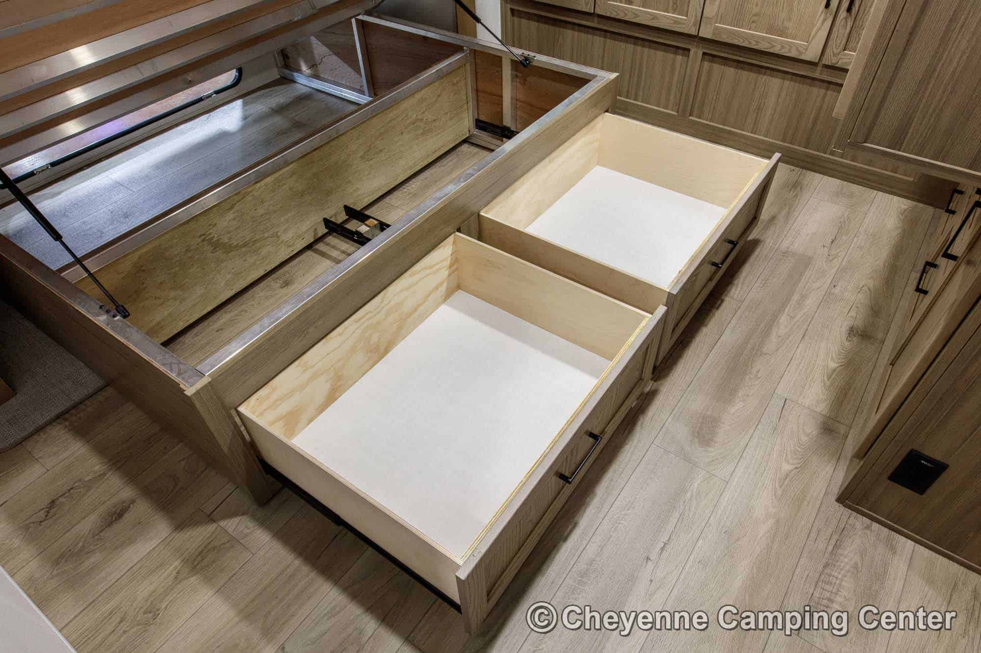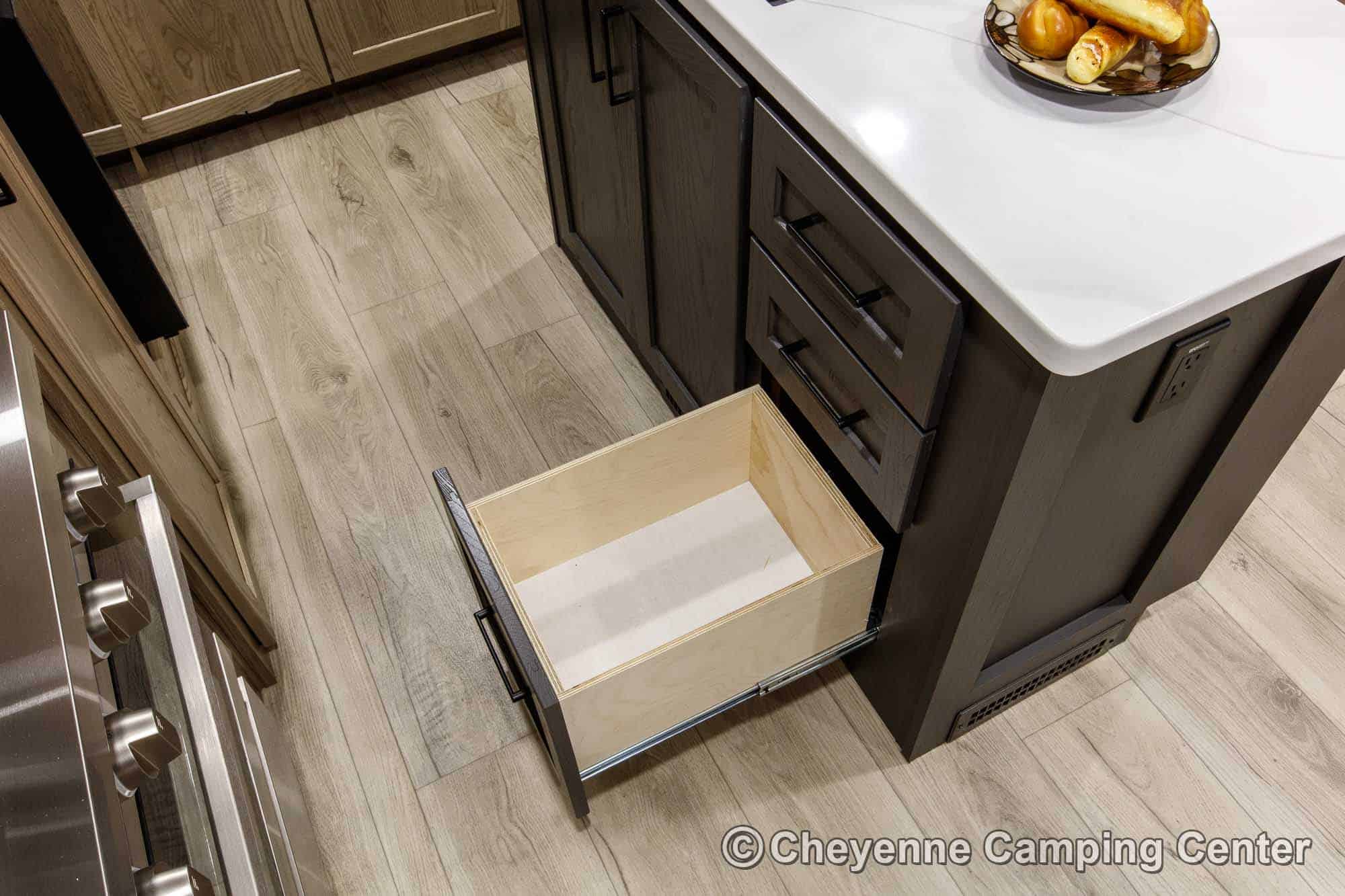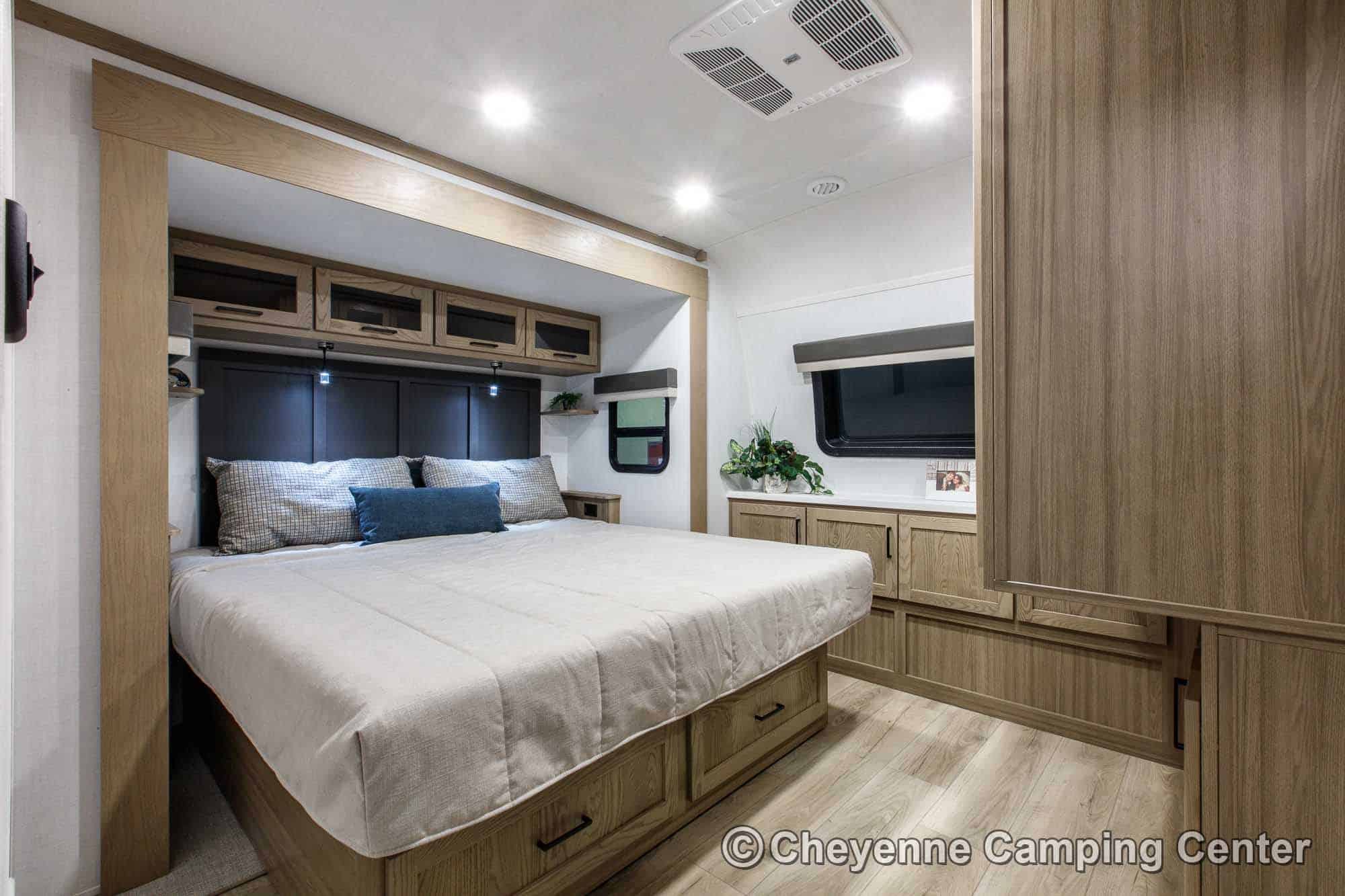 You’ll feel right at home in the spacious front bedroom. It features a king bed with storage drawers under, a 2nd 15K BTU air conditioner, HD TV, large wardrobe with washer/dryer prep, front counter with cabinets under.