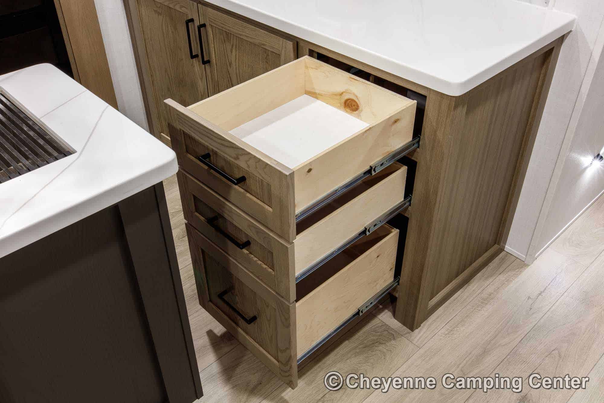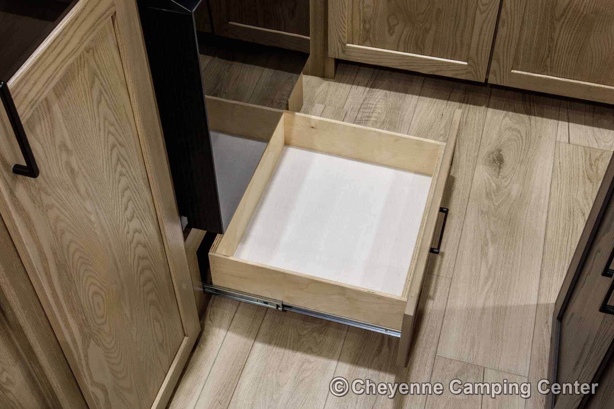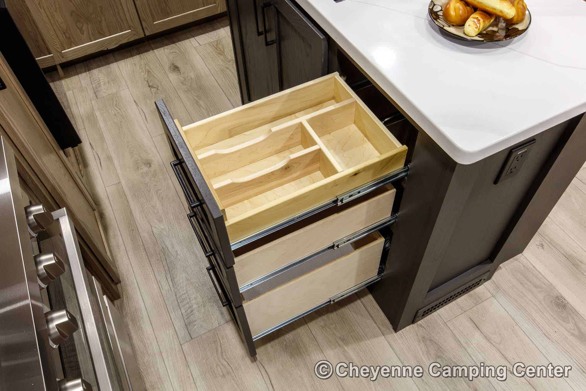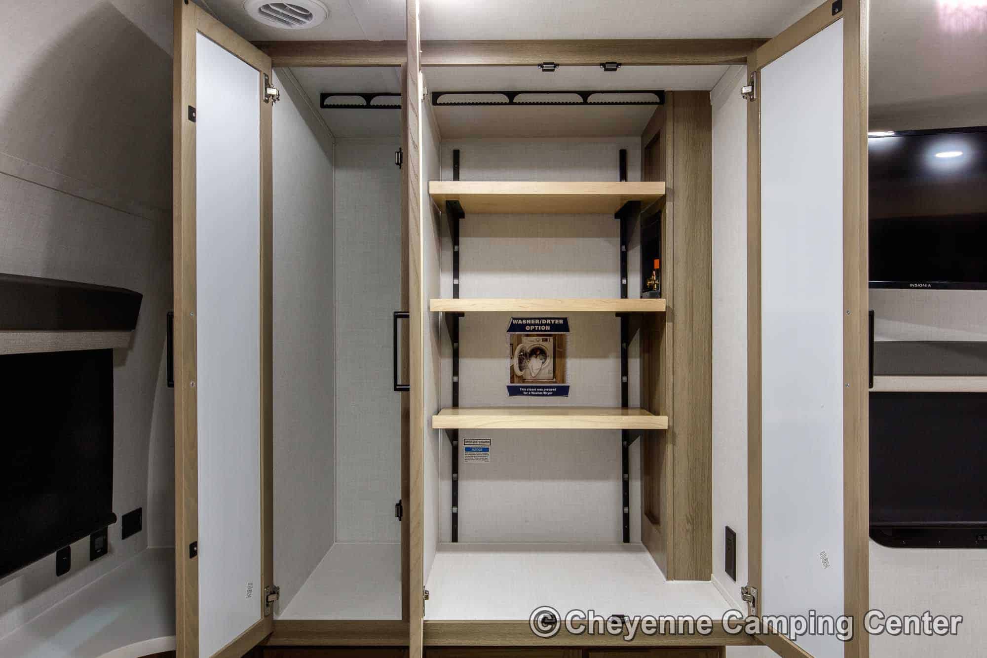 You’ll feel right at home in the spacious front bedroom. It features a king bed with storage drawers under, a 2nd 15K BTU air conditioner, HD TV, large wardrobe with washer/dryer prep, front counter with cabinets under.