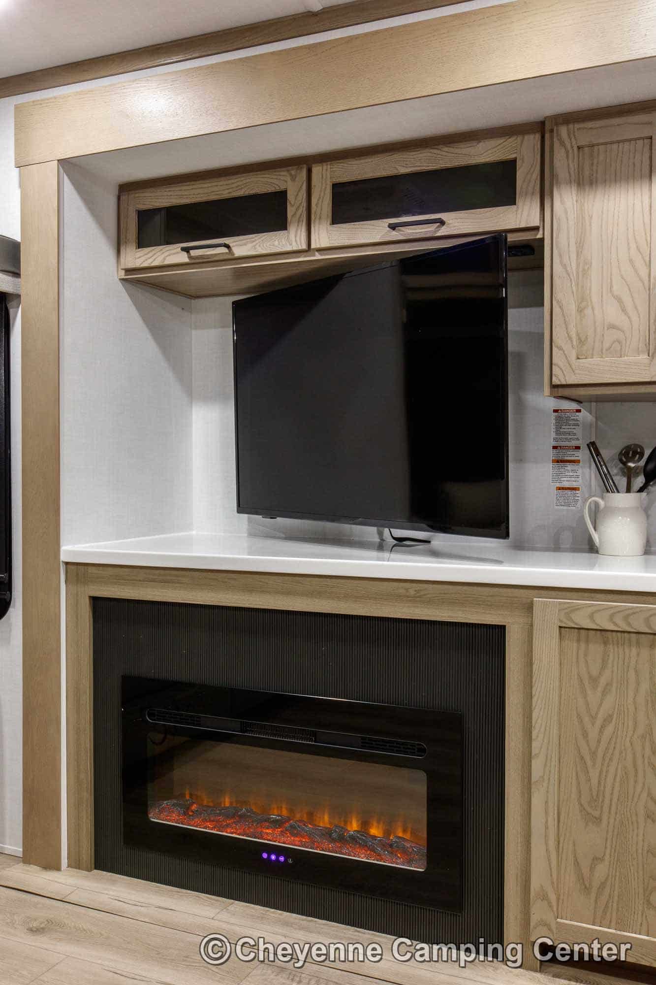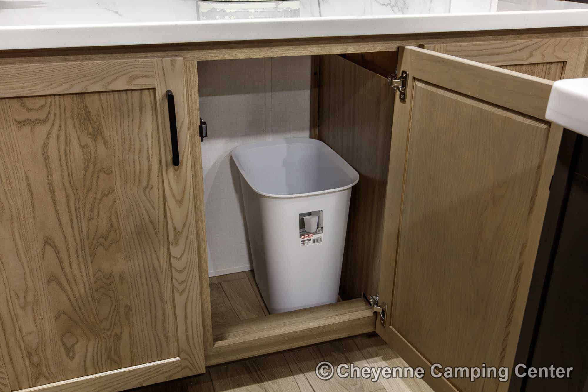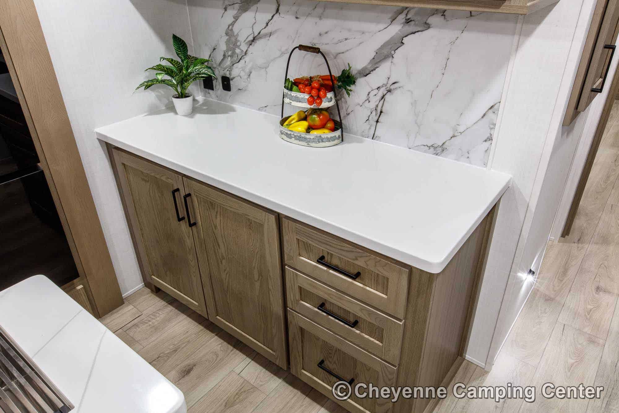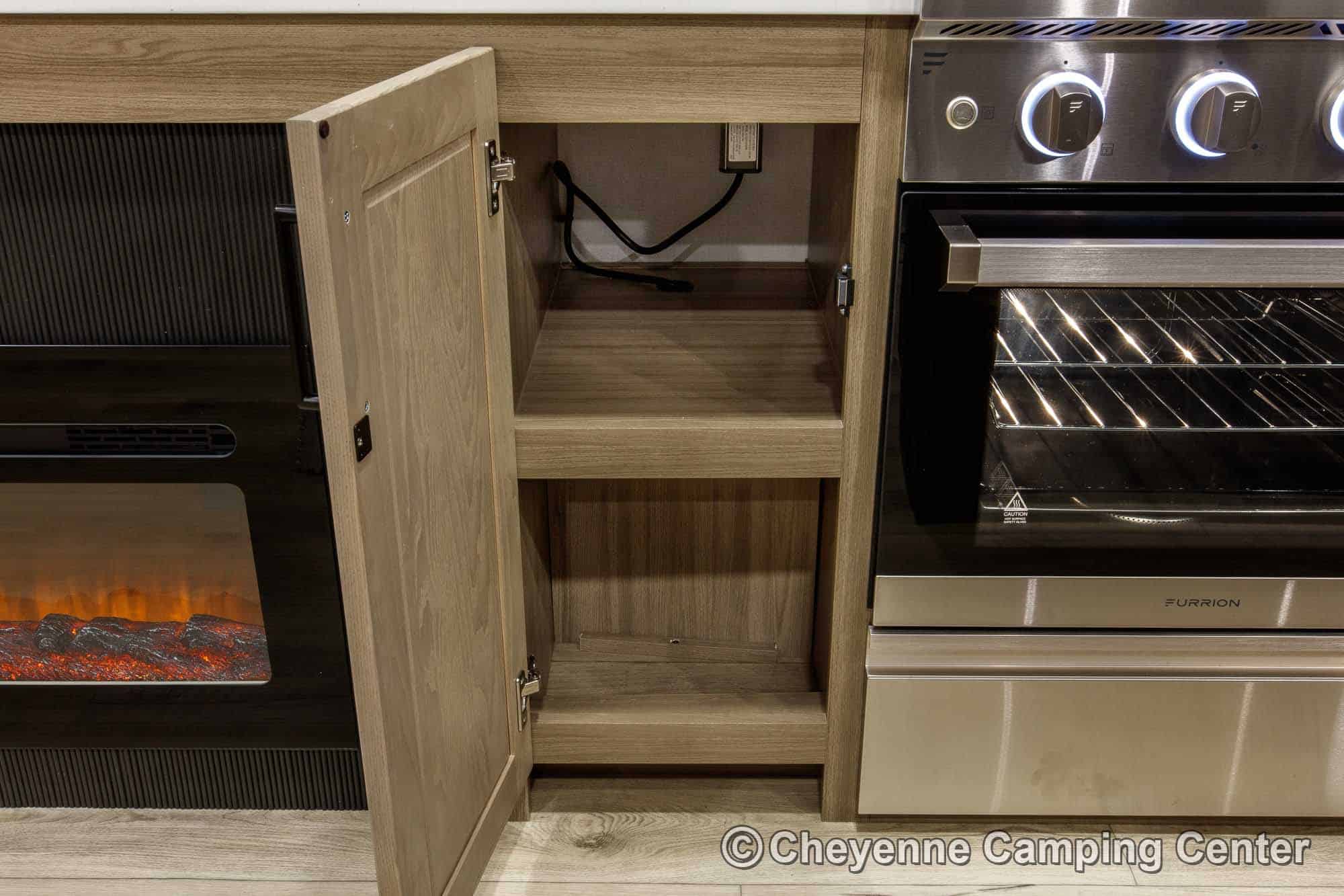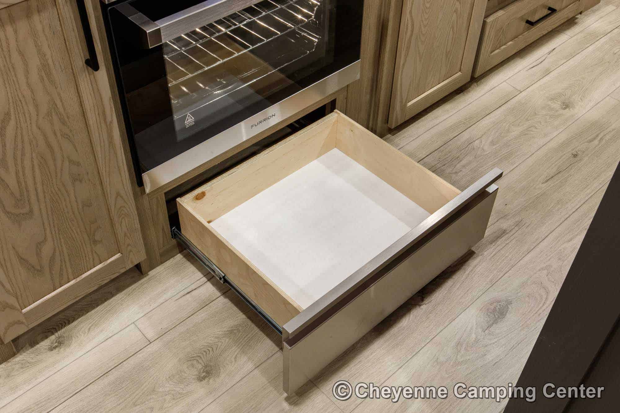 You’ll feel right at home in the spacious front bedroom. It features a king bed with storage drawers under, a 2nd 15K BTU air conditioner, HD TV, large wardrobe with washer/dryer prep, front counter with cabinets under.