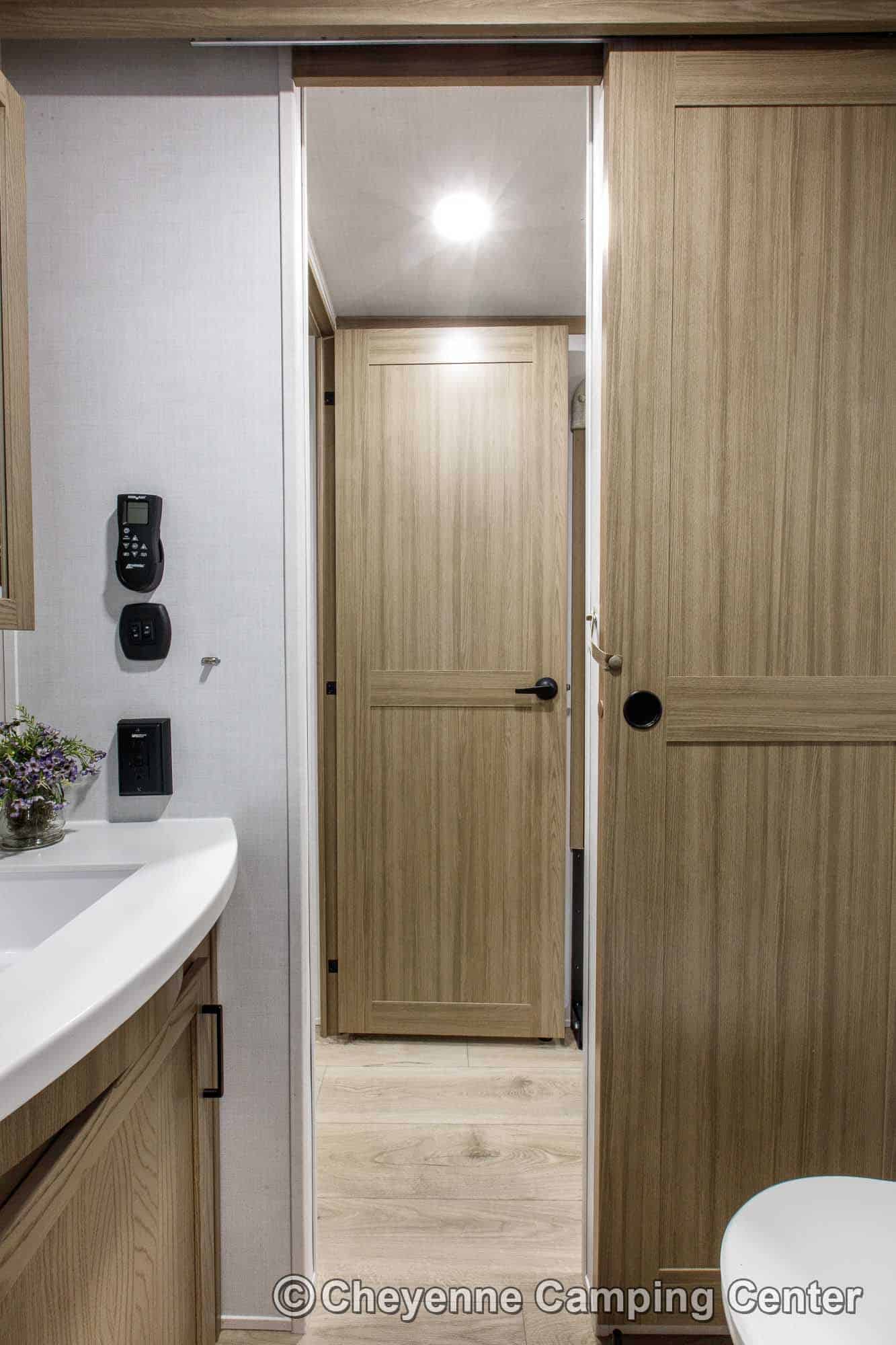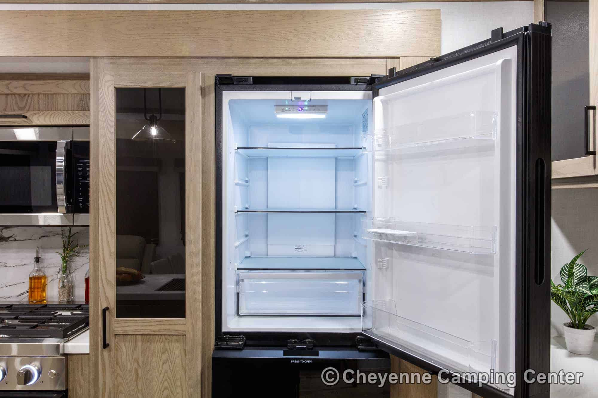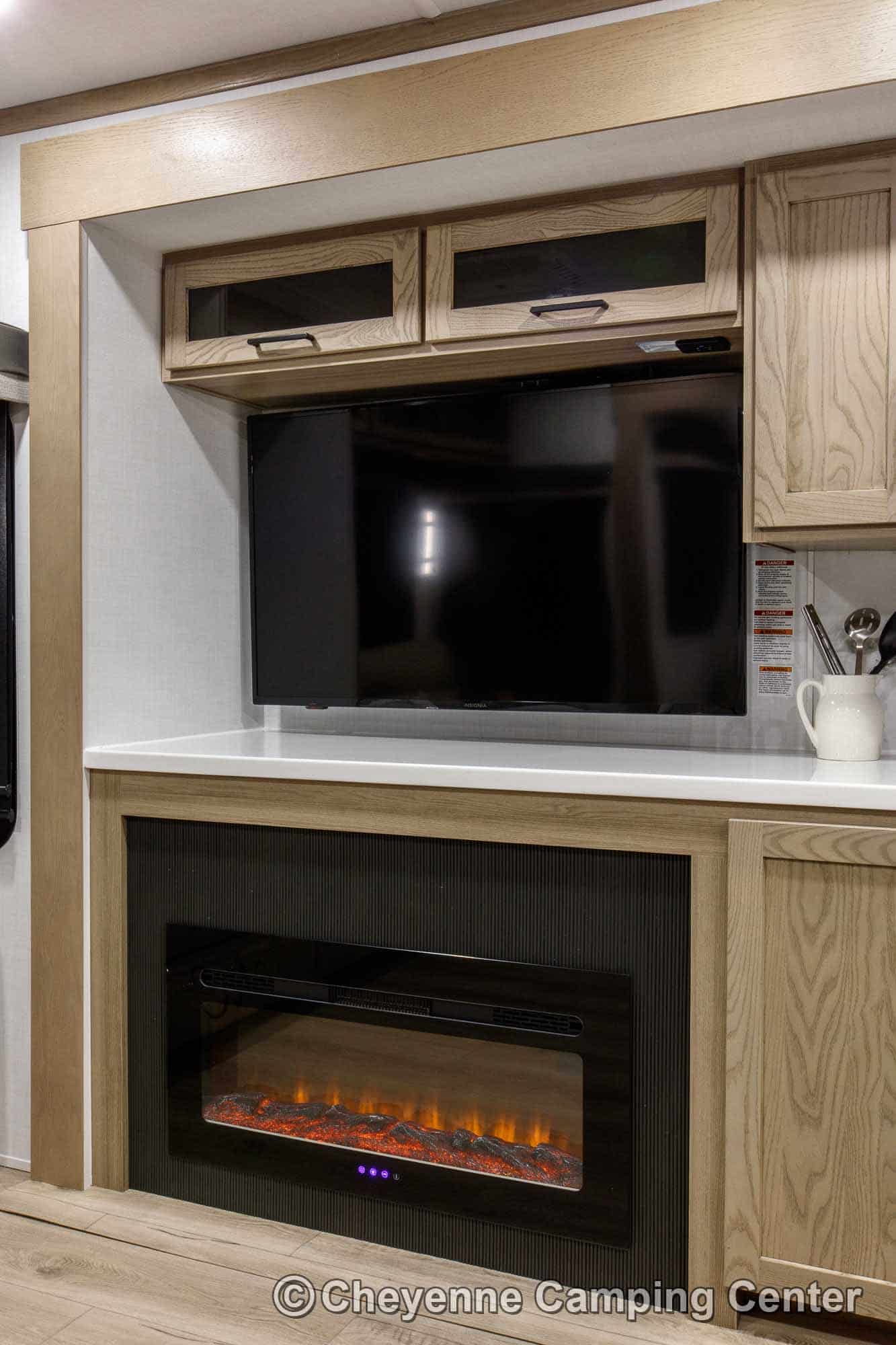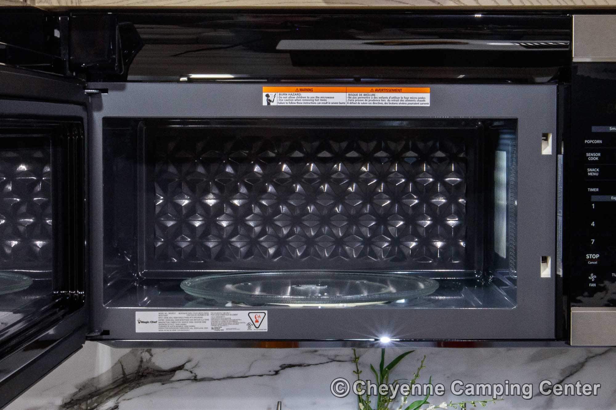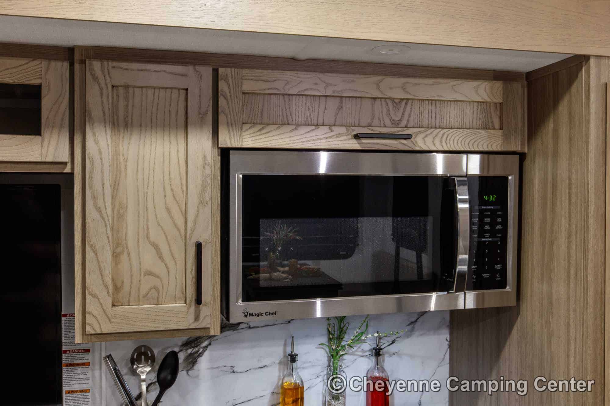 You’ll feel right at home in the spacious front bedroom. It features a king bed with storage drawers under, a 2nd 15K BTU air conditioner, HD TV, large wardrobe with washer/dryer prep, front counter with cabinets under.