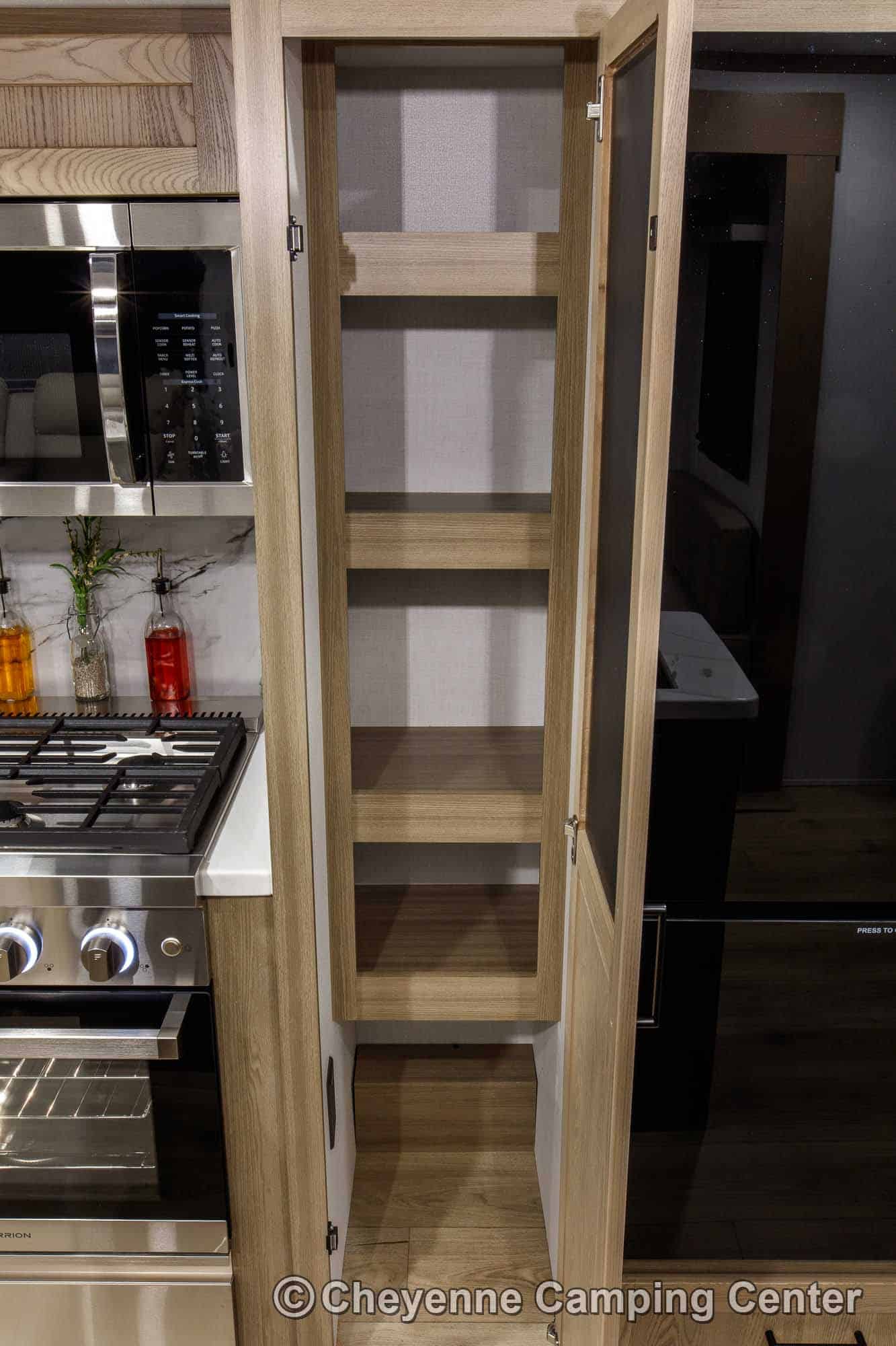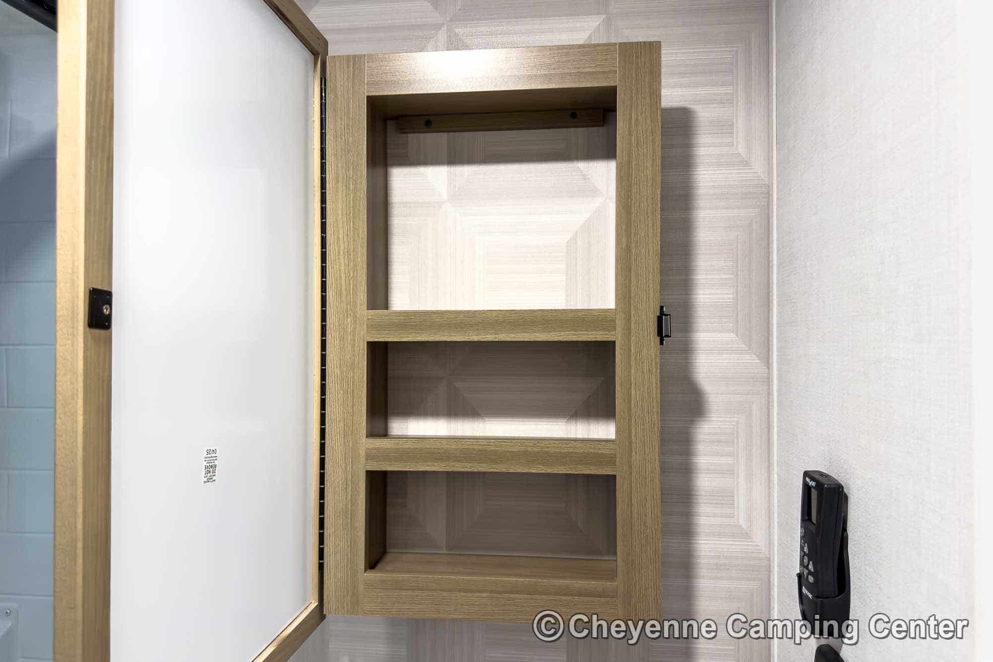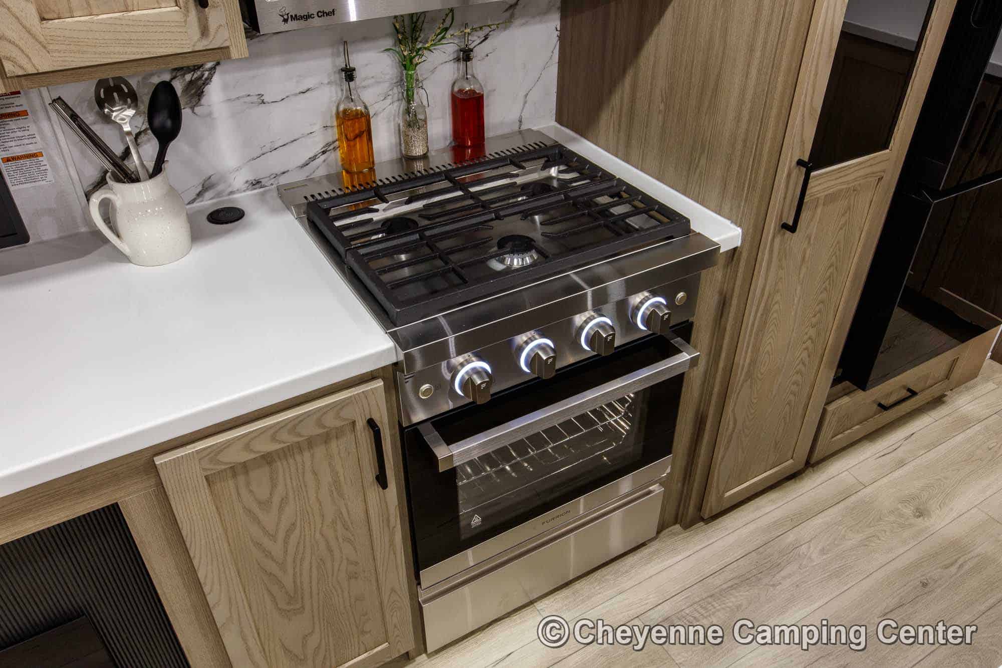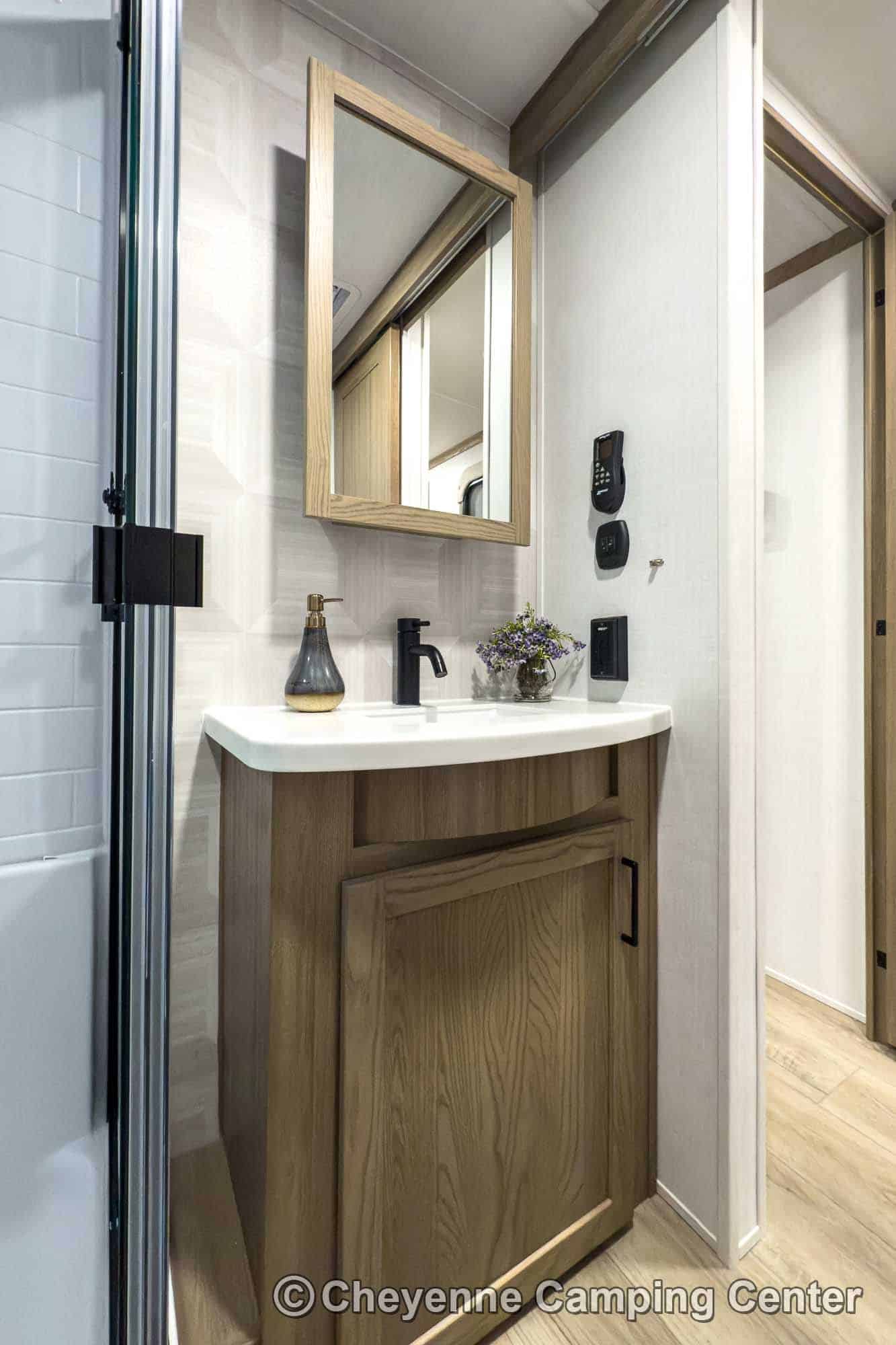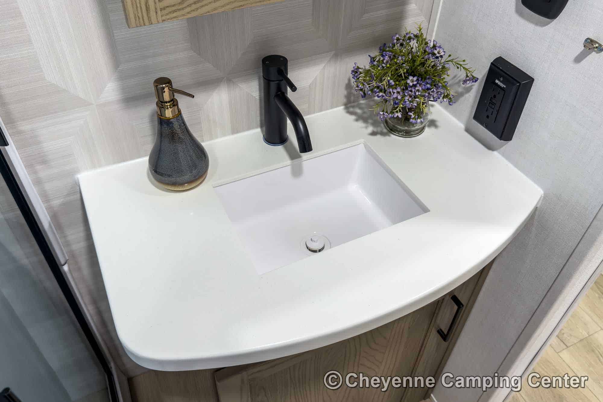 You’ll feel right at home in the spacious front bedroom. It features a king bed with storage drawers under, a 2nd 15K BTU air conditioner, HD TV, large wardrobe with washer/dryer prep, front counter with cabinets under.
