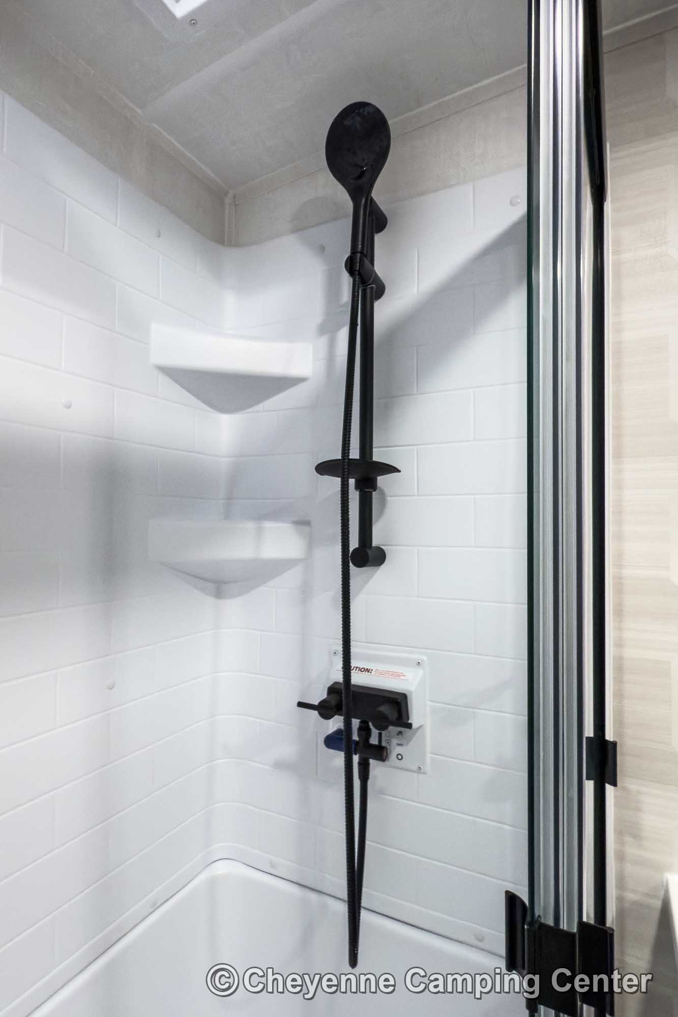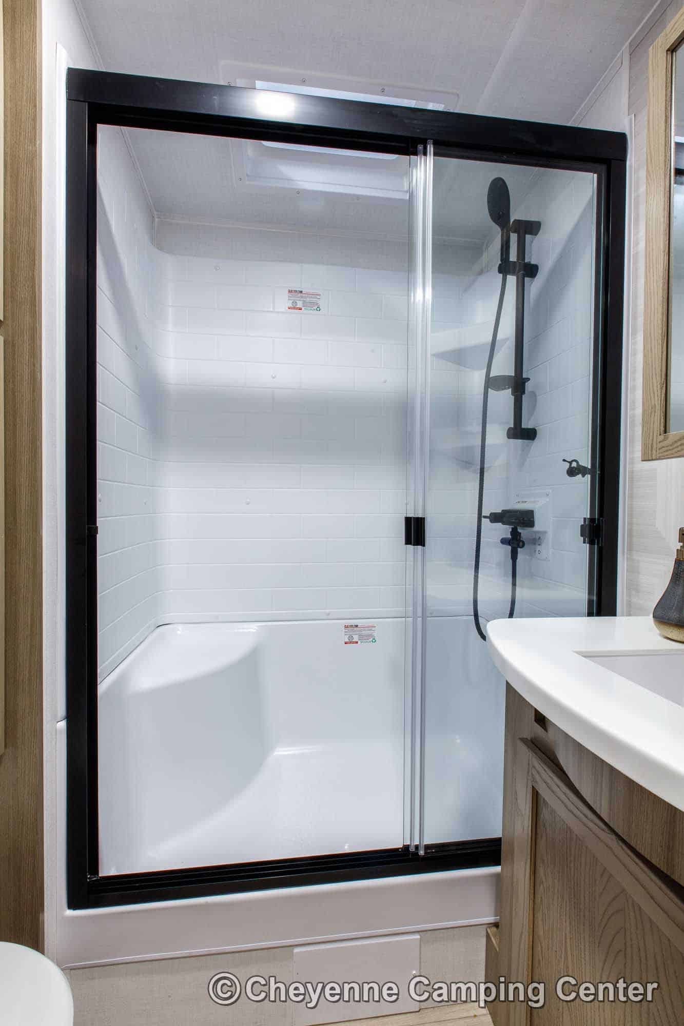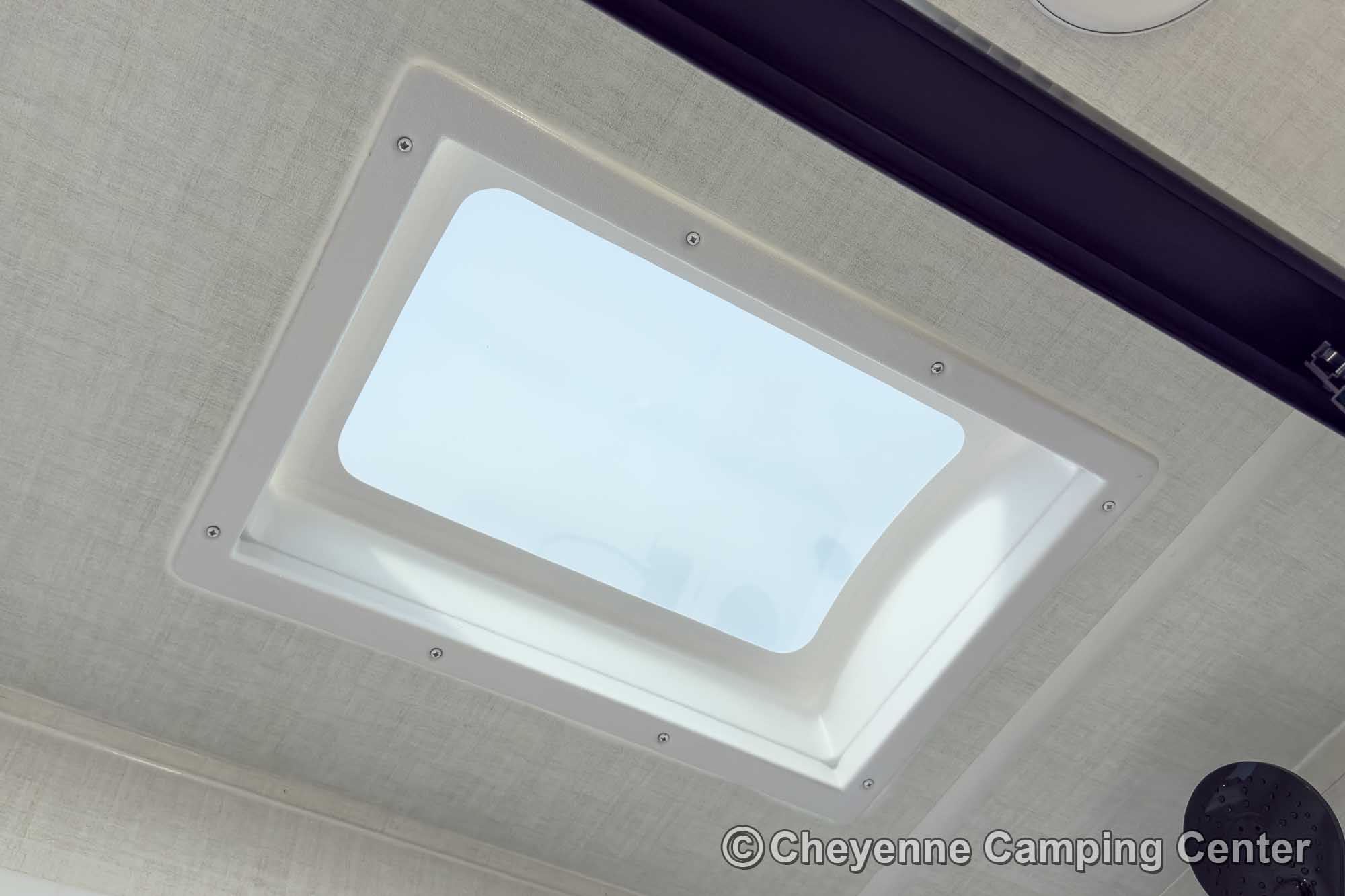 The bathroom includes a large glass enclosed shower with seat, premium shower fixture and skylight, medicine cabinet, linen closet, porcelain bowl foot flush toilet and Maxxair vent fan with remote.