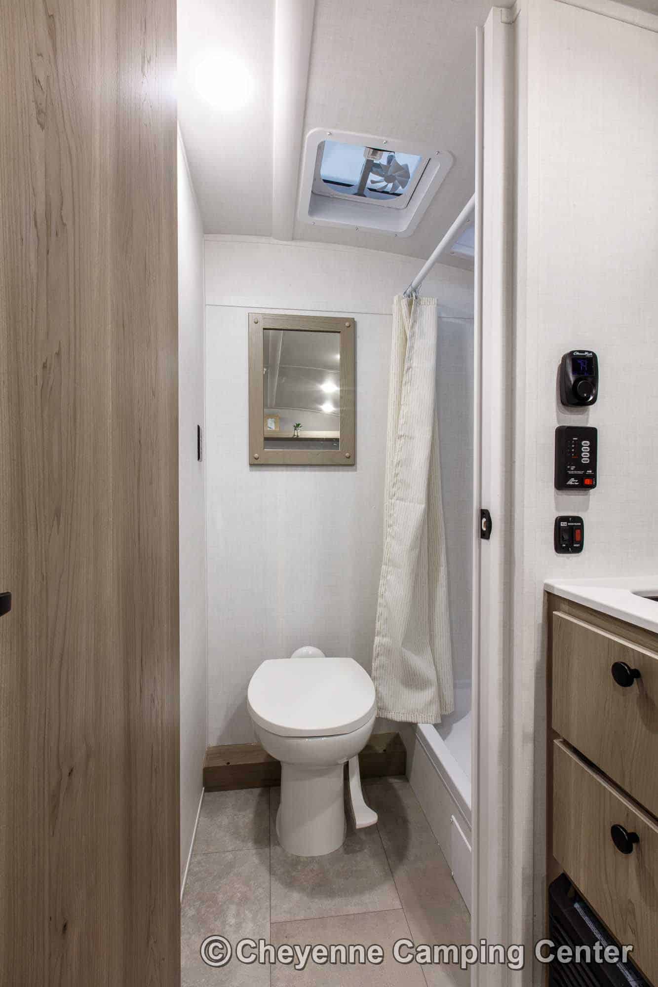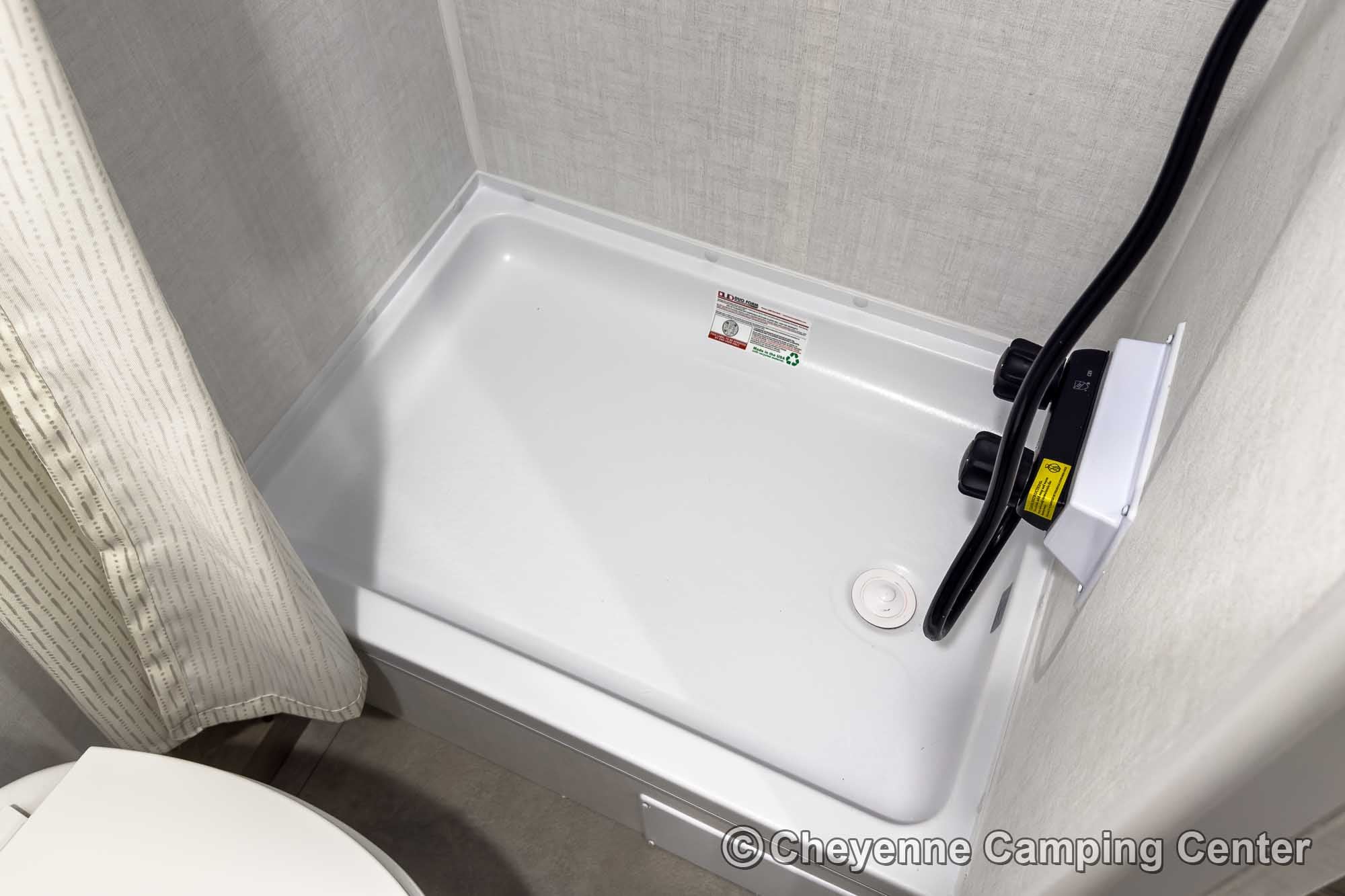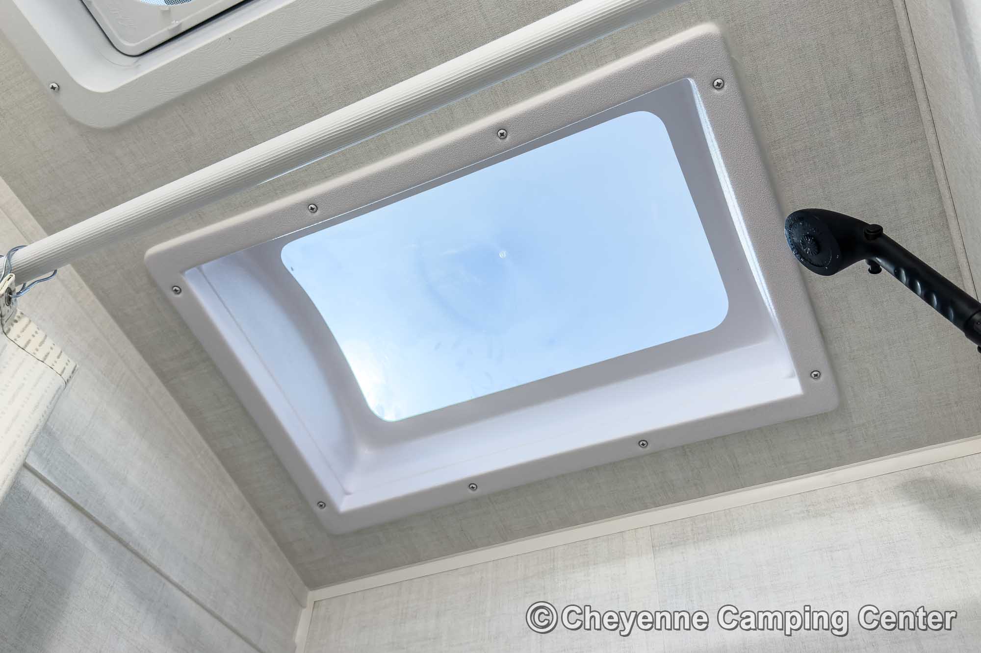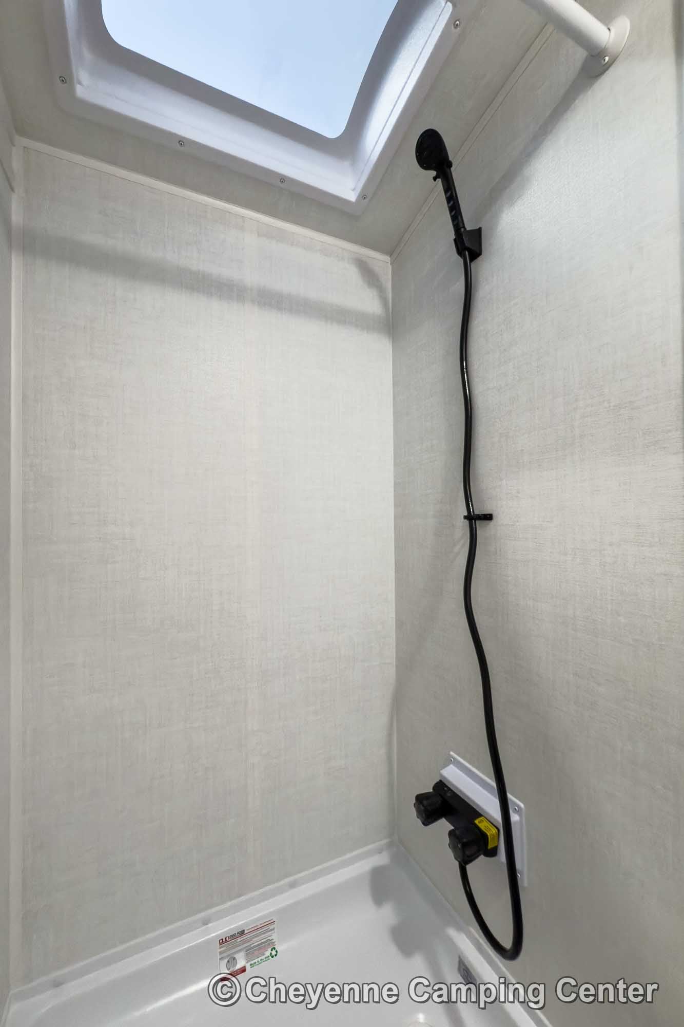 Inside, you’ll find a comfortable front bed and a functional mid-kitchen with a microwave, gas cooktop, refrigerator, sink, and residential-style faucet. The bathroom includes a shower with a skylight, a vent fan, and a foot-flush toilet for comfort on the road.