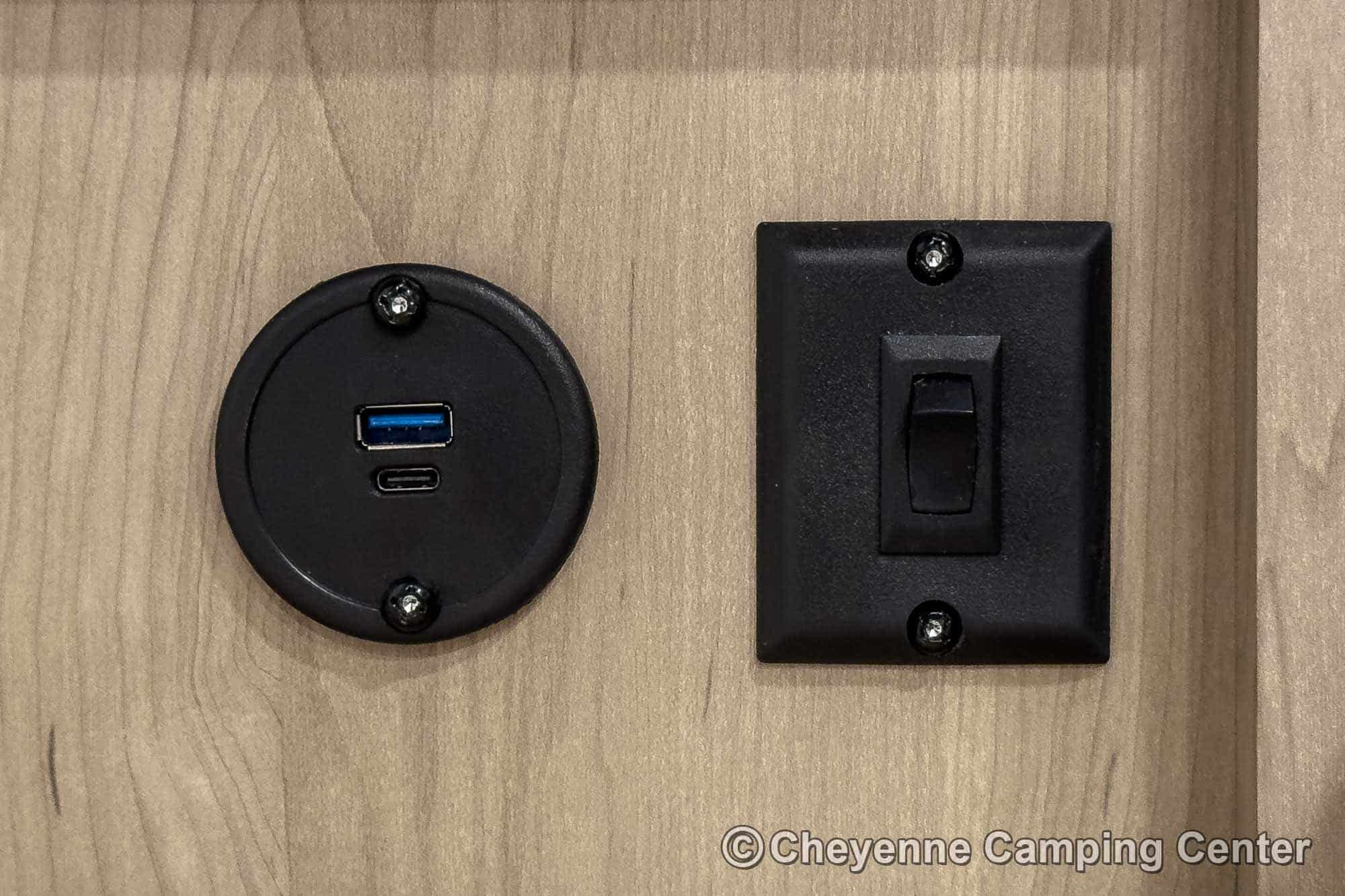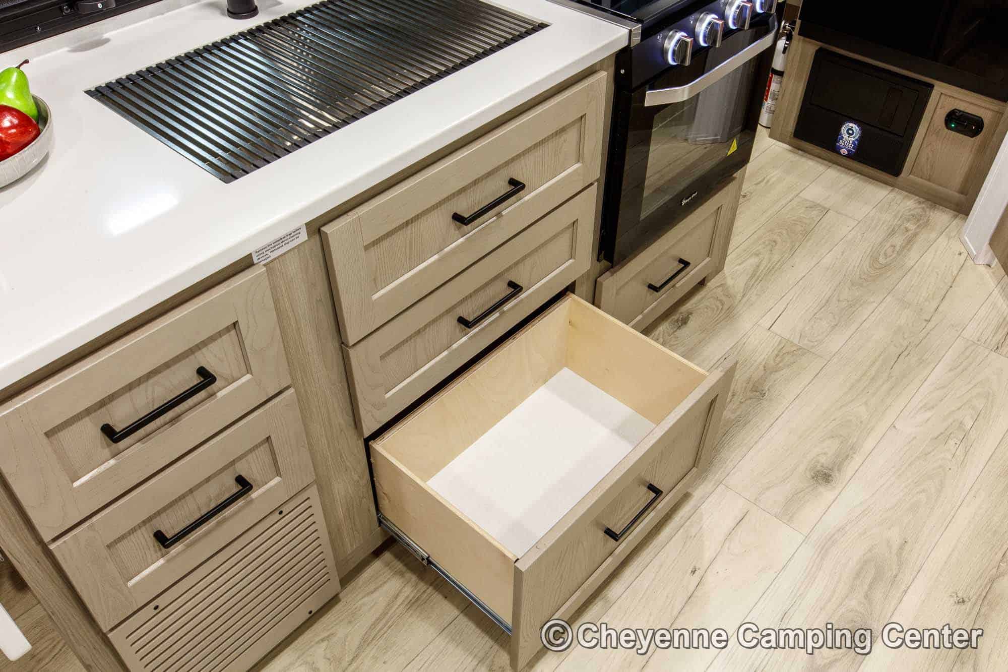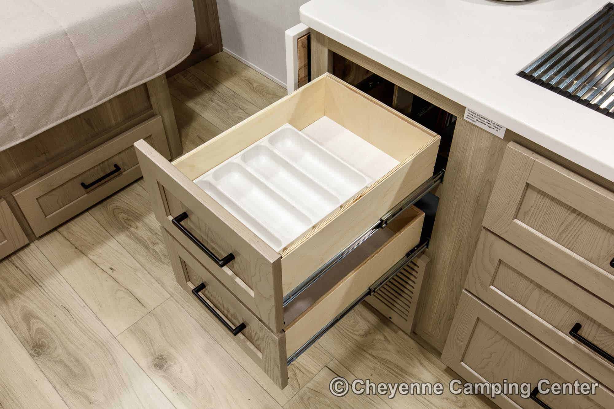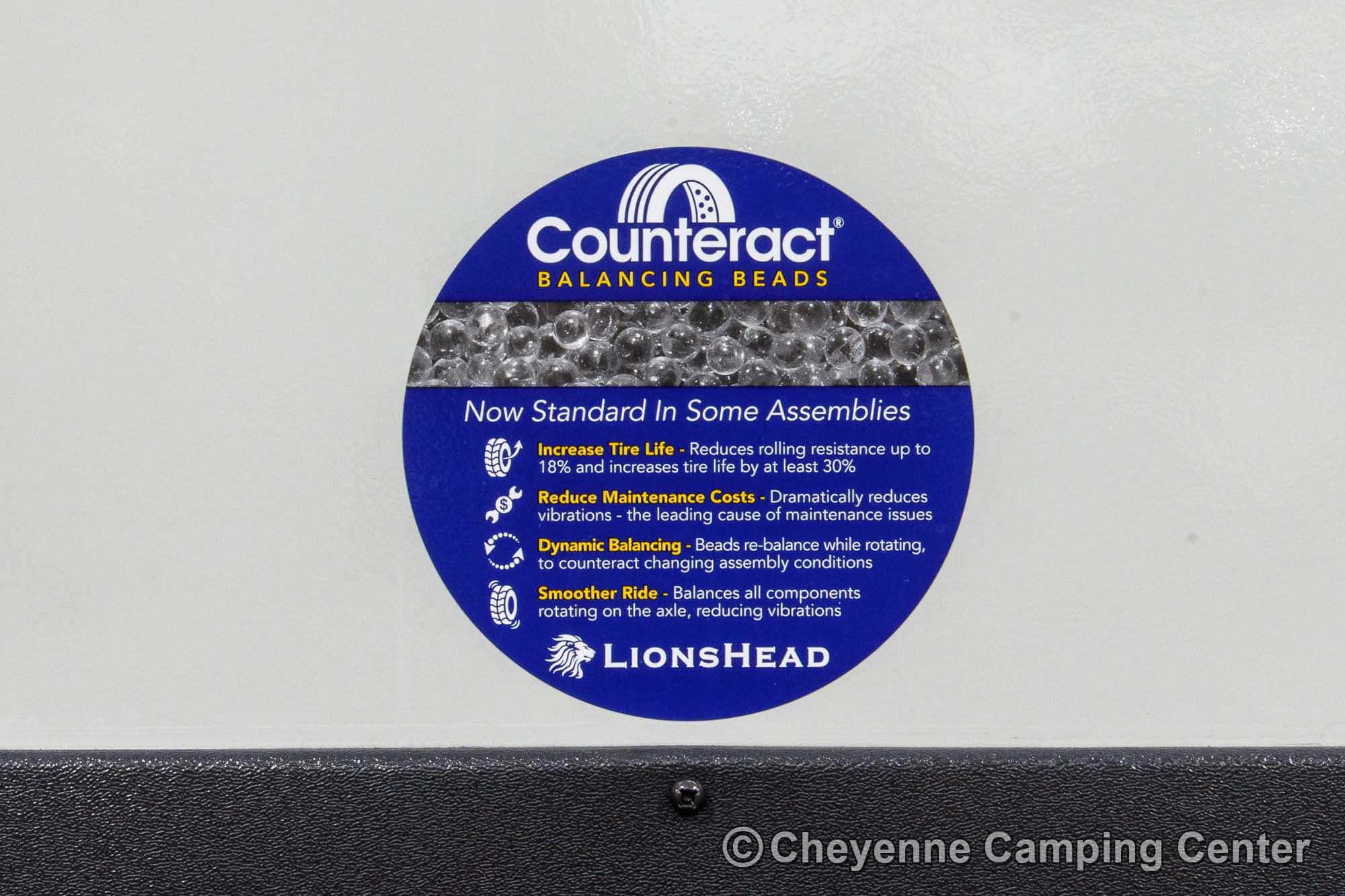 Outside, the Micro Lite 21FBRS features a 200-watt solar panel, power stabilizer jacks, a power tongue jack, marine grade speakers, a power awning with LED lighting, dual 30 lb. LP tanks, black tank flush, shower fixture, spare tire, rear ladder, MORryde Step Above entry steps, pass-thru storage compartment, enclosed underbelly with heated tanks, frameless windows, front window, aluminum wheels, Goodyear Endurance tires, a tire pressure monitoring system, and torsion axle suspension for a safe and superior ride.