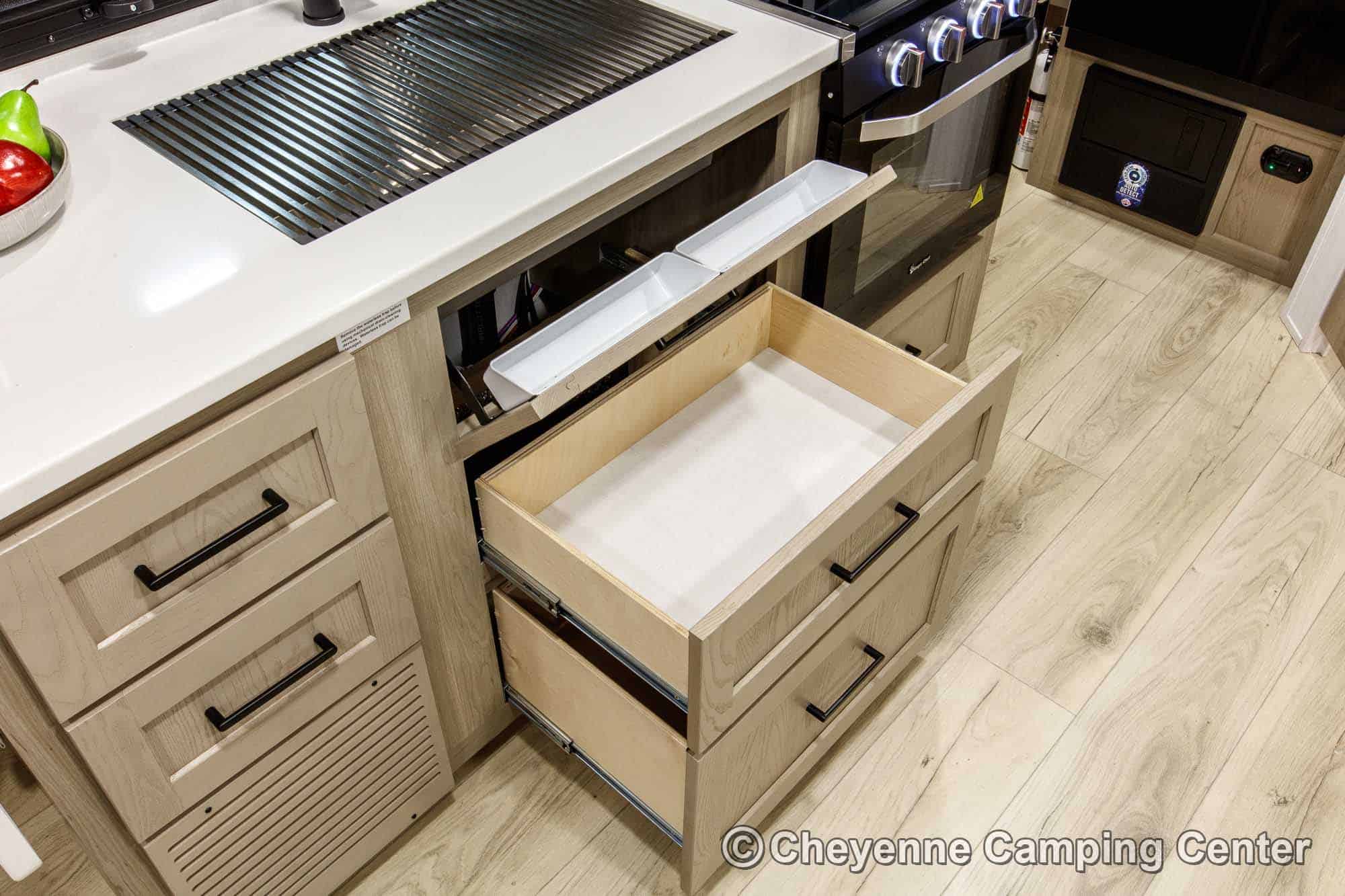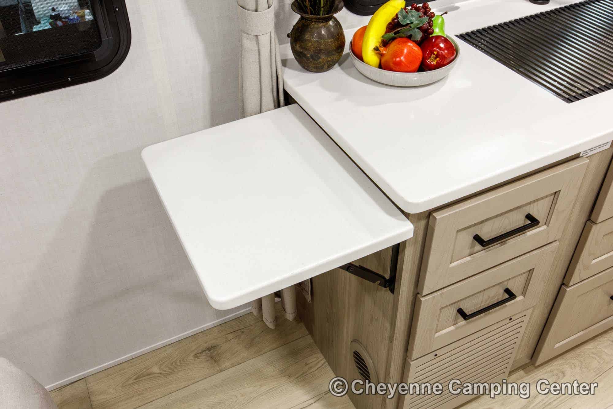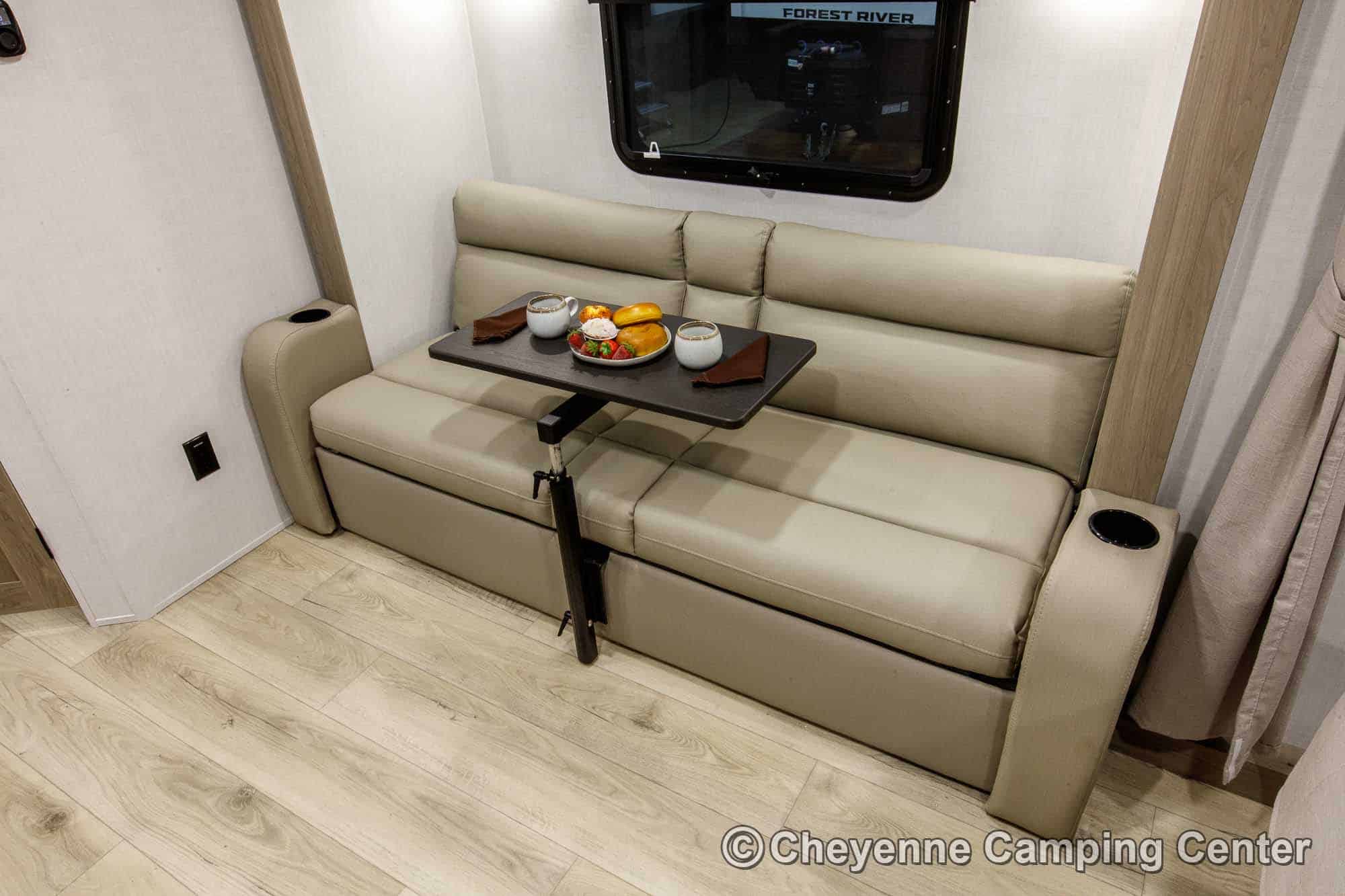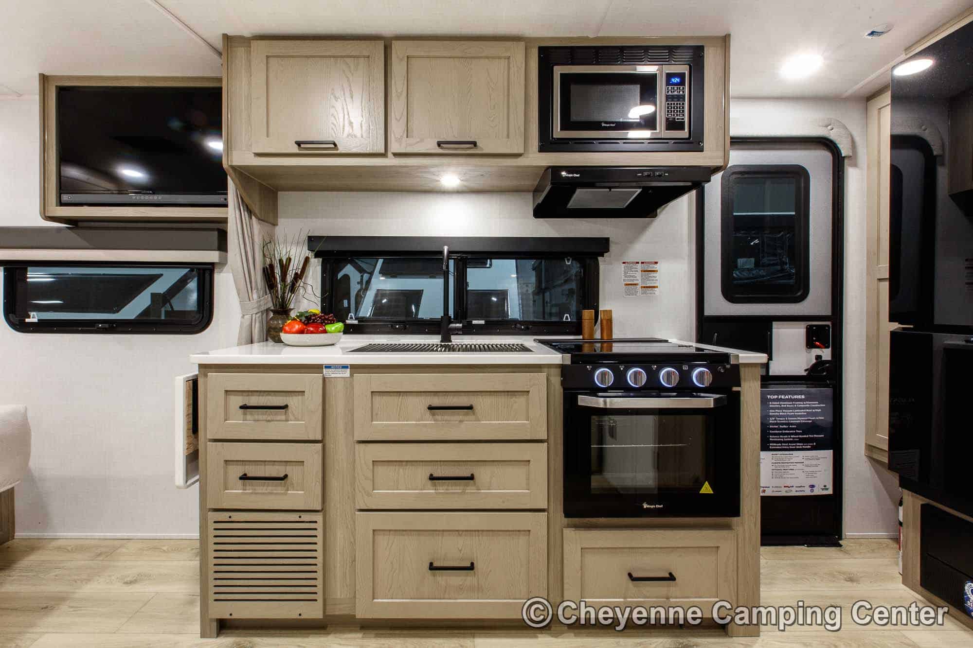 The living area features a convertible sofa with an adjustable table and a 12V smart TV. The kitchen includes a spacious 12V refrigerator with a dual swing door, a high-output gas range with 21″ oven, a microwave, solid surface countertop with extension, large under-mount stainless sink with residential faucet, and ample storage, including a pantry.