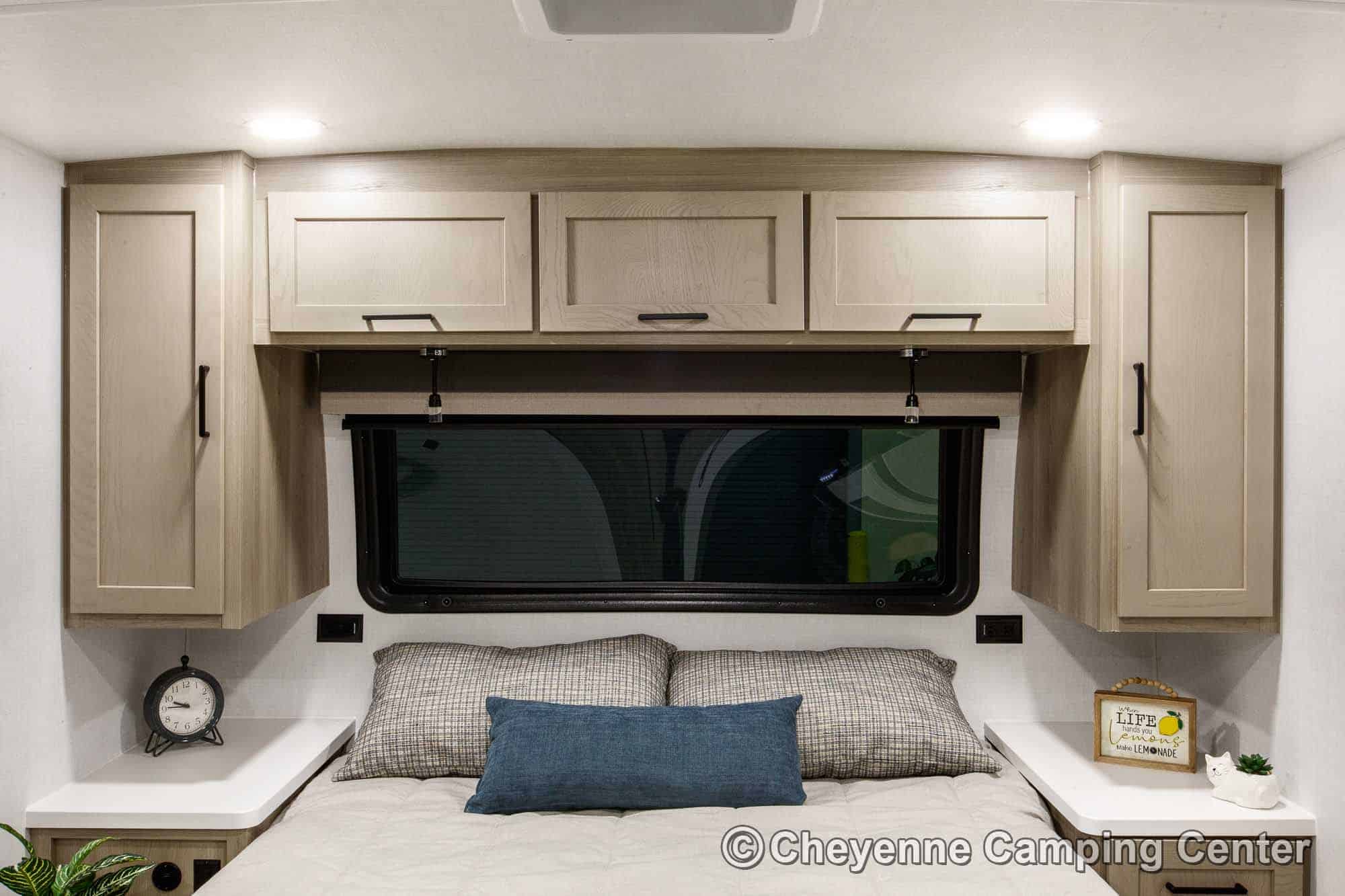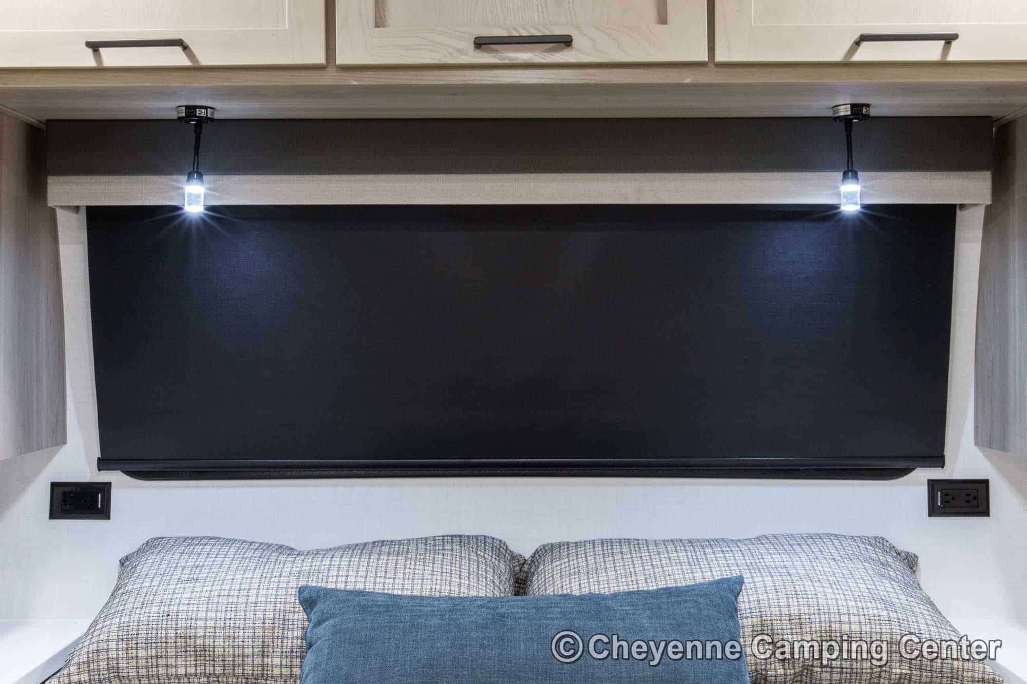 The queen bedroom includes under-bed storage, reading lights, privacy curtain, overhead cabinets, and wardrobe closets.