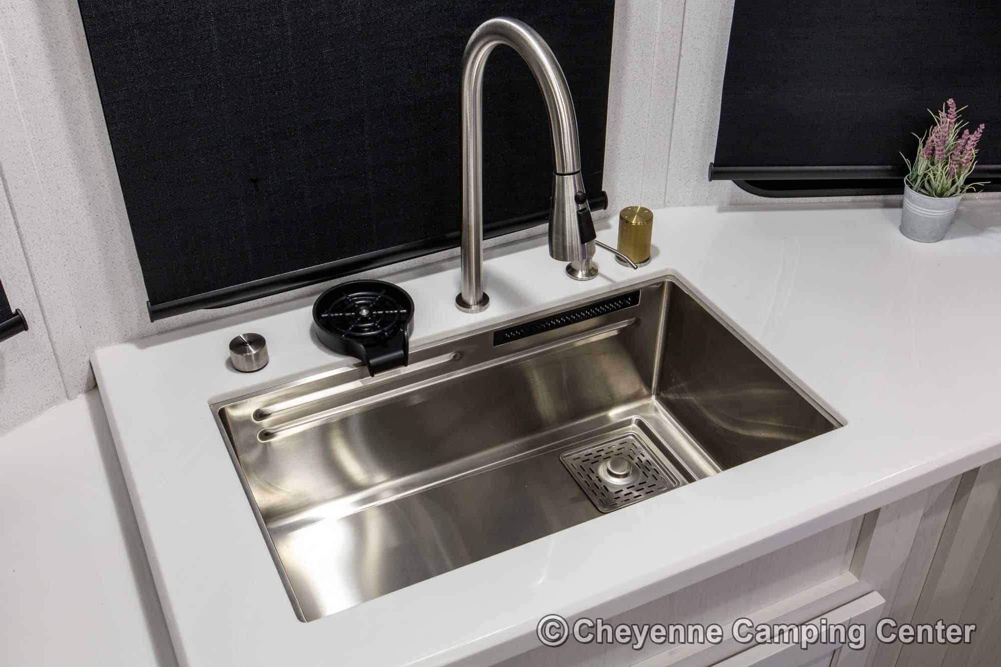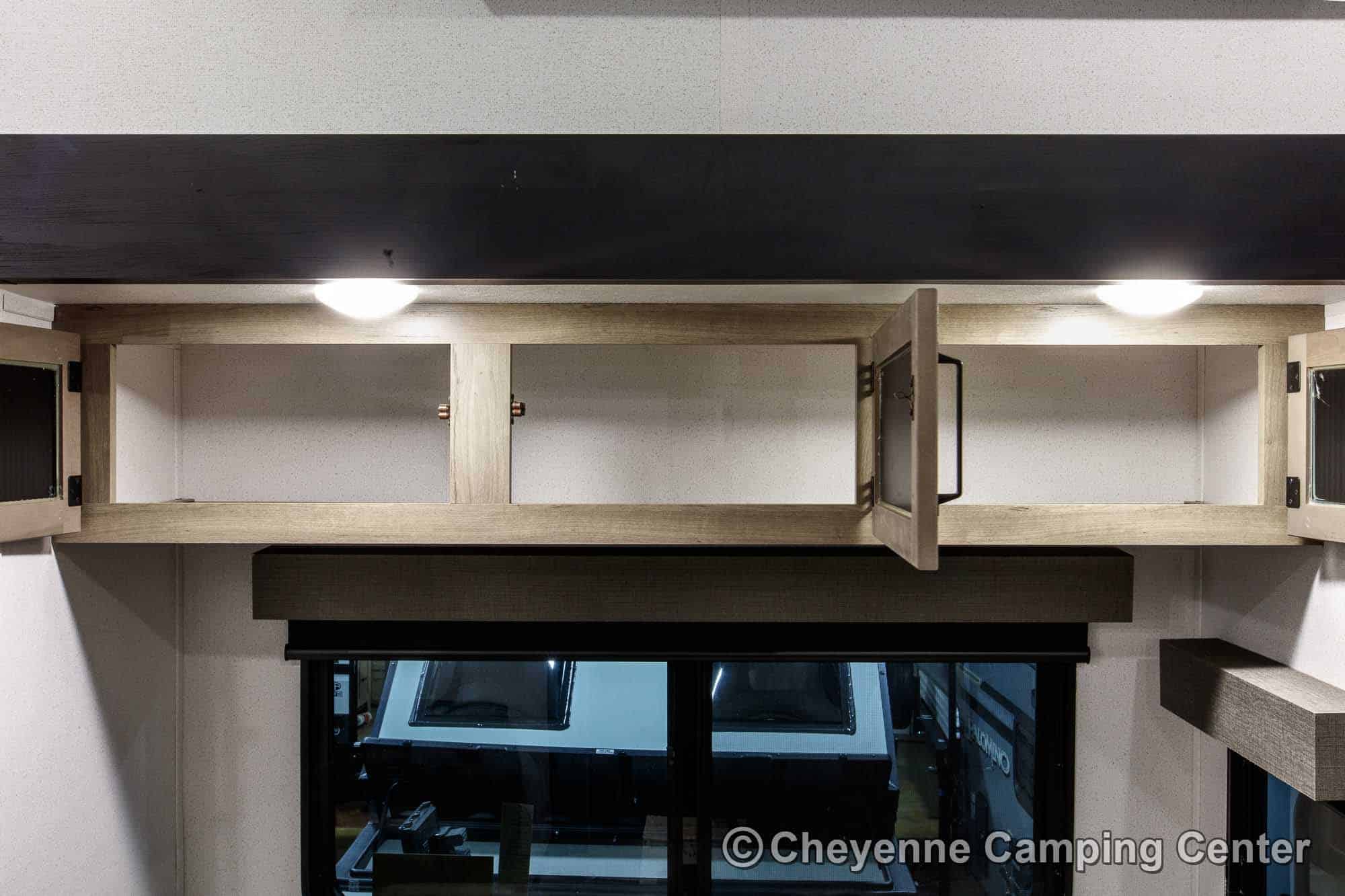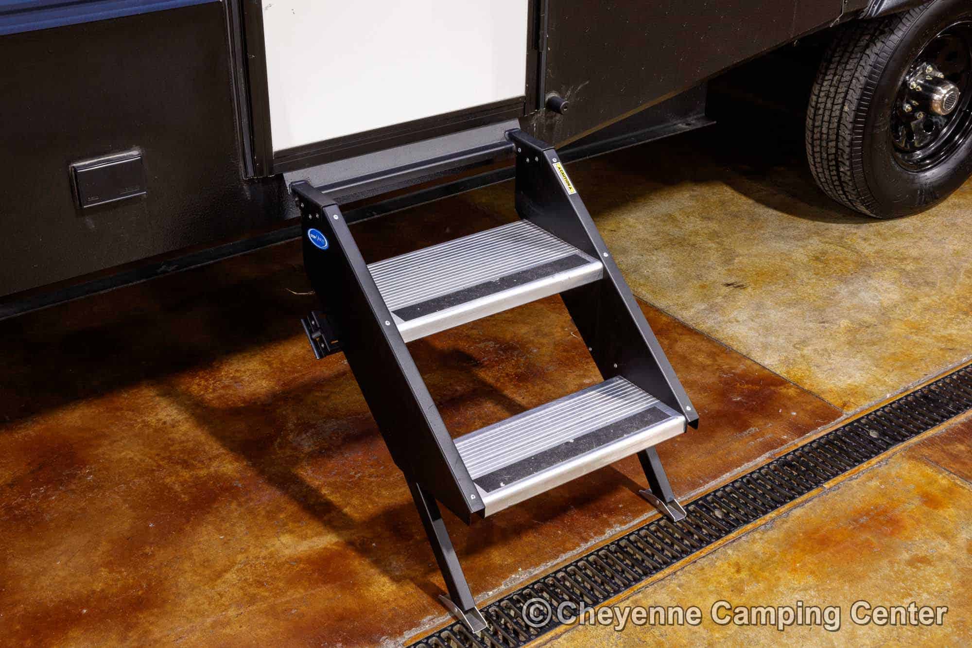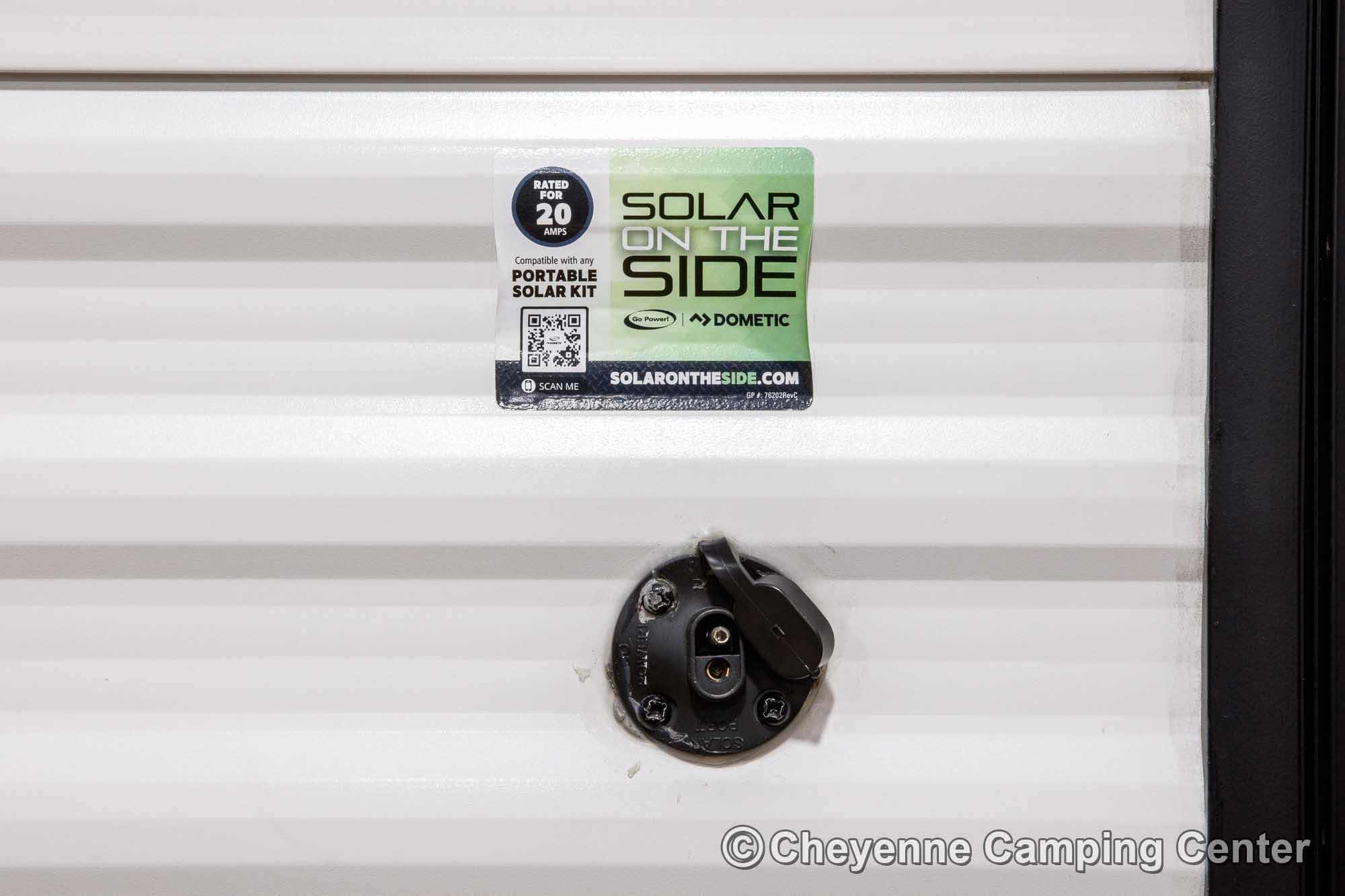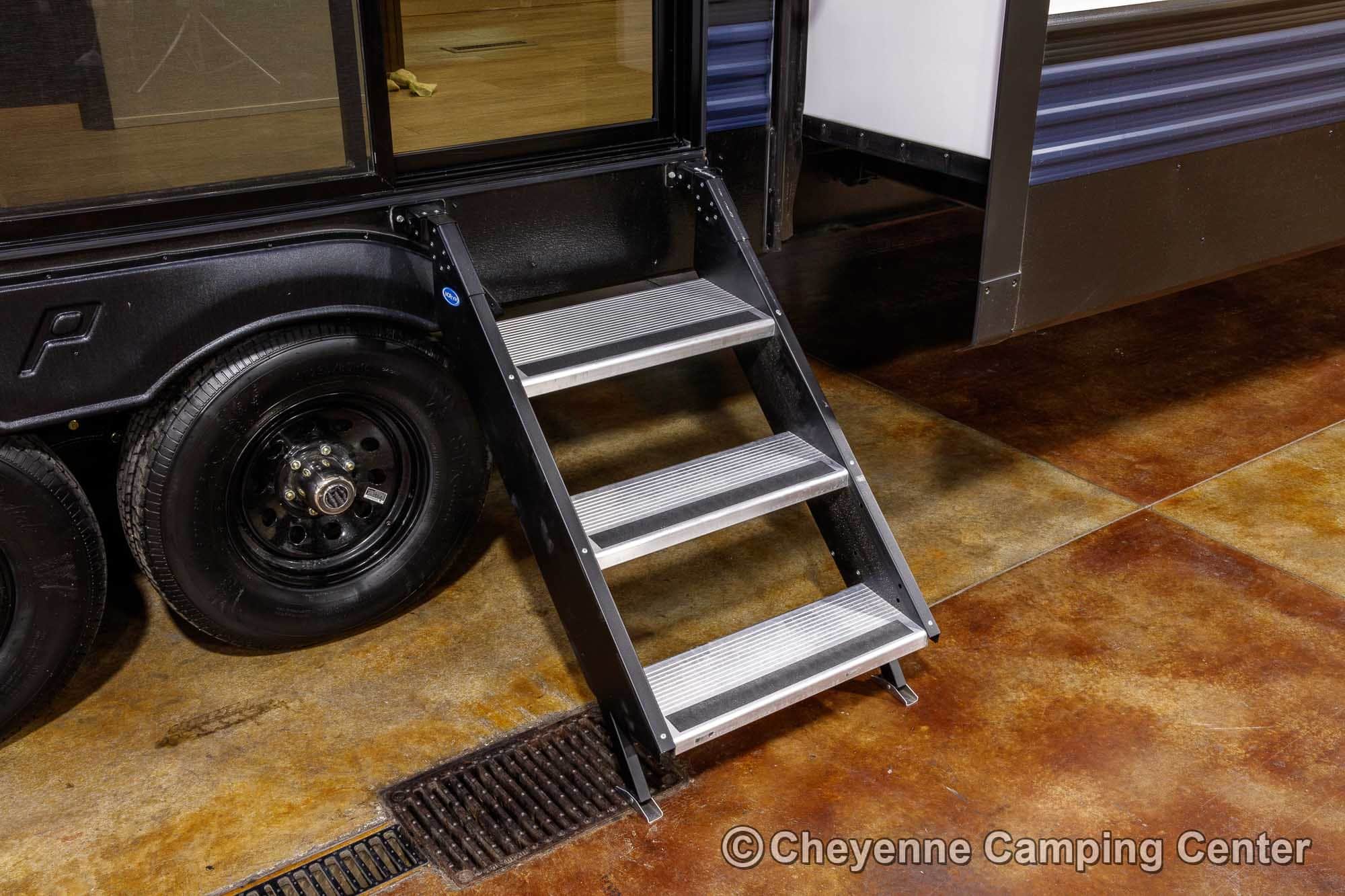 Outside, you’ll have a 20′ power awning, a sliding entry door, premium MORryde entry steps, marine-grade stereo speakers, storage compartments, a black tank flush, hot/cold shower fixture, solar prep, a roof ladder, and an LP quick connect.