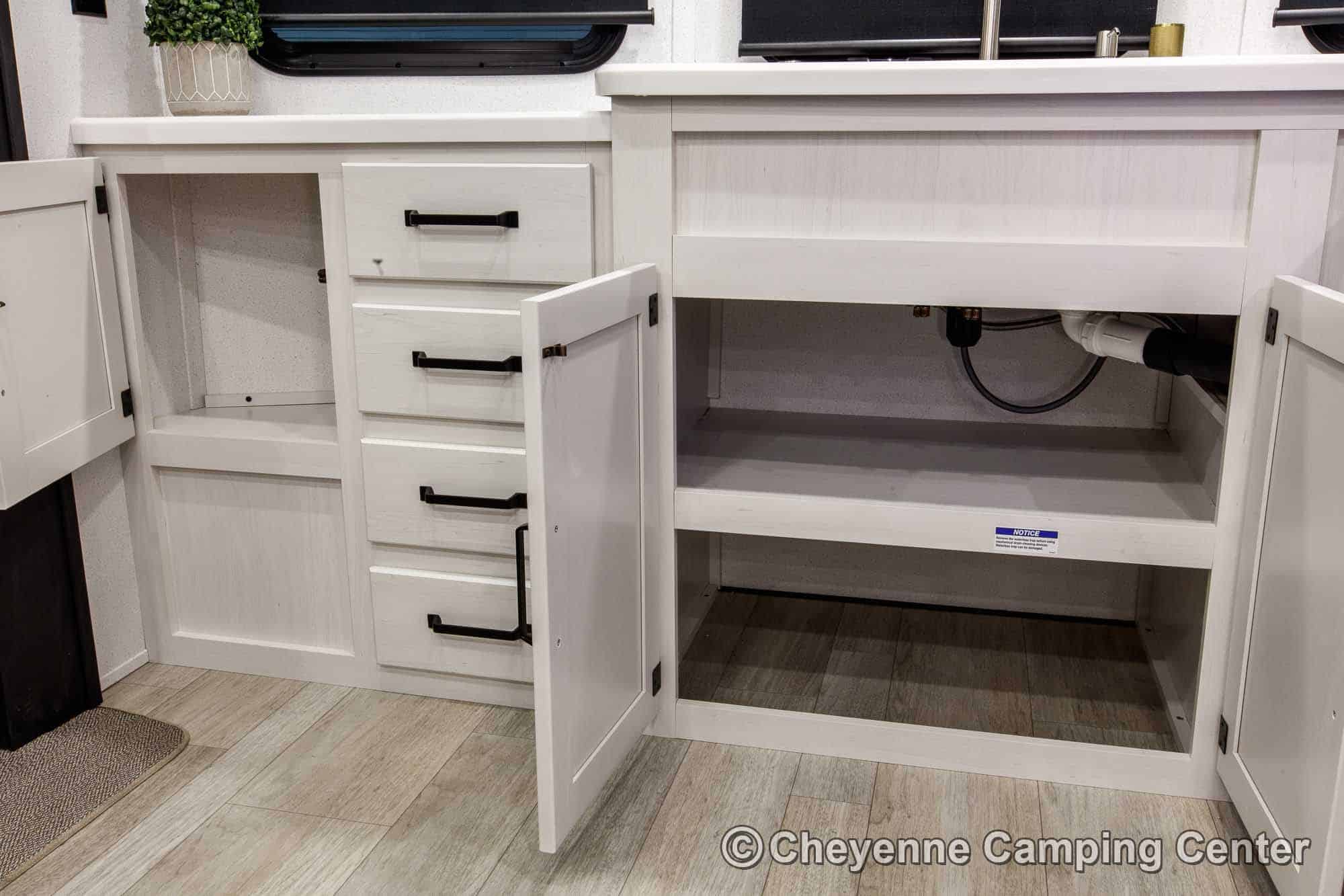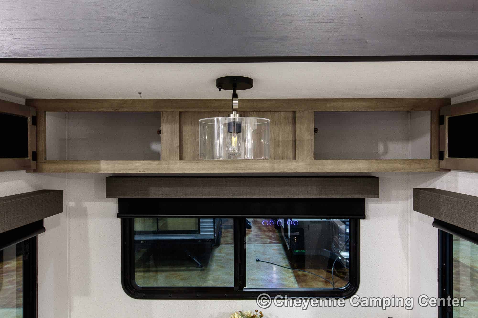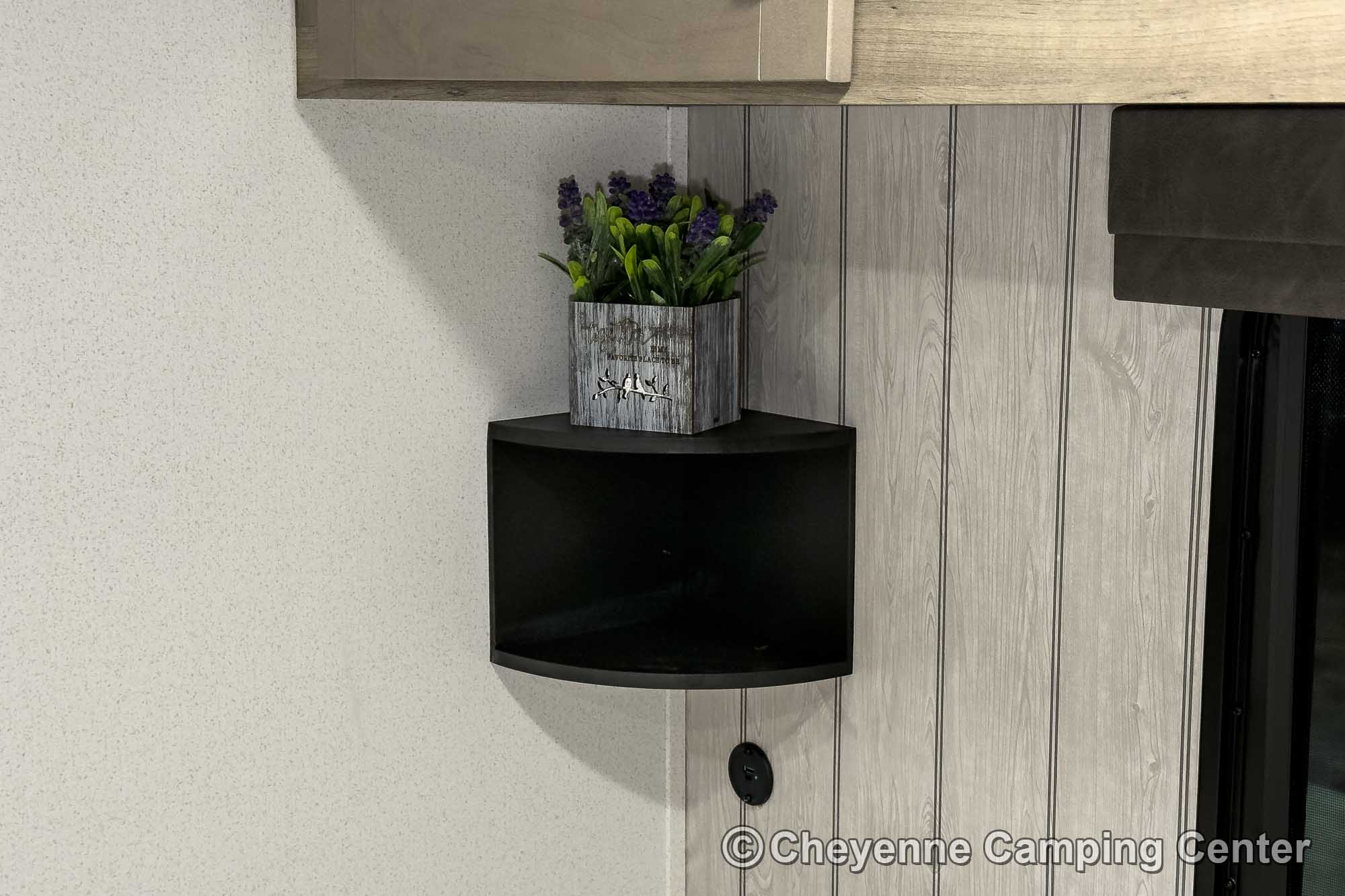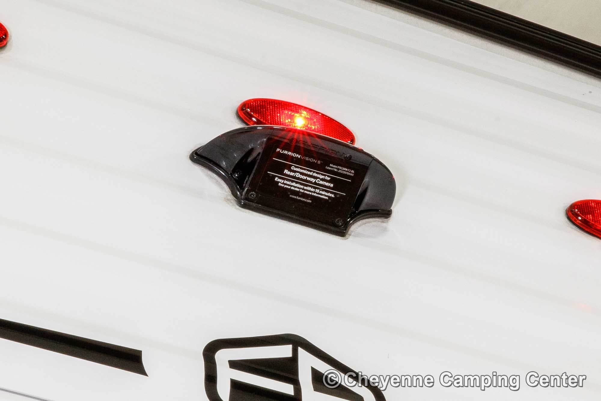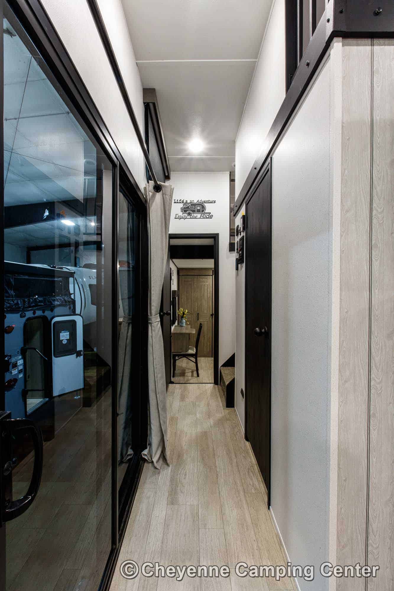 Outside, you’ll have a 20′ power awning, a sliding entry door, premium MORryde entry steps, marine-grade stereo speakers, storage compartments, a black tank flush, hot/cold shower fixture, solar prep, a roof ladder, and an LP quick connect.