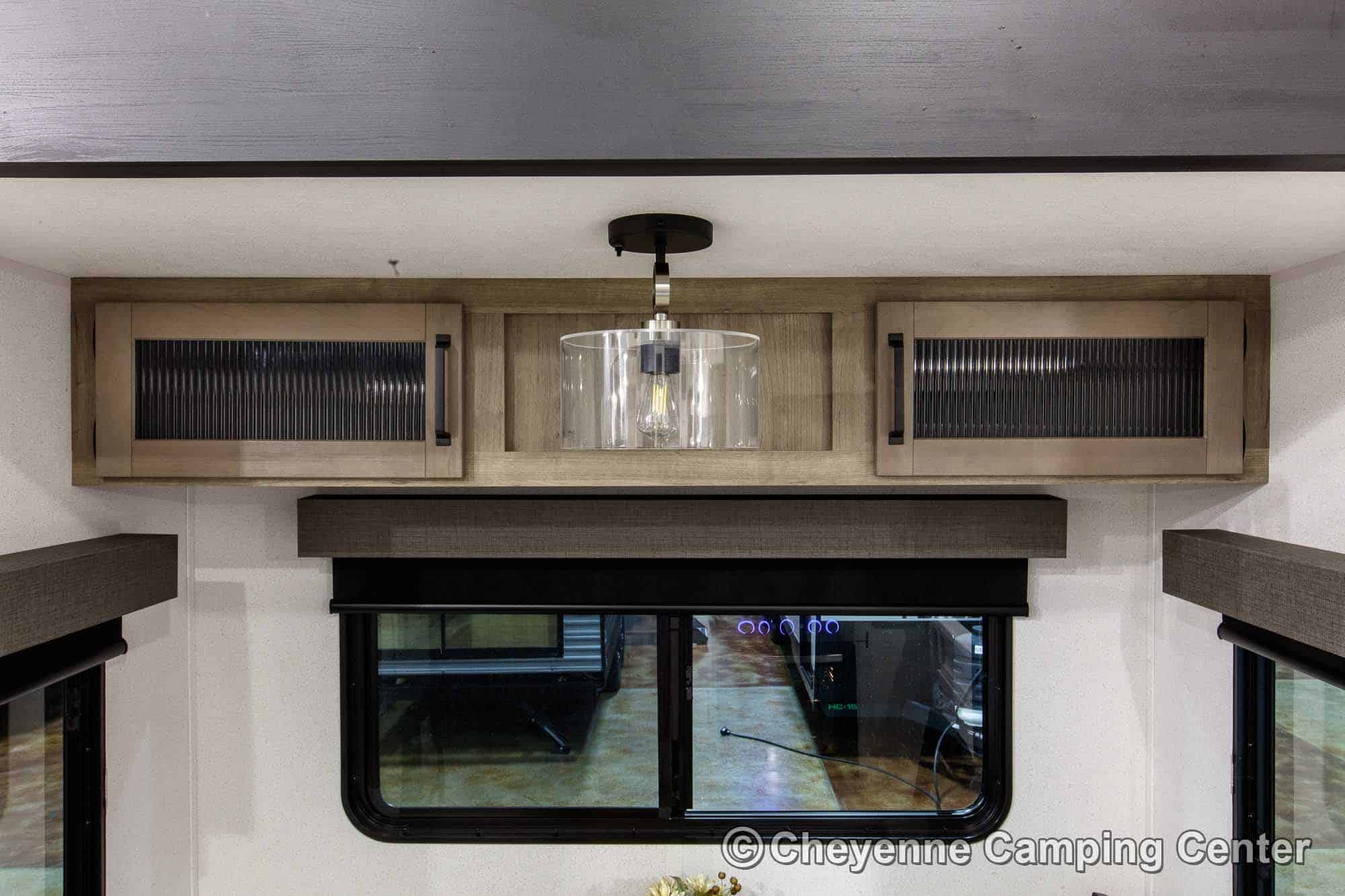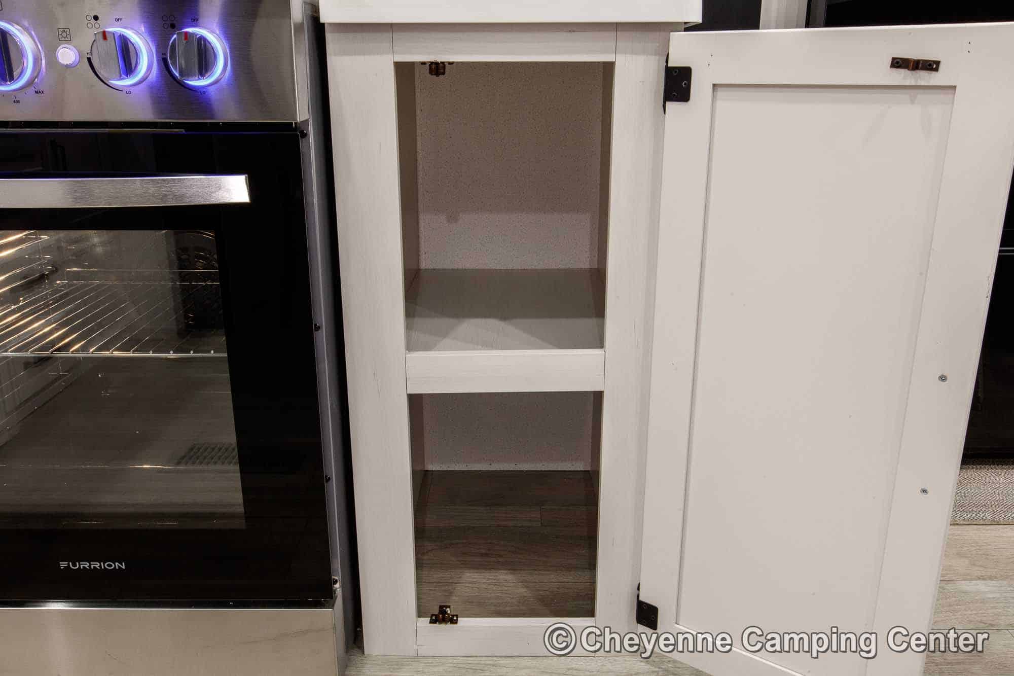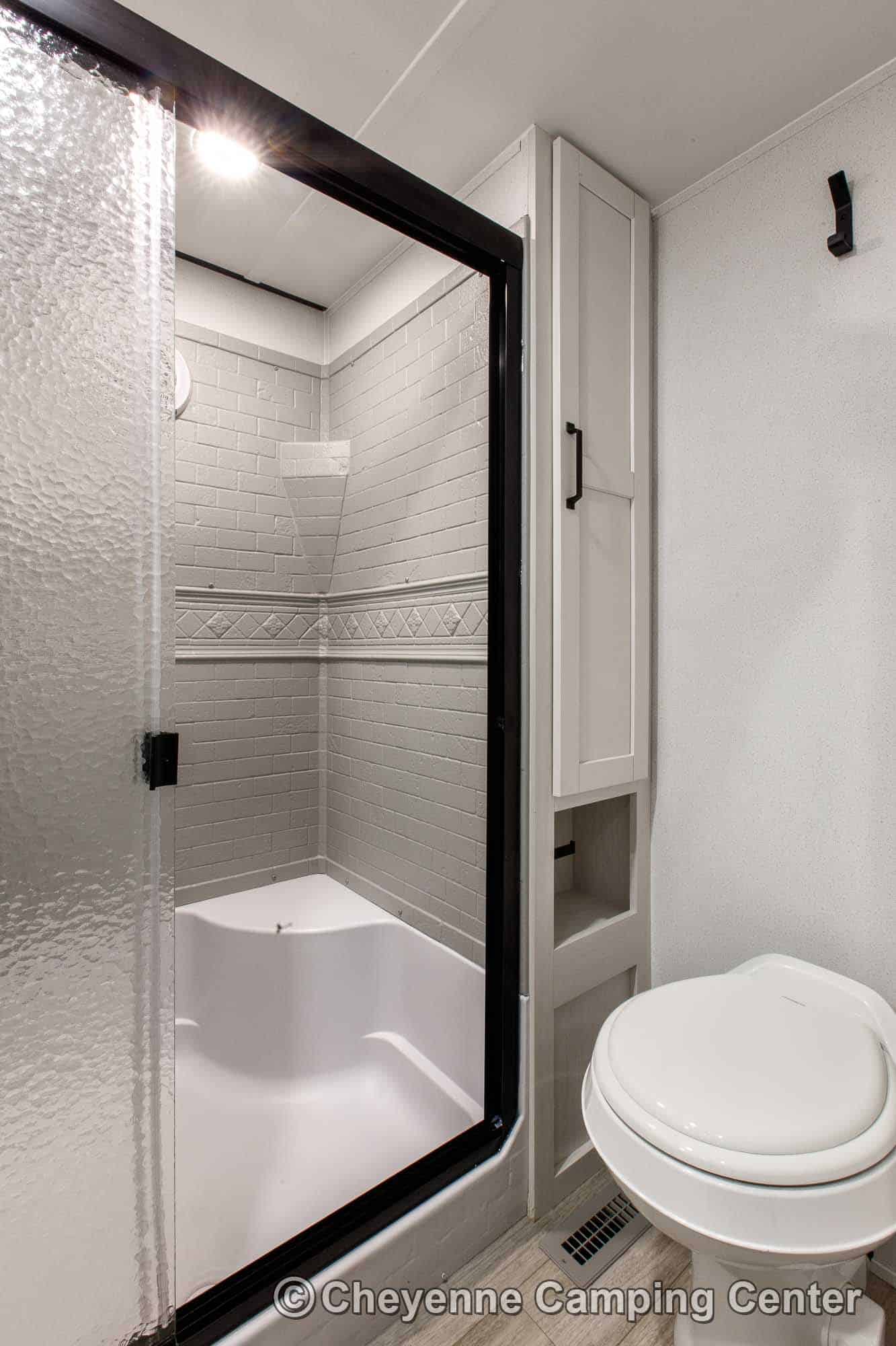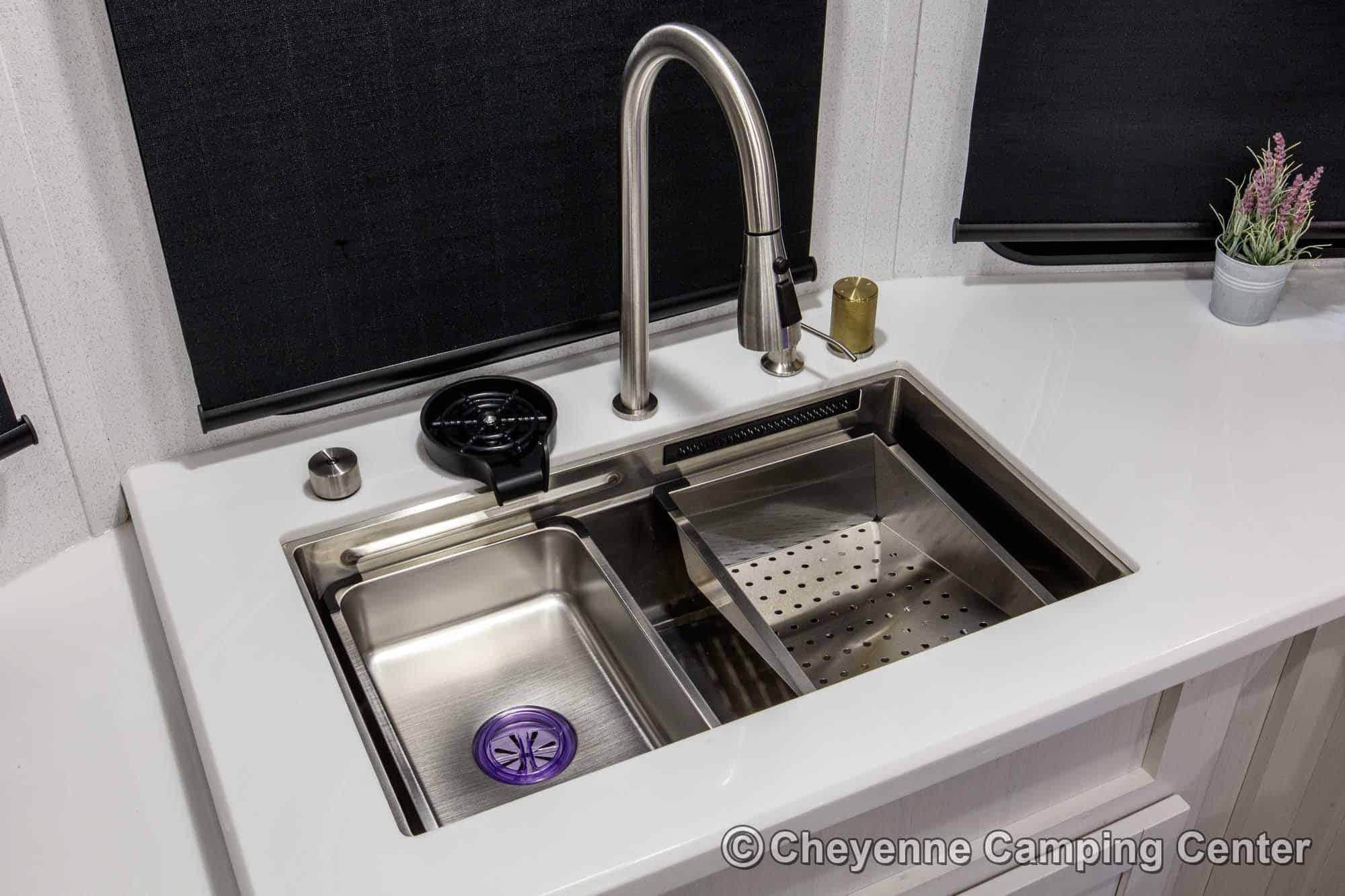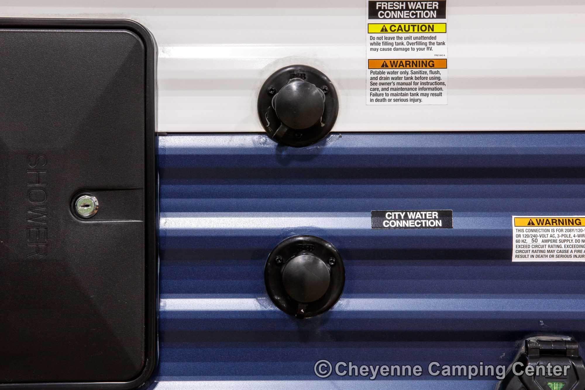 Outside, you’ll have a 20′ power awning, a sliding entry door, premium MORryde entry steps, marine-grade stereo speakers, storage compartments, a black tank flush, hot/cold shower fixture, solar prep, a roof ladder, and an LP quick connect.