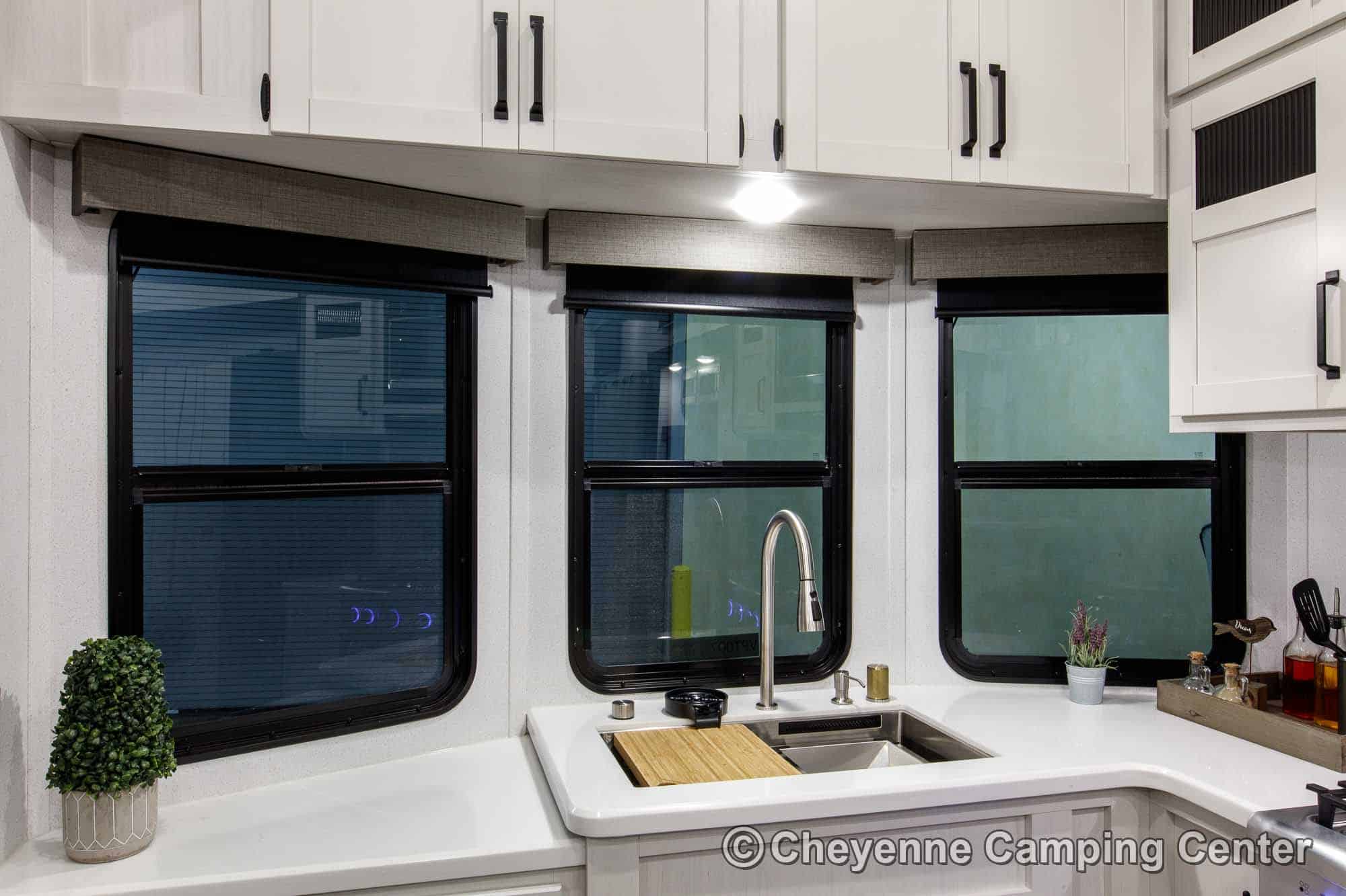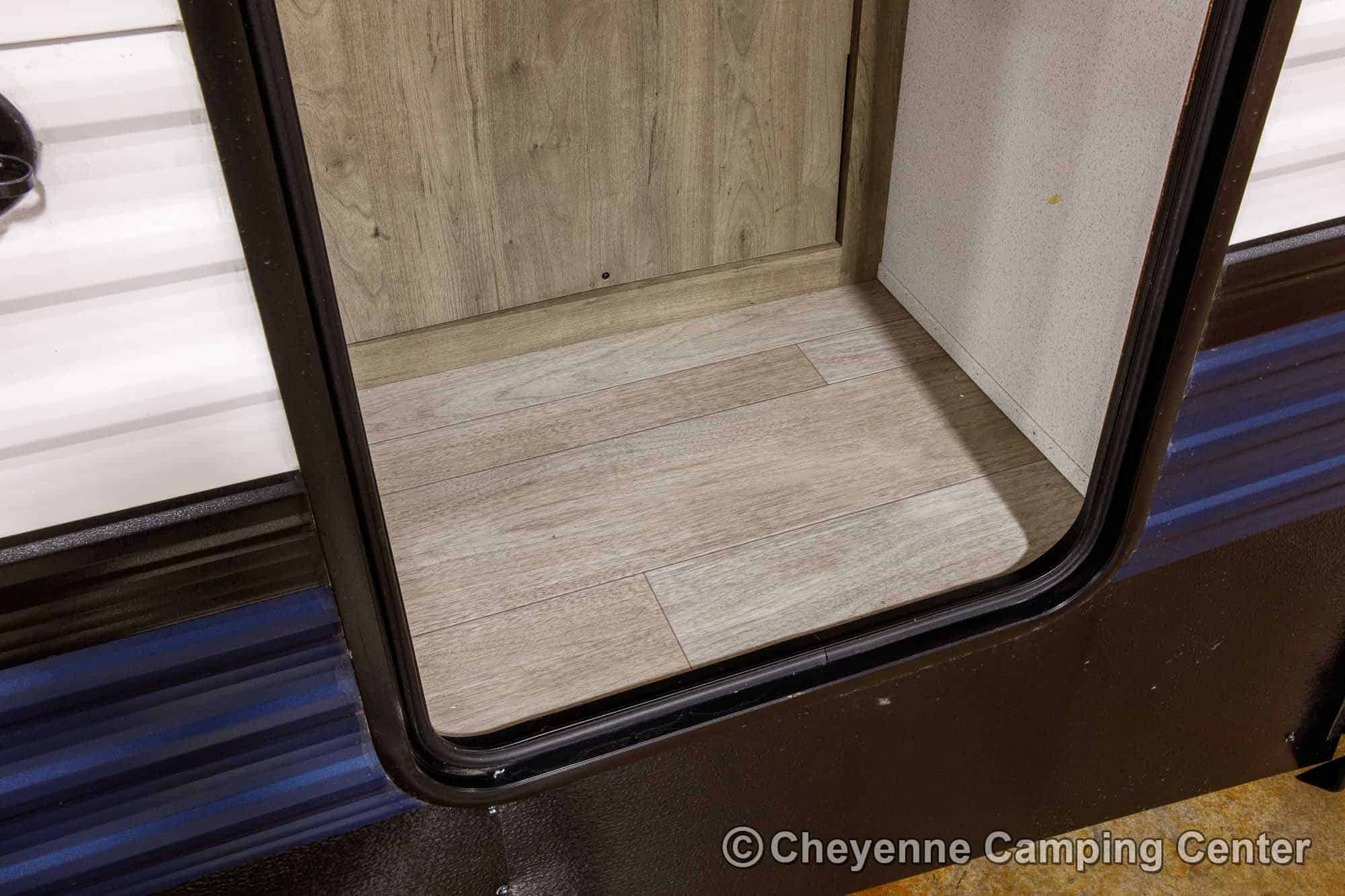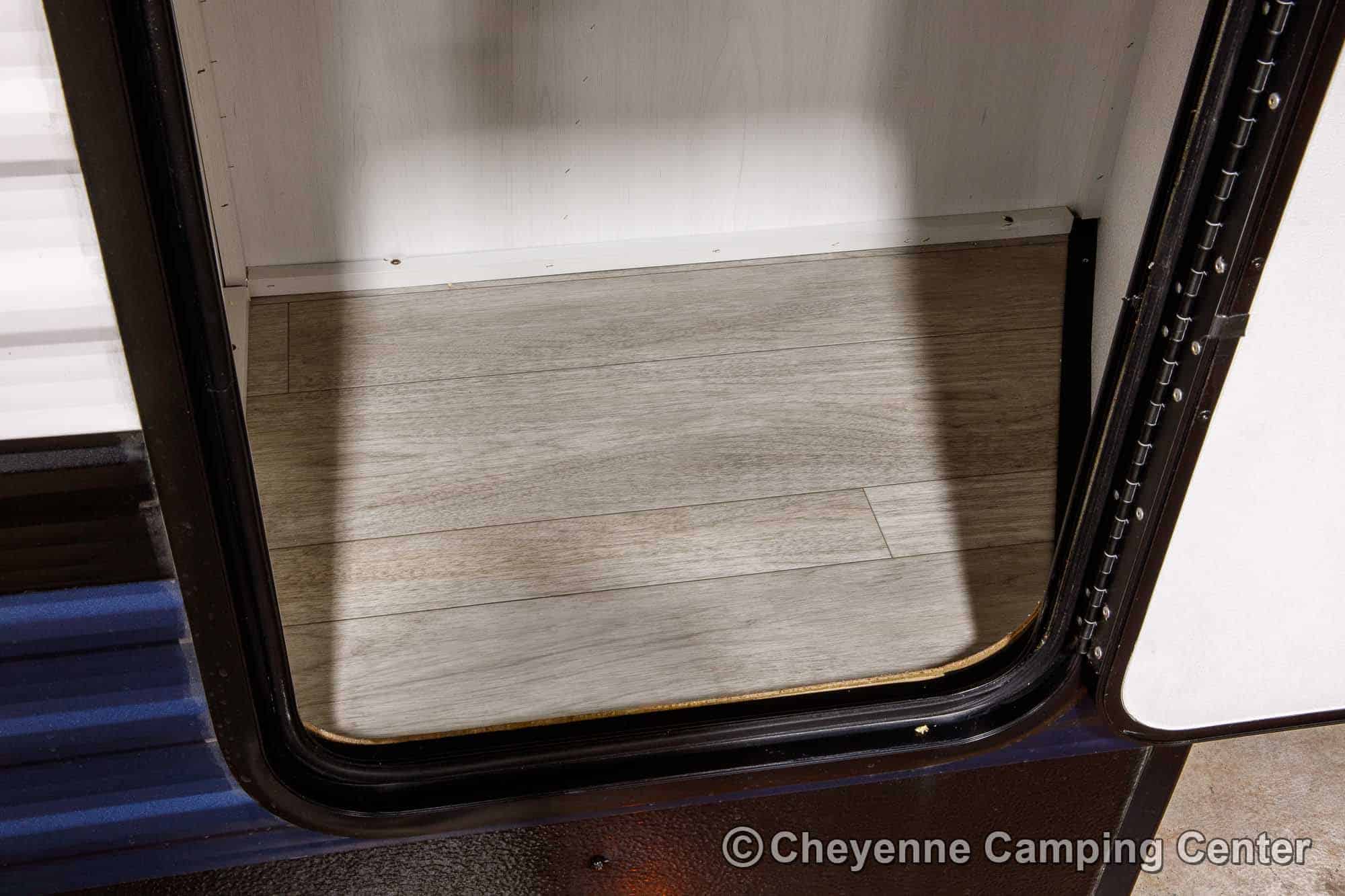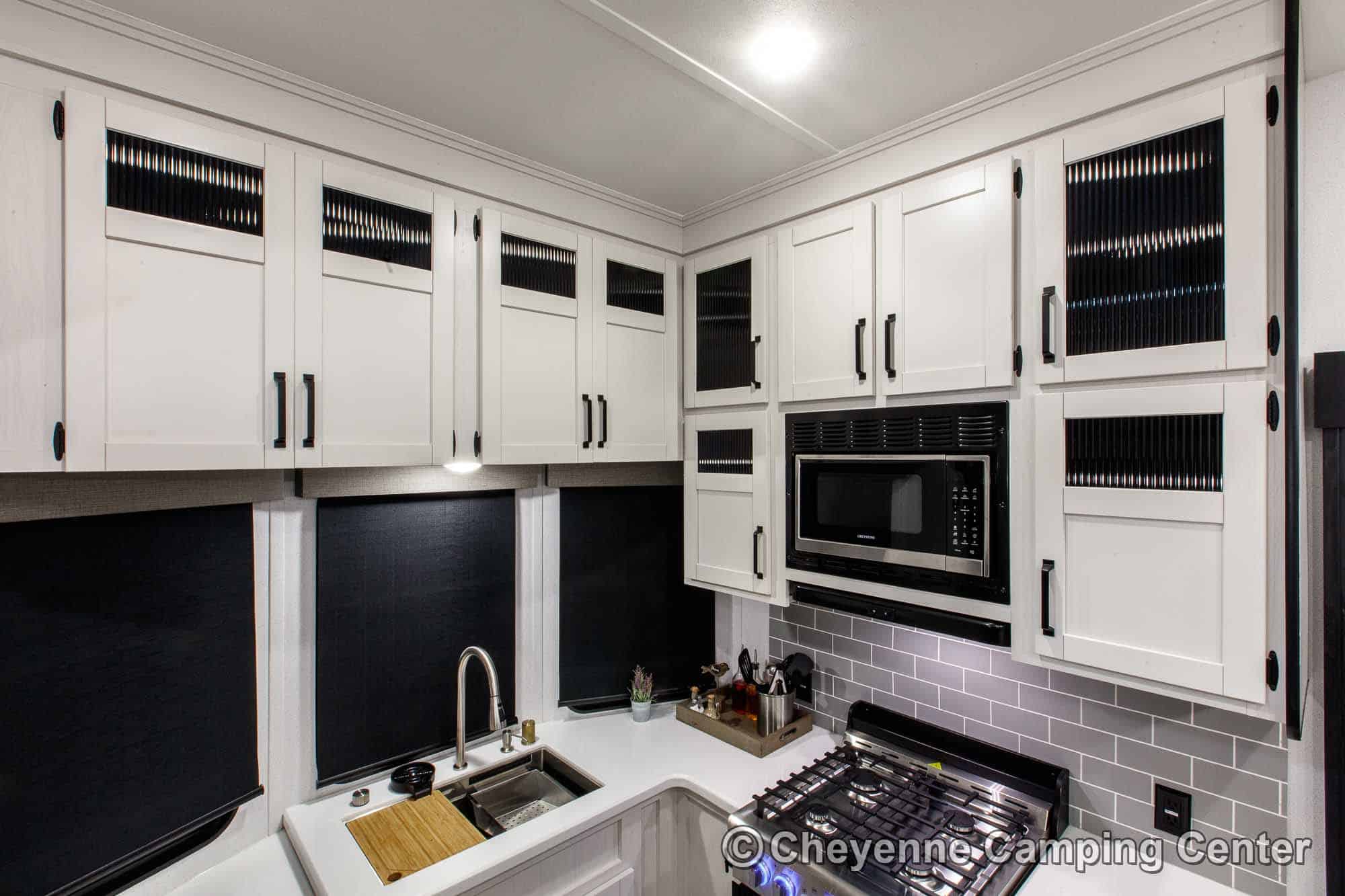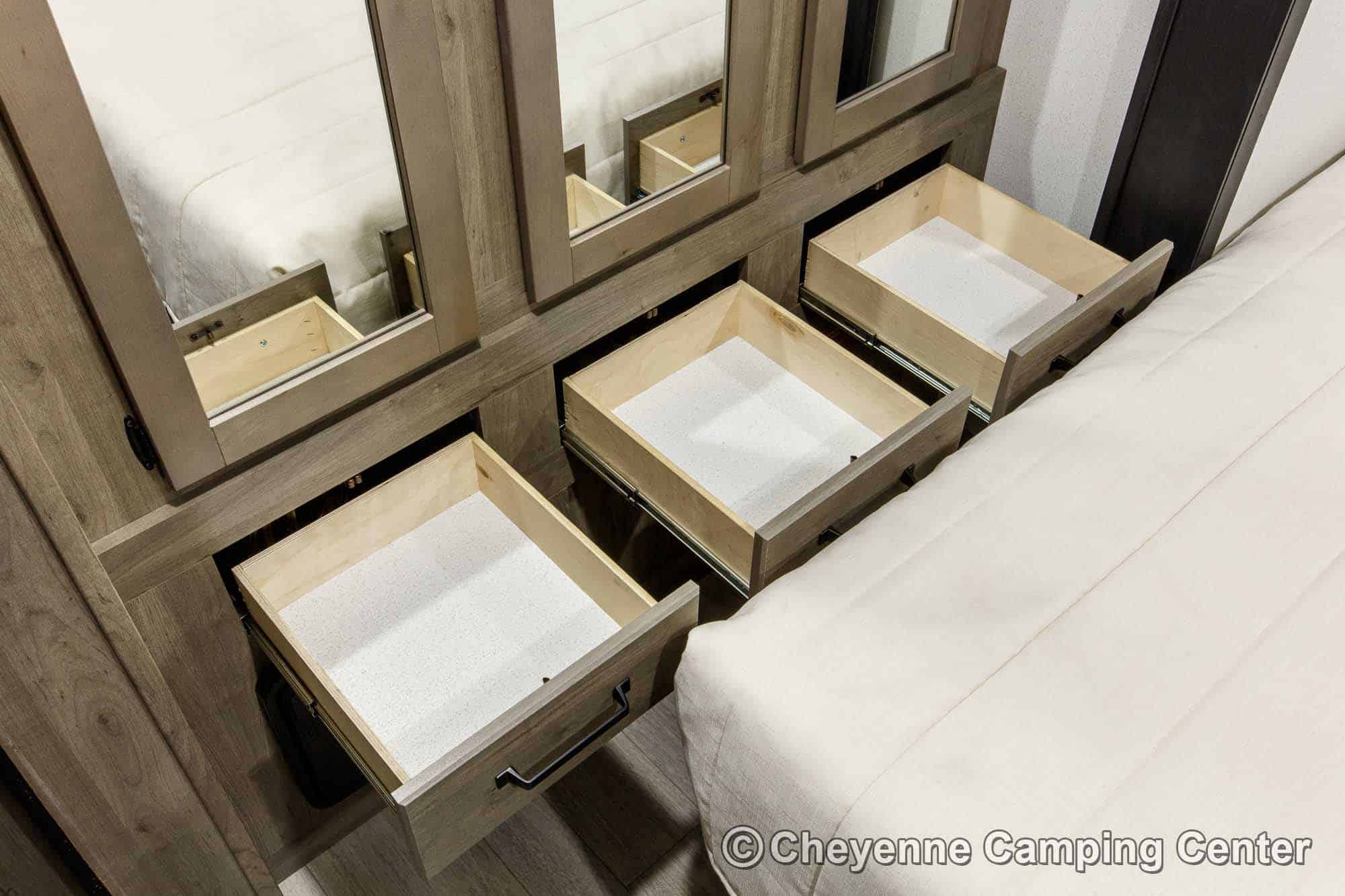 Outside, you’ll have a 20′ power awning, a sliding entry door, premium MORryde entry steps, marine-grade stereo speakers, storage compartments, a black tank flush, hot/cold shower fixture, solar prep, a roof ladder, and an LP quick connect.