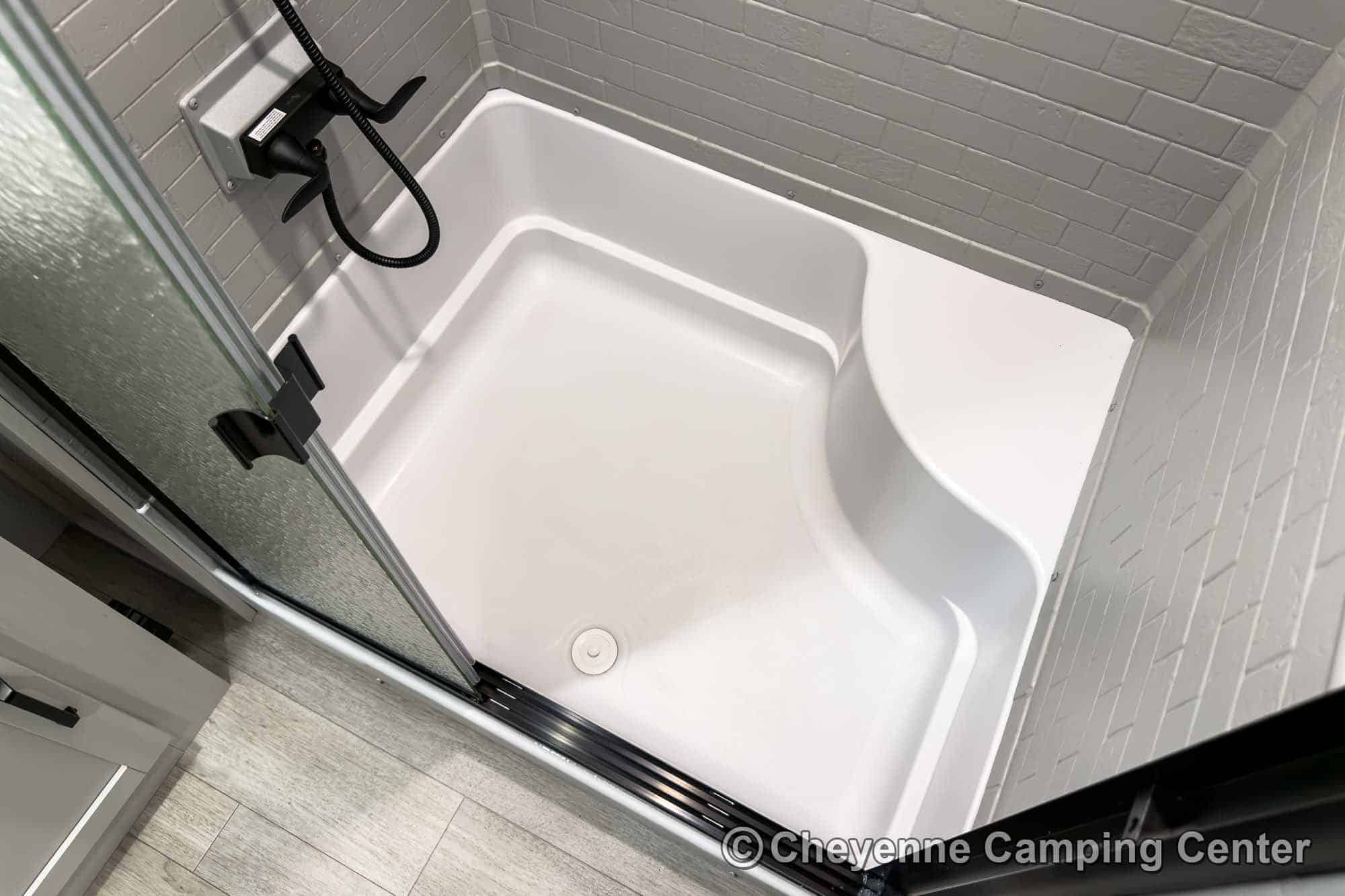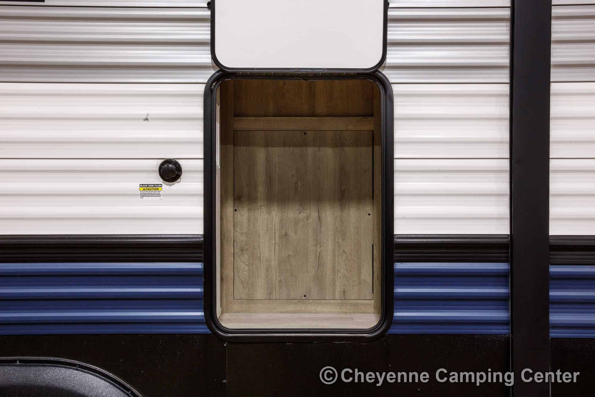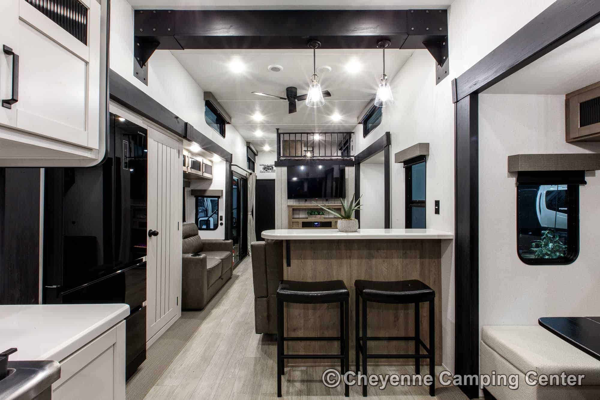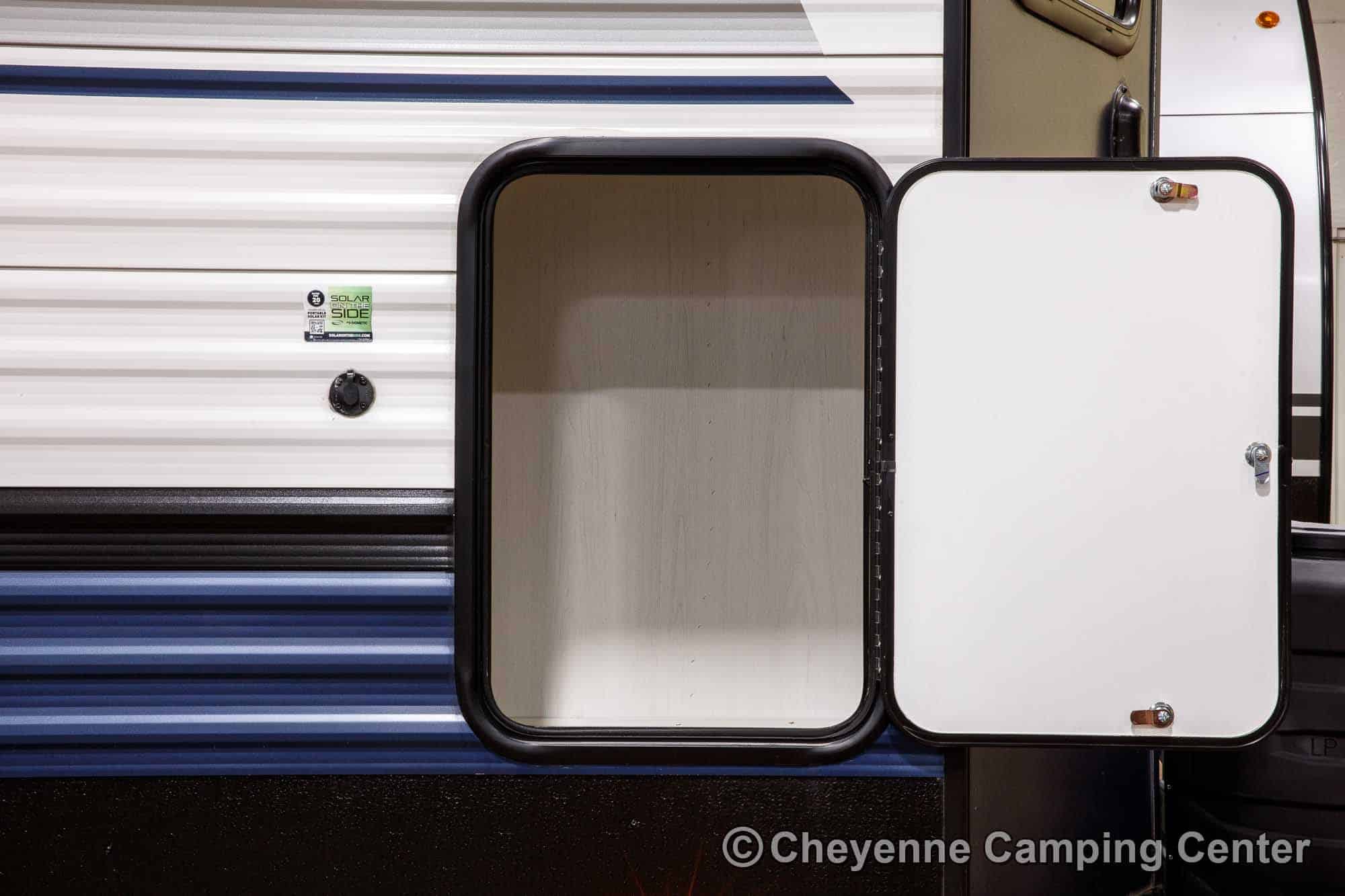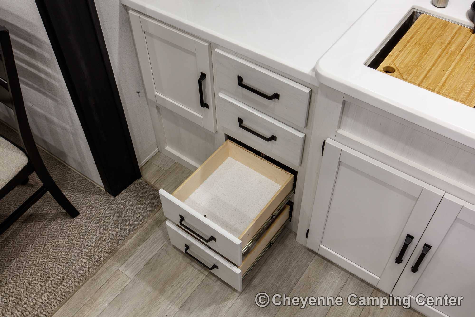 Outside, you’ll have a 20′ power awning, a sliding entry door, premium MORryde entry steps, marine-grade stereo speakers, storage compartments, a black tank flush, hot/cold shower fixture, solar prep, a roof ladder, and an LP quick connect.