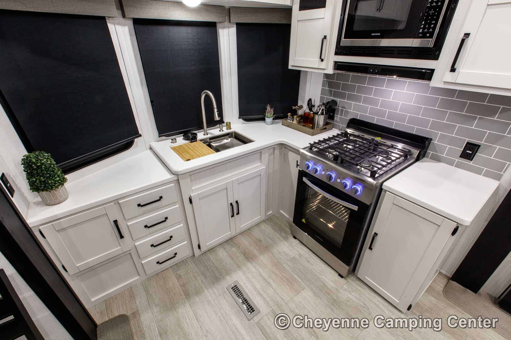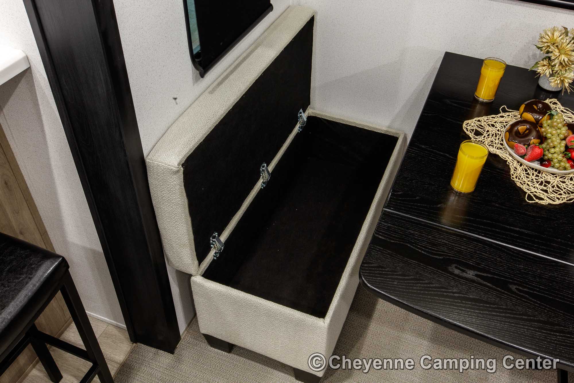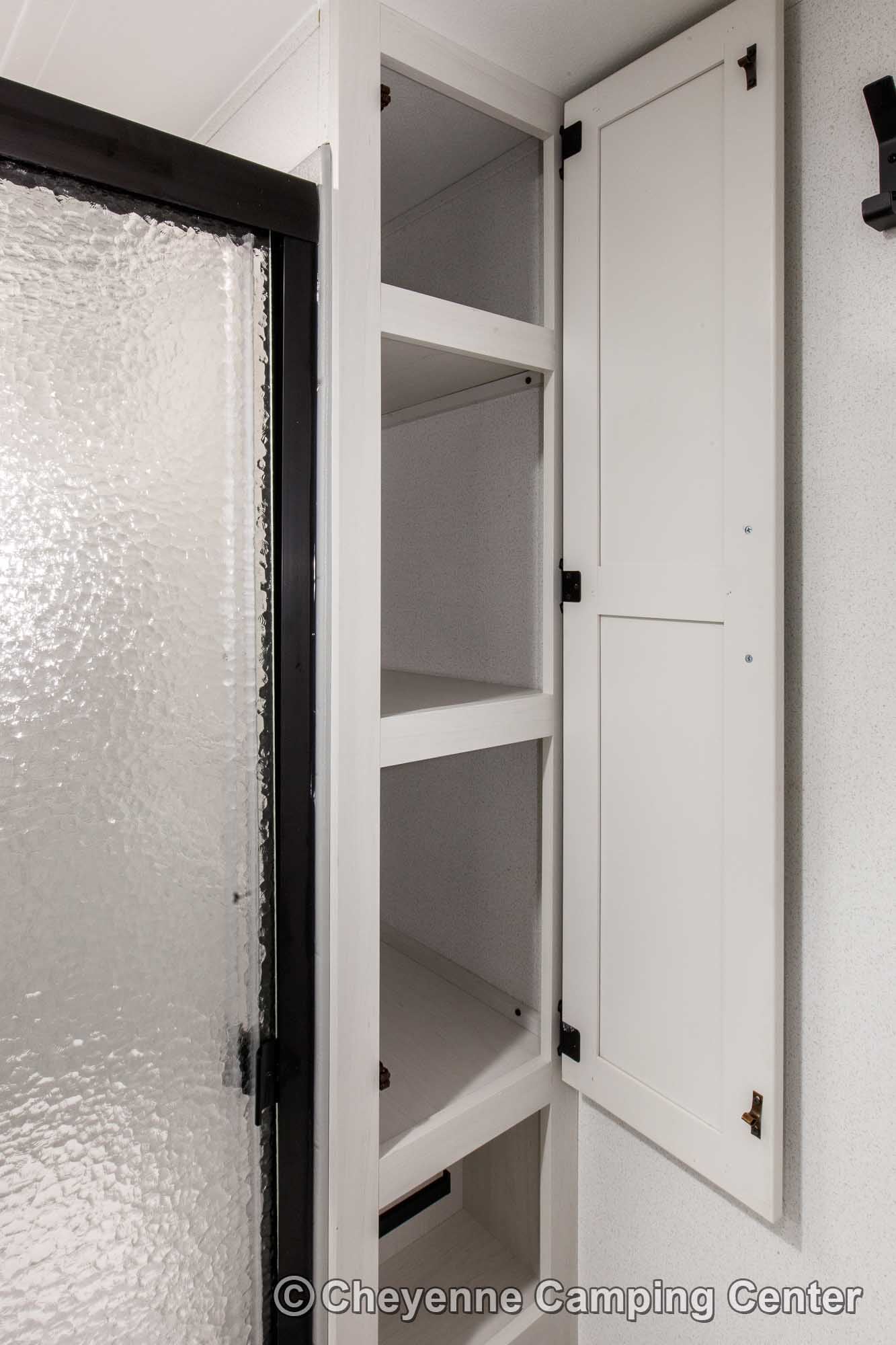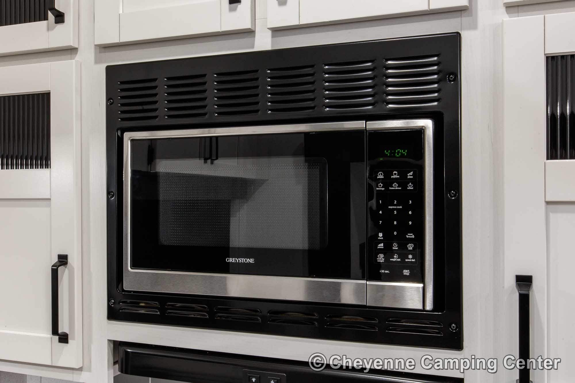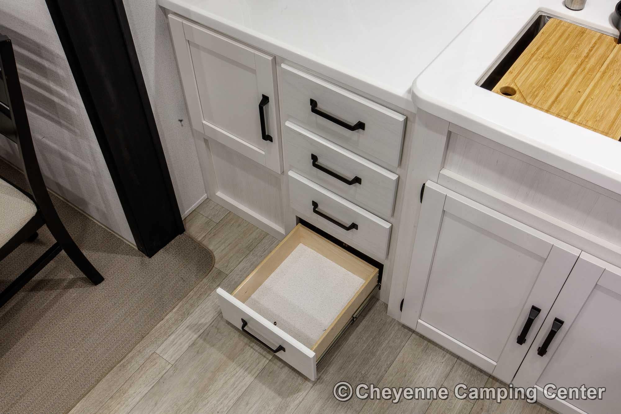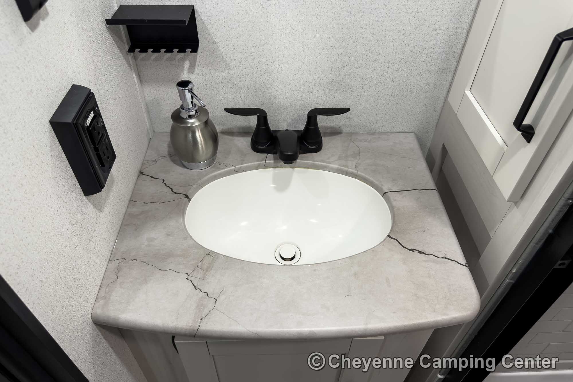 Outside, you’ll have a 20′ power awning, a sliding entry door, premium MORryde entry steps, marine-grade stereo speakers, storage compartments, a black tank flush, hot/cold shower fixture, solar prep, a roof ladder, and an LP quick connect.