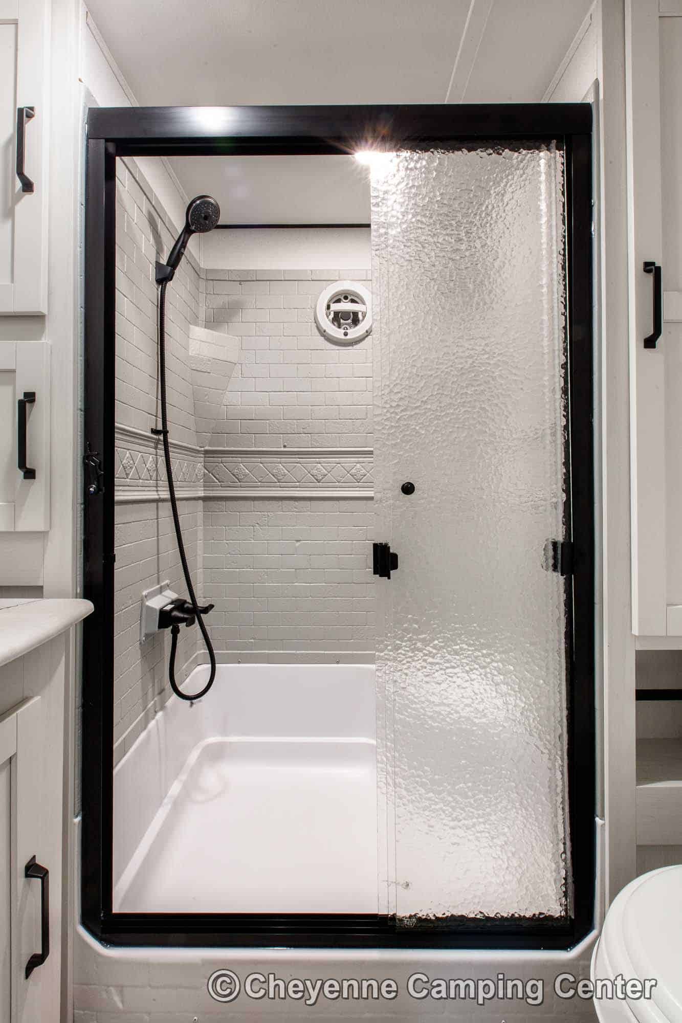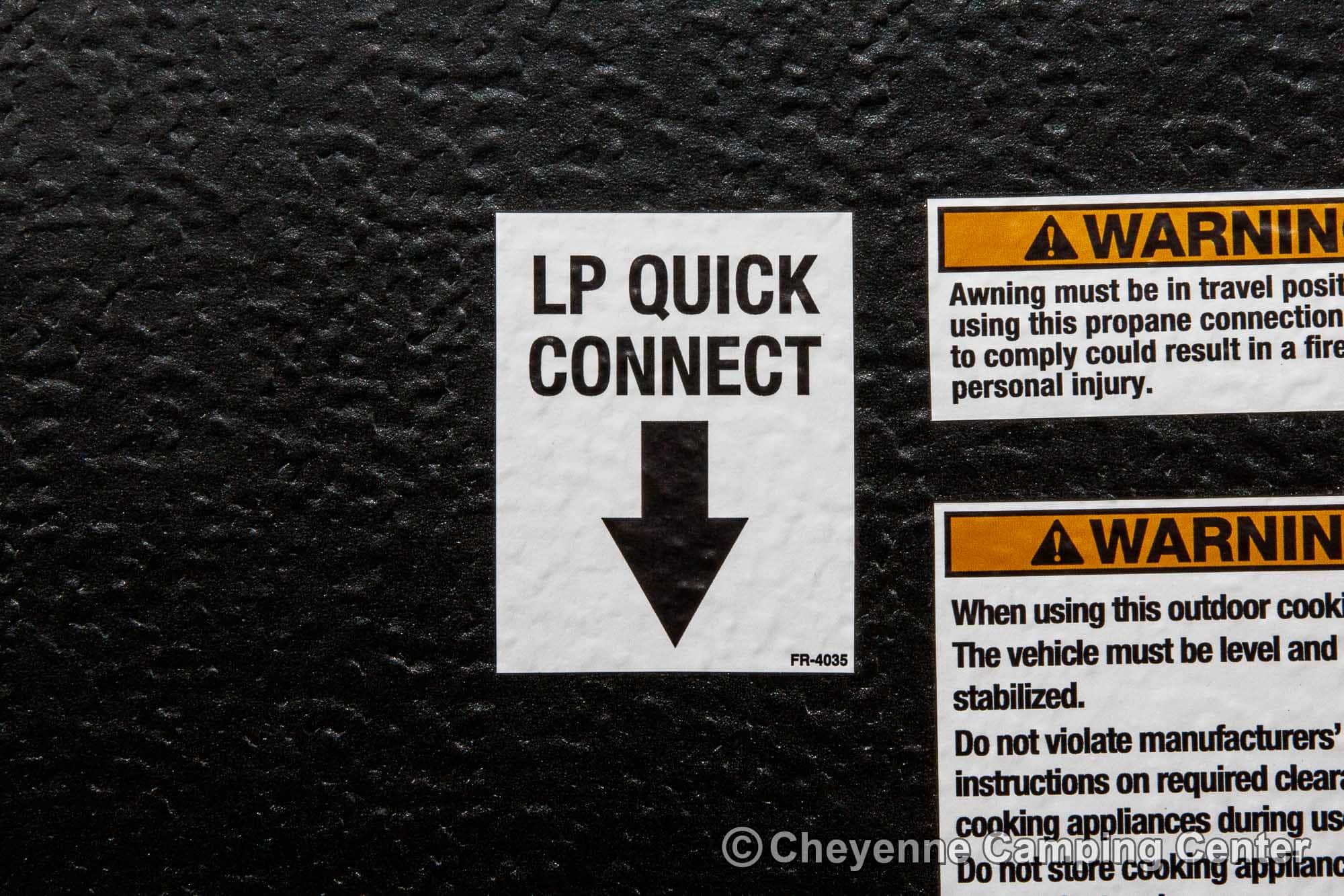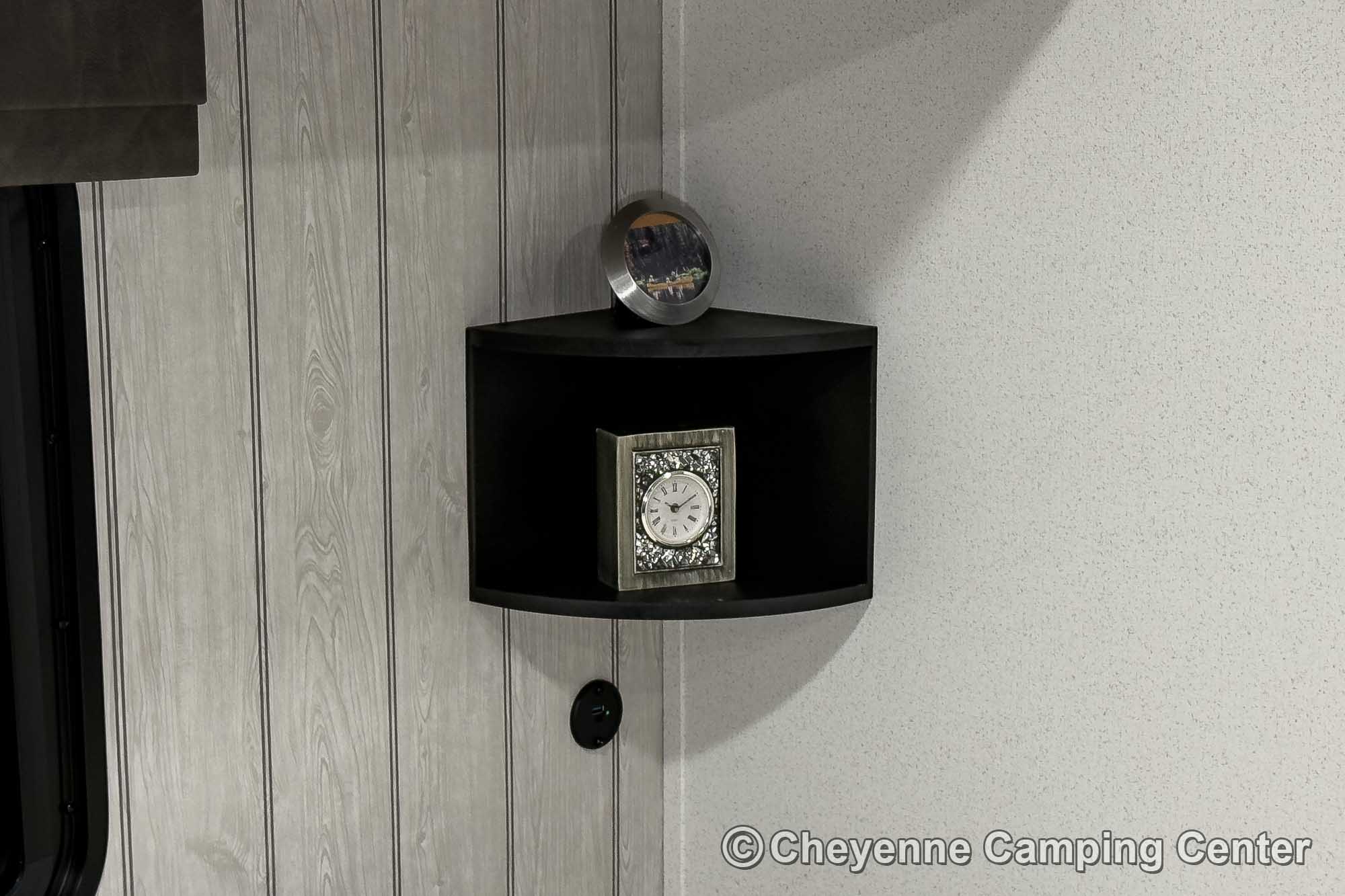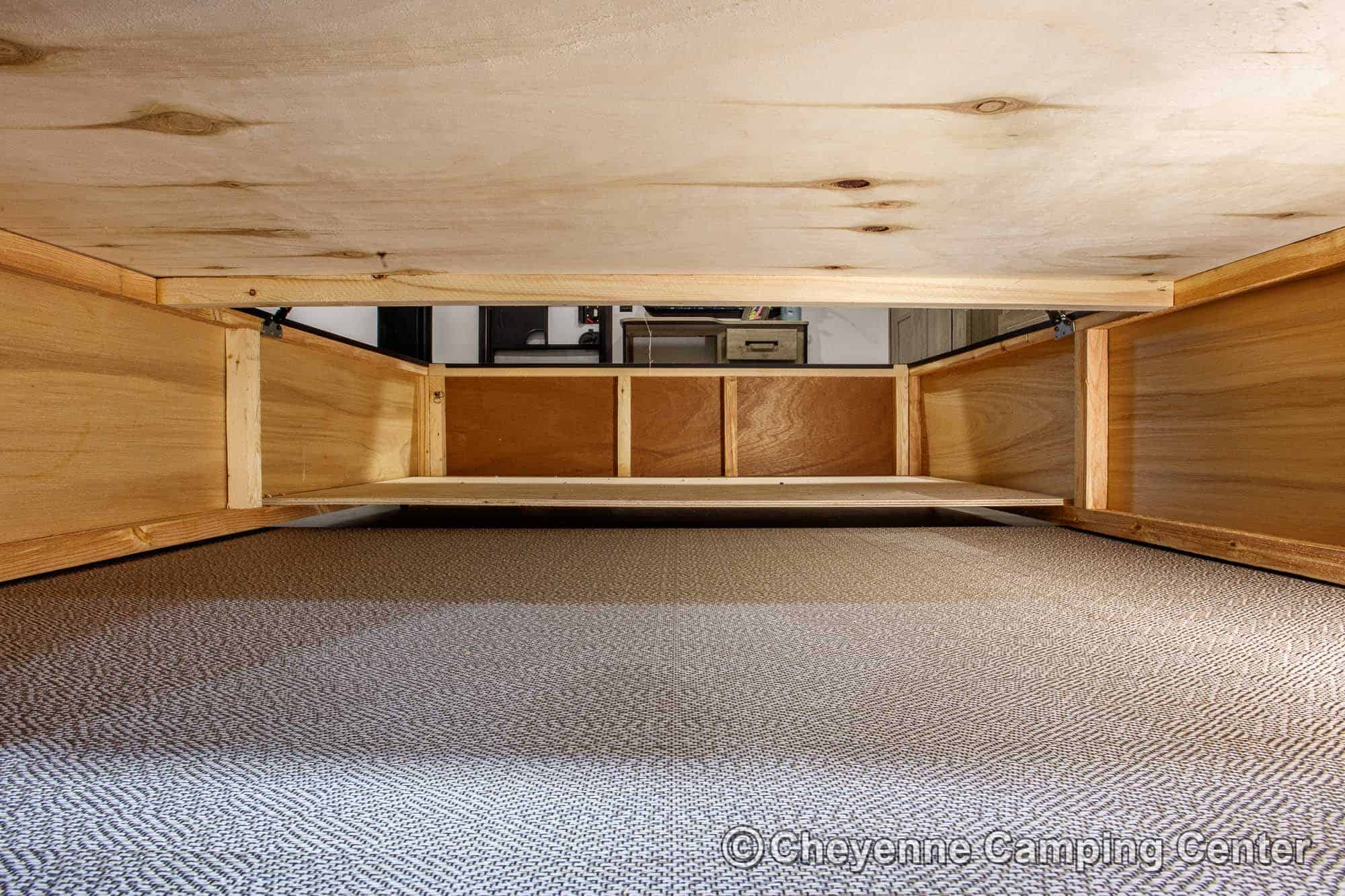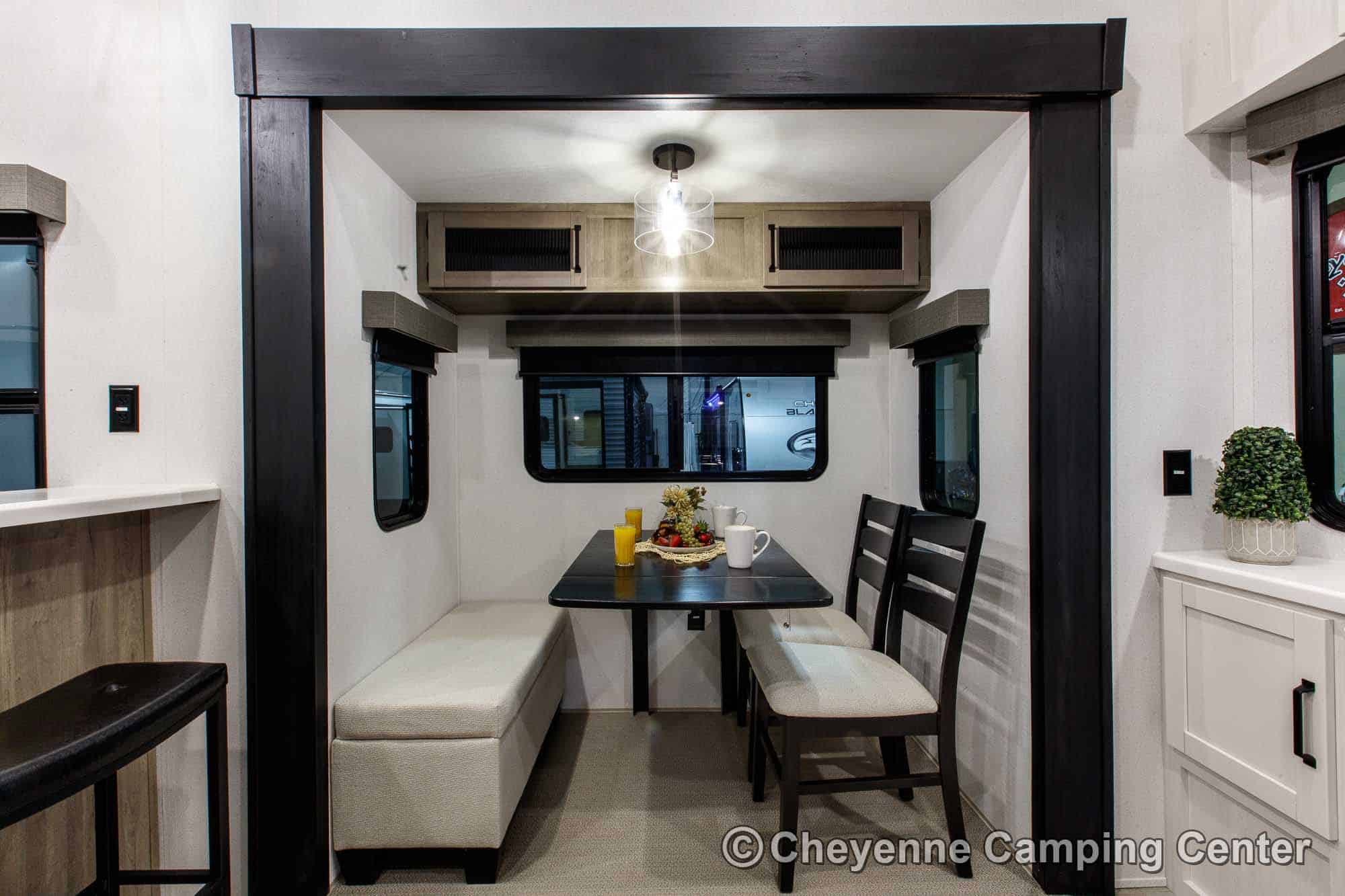 Outside, you’ll have a 20′ power awning, a sliding entry door, premium MORryde entry steps, marine-grade stereo speakers, storage compartments, a black tank flush, hot/cold shower fixture, solar prep, a roof ladder, and an LP quick connect.