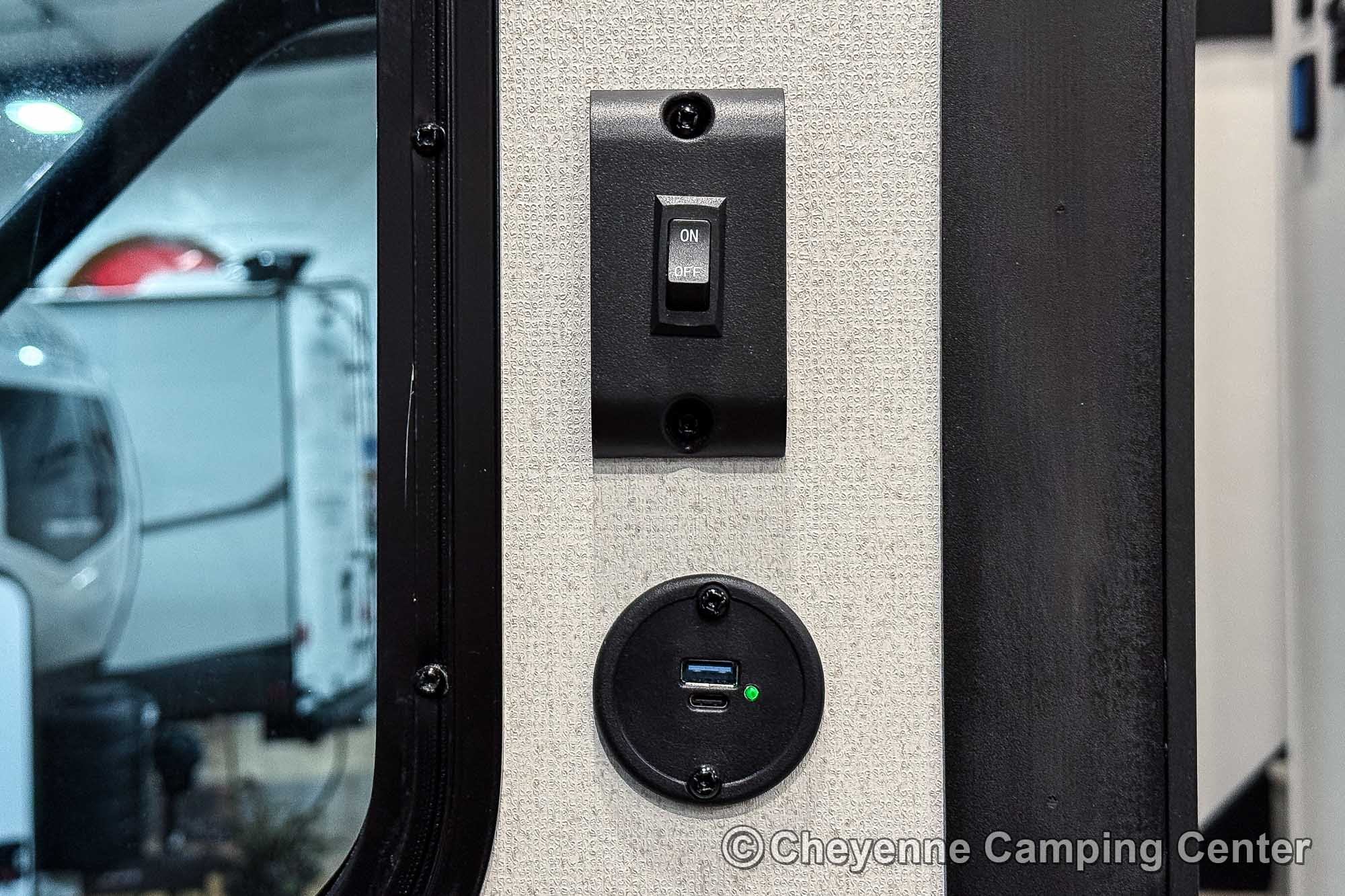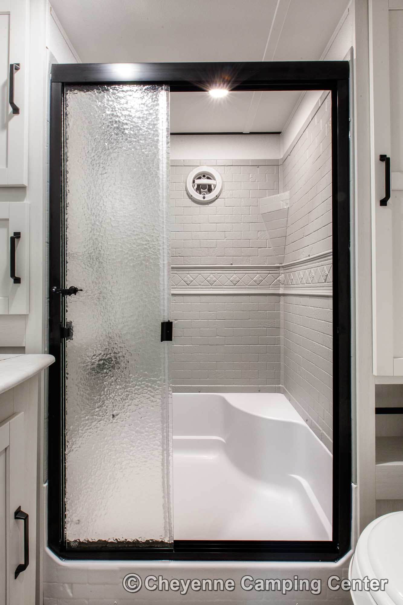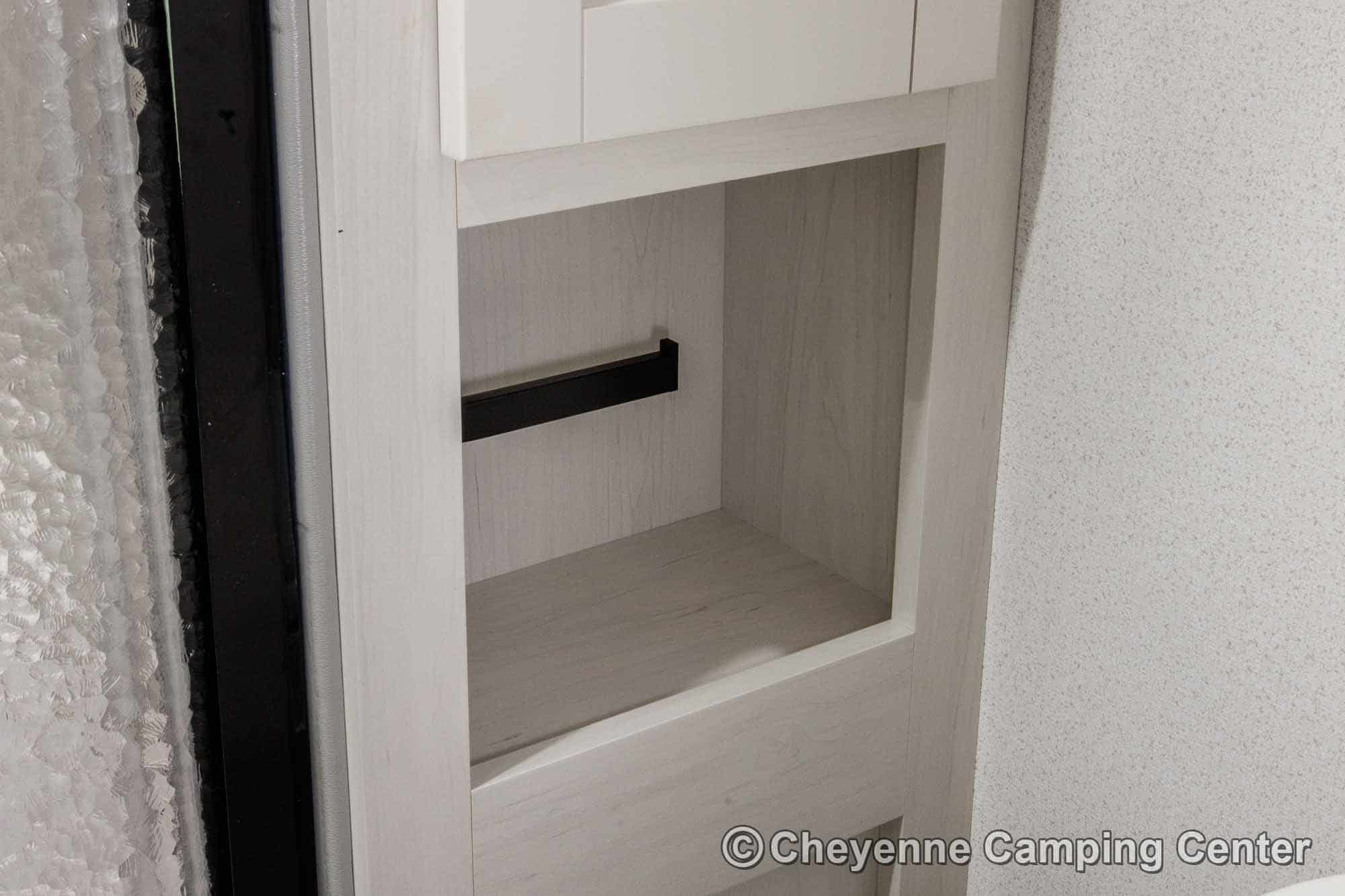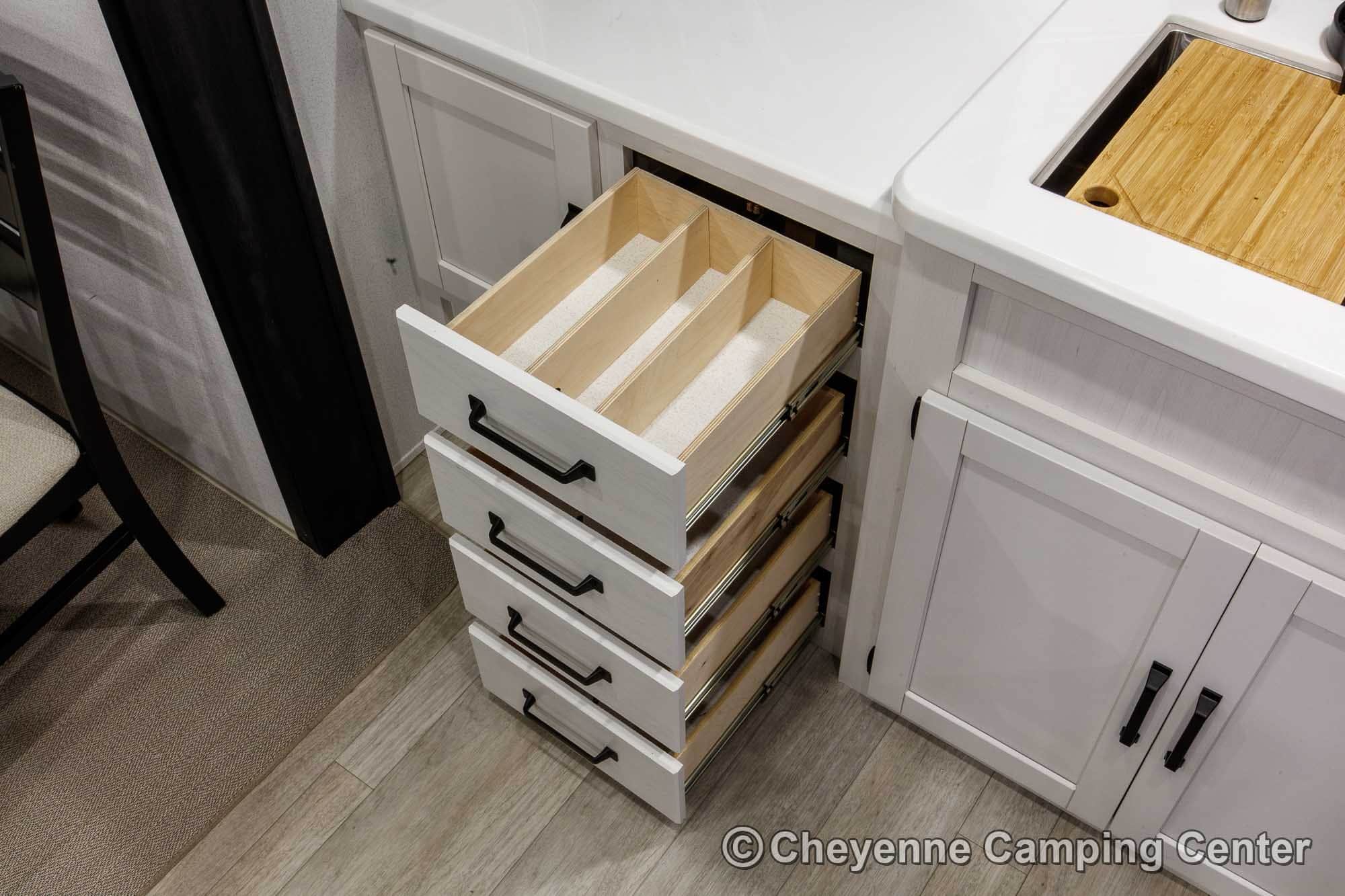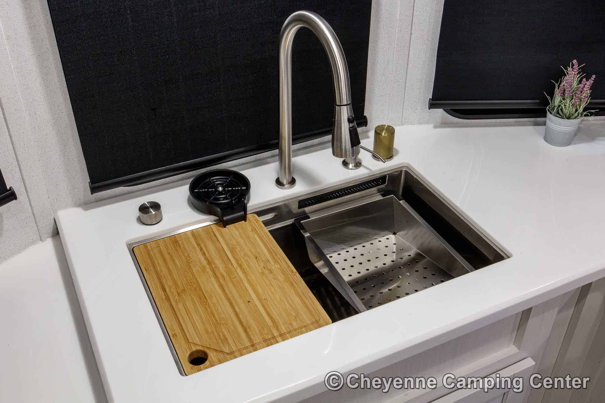 Outside, you’ll have a 20′ power awning, a sliding entry door, premium MORryde entry steps, marine-grade stereo speakers, storage compartments, a black tank flush, hot/cold shower fixture, solar prep, a roof ladder, and an LP quick connect.