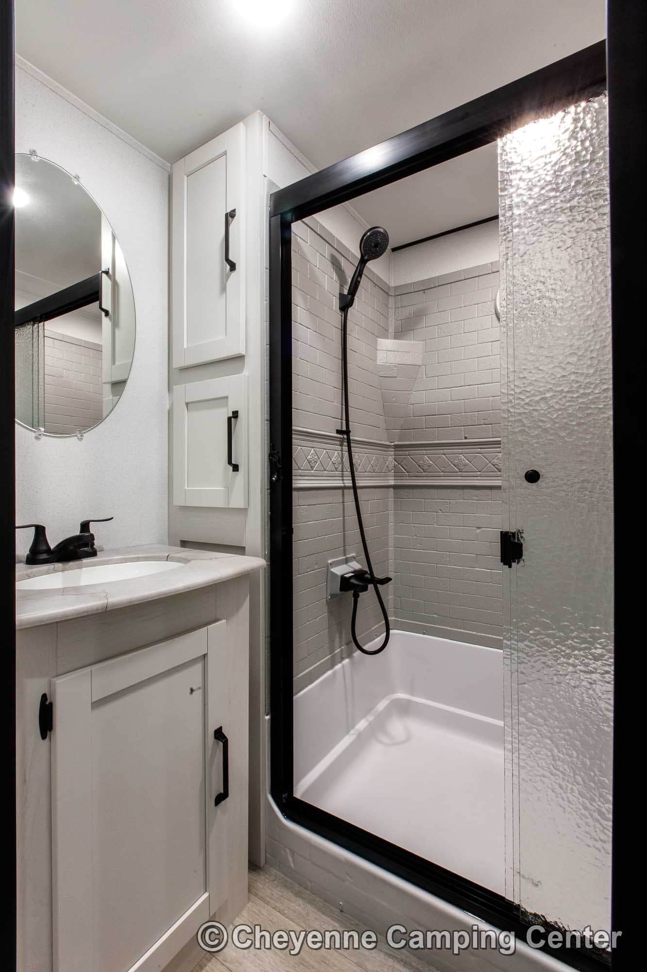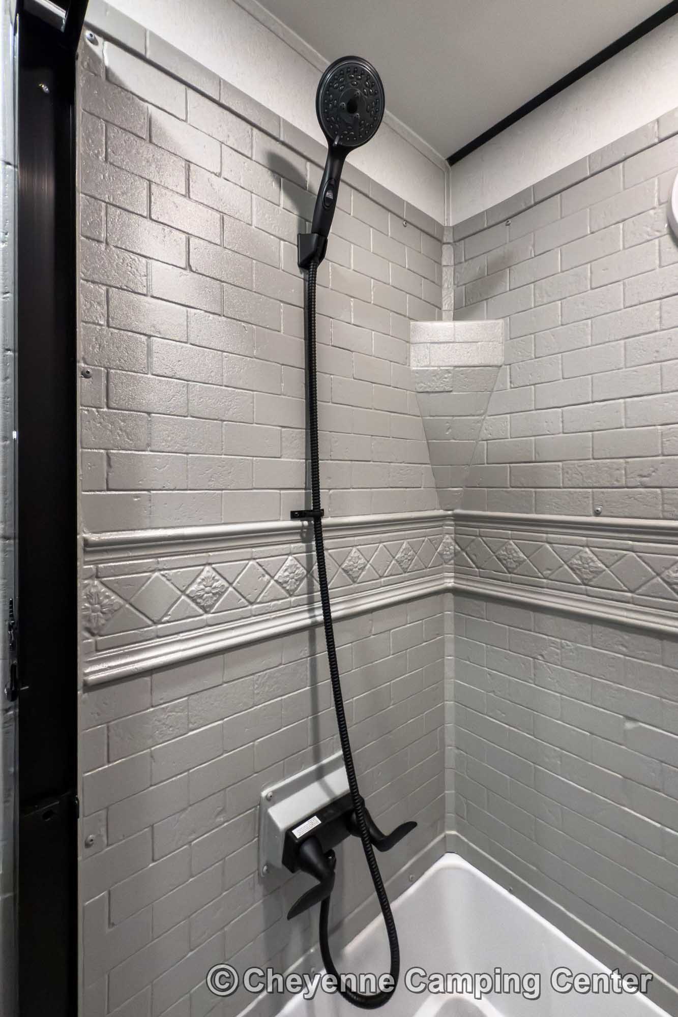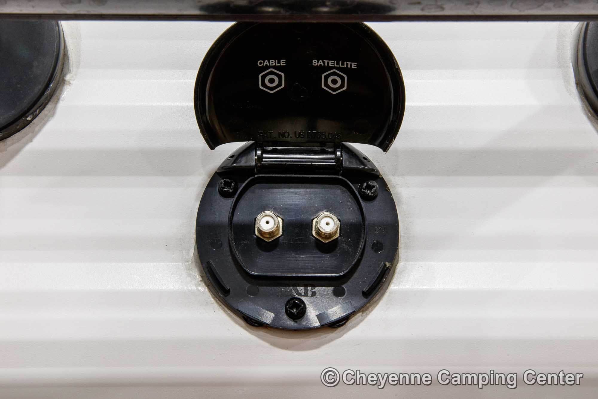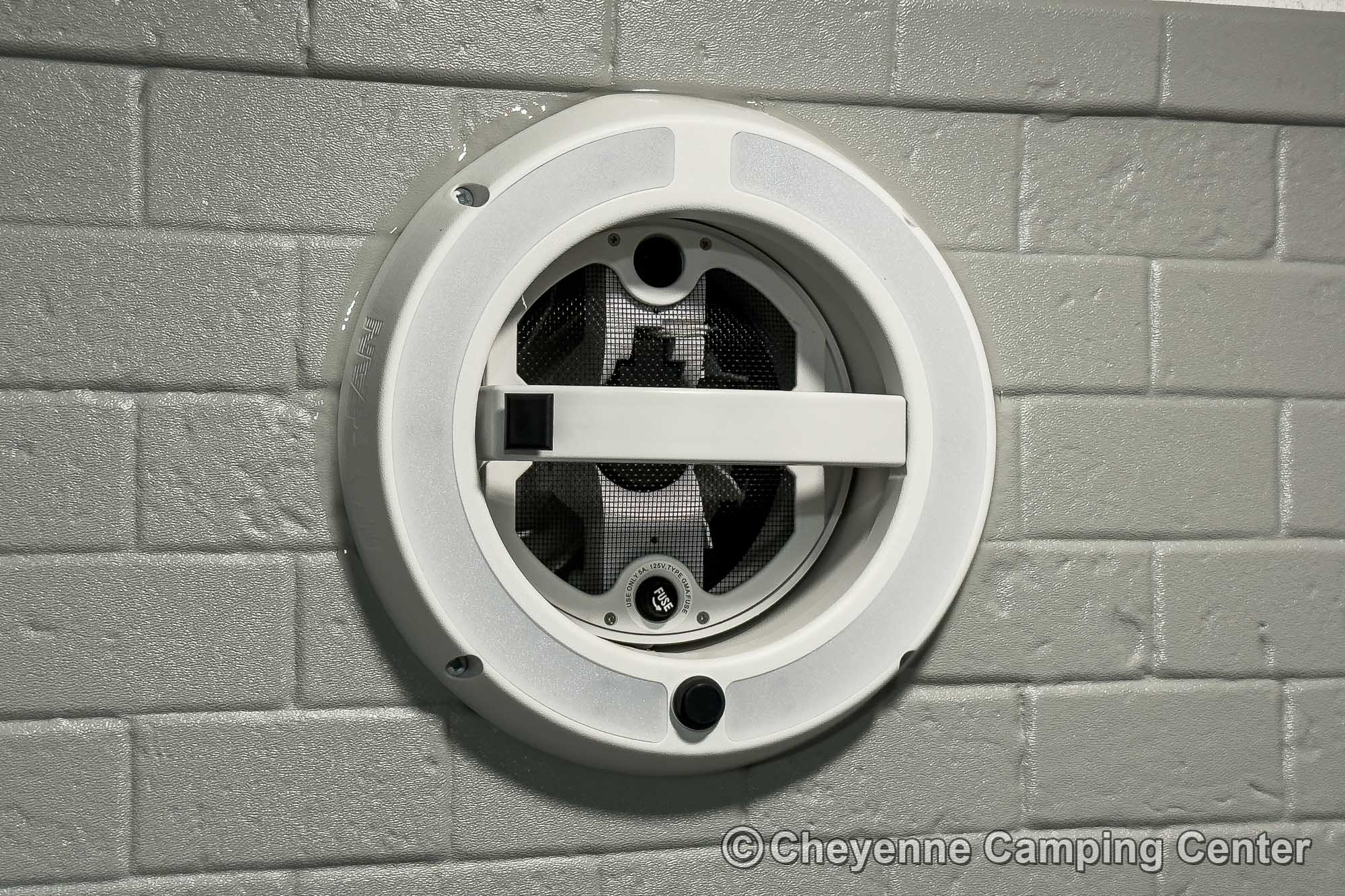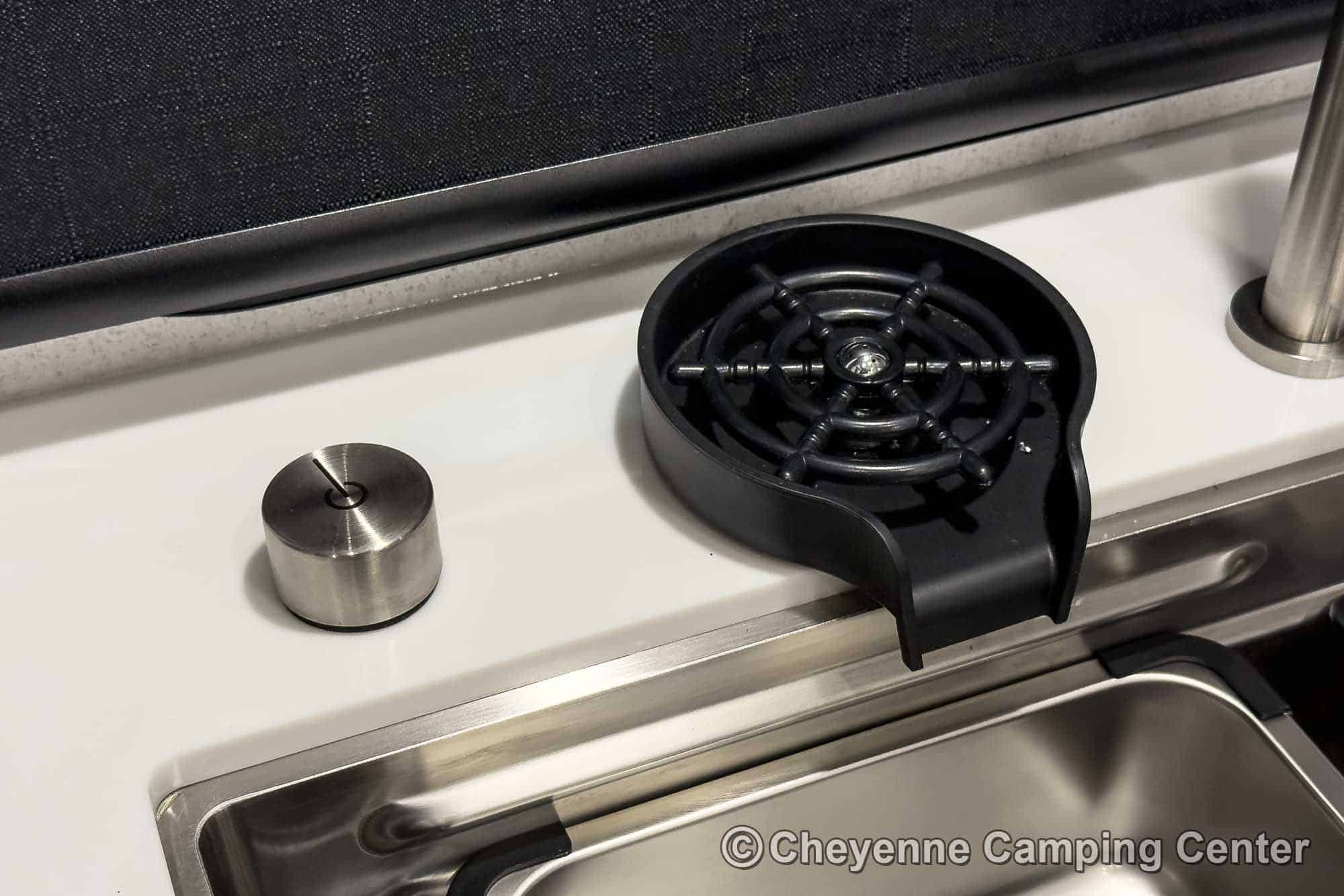 Outside, you’ll have a 20′ power awning, a sliding entry door, premium MORryde entry steps, marine-grade stereo speakers, storage compartments, a black tank flush, hot/cold shower fixture, solar prep, a roof ladder, and an LP quick connect.