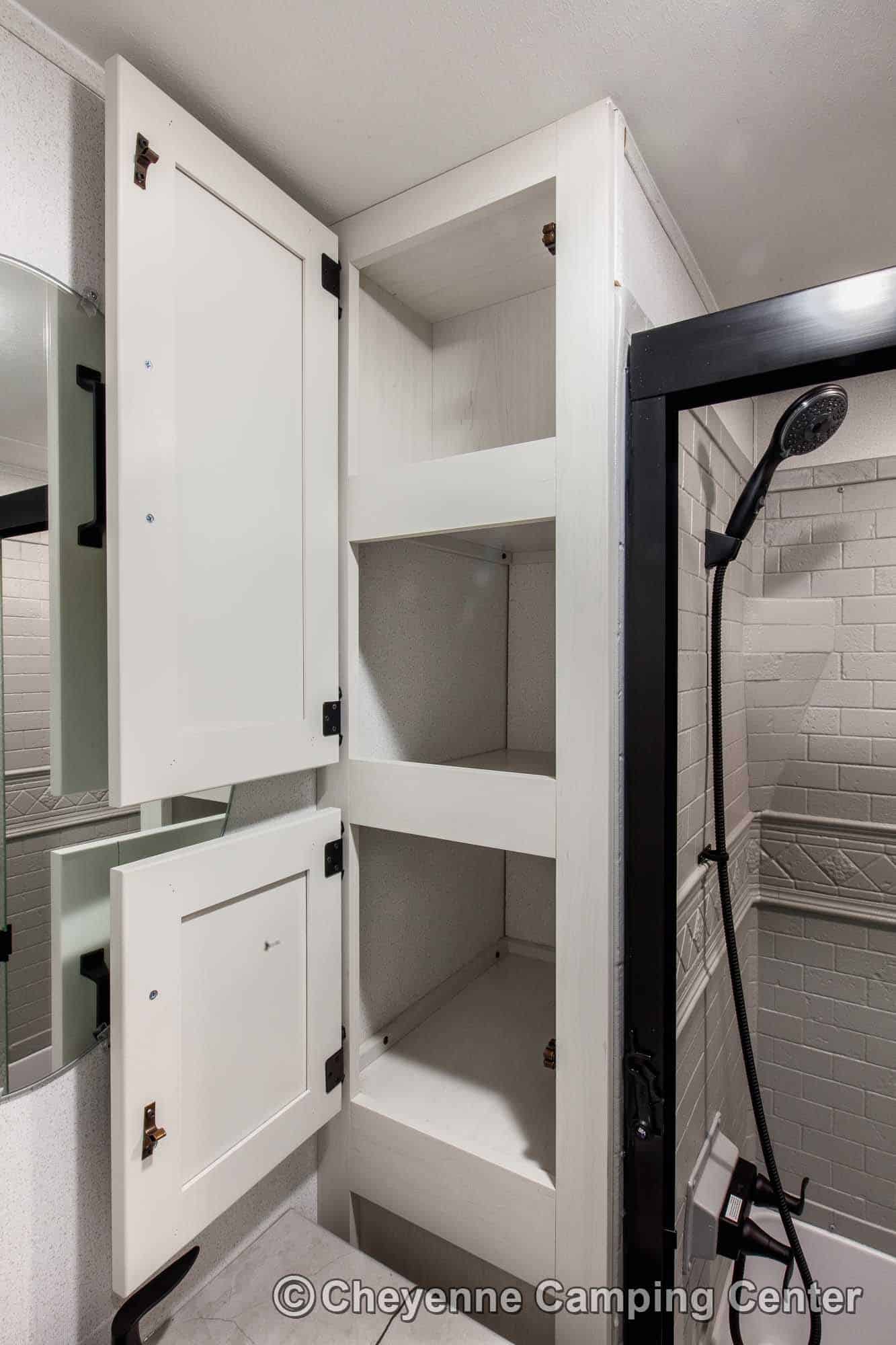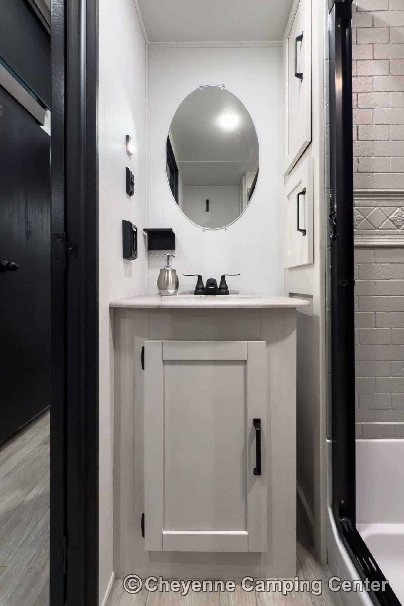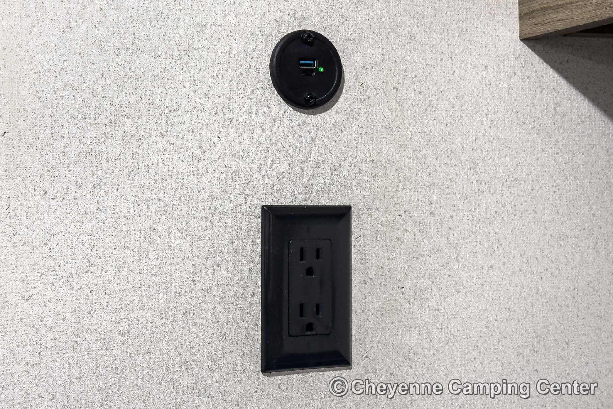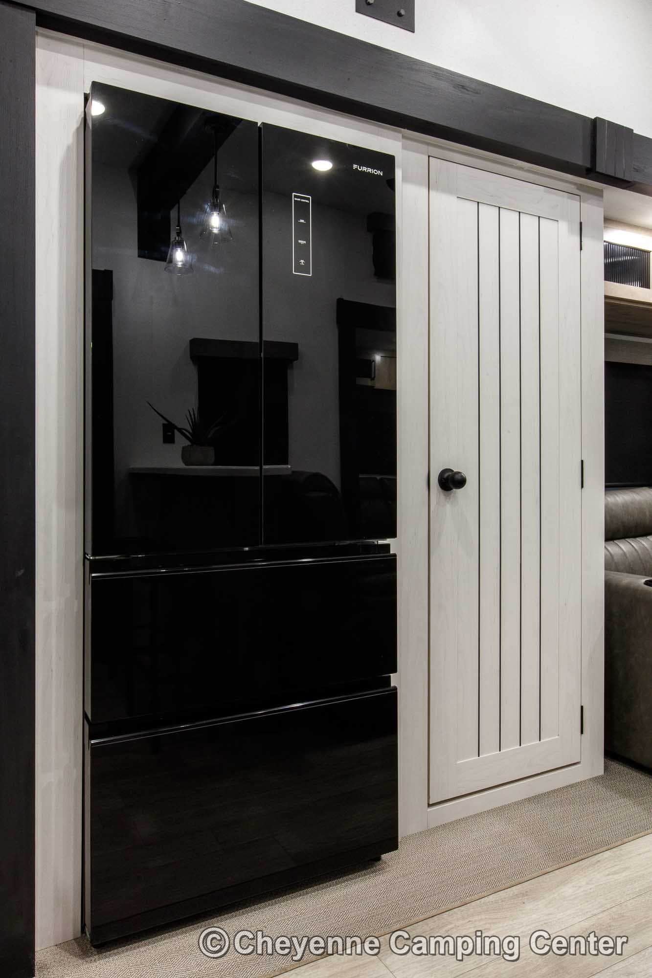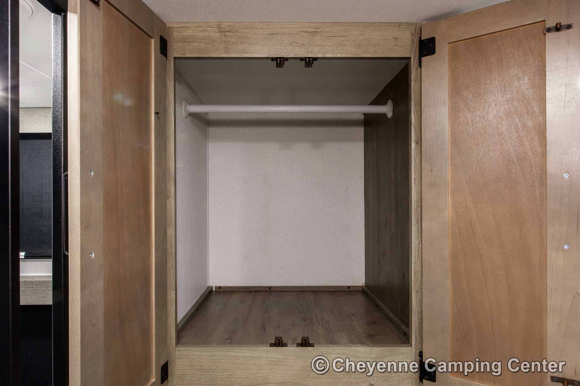 Outside, you’ll have a 20′ power awning, a sliding entry door, premium MORryde entry steps, marine-grade stereo speakers, storage compartments, a black tank flush, hot/cold shower fixture, solar prep, a roof ladder, and an LP quick connect.