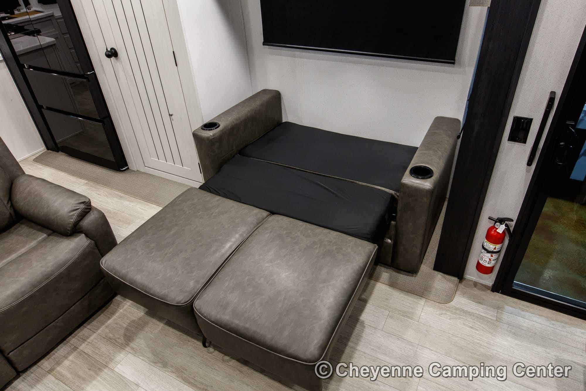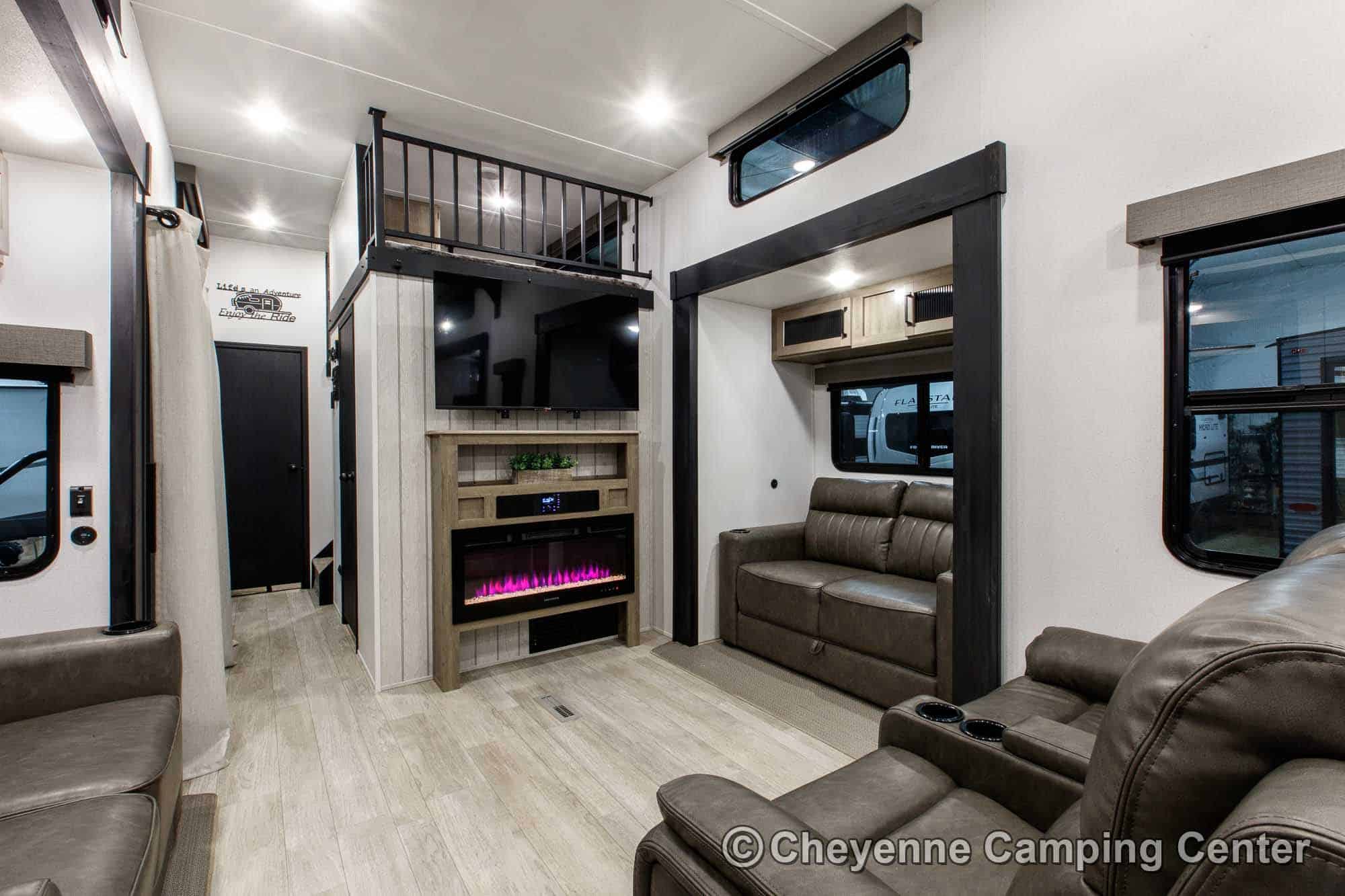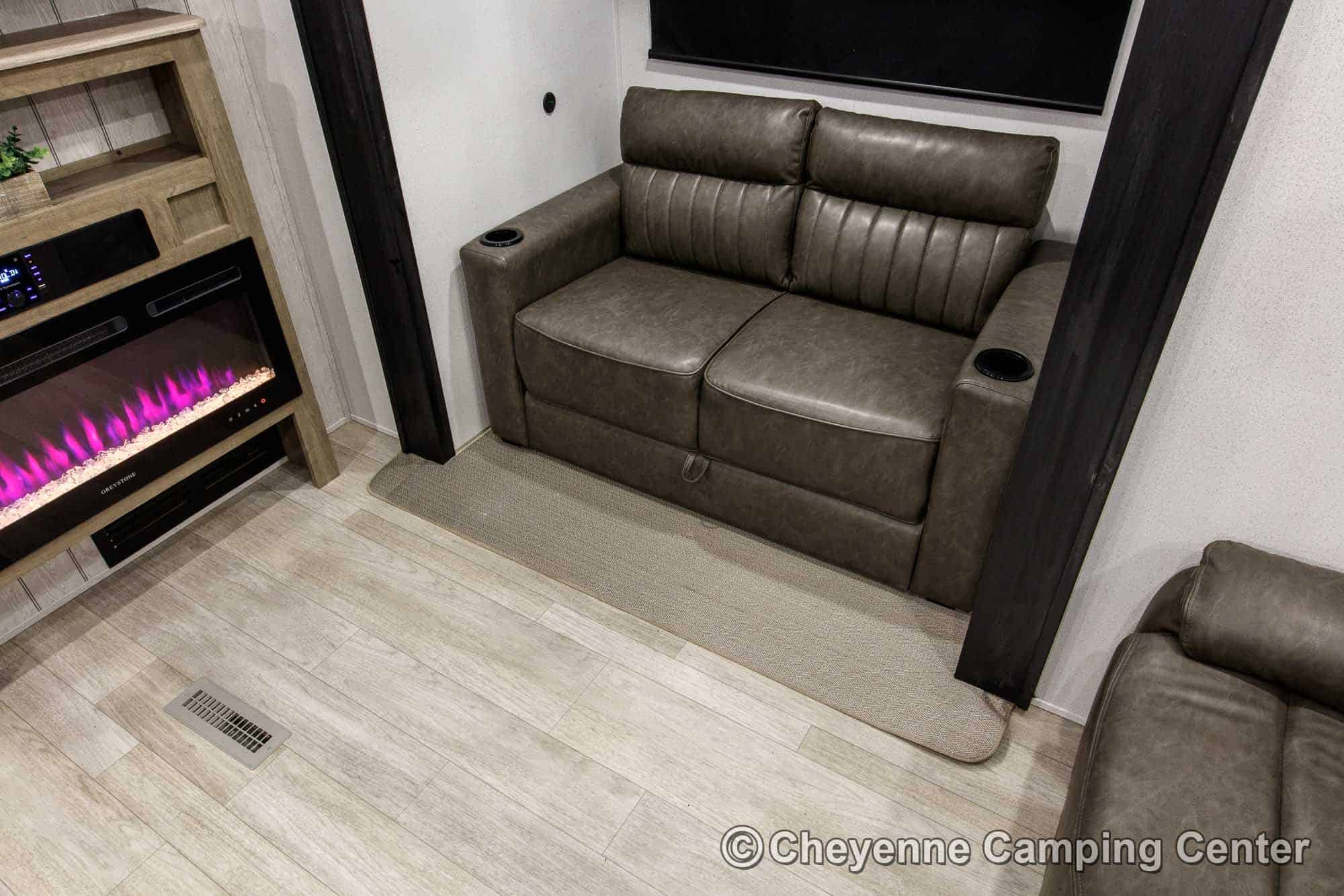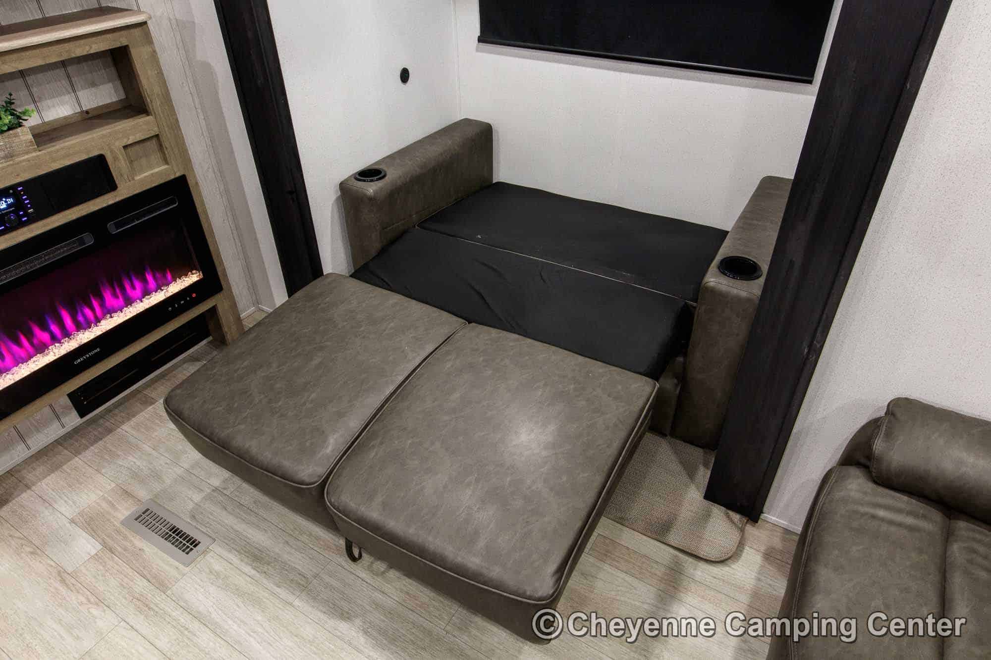 The living room is modern and functional, featuring dual opposing sofa sleepers, reclining theater seating, a 50″ Smart LED television, a Bluetooth soundbar stereo, and an electric fireplace with heat.