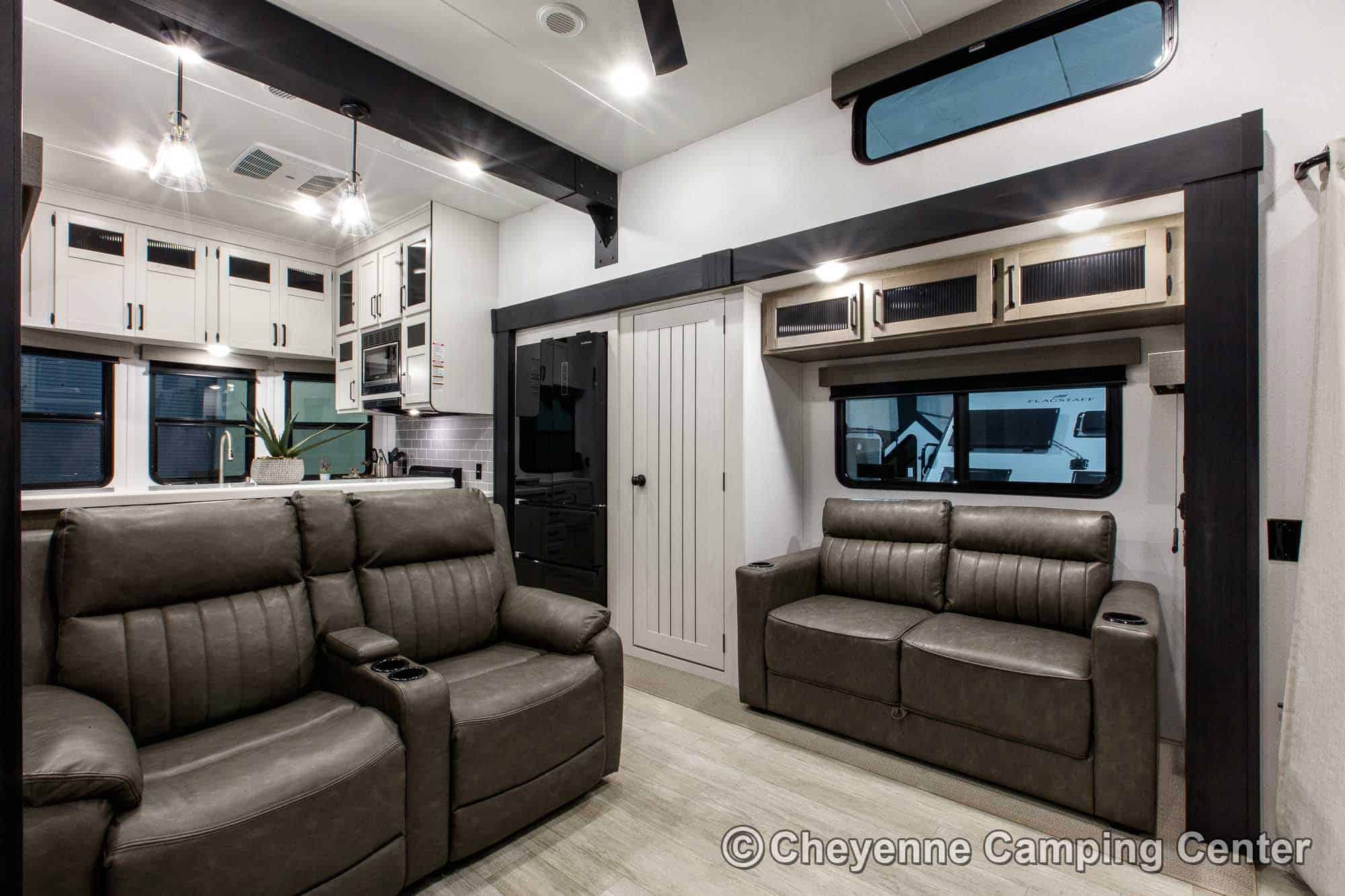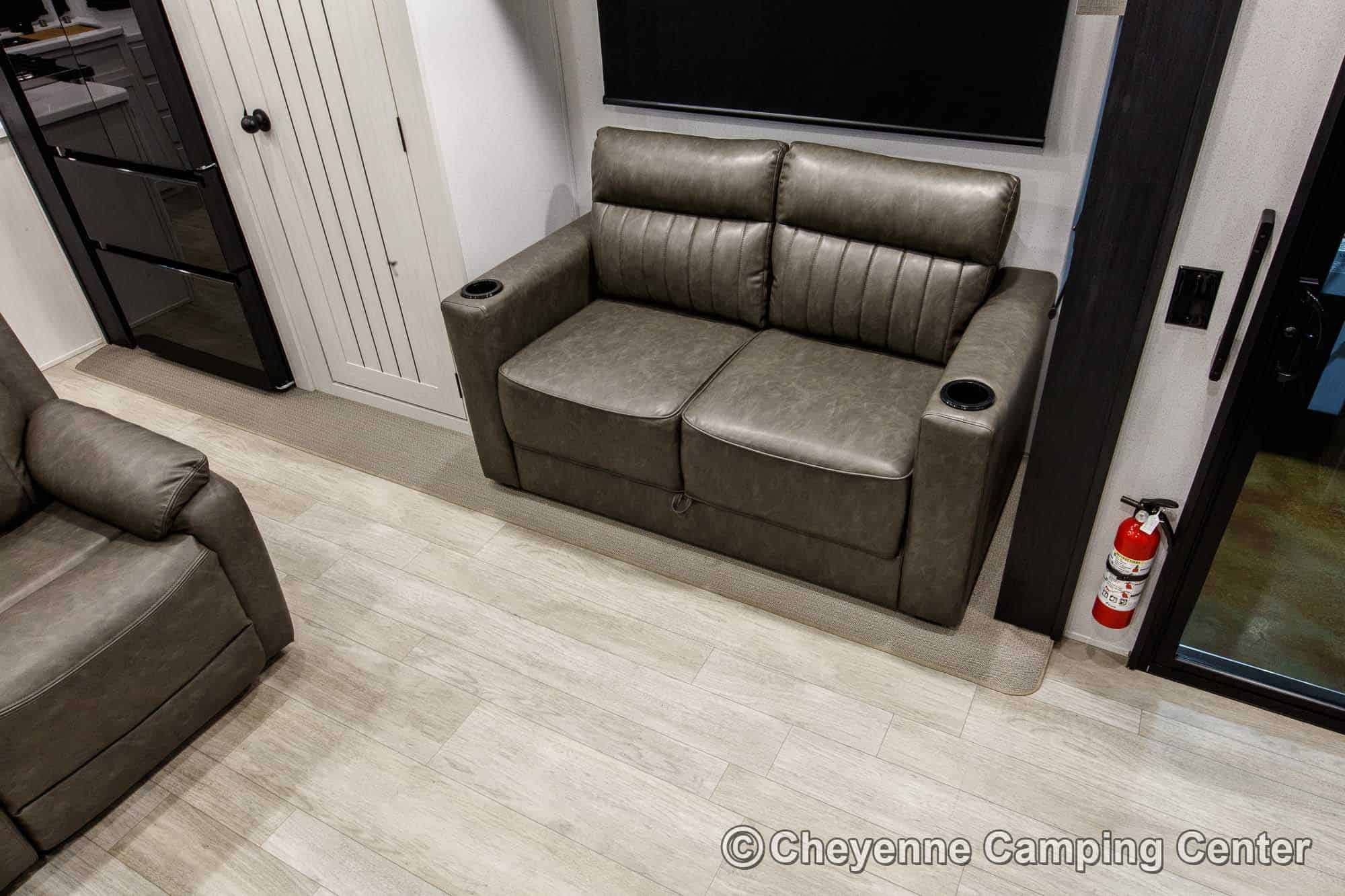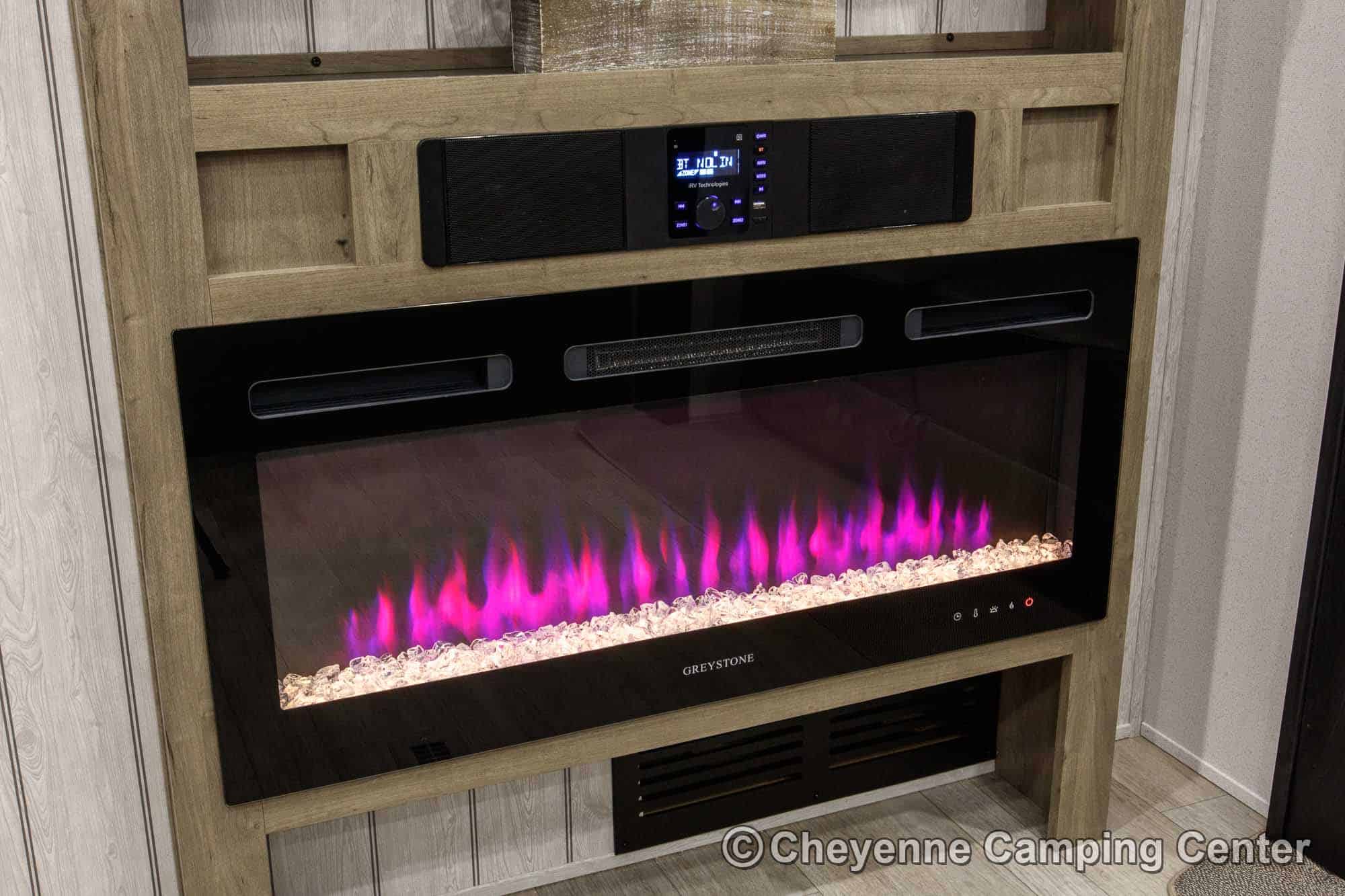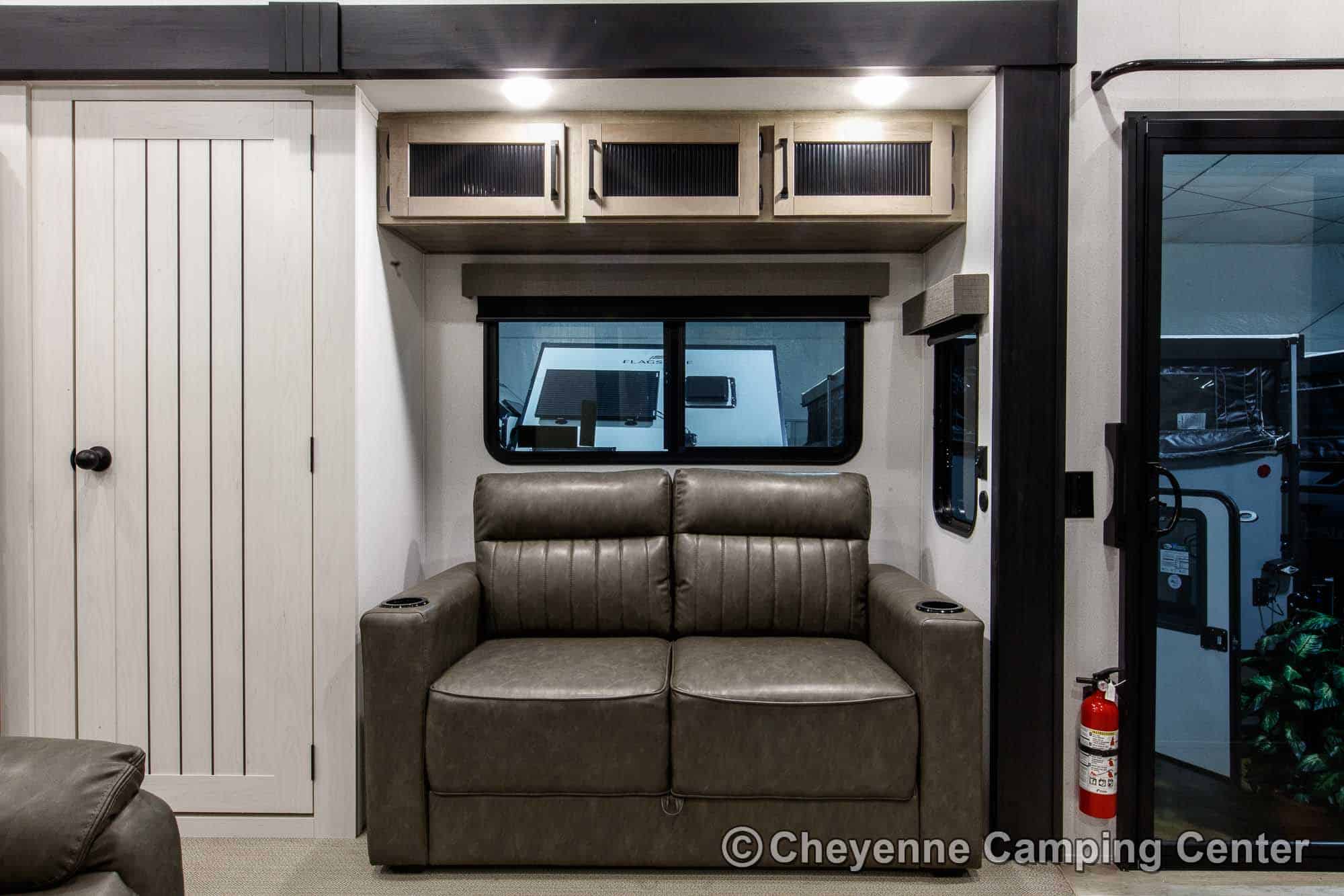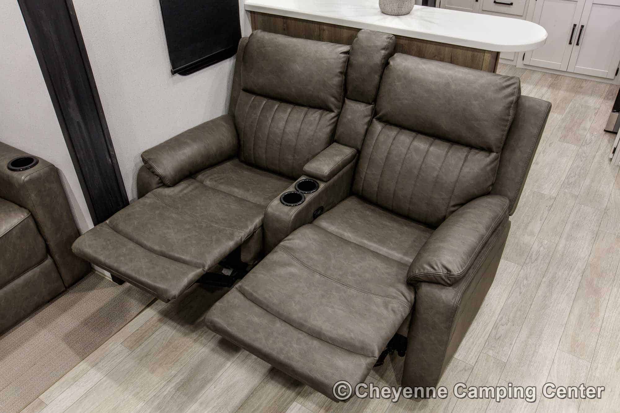 The living room is modern and functional, featuring dual opposing sofa sleepers, reclining theater seating, a 50″ Smart LED television, a Bluetooth soundbar stereo, and an electric fireplace with heat.