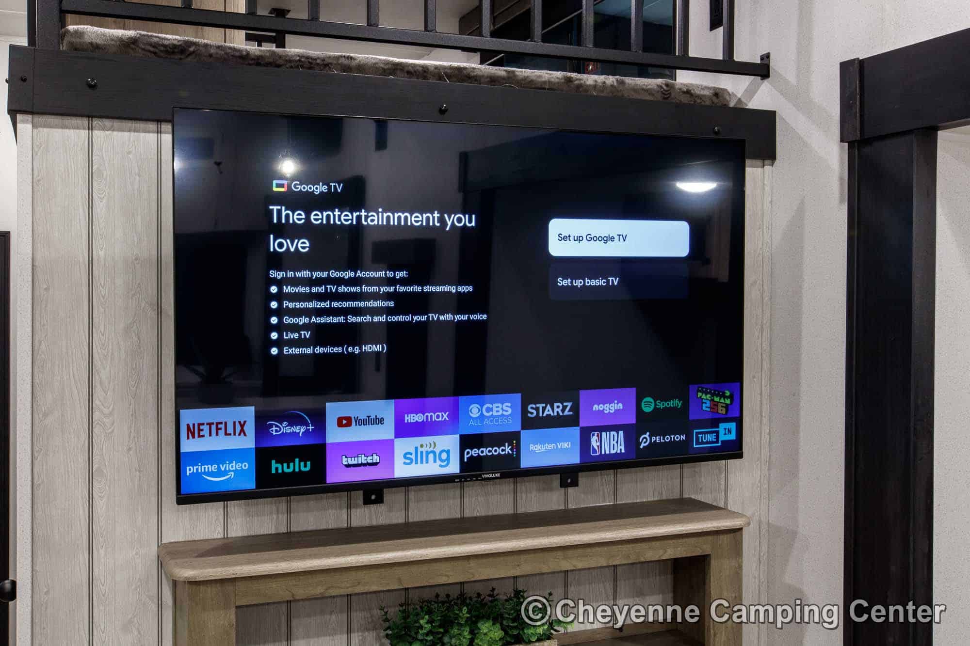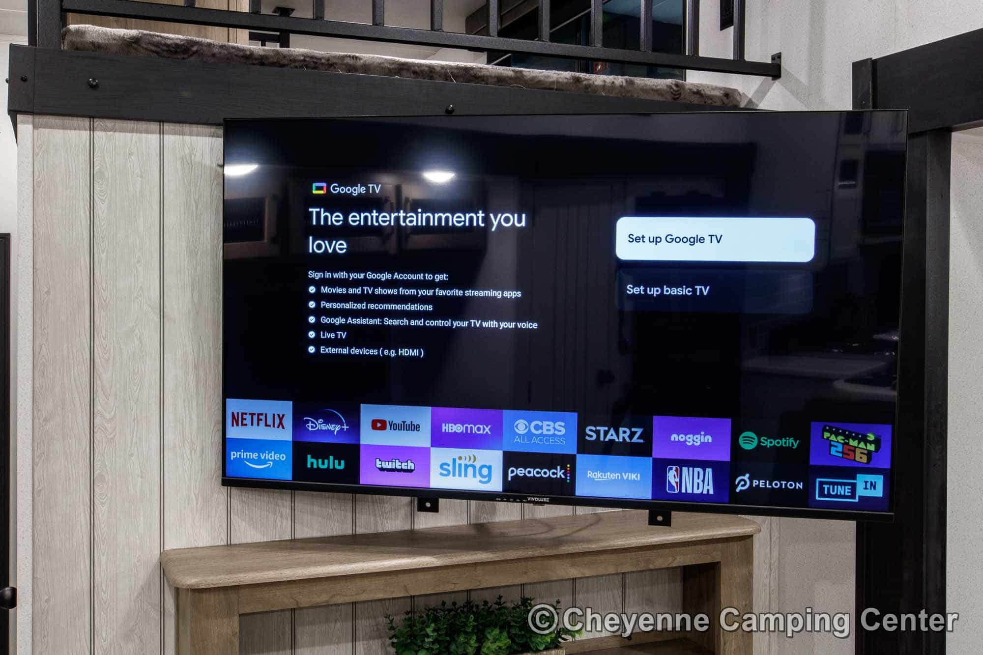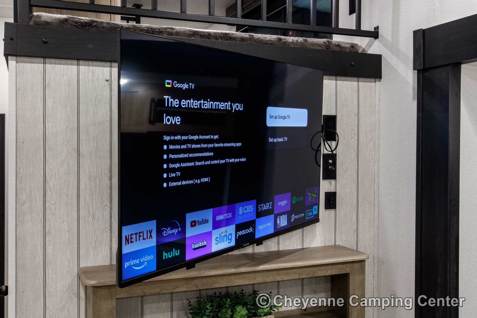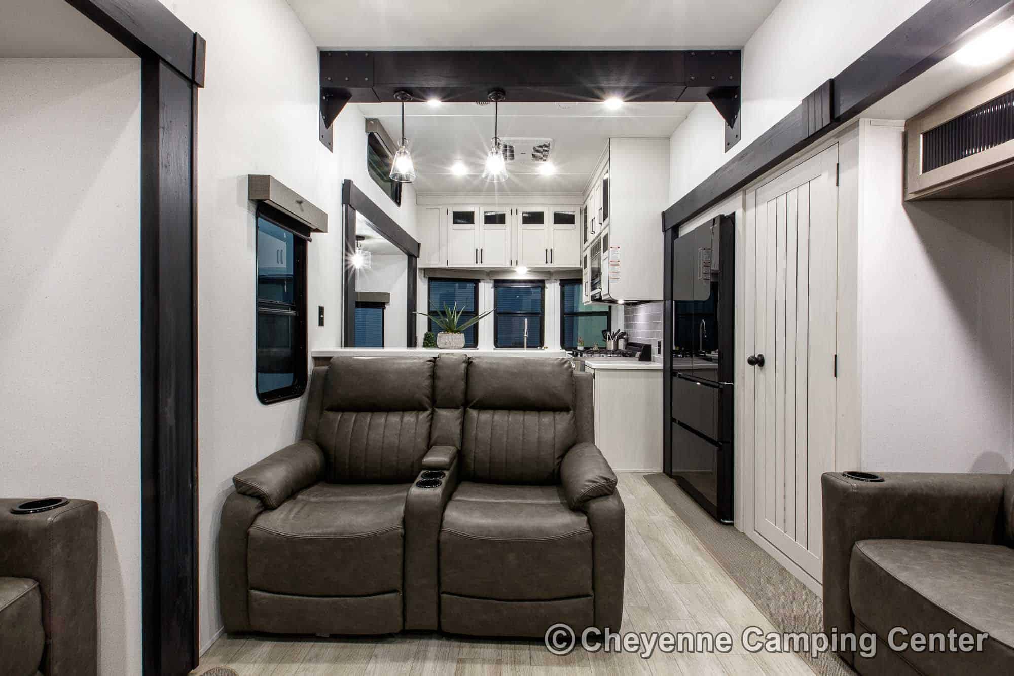 The living room is modern and functional, featuring dual opposing sofa sleepers, reclining theater seating, a 50″ Smart LED television, a Bluetooth soundbar stereo, and an electric fireplace with heat.