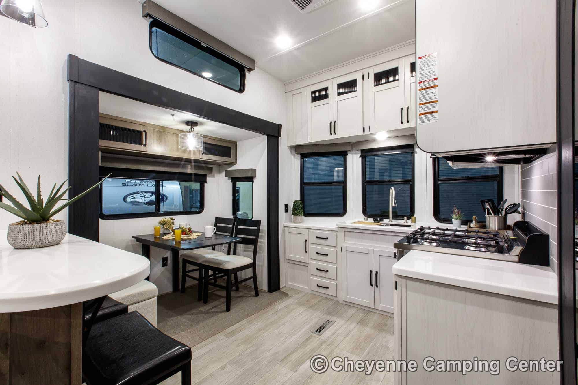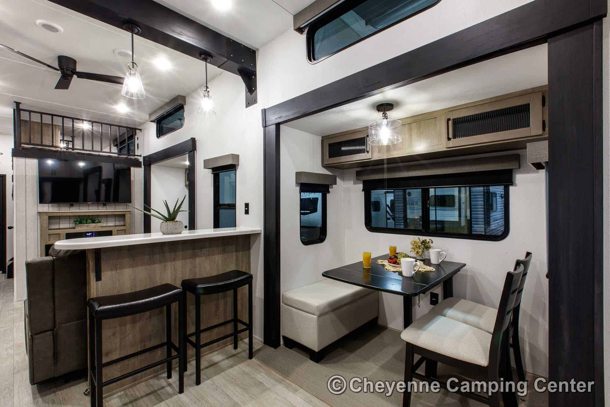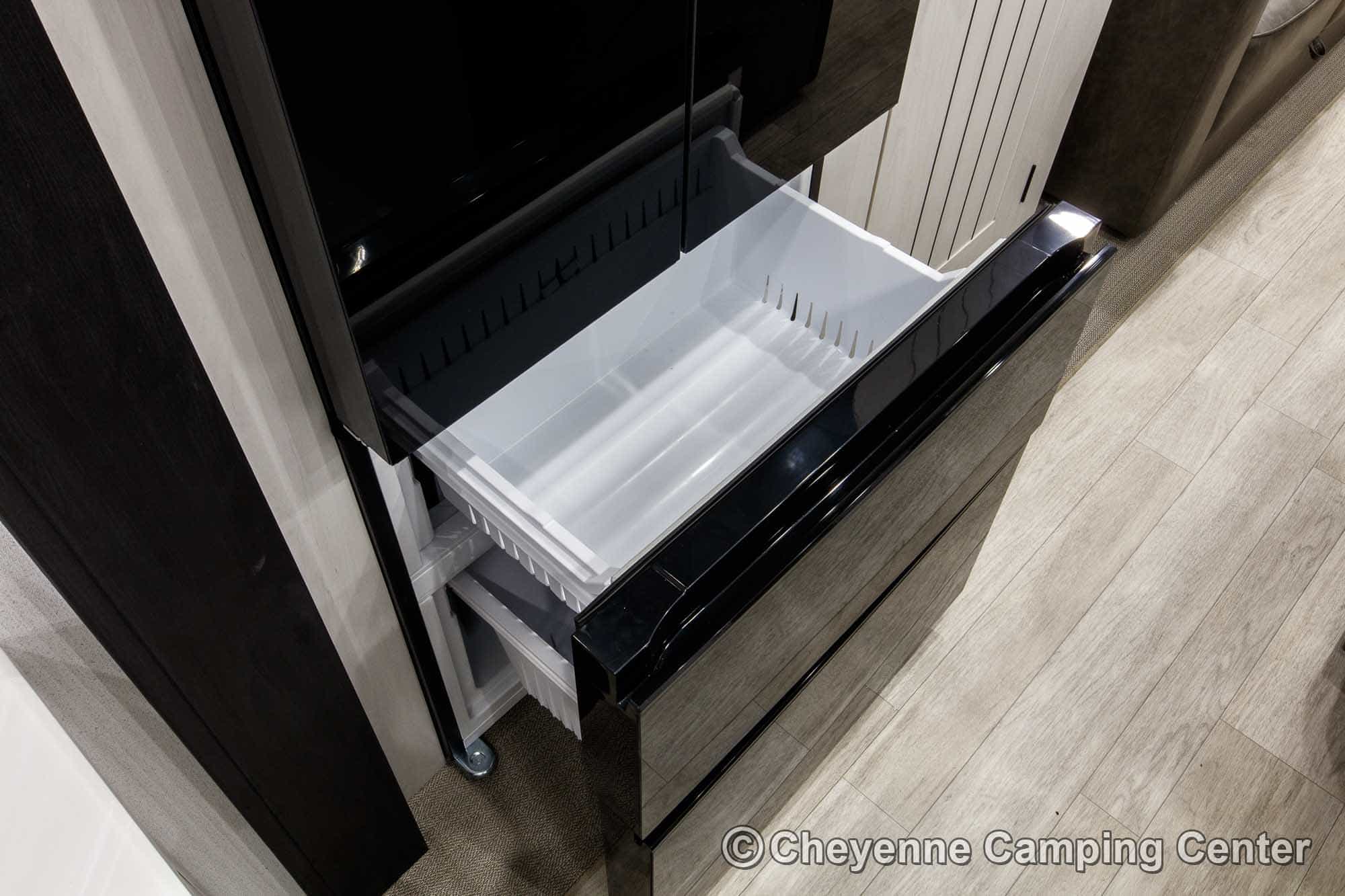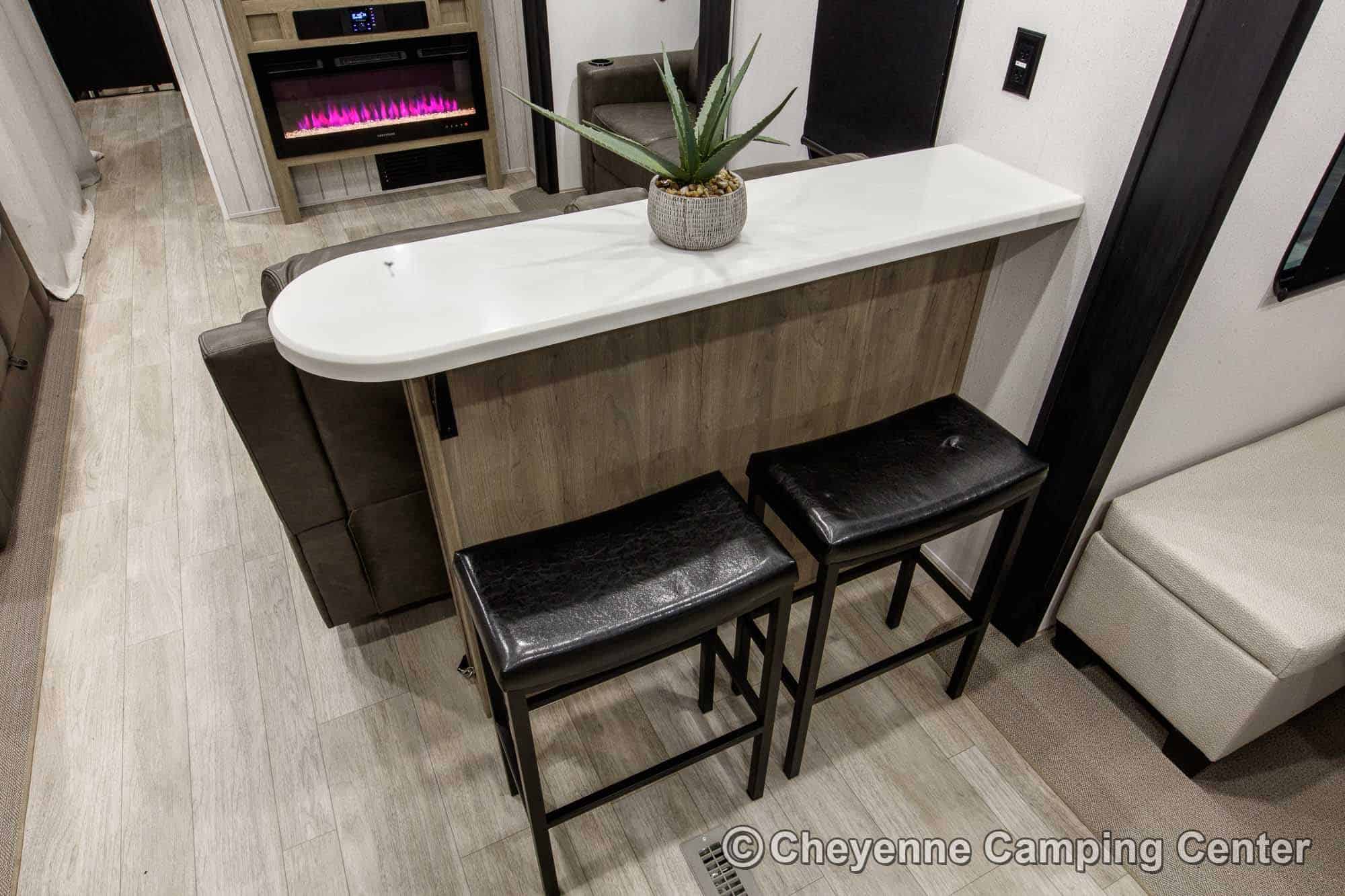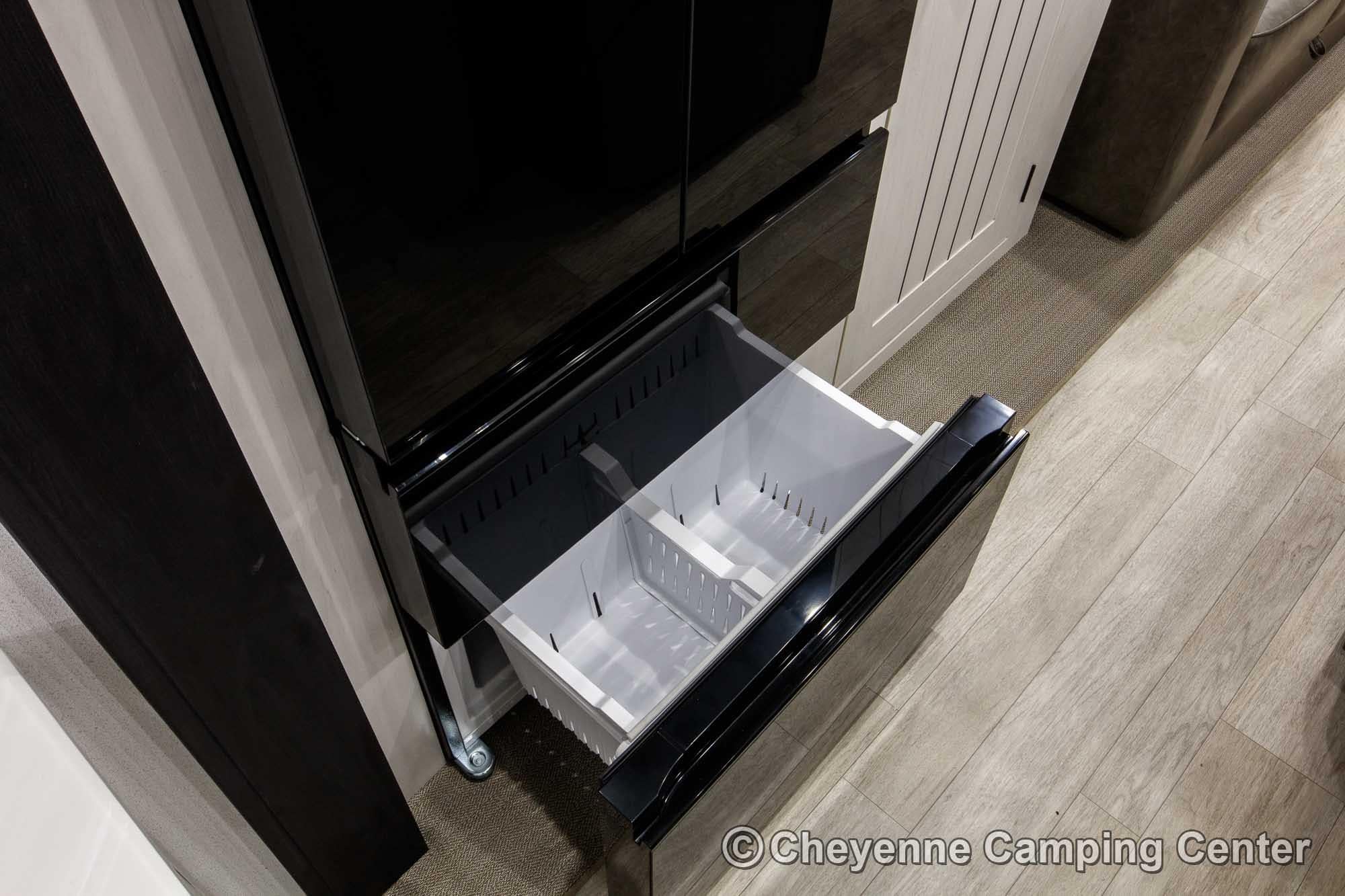 The interior of the 403LFT is absolutely beautiful, and the features and finishes are outstanding! The front kitchen has an undermount stainless steel workstation sink, a residential faucet, solid surface countertops, a free-standing dinette, breakfast bar, a 1.3 cu. ft. microwave, a four-burner LP gas range with oven, a 15 cu. ft. residential-style refrigerator, and ample storage, including a pantry and numerous drawers and cabinets.