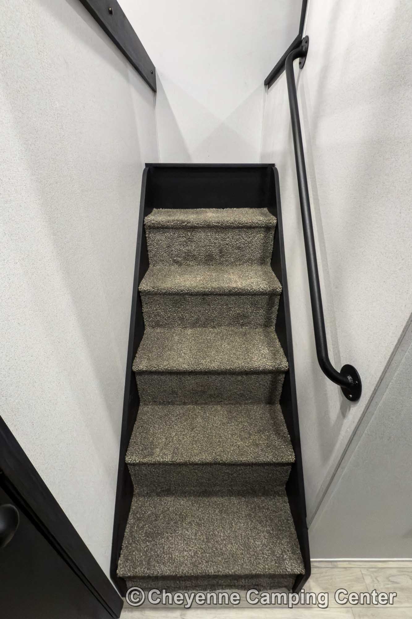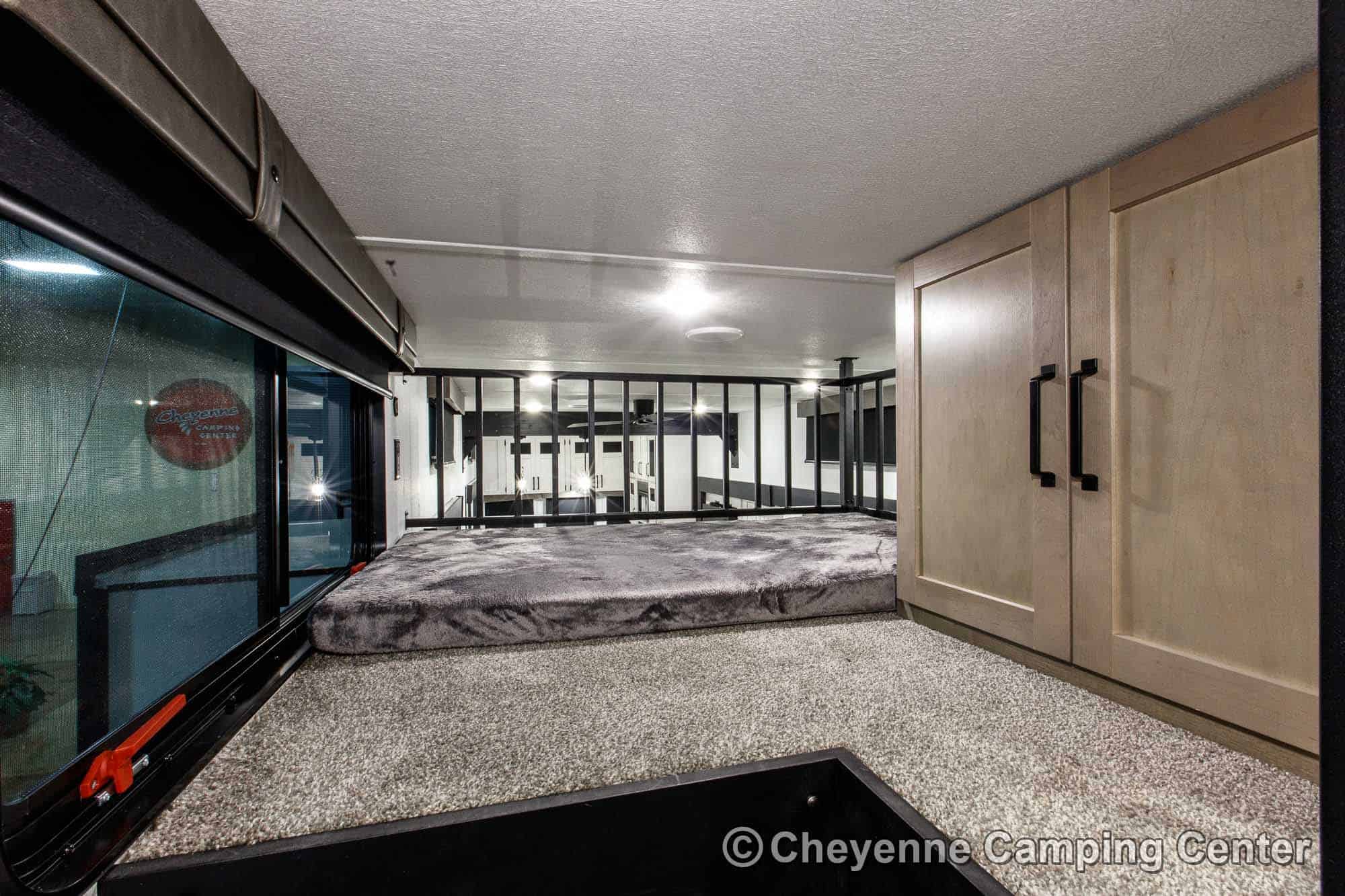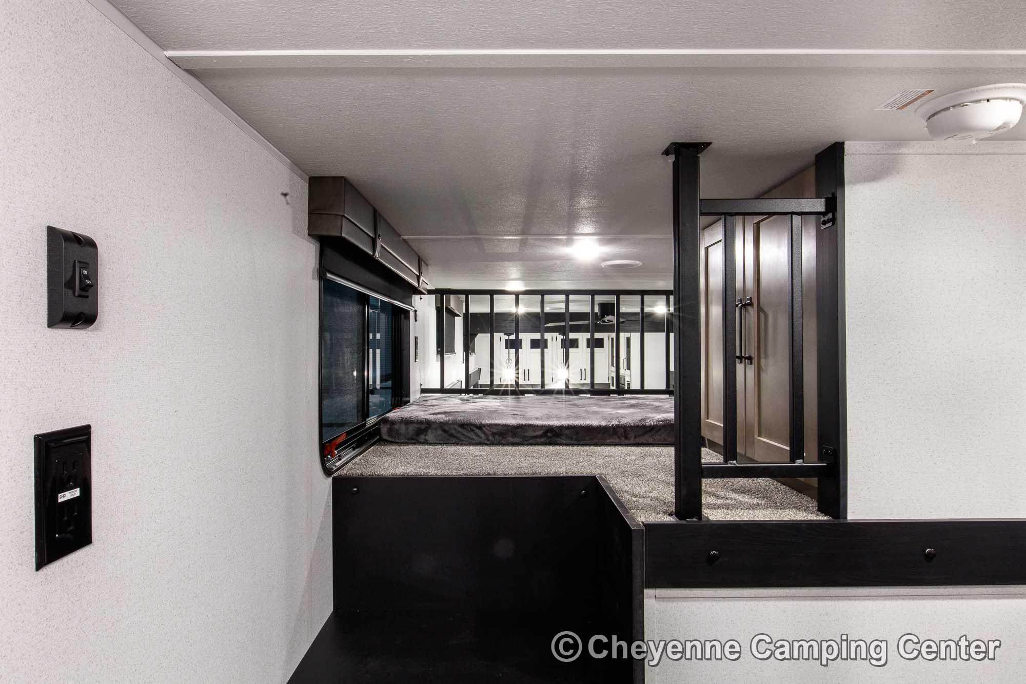 The side aisle bath will make you feel right at home with its quality fixtures, vanity, large walk-in shower with seat, vent fan, foot flush toilet, and linen closets. The rear slide-out bedroom features a king bed, a huge wardrobe, a washer/dryer in a dedicated closet, under-bed storage, and a desk for your convenience. The upstairs loft has two separate areas with storage and will sleep up to four.