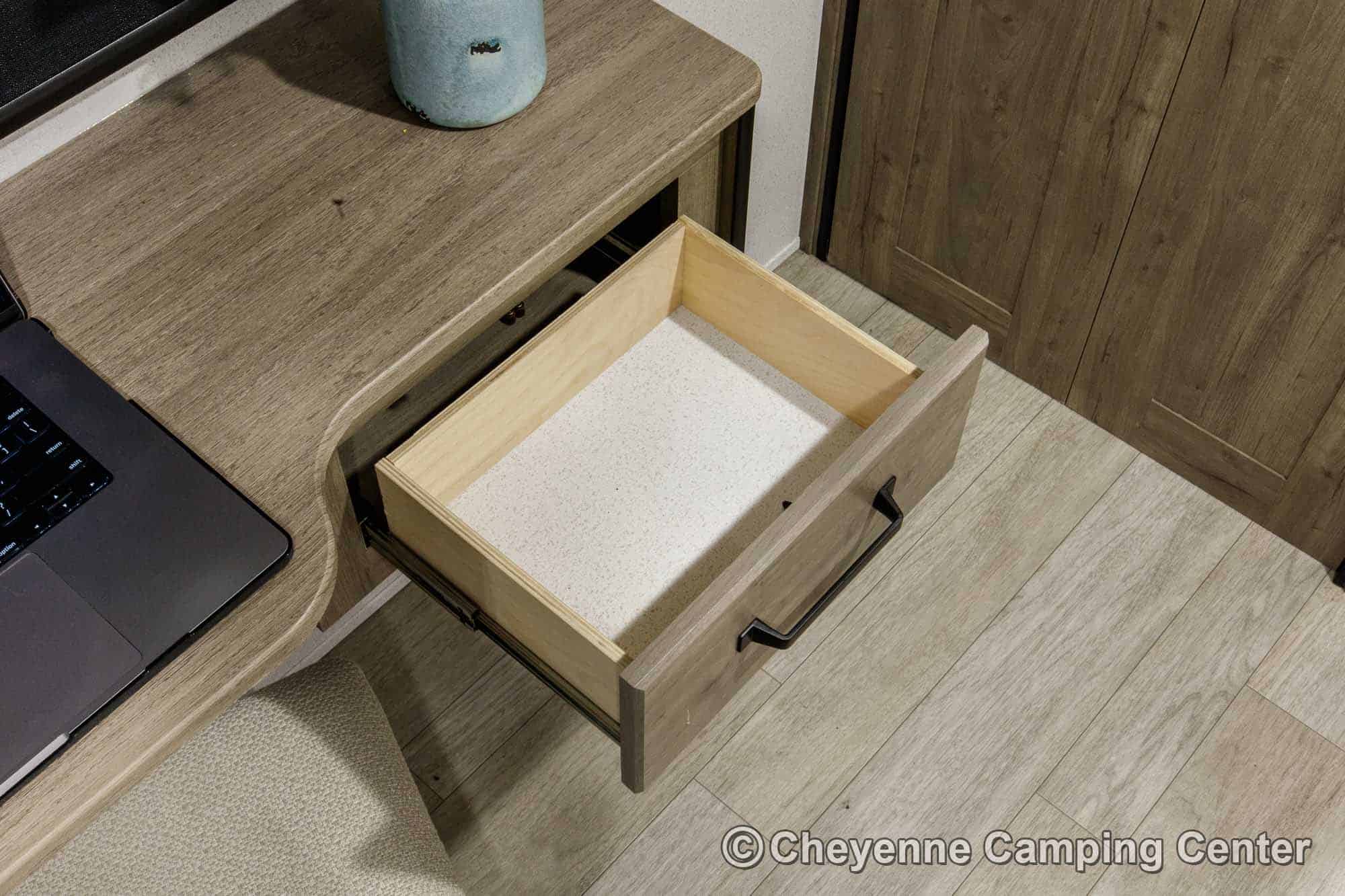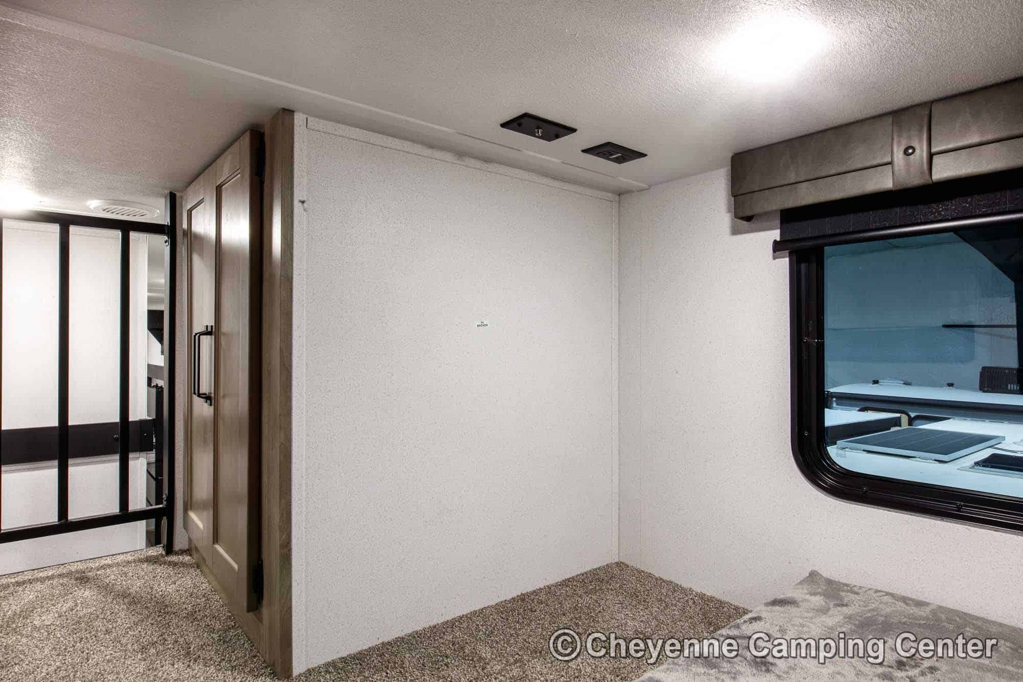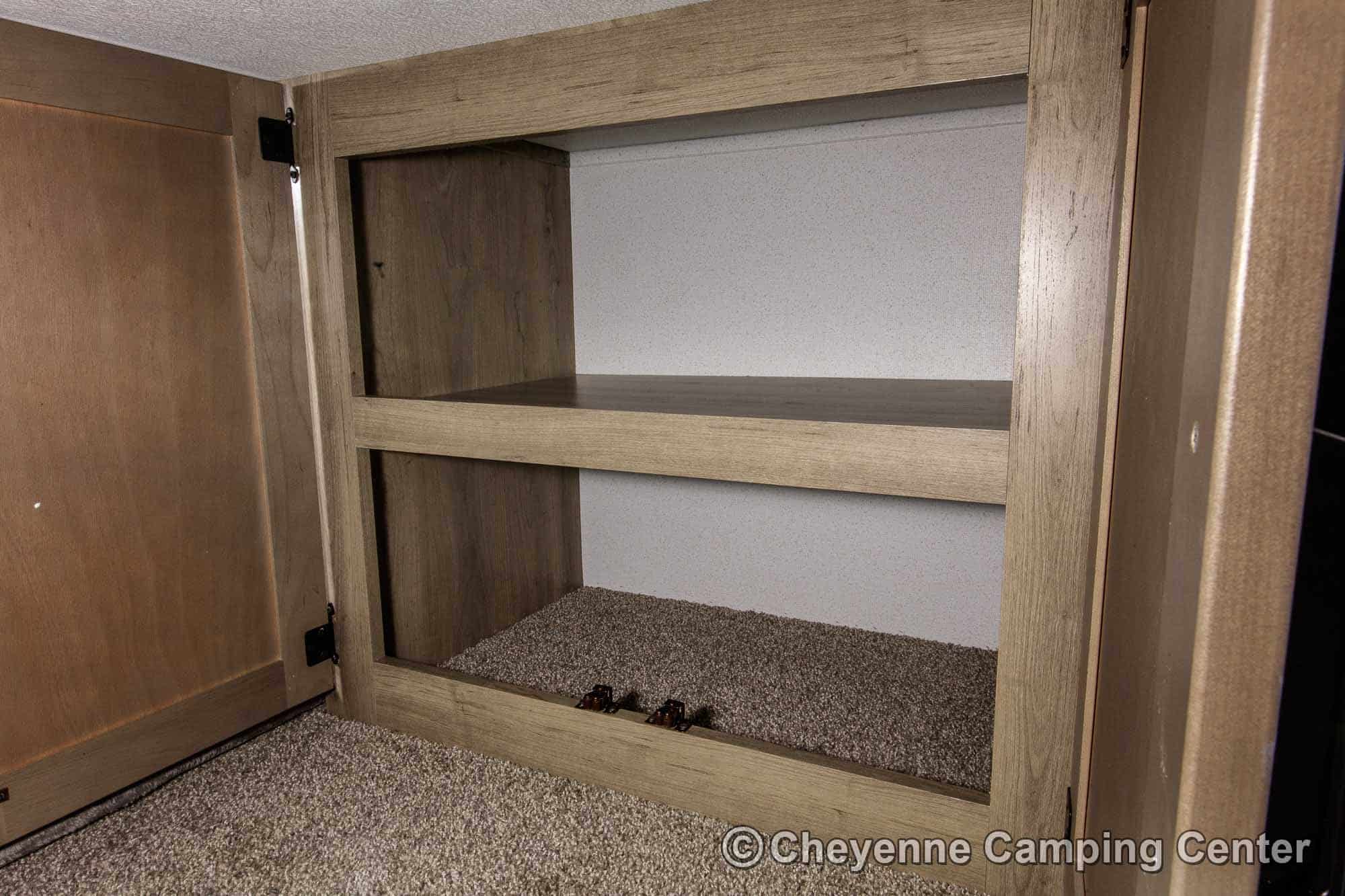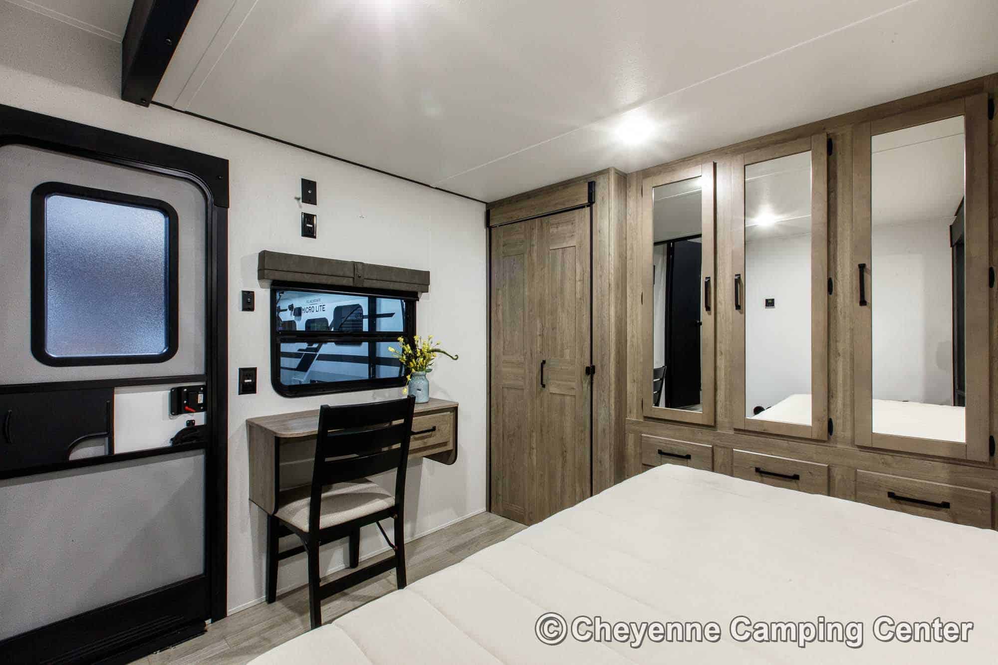 The side aisle bath will make you feel right at home with its quality fixtures, vanity, large walk-in shower with seat, vent fan, foot flush toilet, and linen closets. The rear slide-out bedroom features a king bed, a huge wardrobe, a washer/dryer in a dedicated closet, under-bed storage, and a desk for your convenience. The upstairs loft has two separate areas with storage and will sleep up to four.