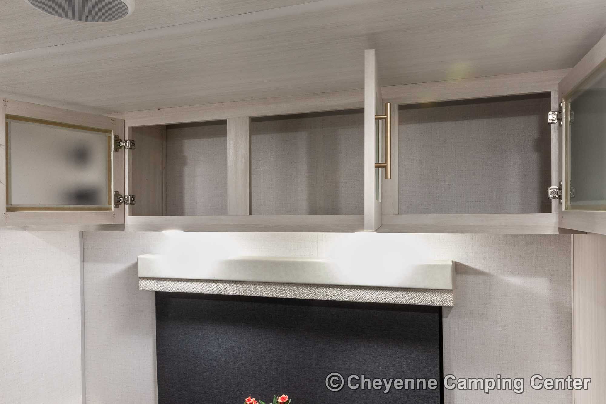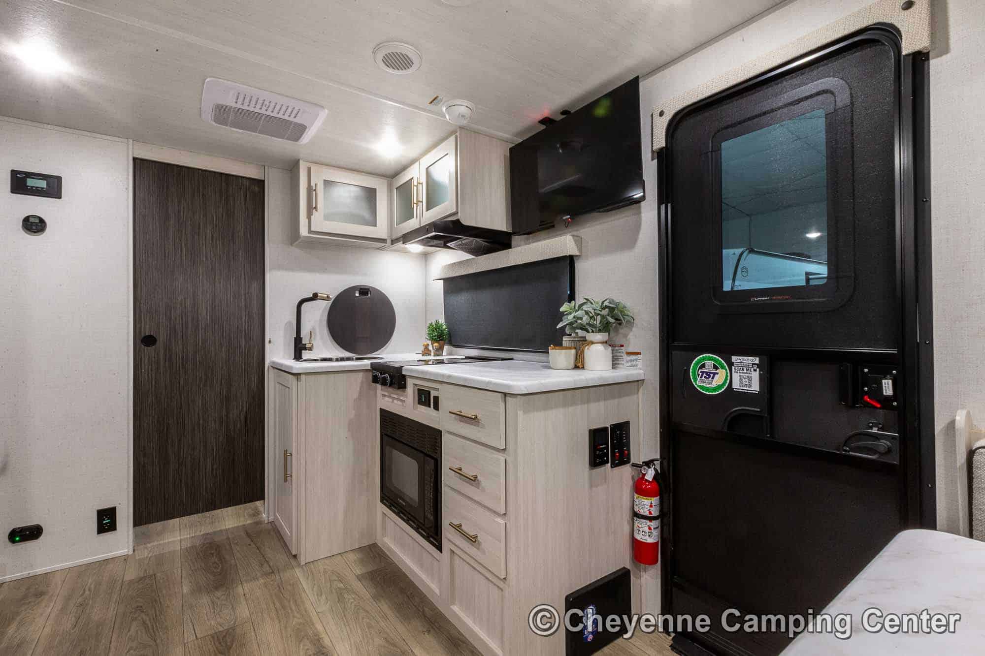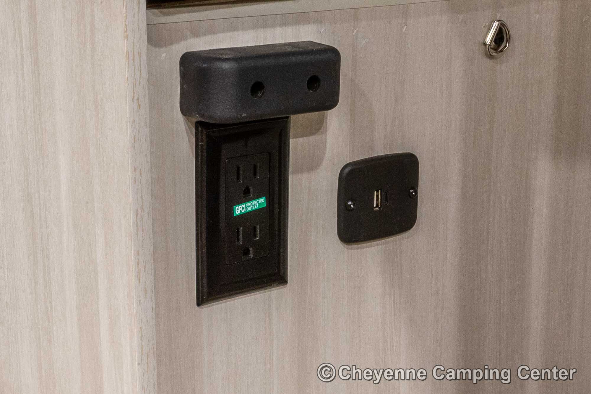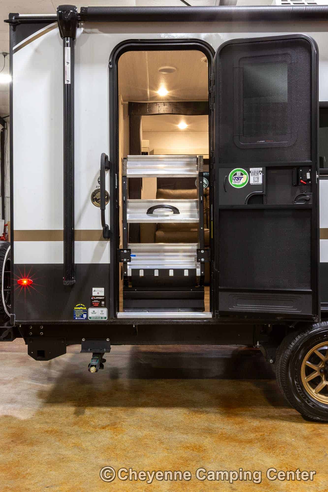 Outside, it’s adventure-ready with a 200-watt solar panel, 13’ power awning with LED lighting, MORryde entry steps, a side-mounted gas griddle, a tankless water heater, black tank flush, front pass-thru storage, a power tongue jack, and Goodyear tires with a TST tire pressure monitoring system.