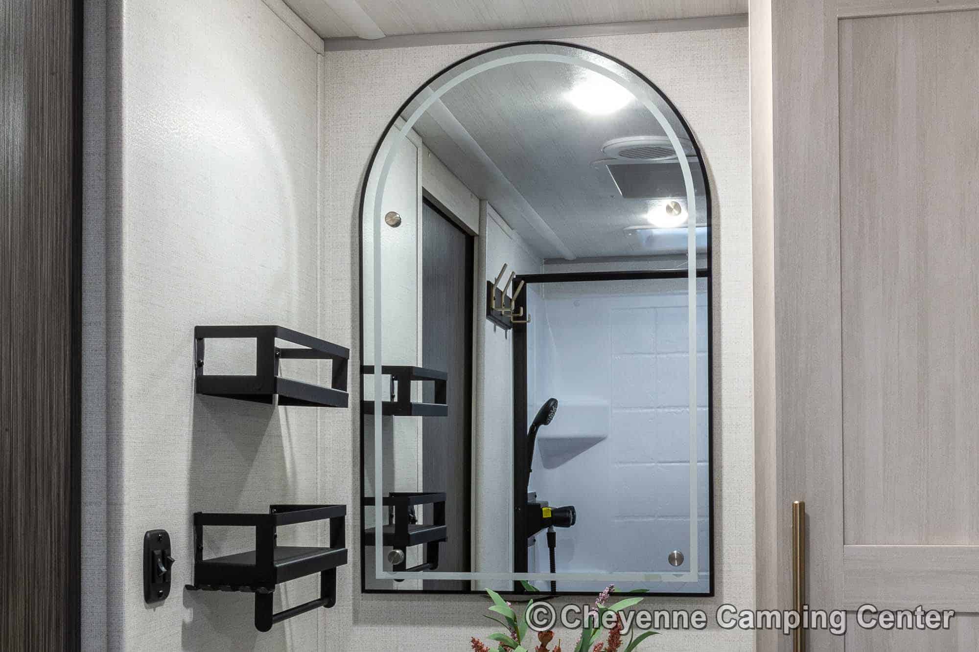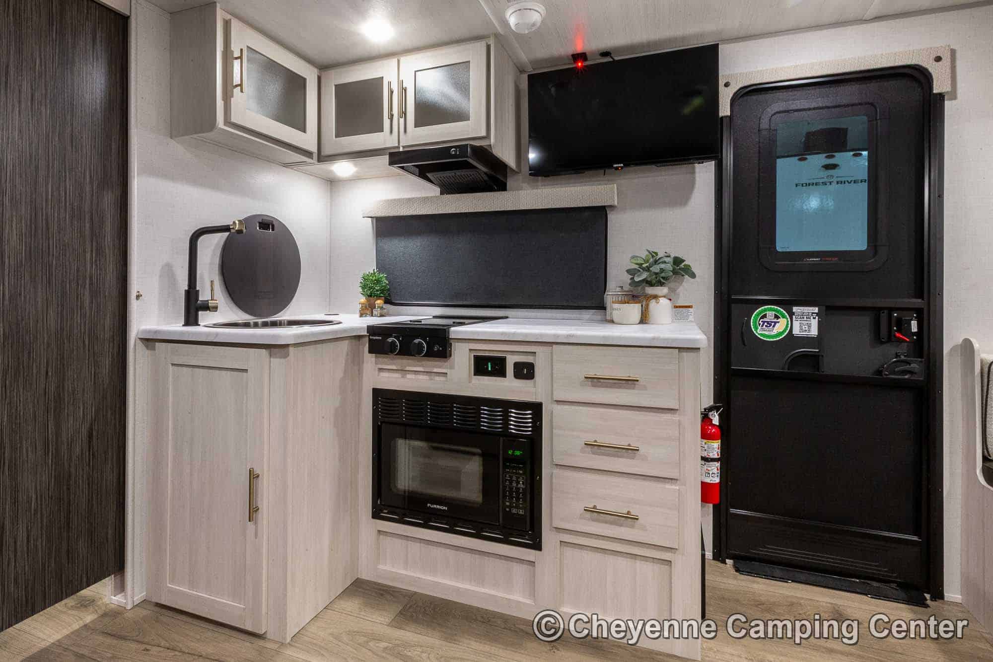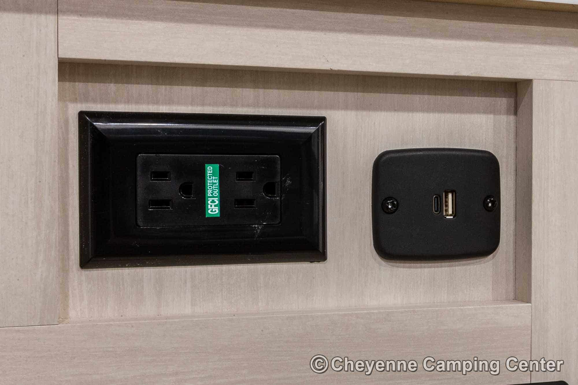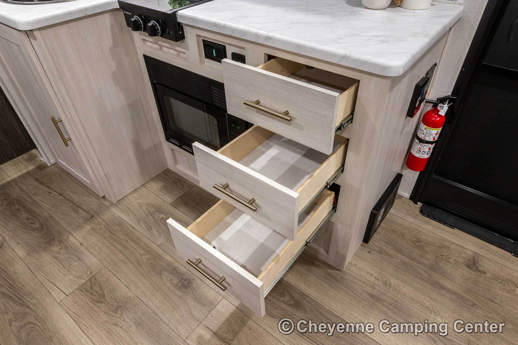 Outside, it’s adventure-ready with a 200-watt solar panel, 13’ power awning with LED lighting, MORryde entry steps, a side-mounted gas griddle, a tankless water heater, black tank flush, front pass-thru storage, a power tongue jack, and Goodyear tires with a TST tire pressure monitoring system.