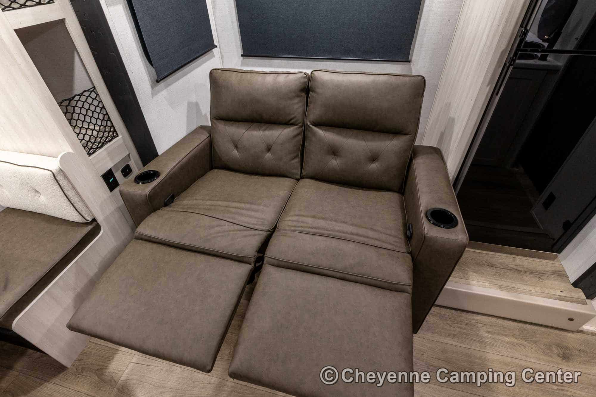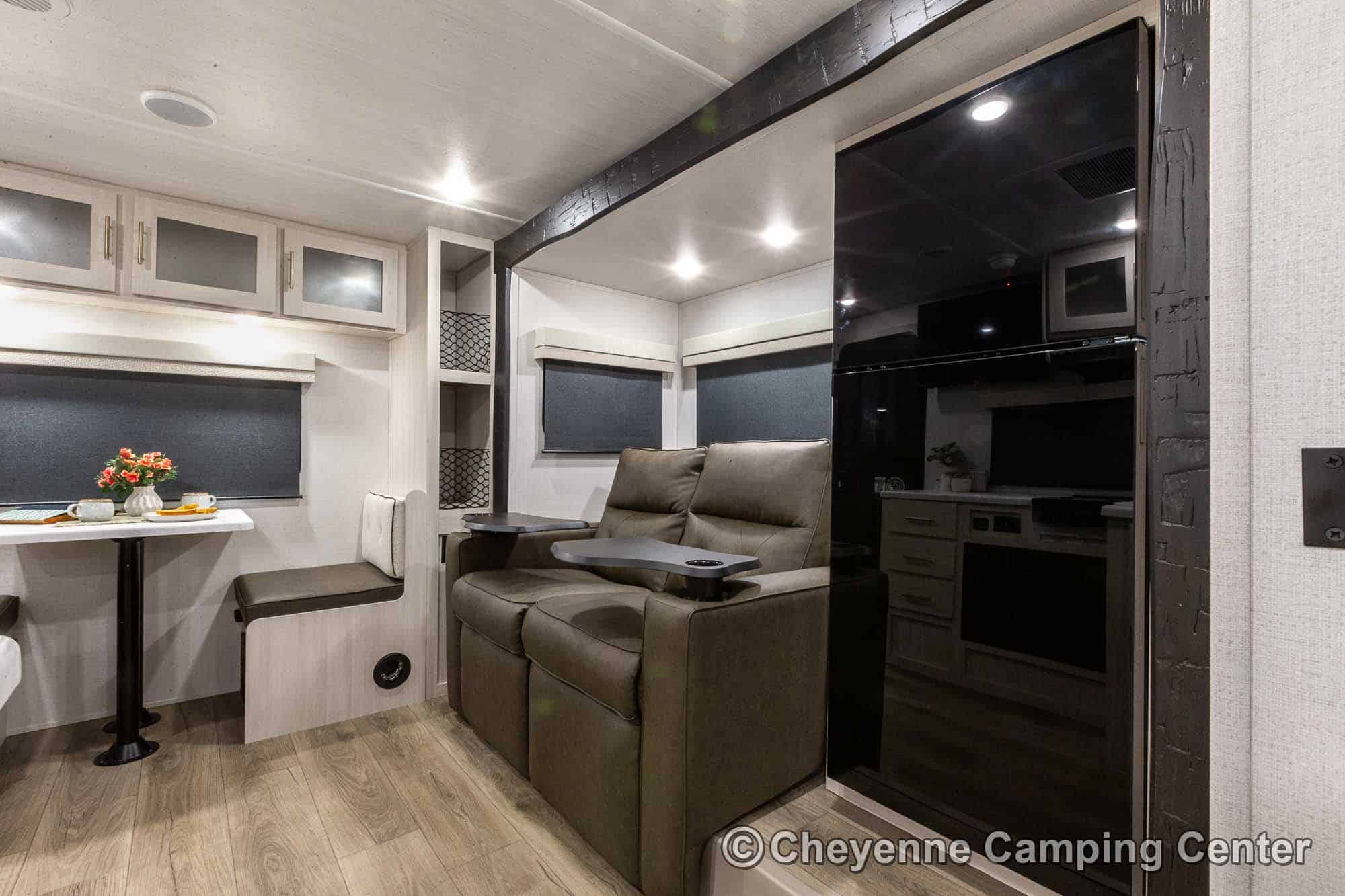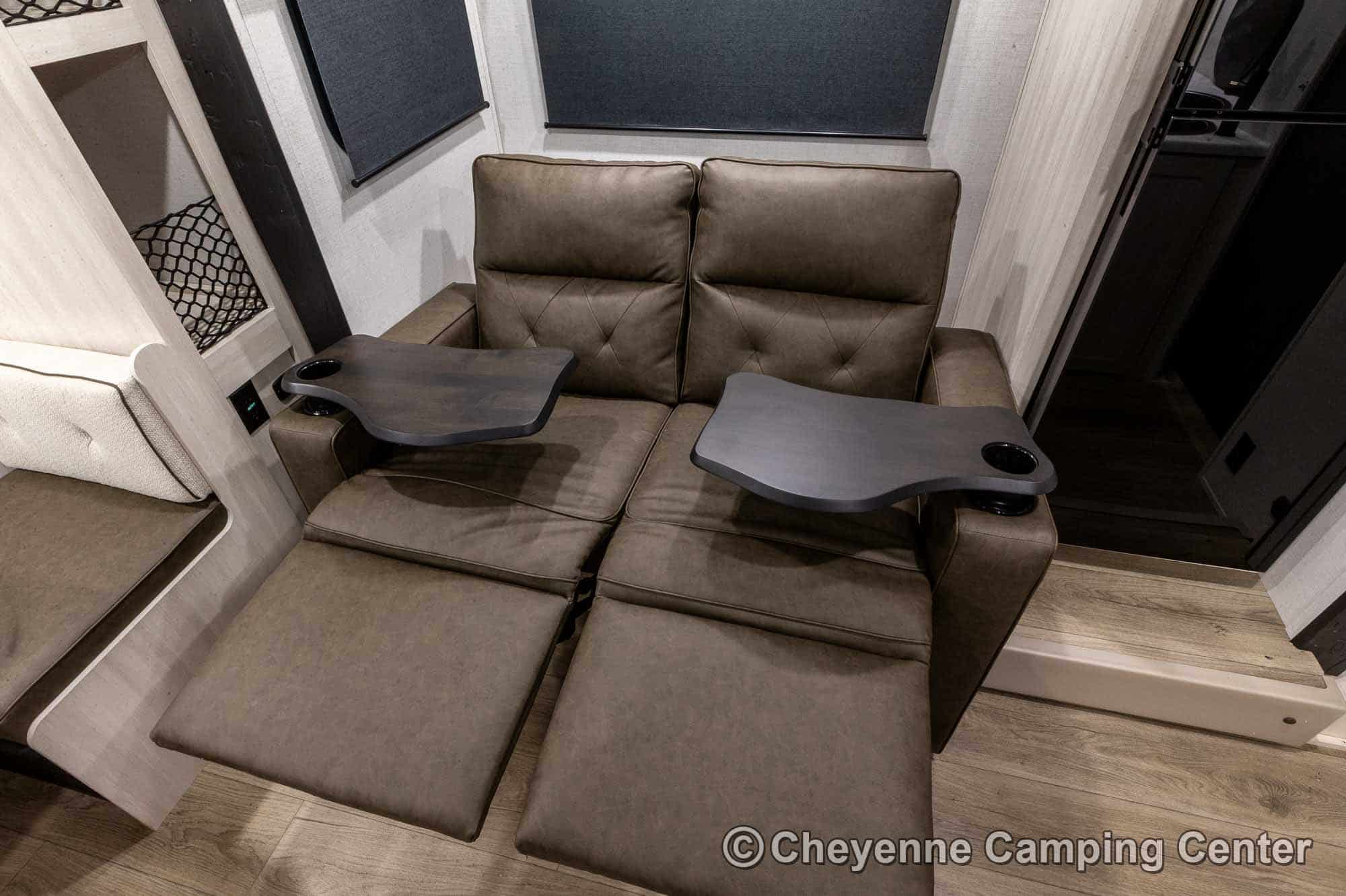 Inside, comfort meets convenience with a rear convertible dinette, reclining theater seats with removable tables, a full kitchen featuring a convection/microwave oven, cooktop, large 12V refrigerator, residential-style faucet, and pantry. The spacious bathroom offers a shower with skylight, linen closet, vanity, foot-flush toilet, and a premium vent fan.