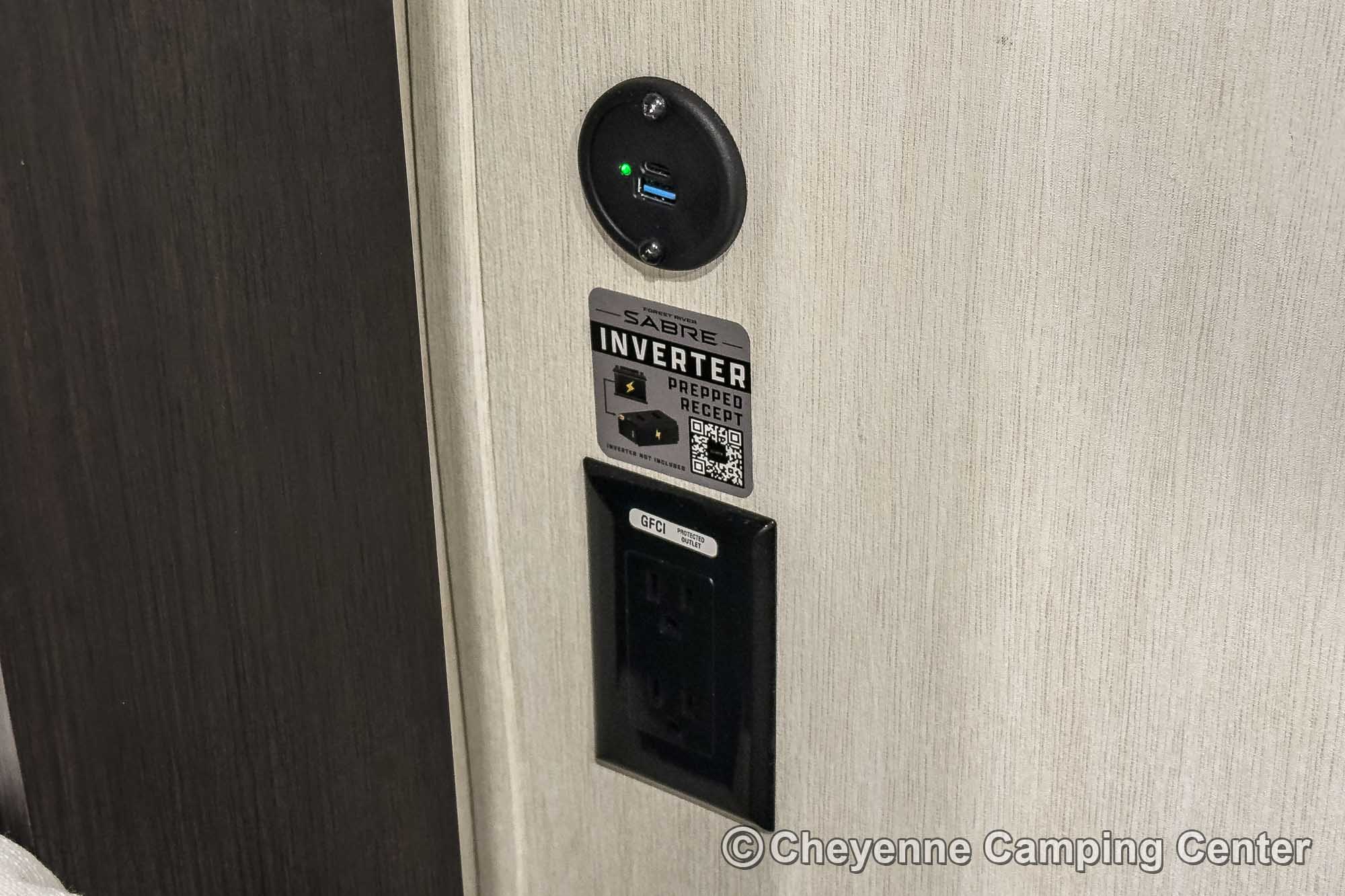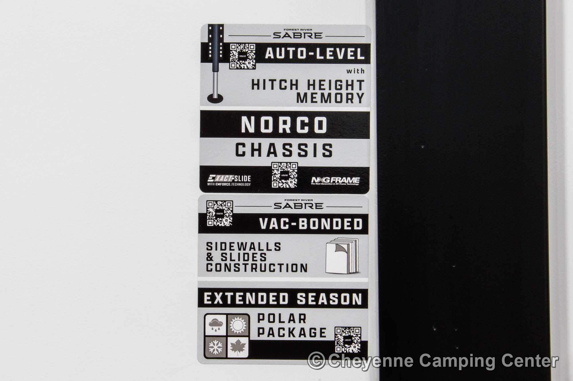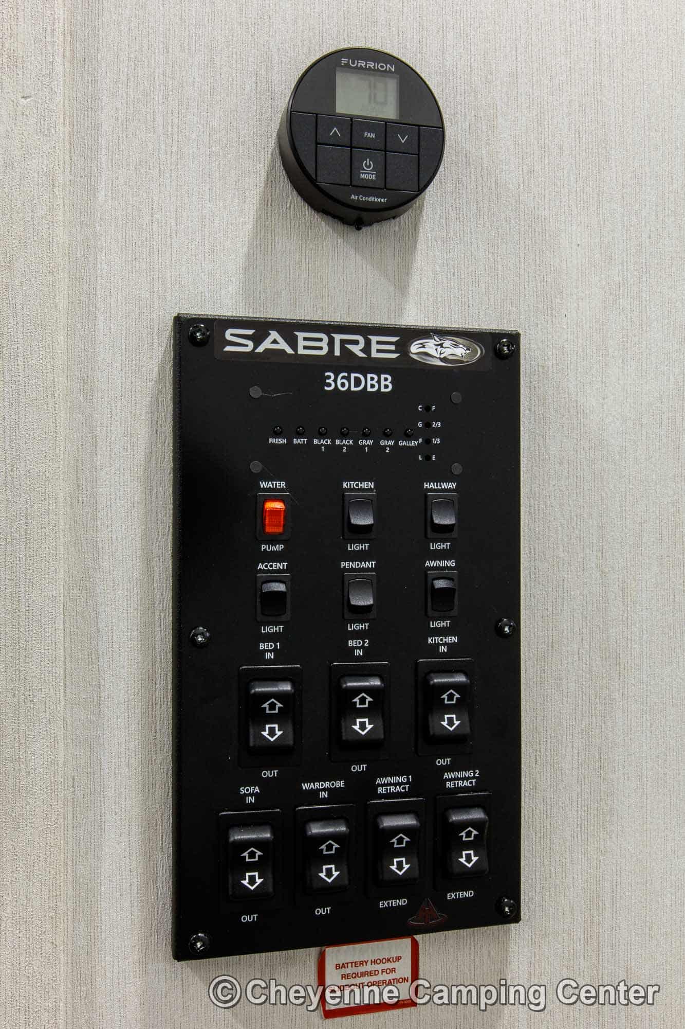 The Sabre 36DBB also features LED lighting, black tank flush, day/night Zebra shades, wood core cabinetry, dual 15K BTU whisper quiet air conditioners, a tankless water heater, ambient accent lighting, Slam Latch cargo doors, an enclosed and heated underbelly, battery disconnect, a one-year manufacturer’s warranty, and one-year roadside assistance.