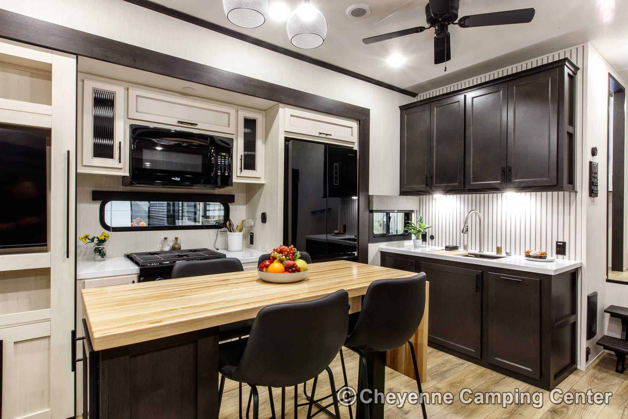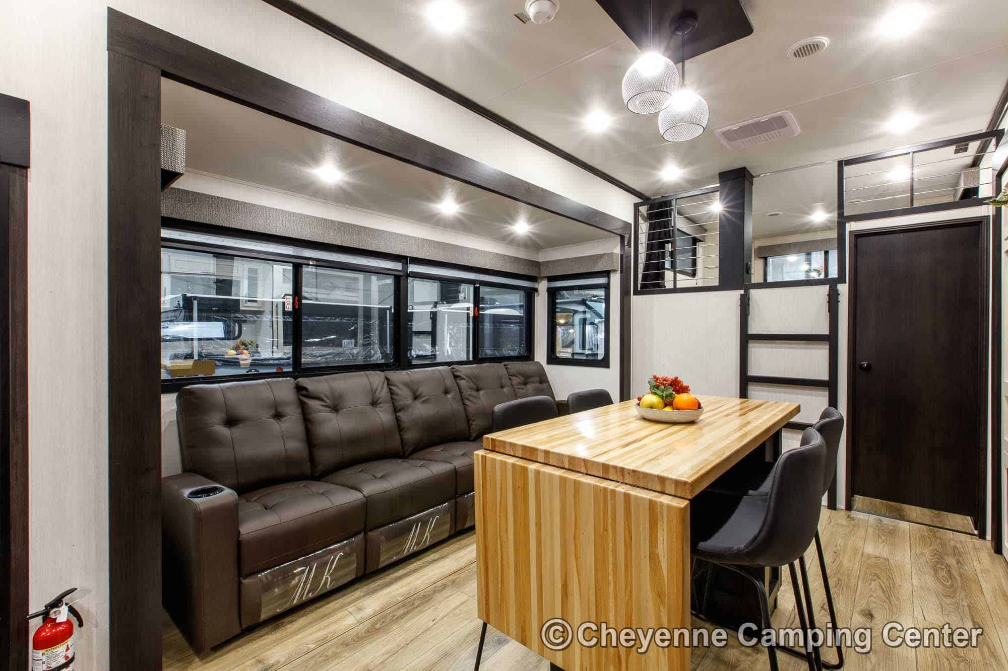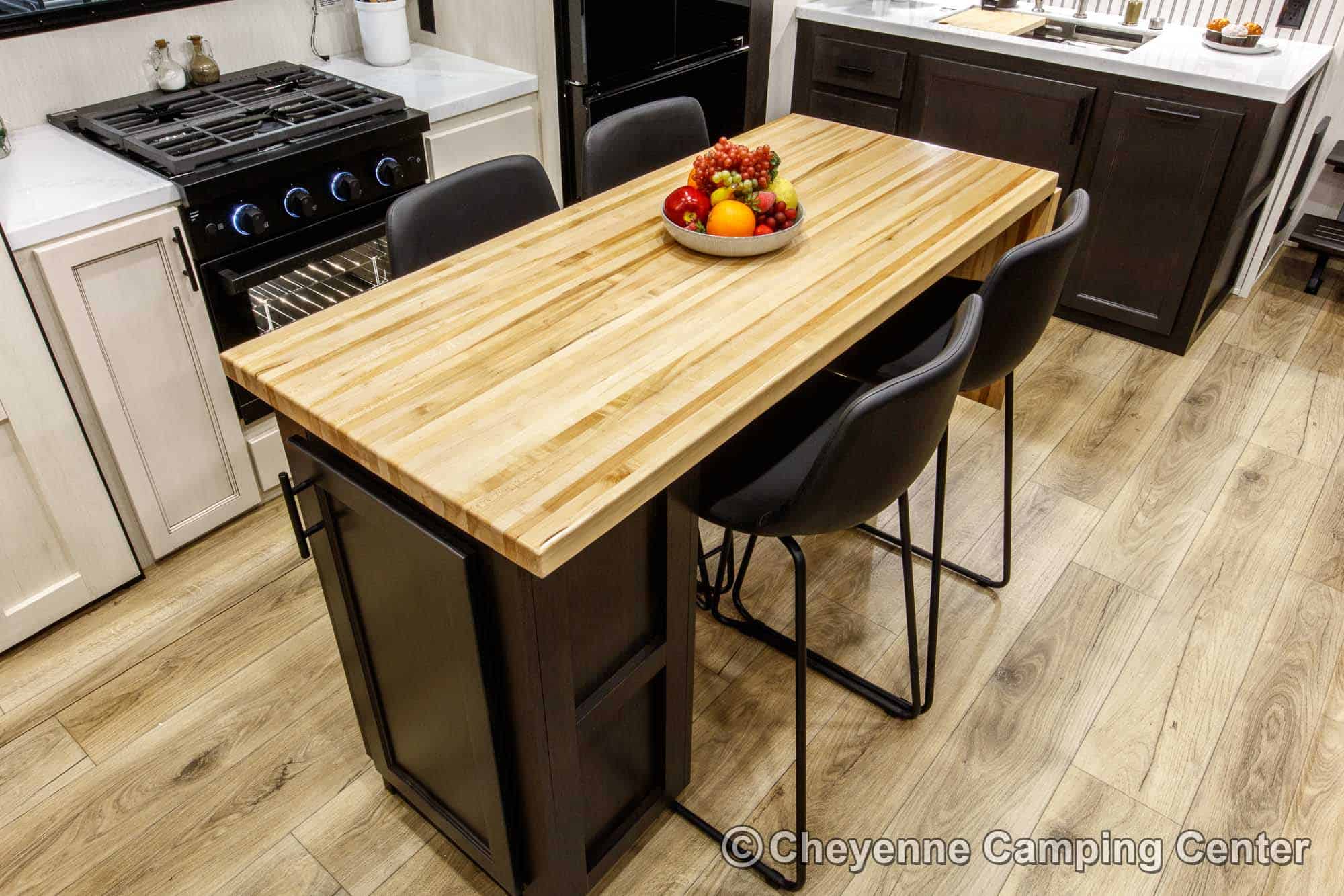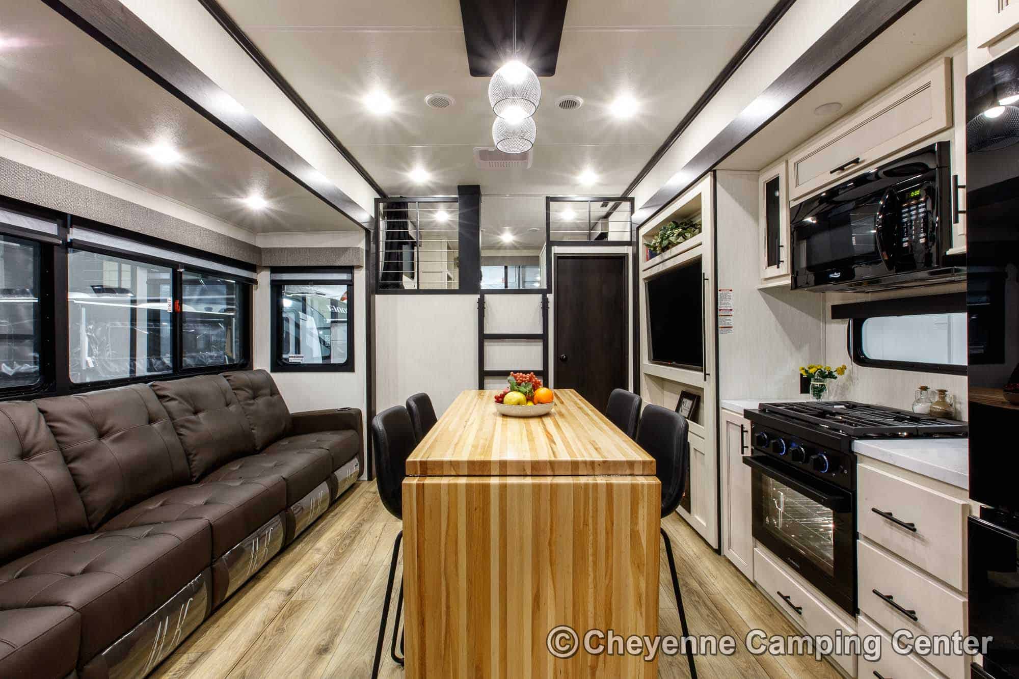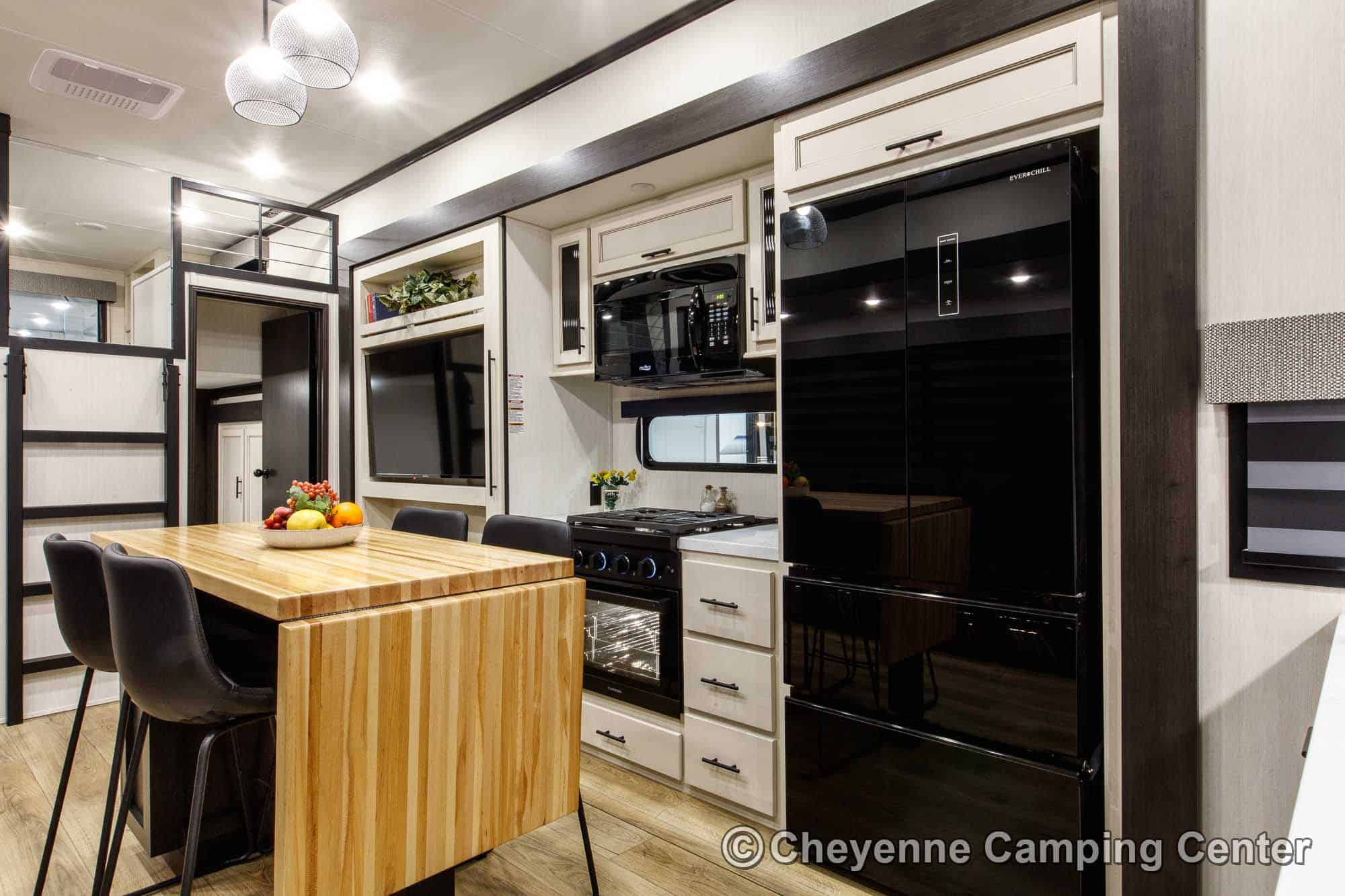 Step inside the 36DBB and prepare to be impressed. This two bedroom fifth wheel delivers the features and finishes of a luxury coach at an affordable price. The stunning kitchen is designed for both style and functionality, featuring a butcher-block dining island with four chairs and an extension, solid-surface countertops, and abundant counter space. You’ll have plenty of storage with numerous cabinets, drawers, and a huge hidden pantry cleverly tucked behind the entertainment center. Cooking is a breeze with a large oven, microwave/convection oven combo, residential-style refrigerator, workstation sink, and a full-size pull-out trash can that adds everyday convenience.