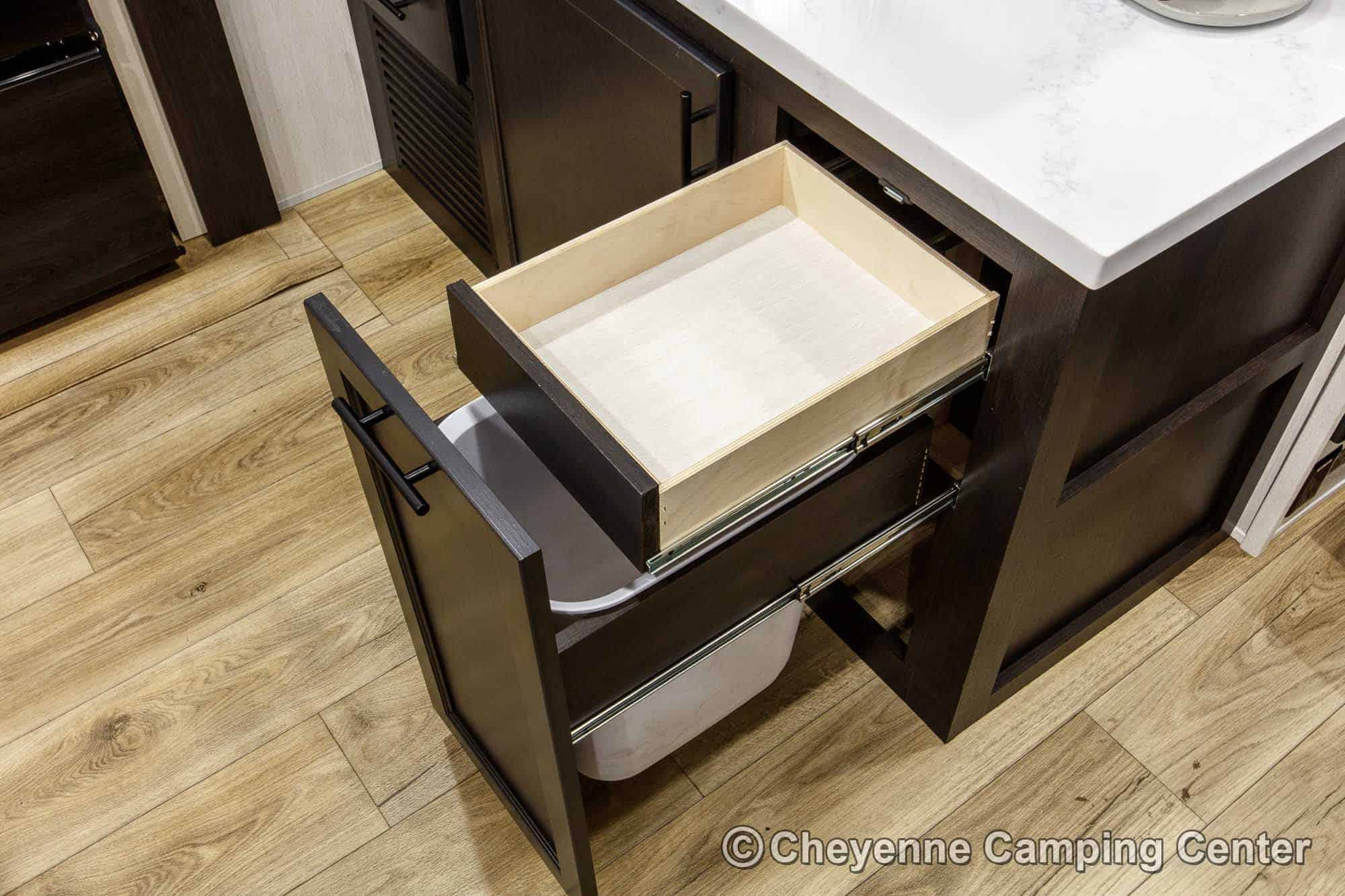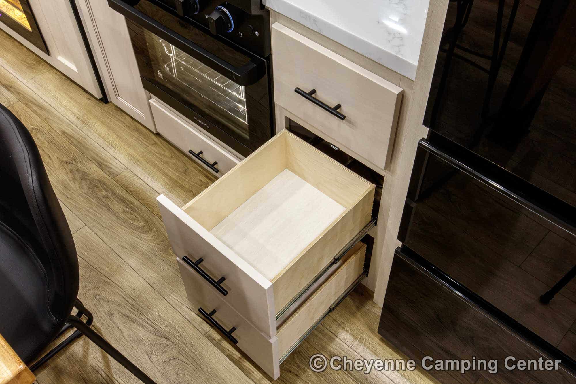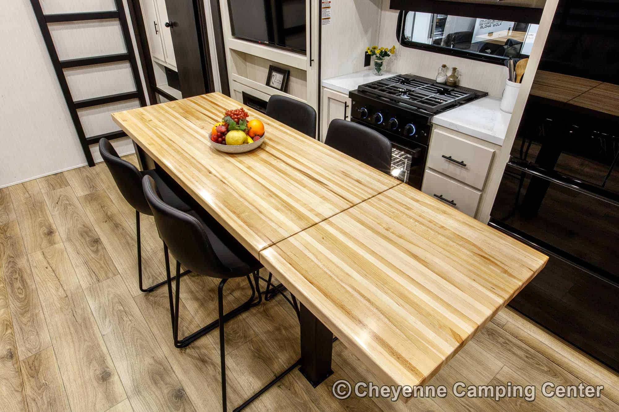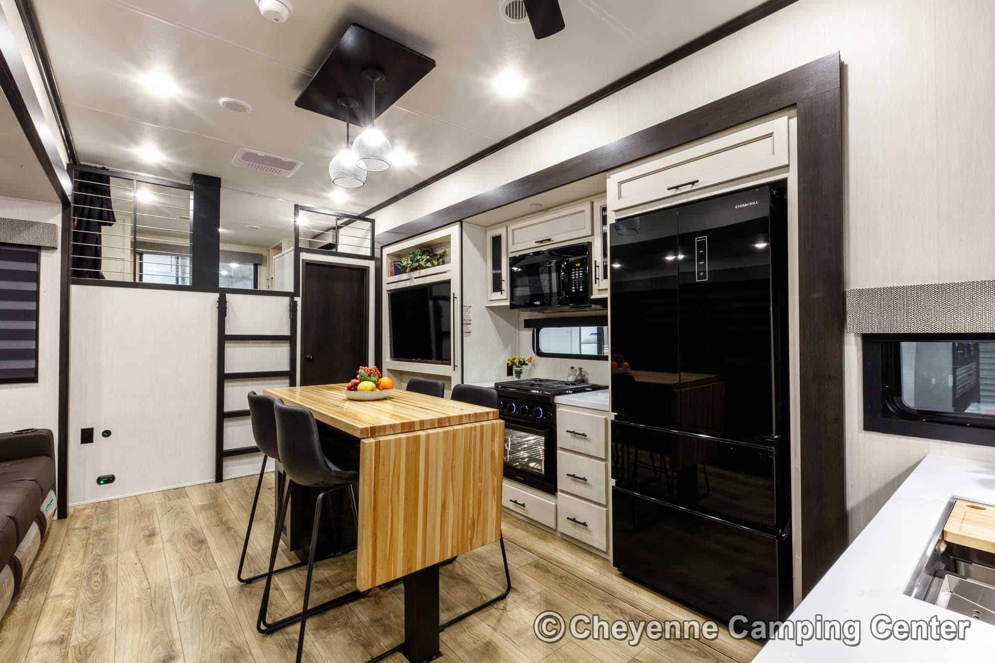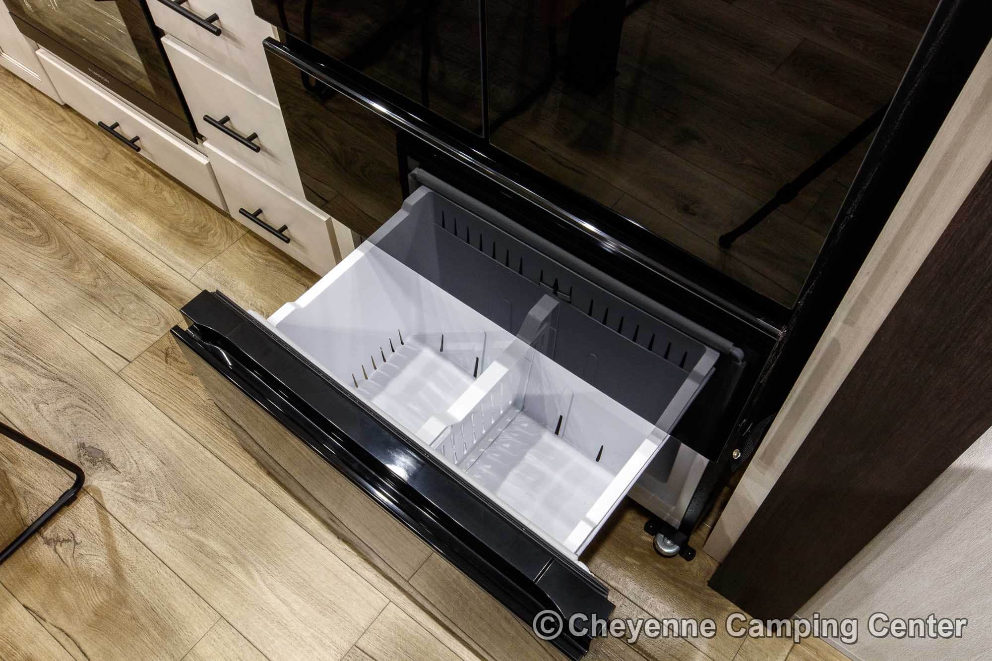 Step inside the 36DBB and prepare to be impressed. This two bedroom fifth wheel delivers the features and finishes of a luxury coach at an affordable price. The stunning kitchen is designed for both style and functionality, featuring a butcher-block dining island with four chairs and an extension, solid-surface countertops, and abundant counter space. You’ll have plenty of storage with numerous cabinets, drawers, and a huge hidden pantry cleverly tucked behind the entertainment center. Cooking is a breeze with a large oven, microwave/convection oven combo, residential-style refrigerator, workstation sink, and a full-size pull-out trash can that adds everyday convenience.