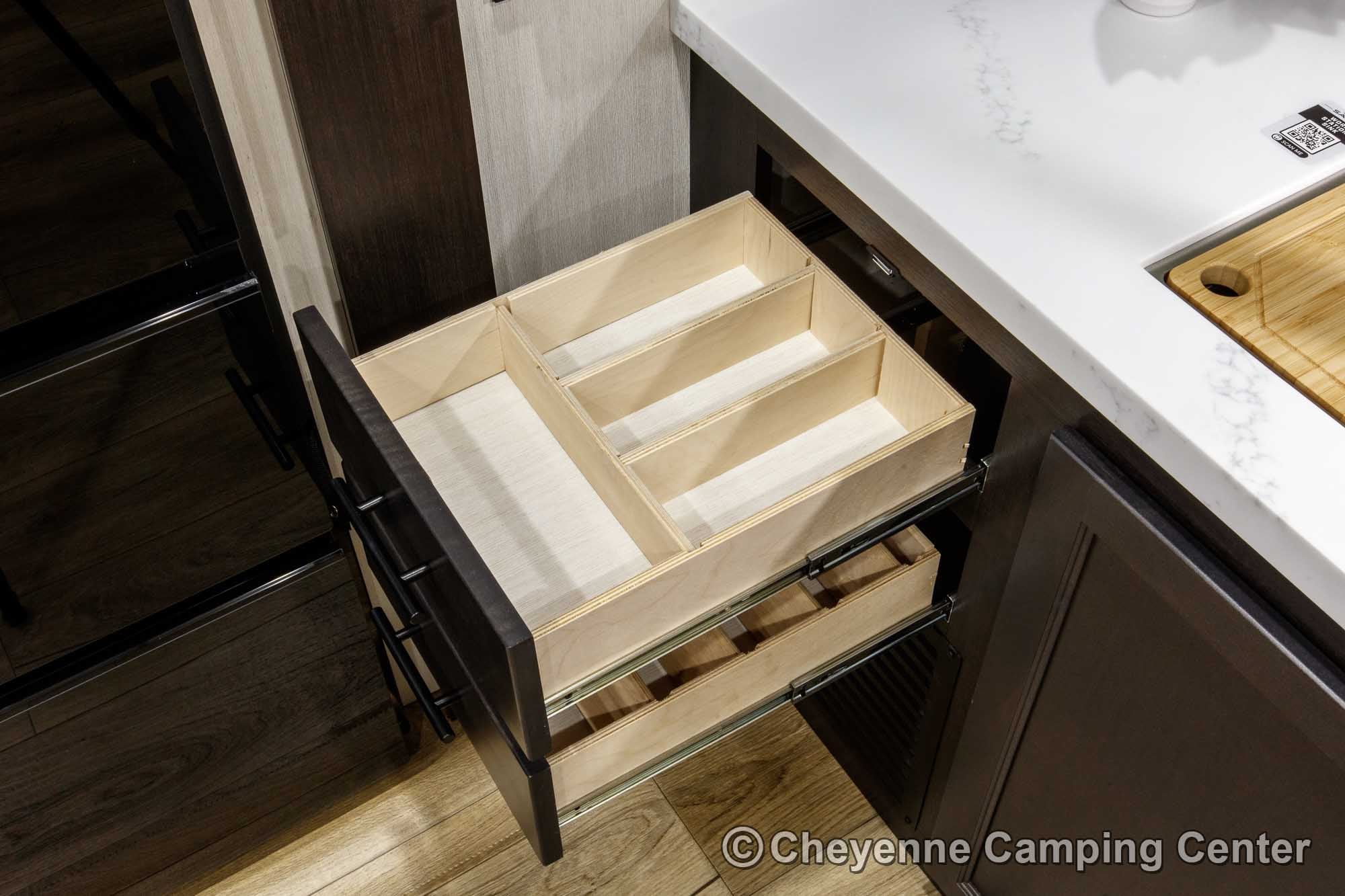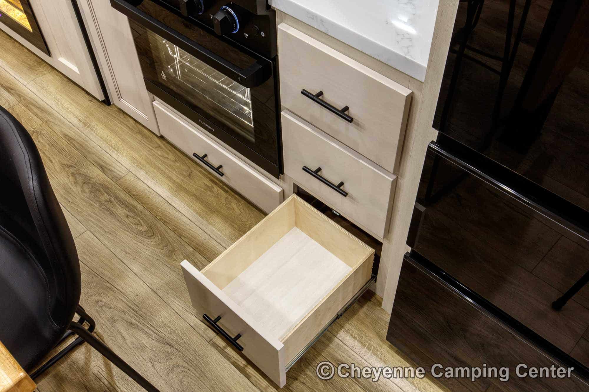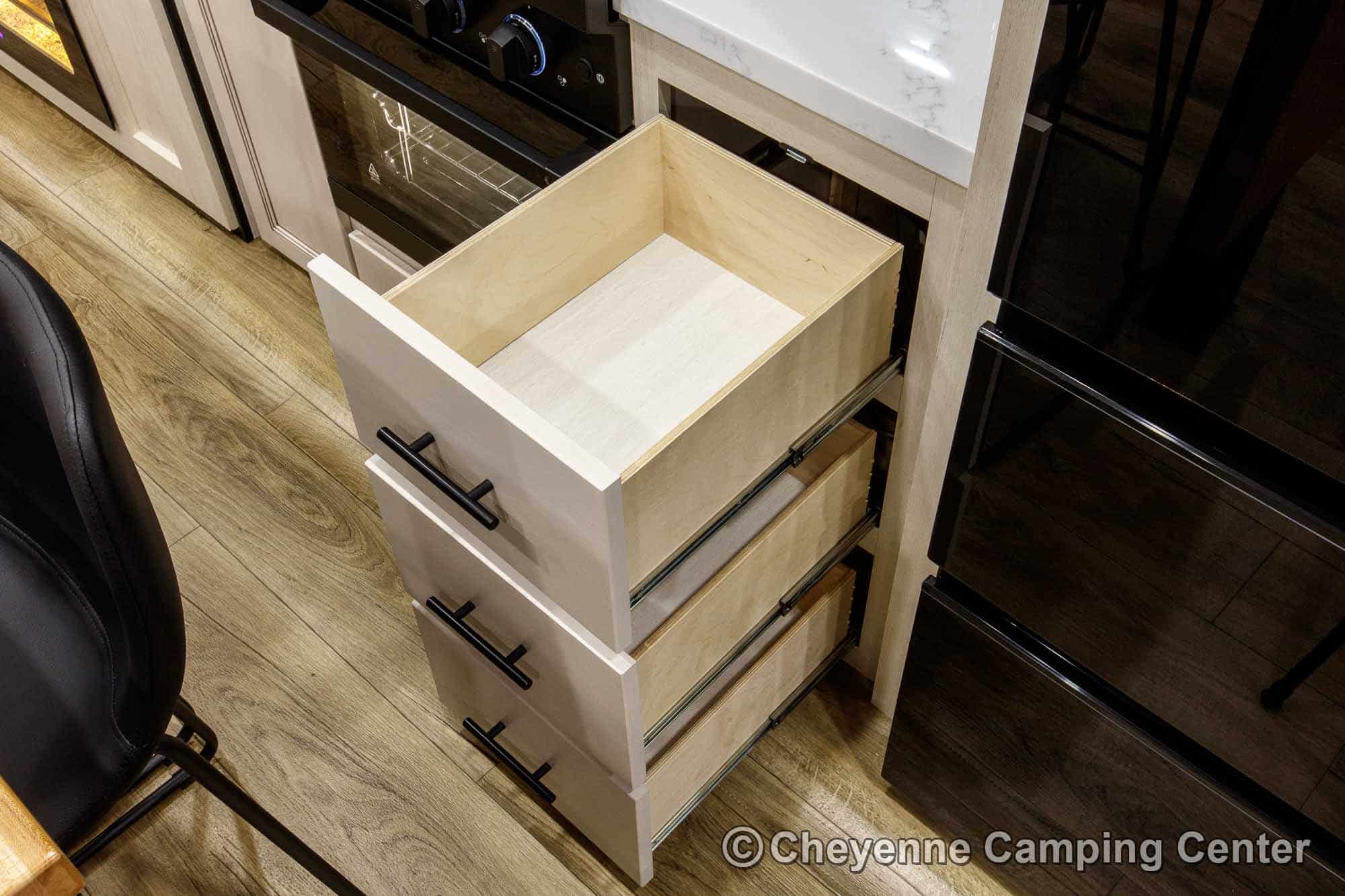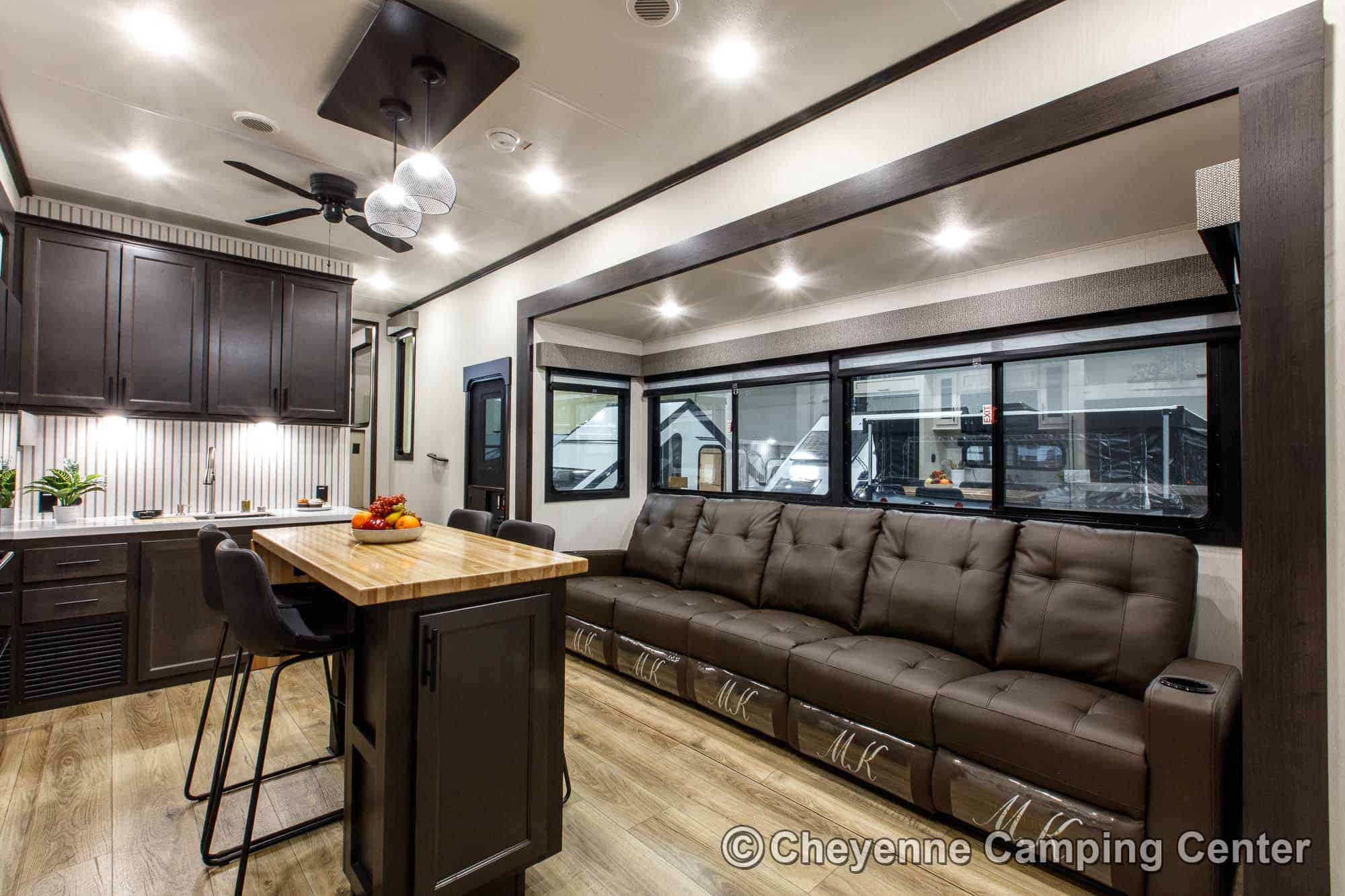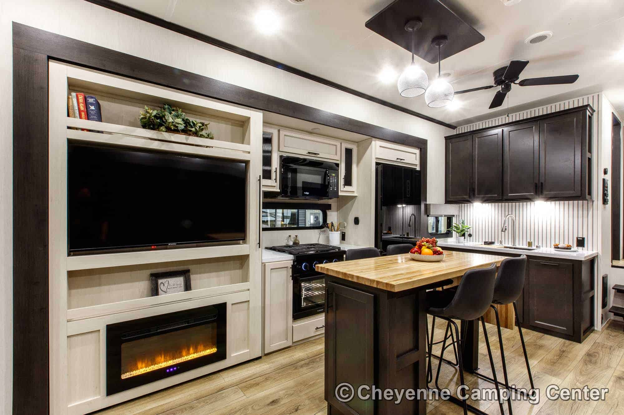 Step inside the 36DBB and prepare to be impressed. This two bedroom fifth wheel delivers the features and finishes of a luxury coach at an affordable price. The stunning kitchen is designed for both style and functionality, featuring a butcher-block dining island with four chairs and an extension, solid-surface countertops, and abundant counter space. You’ll have plenty of storage with numerous cabinets, drawers, and a huge hidden pantry cleverly tucked behind the entertainment center. Cooking is a breeze with a large oven, microwave/convection oven combo, residential-style refrigerator, workstation sink, and a full-size pull-out trash can that adds everyday convenience.