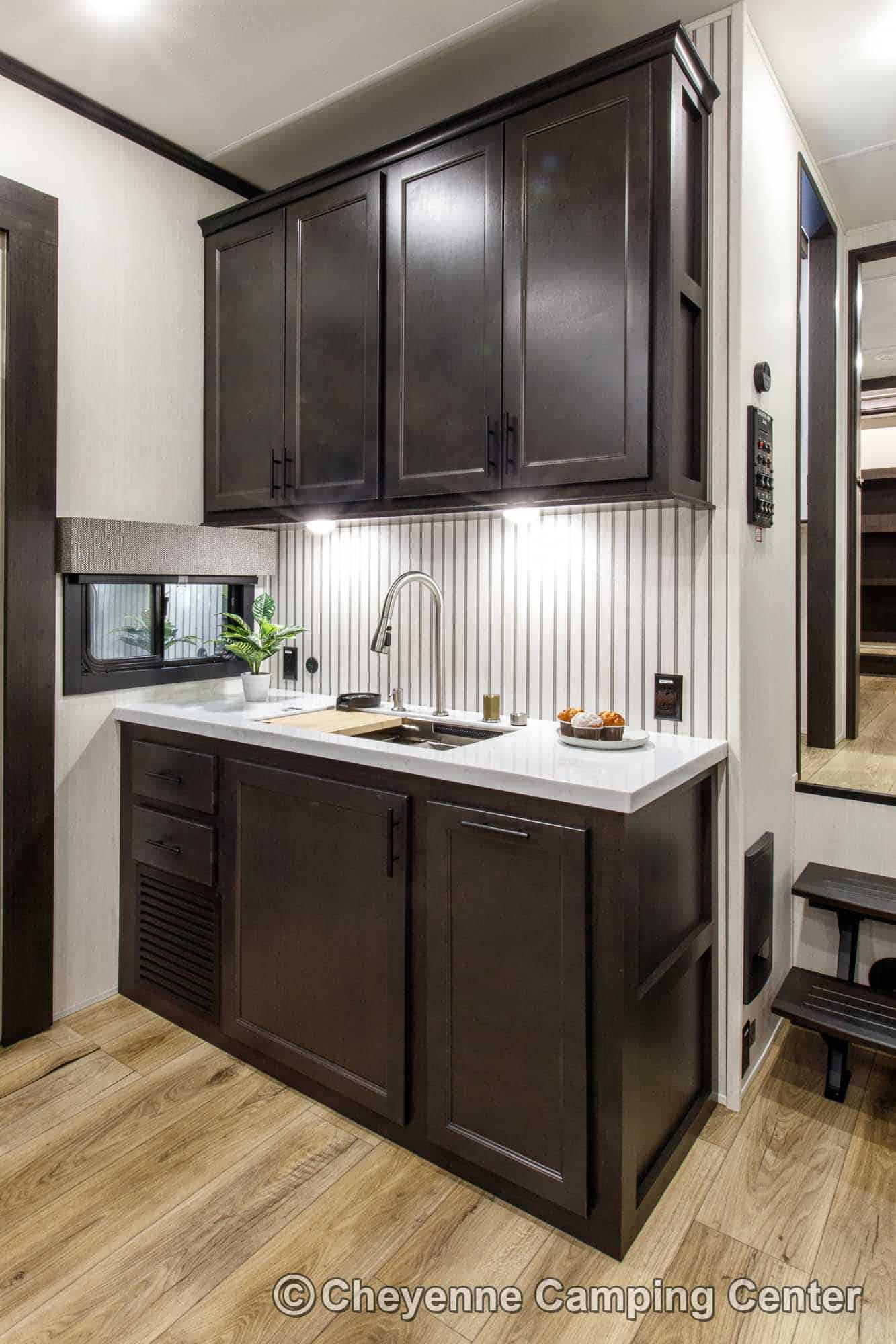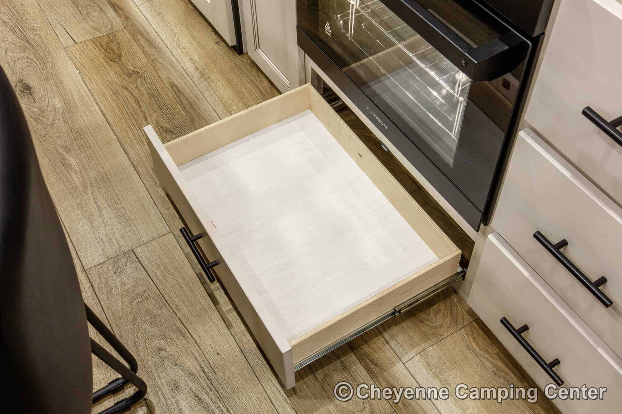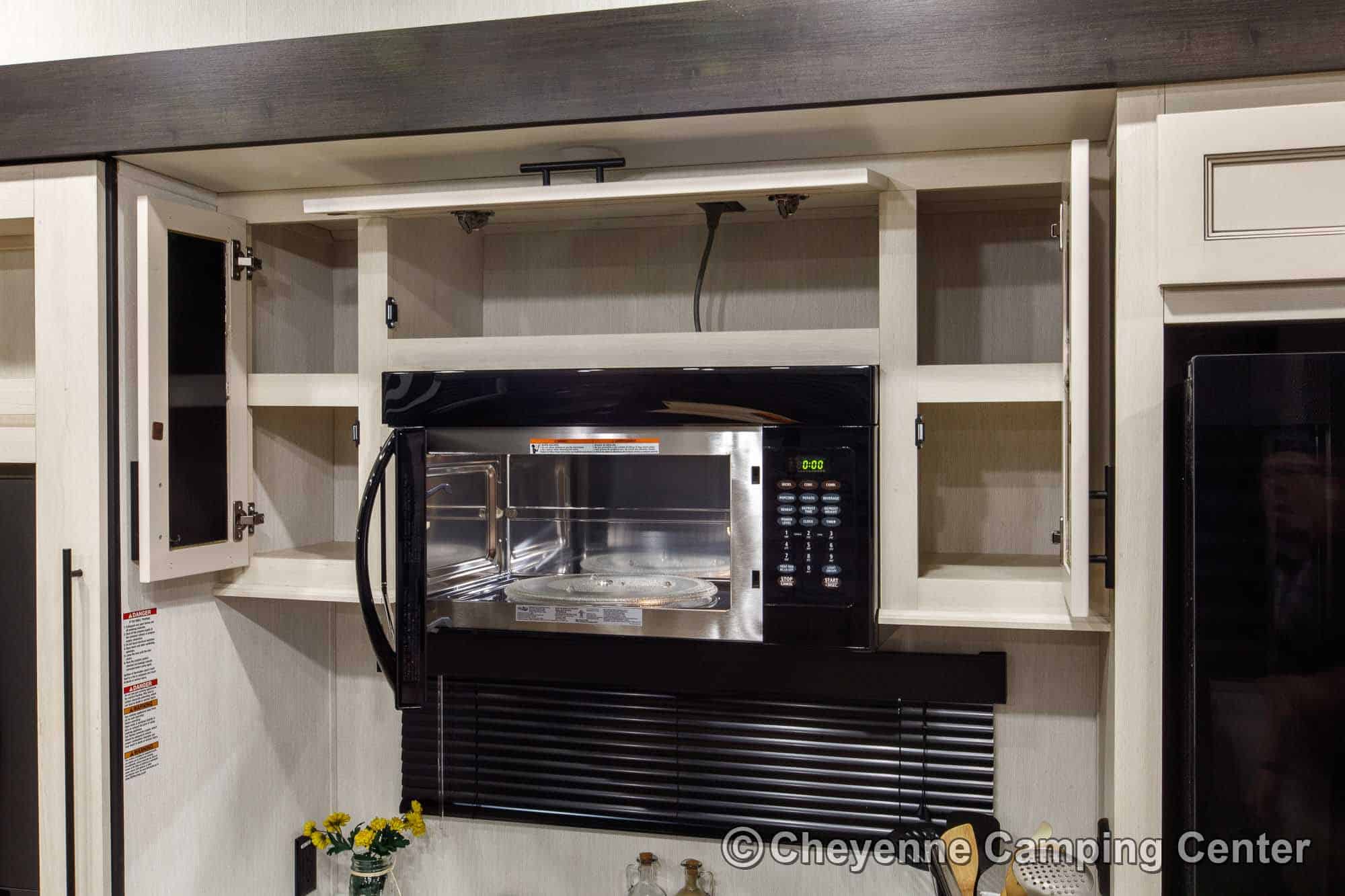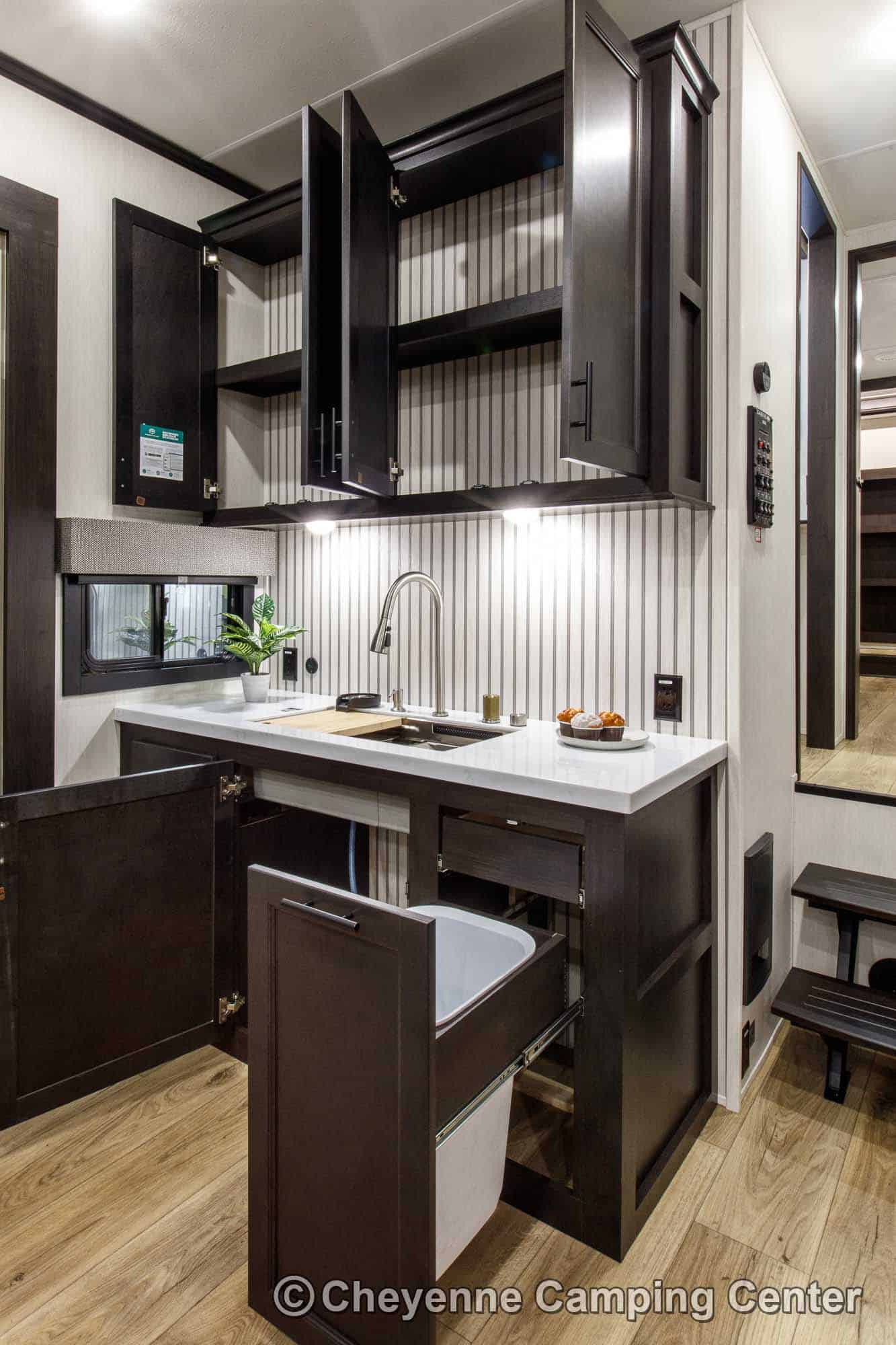 Step inside the 36DBB and prepare to be impressed. This two bedroom fifth wheel delivers the features and finishes of a luxury coach at an affordable price. The stunning kitchen is designed for both style and functionality, featuring a butcher-block dining island with four chairs and an extension, solid-surface countertops, and abundant counter space. You’ll have plenty of storage with numerous cabinets, drawers, and a huge hidden pantry cleverly tucked behind the entertainment center. Cooking is a breeze with a large oven, microwave/convection oven combo, residential-style refrigerator, workstation sink, and a full-size pull-out trash can that adds everyday convenience.