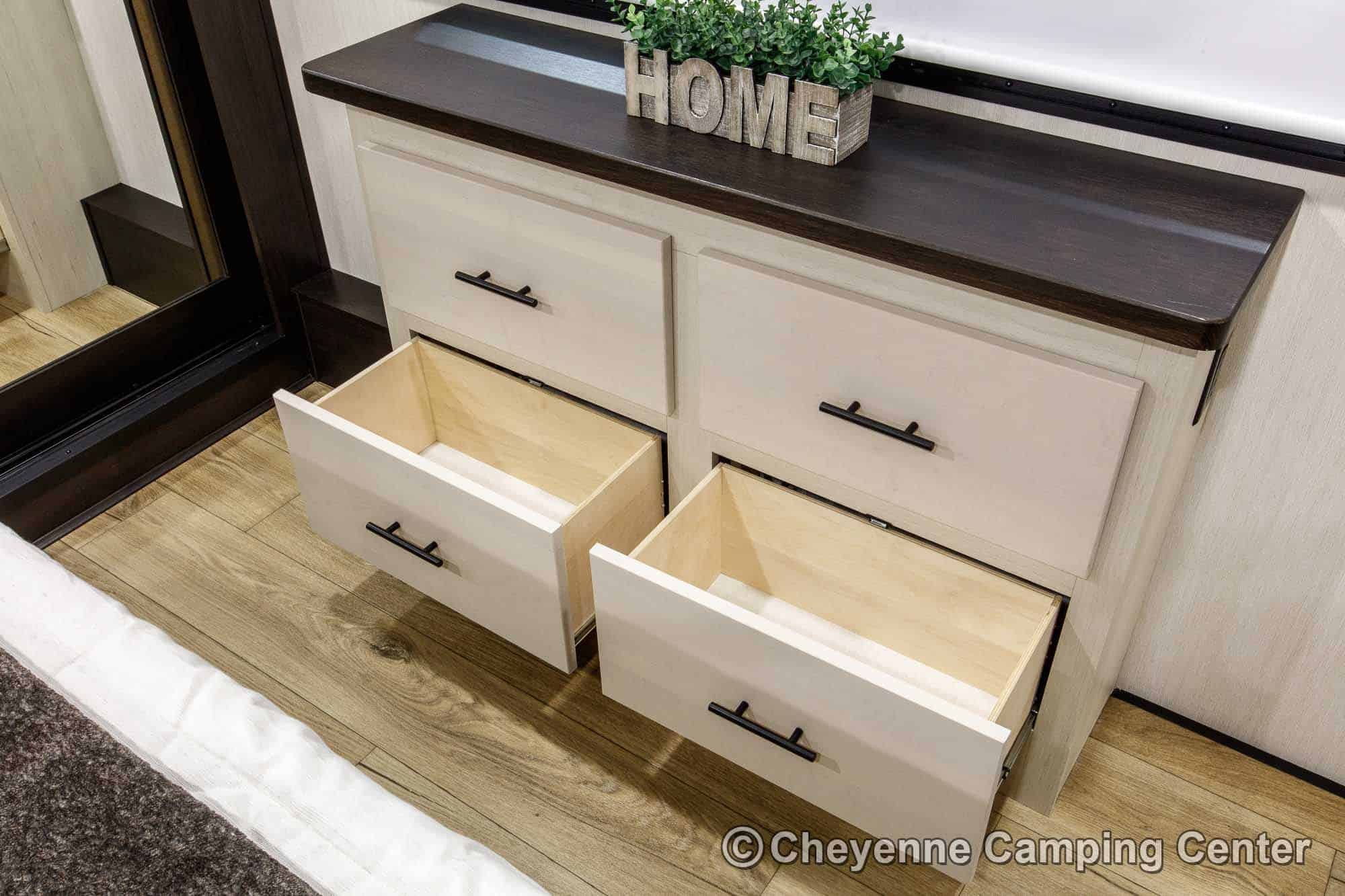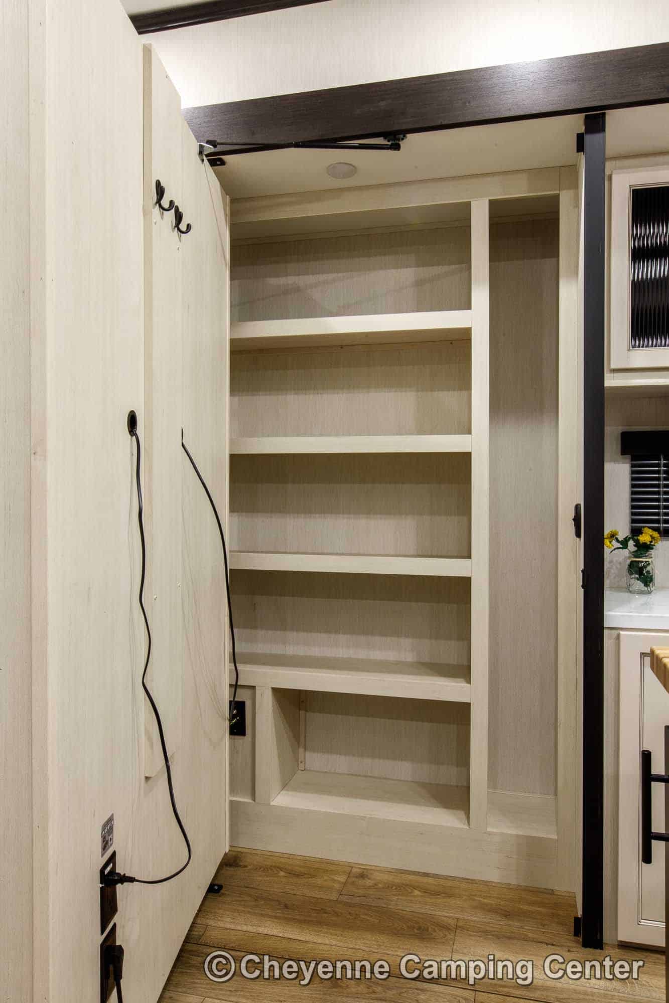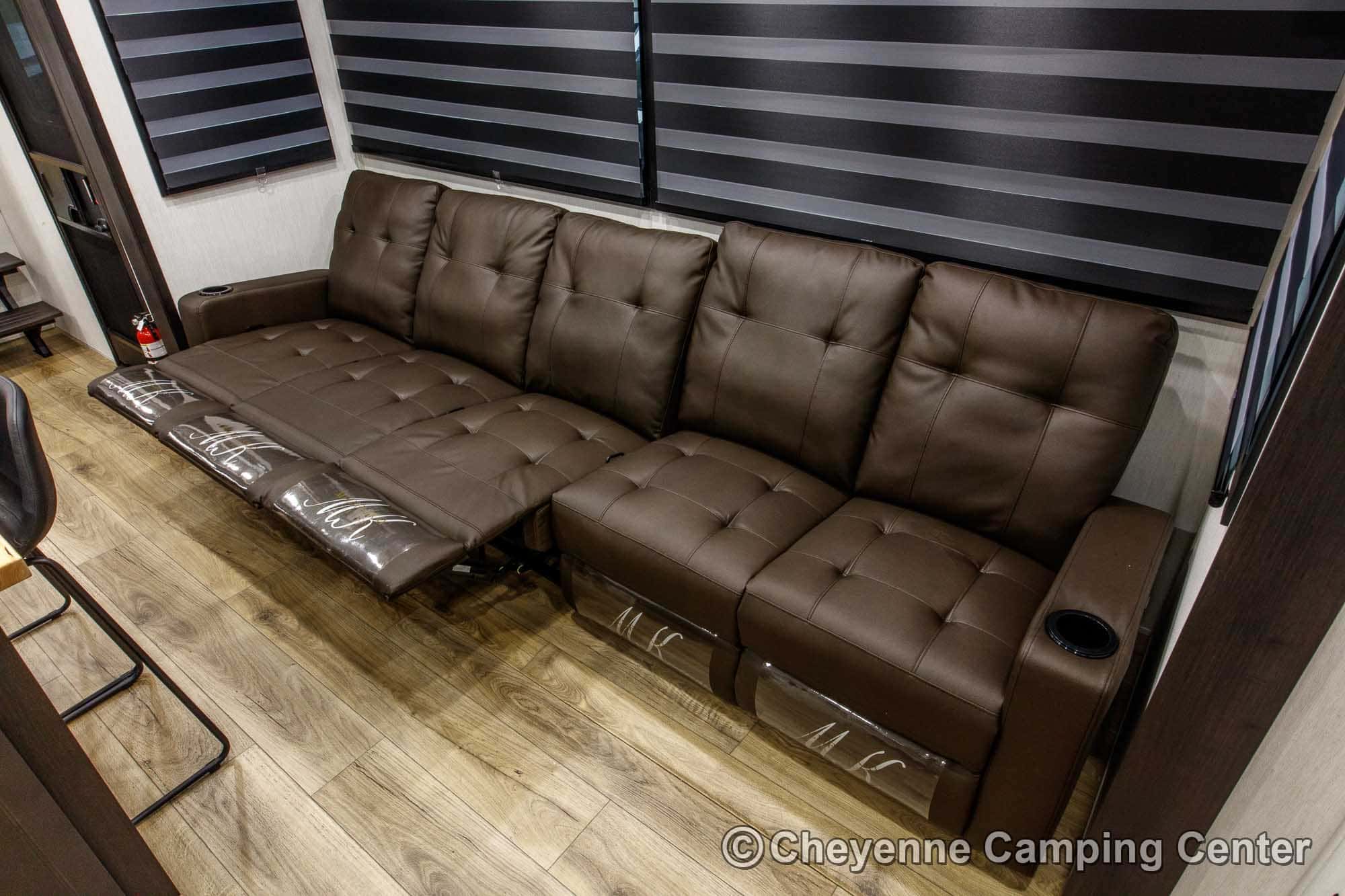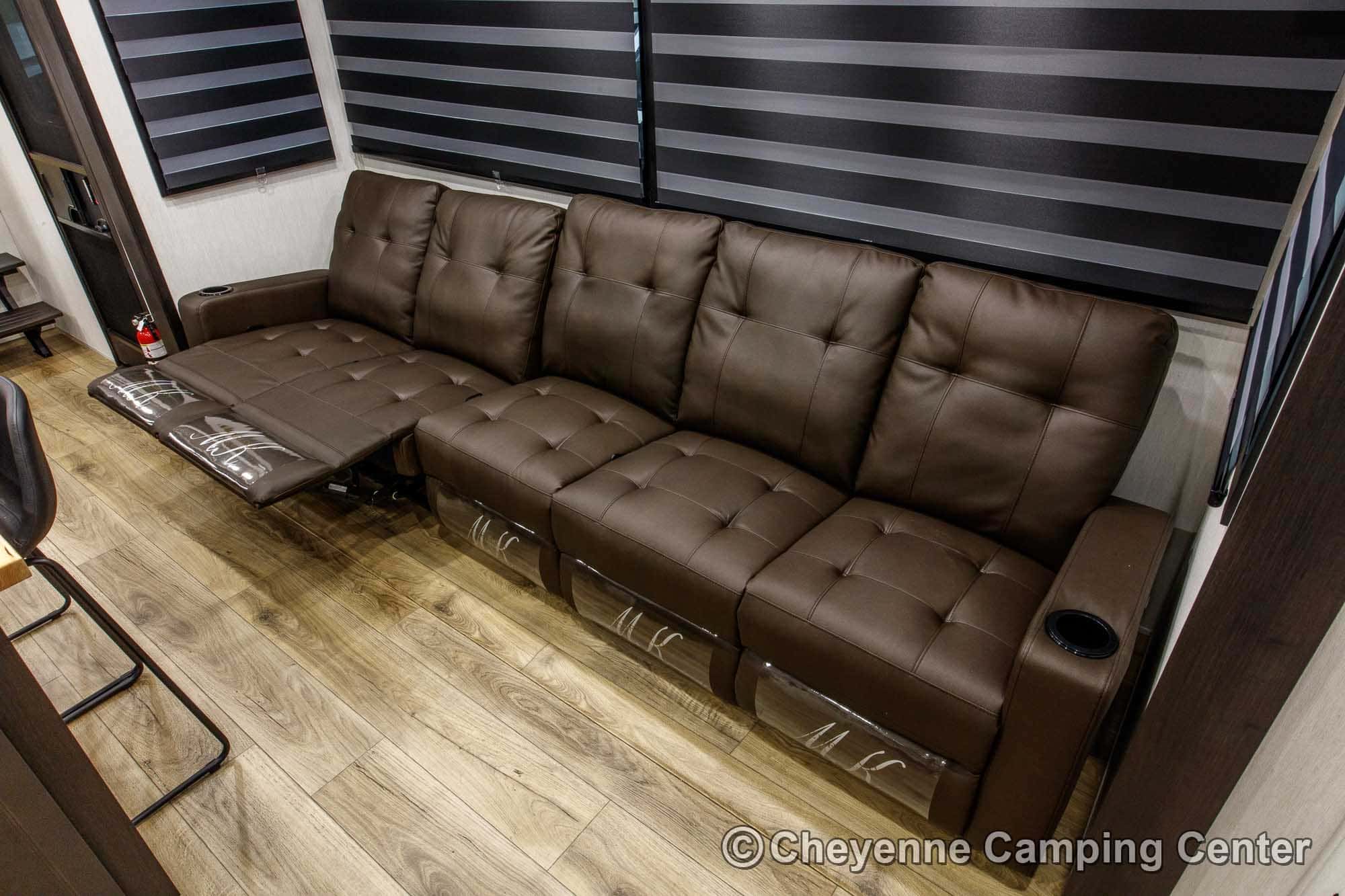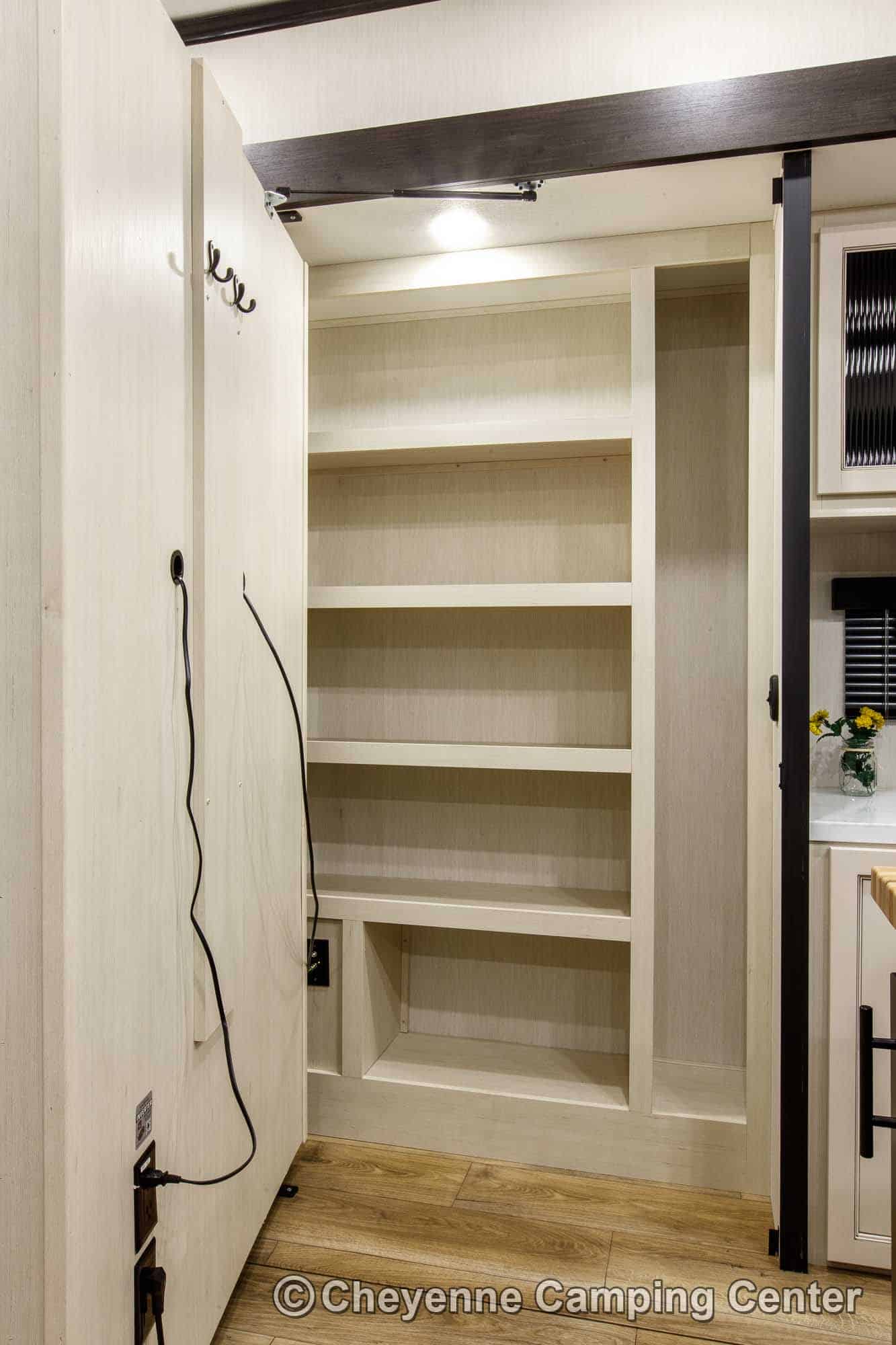 Step inside the 36DBB and prepare to be impressed. This two bedroom fifth wheel delivers the features and finishes of a luxury coach at an affordable price. The stunning kitchen is designed for both style and functionality, featuring a butcher-block dining island with four chairs and an extension, solid-surface countertops, and abundant counter space. You’ll have plenty of storage with numerous cabinets, drawers, and a huge hidden pantry cleverly tucked behind the entertainment center. Cooking is a breeze with a large oven, microwave/convection oven combo, residential-style refrigerator, workstation sink, and a full-size pull-out trash can that adds everyday convenience.