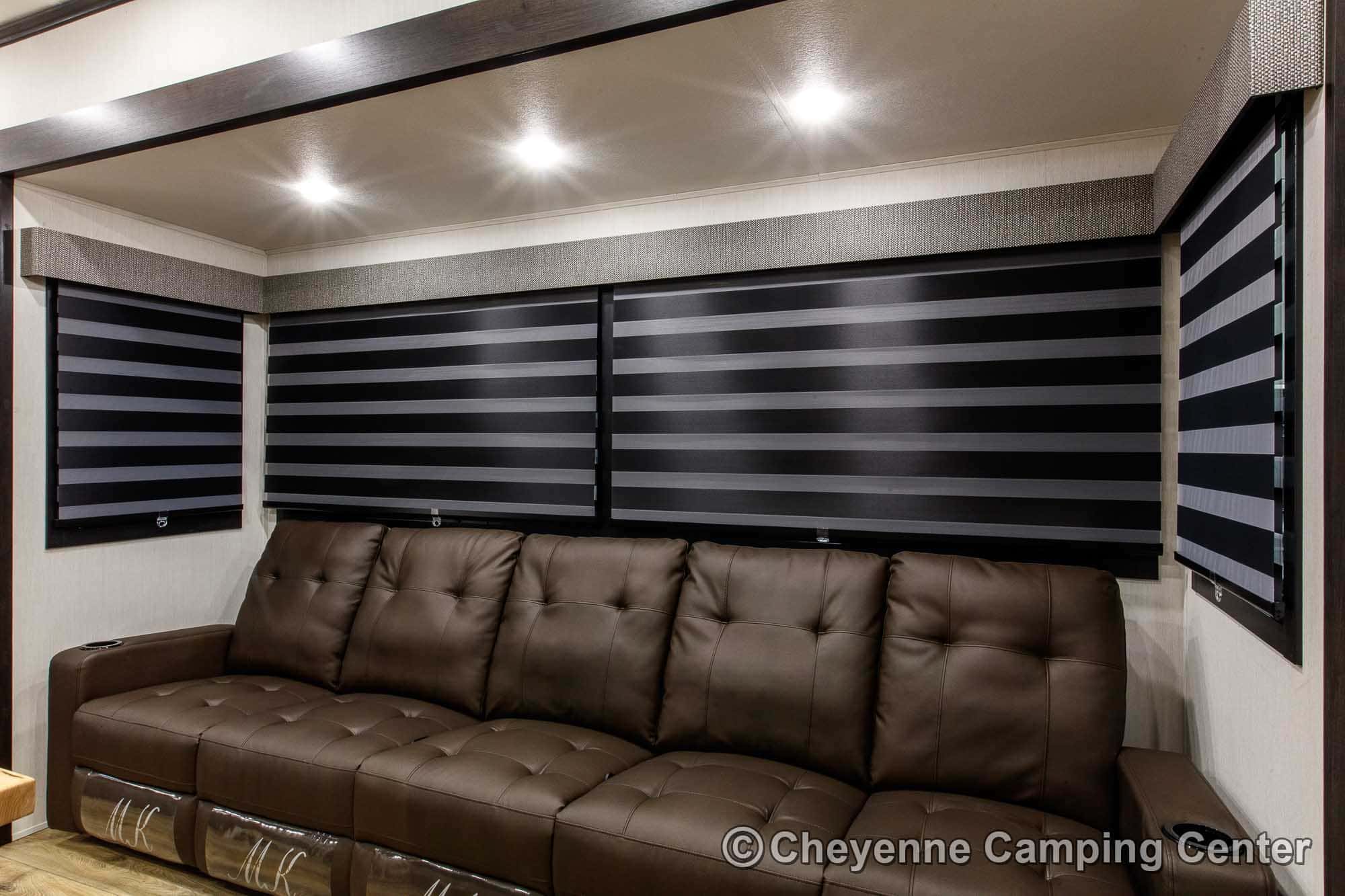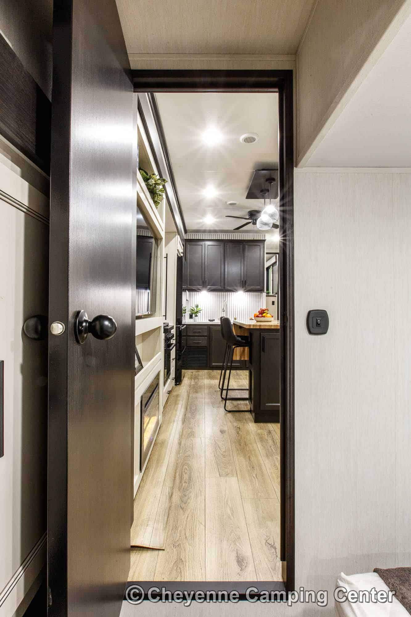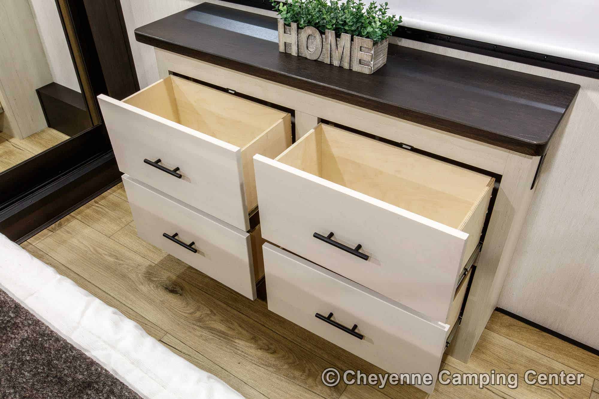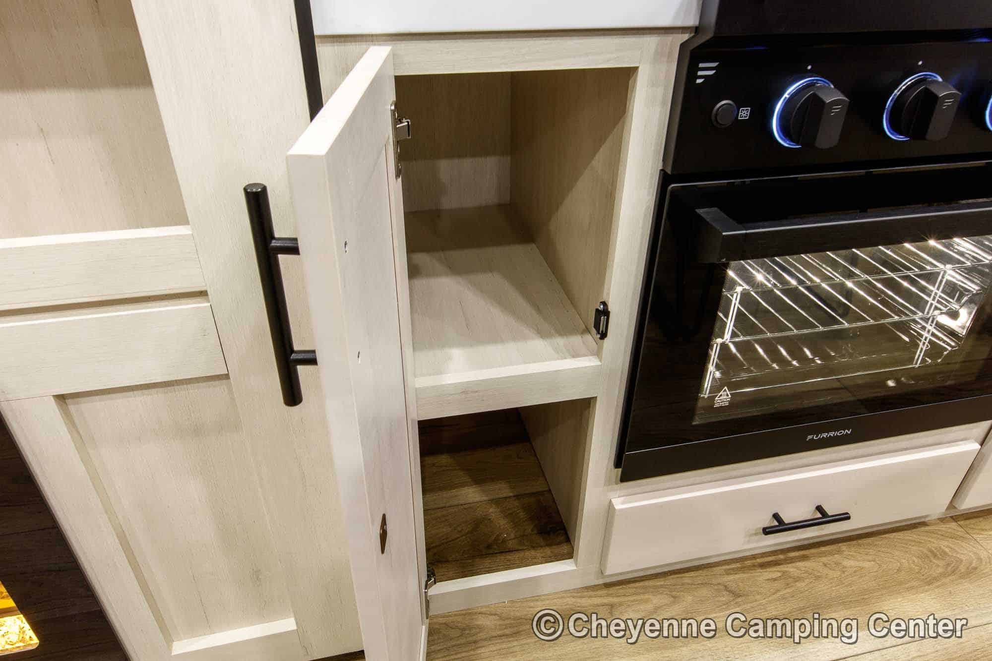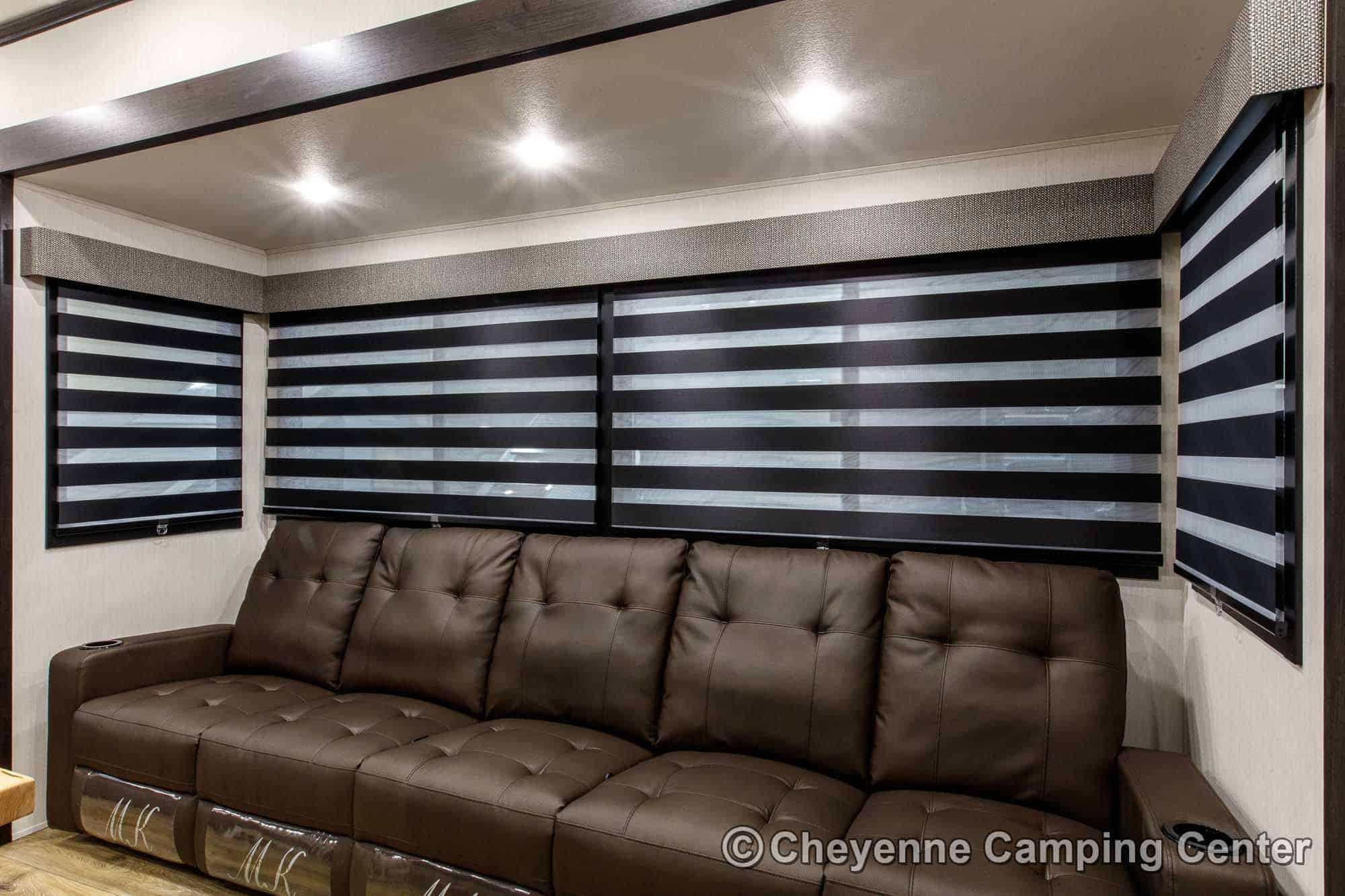 Step inside the 36DBB and prepare to be impressed. This two bedroom fifth wheel delivers the features and finishes of a luxury coach at an affordable price. The stunning kitchen is designed for both style and functionality, featuring a butcher-block dining island with four chairs and an extension, solid-surface countertops, and abundant counter space. You’ll have plenty of storage with numerous cabinets, drawers, and a huge hidden pantry cleverly tucked behind the entertainment center. Cooking is a breeze with a large oven, microwave/convection oven combo, residential-style refrigerator, workstation sink, and a full-size pull-out trash can that adds everyday convenience.